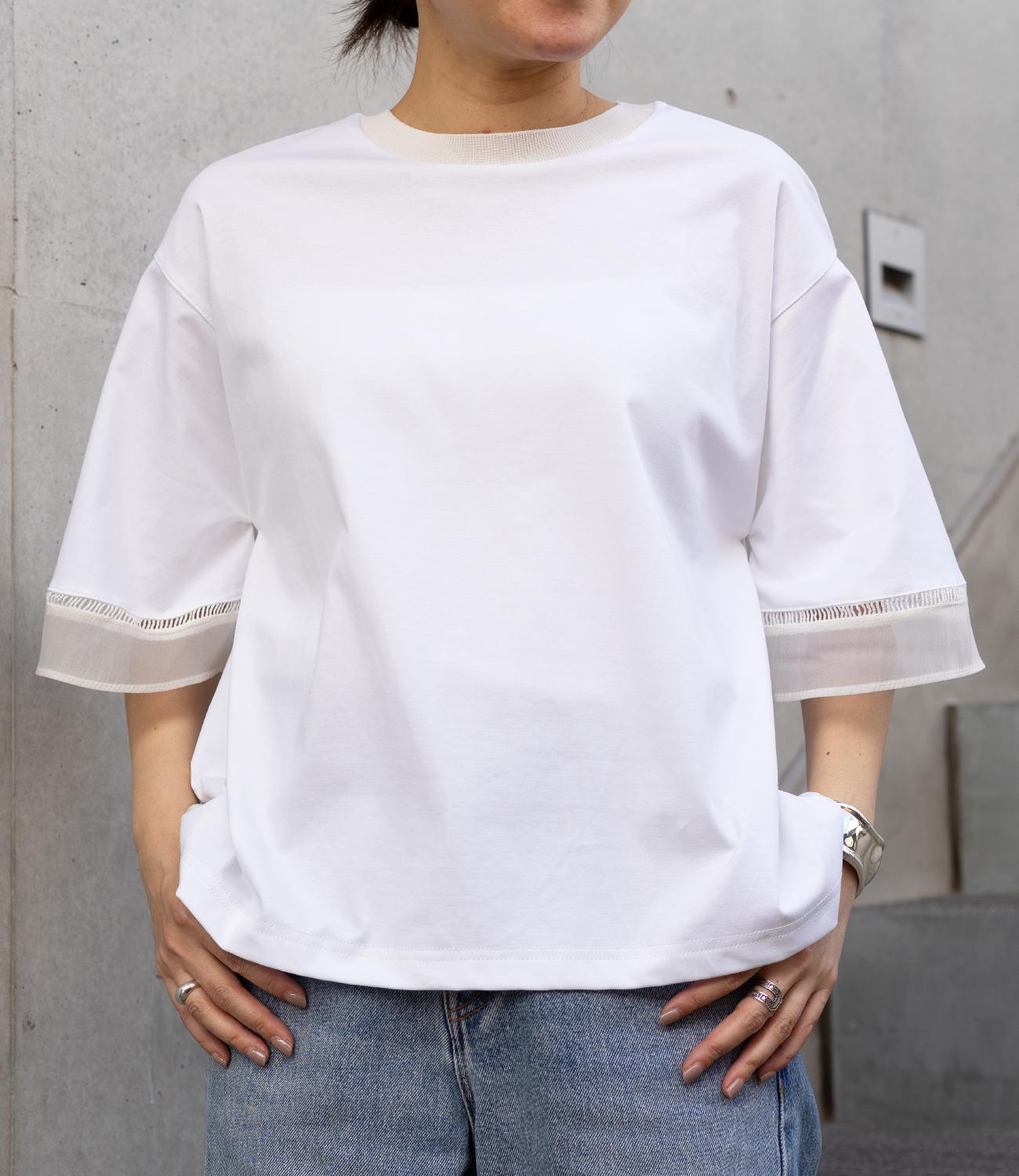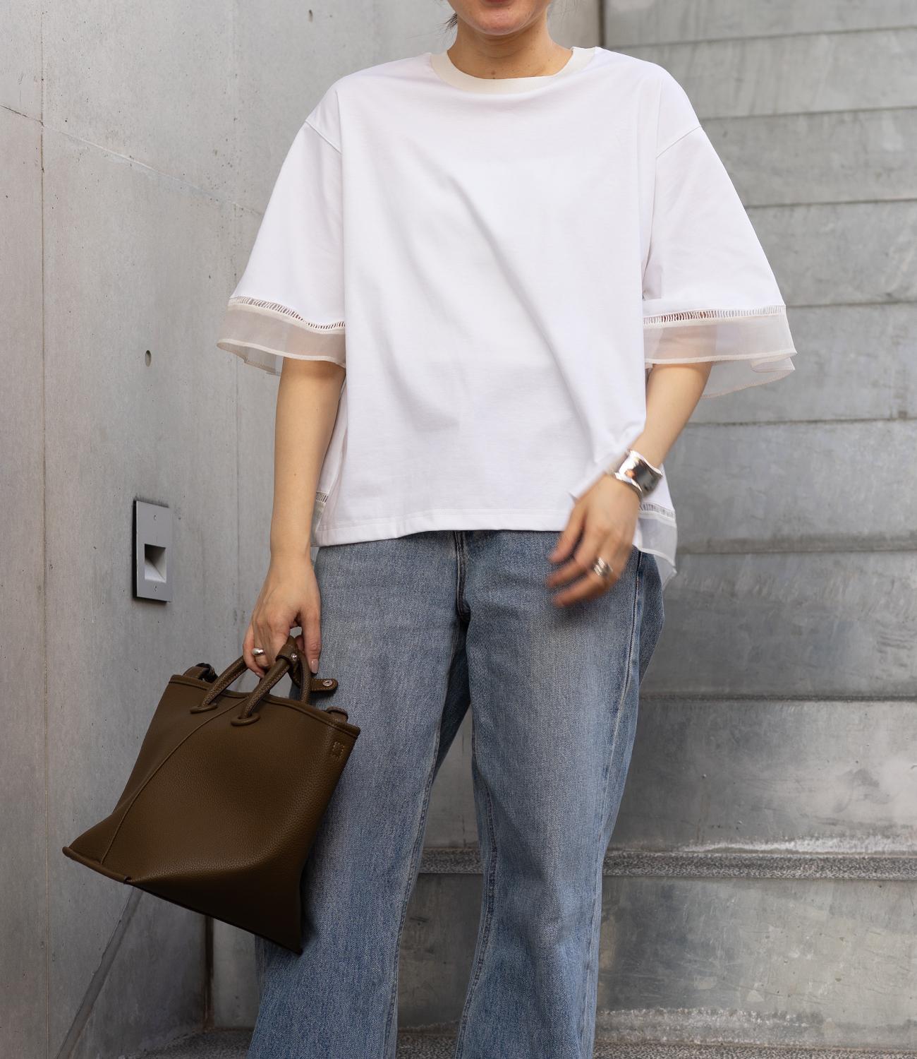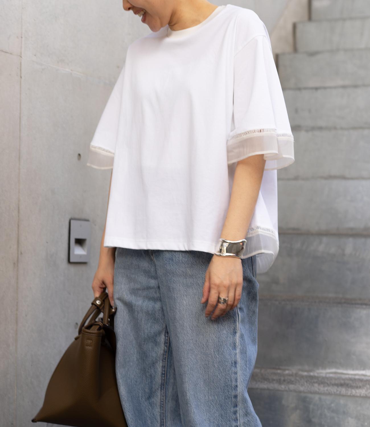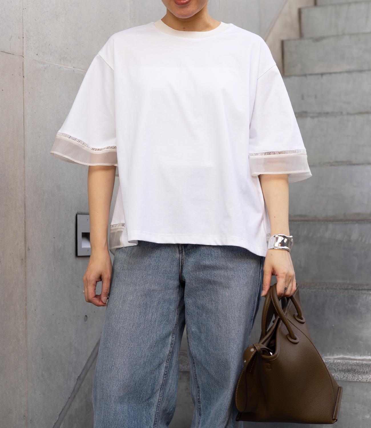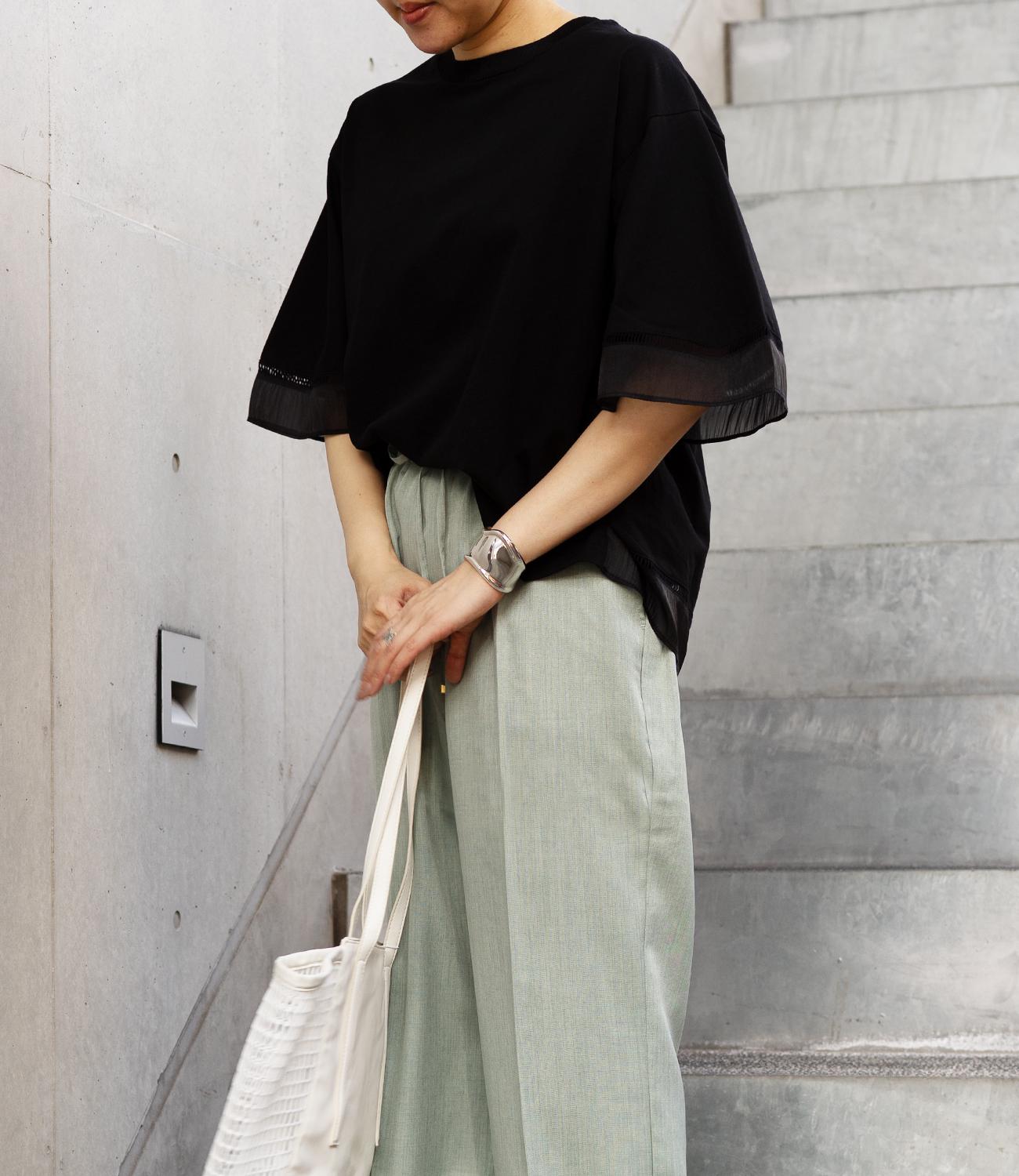シルケット素材の天竺カットソーに、柔らかなシアーシフォン生地をドッキング。