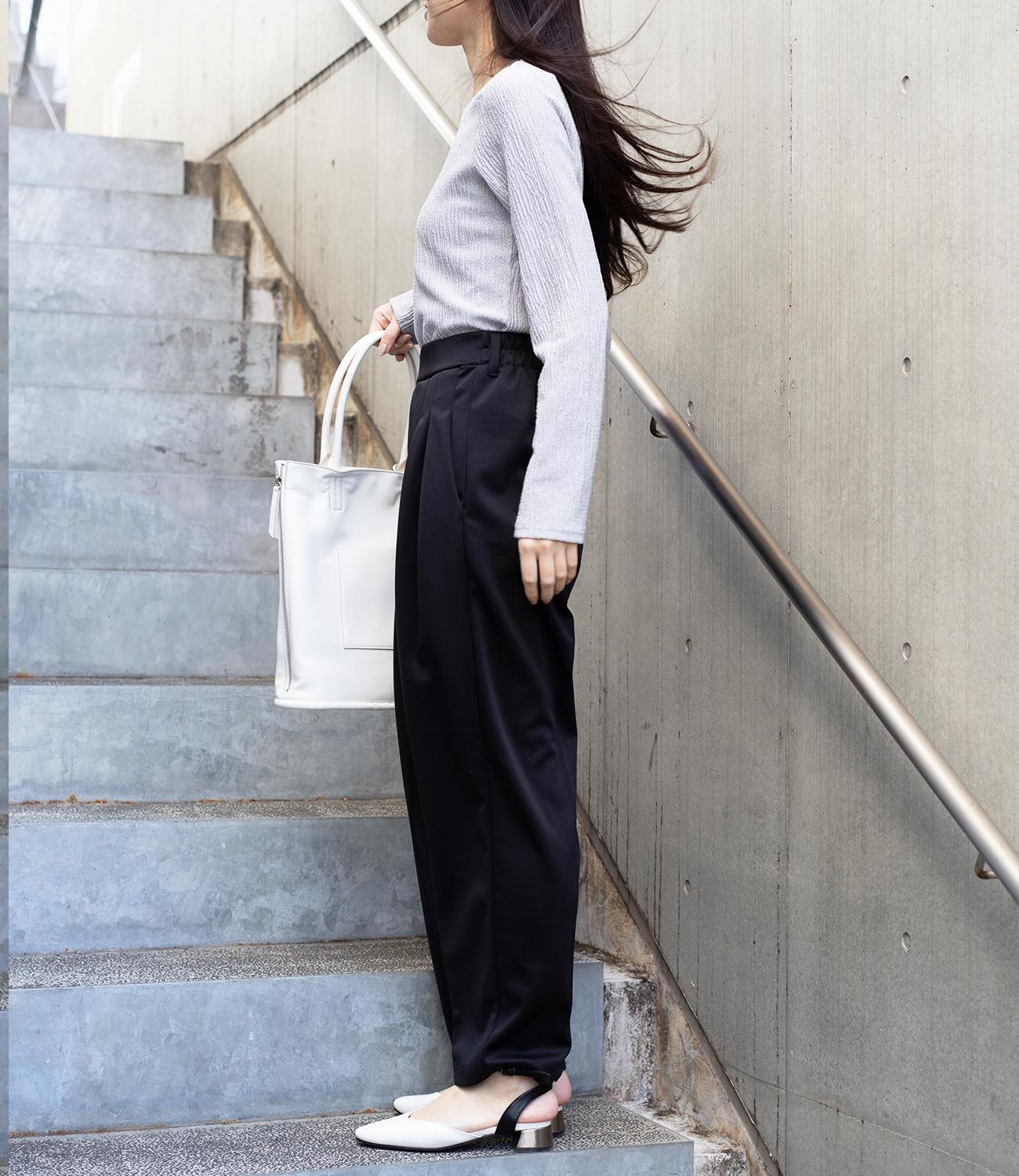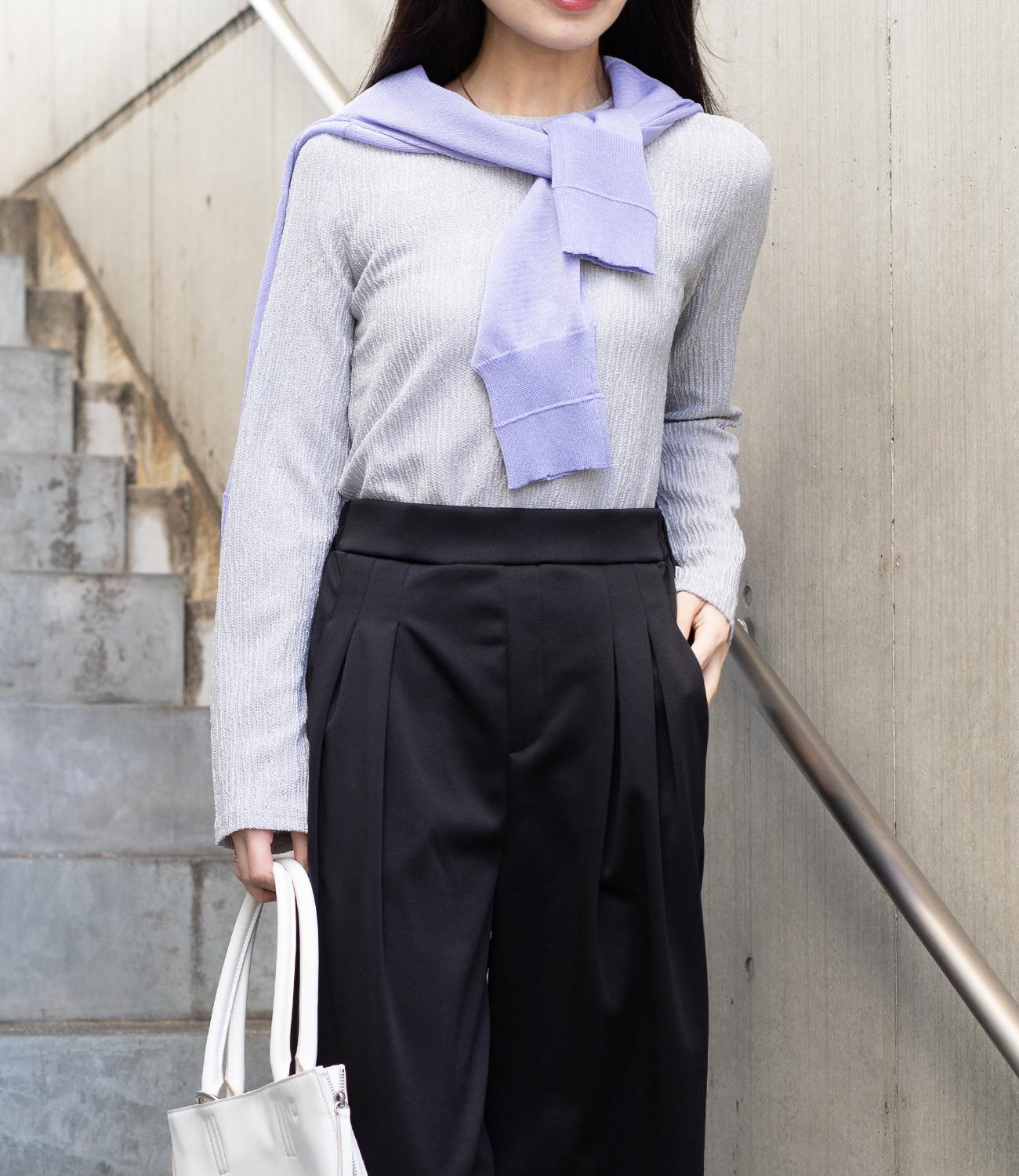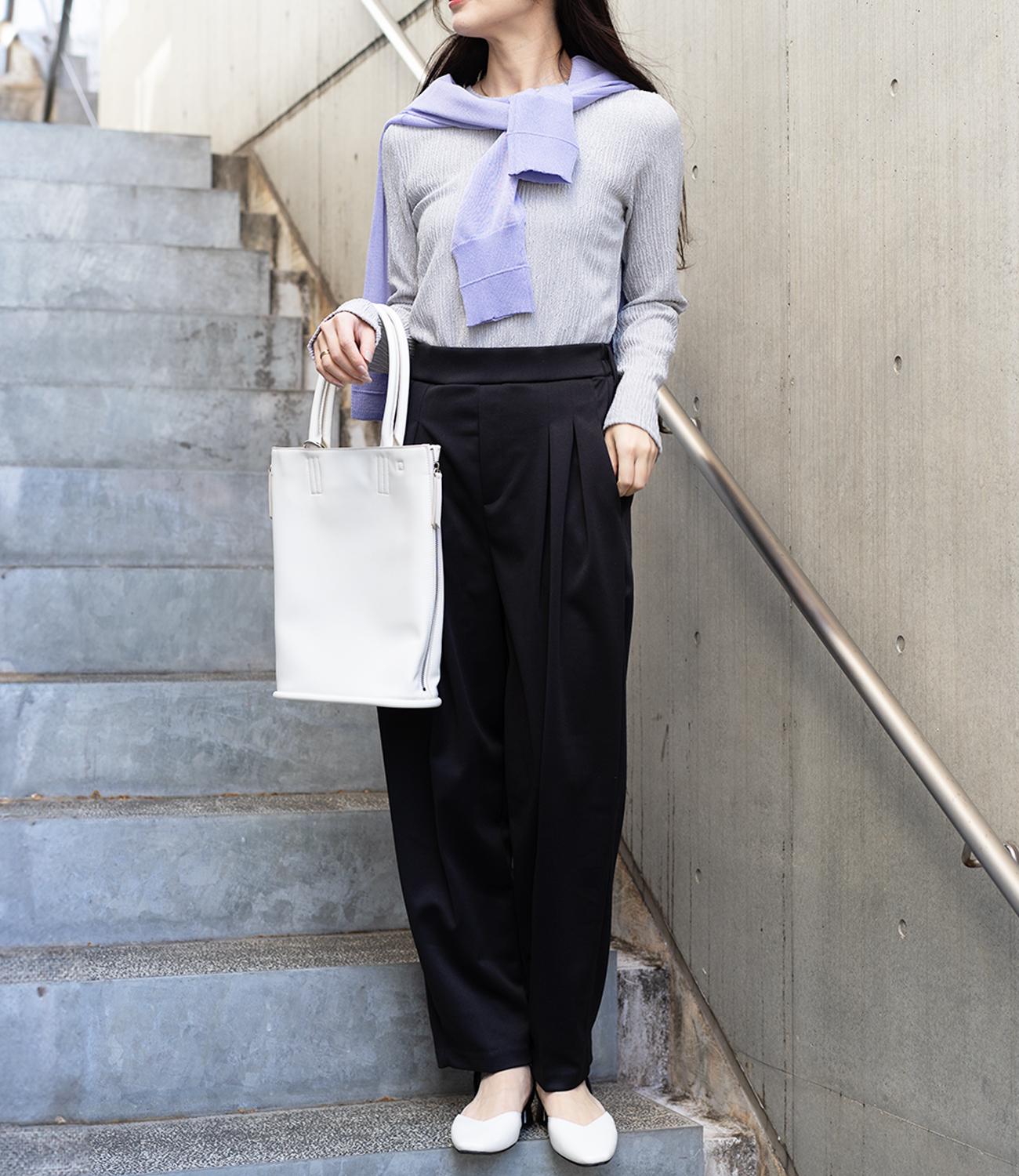 縦のラインを強調してくれる表面感のある素材はボディラインをスリムに見せてくれます。