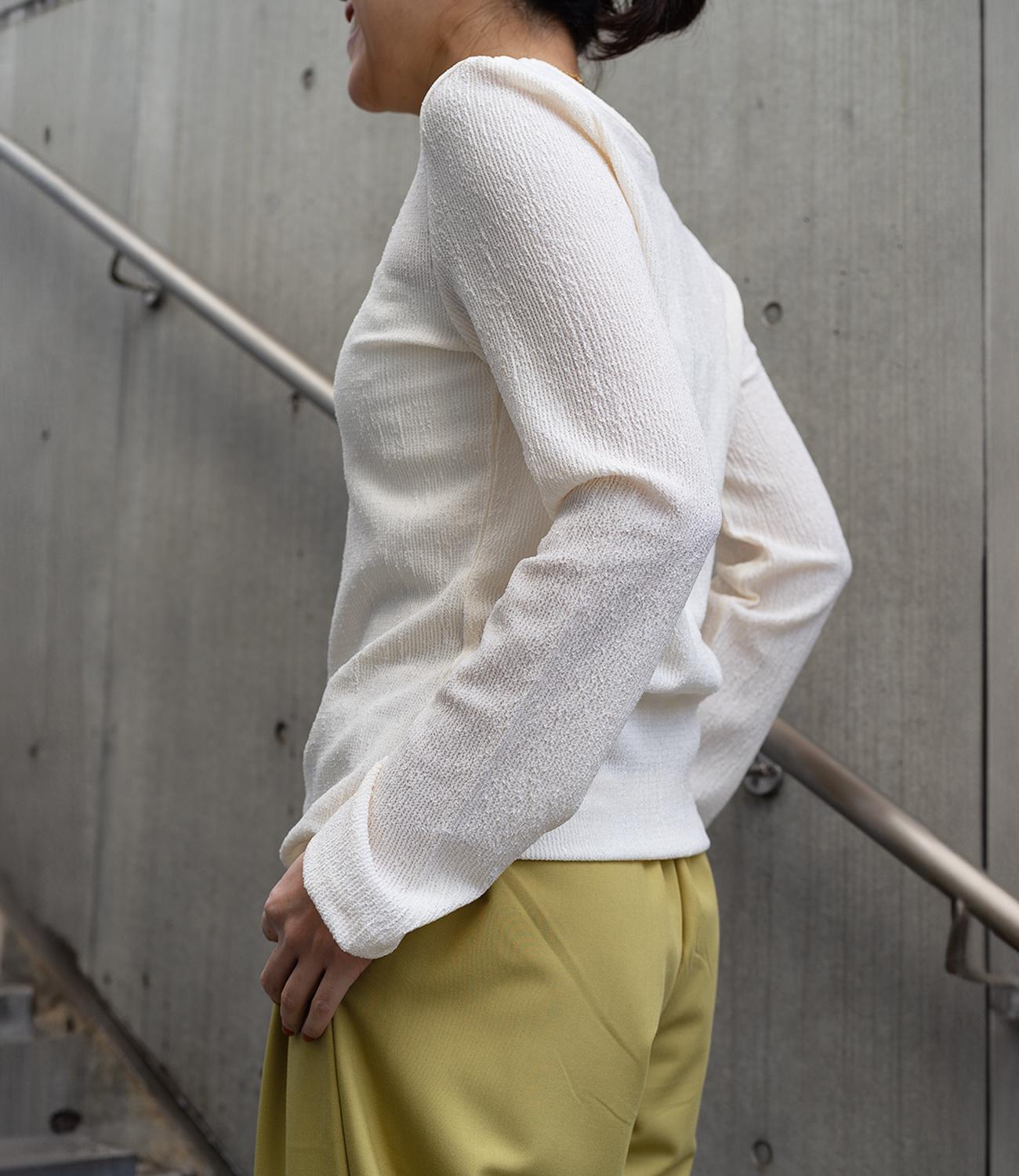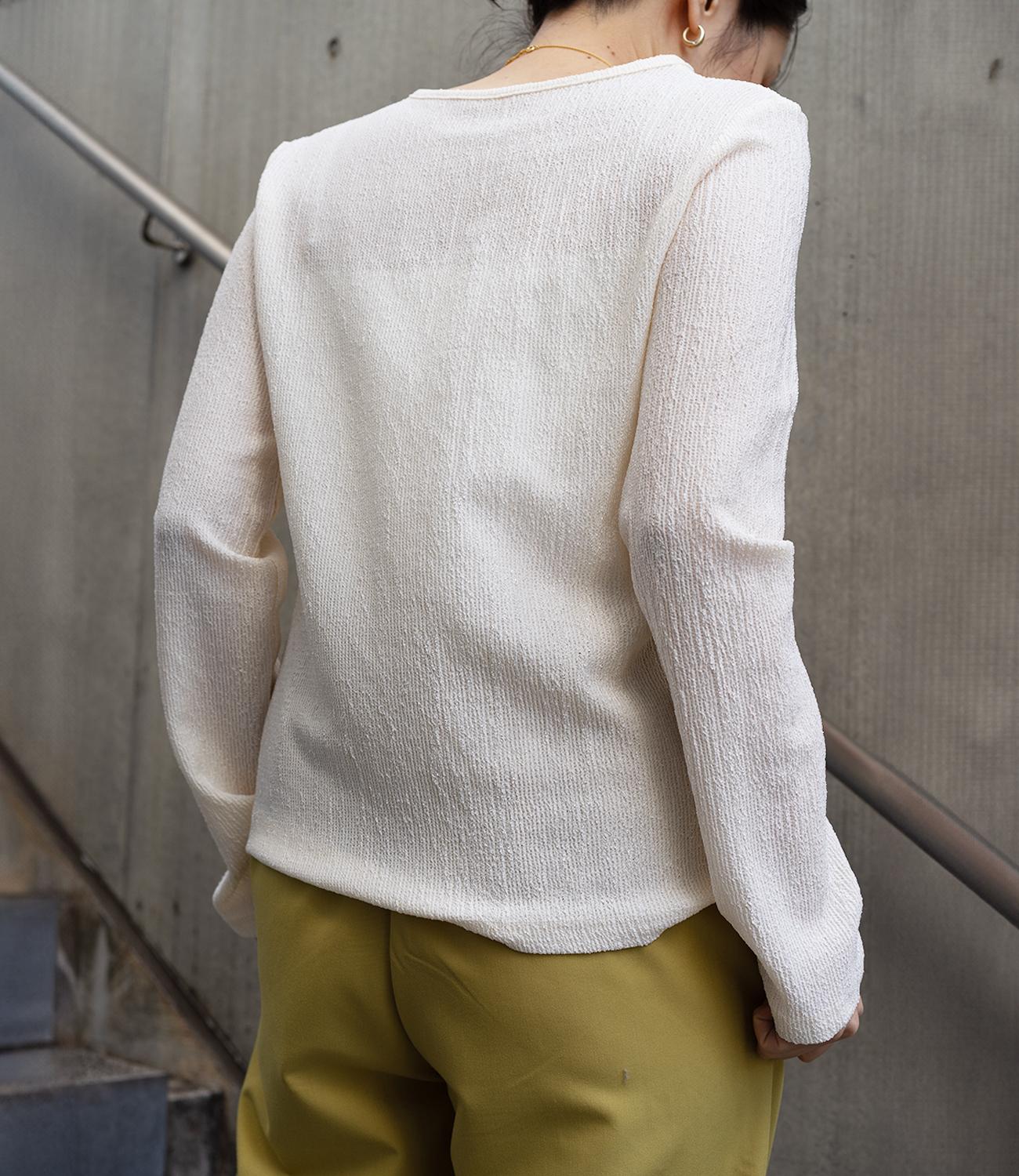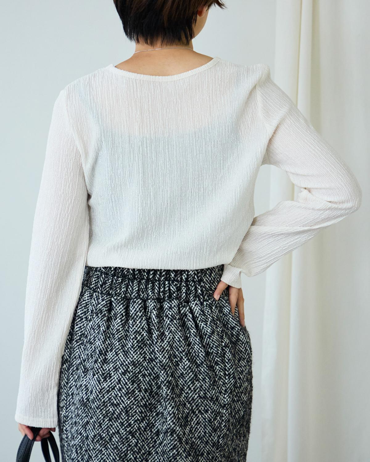 こんなトップスが欲しかった。と思わせてくれる上品な印象。キャミソール、ブラトップなどインナー次第で多くのスタイリングをお楽しみいただけます。