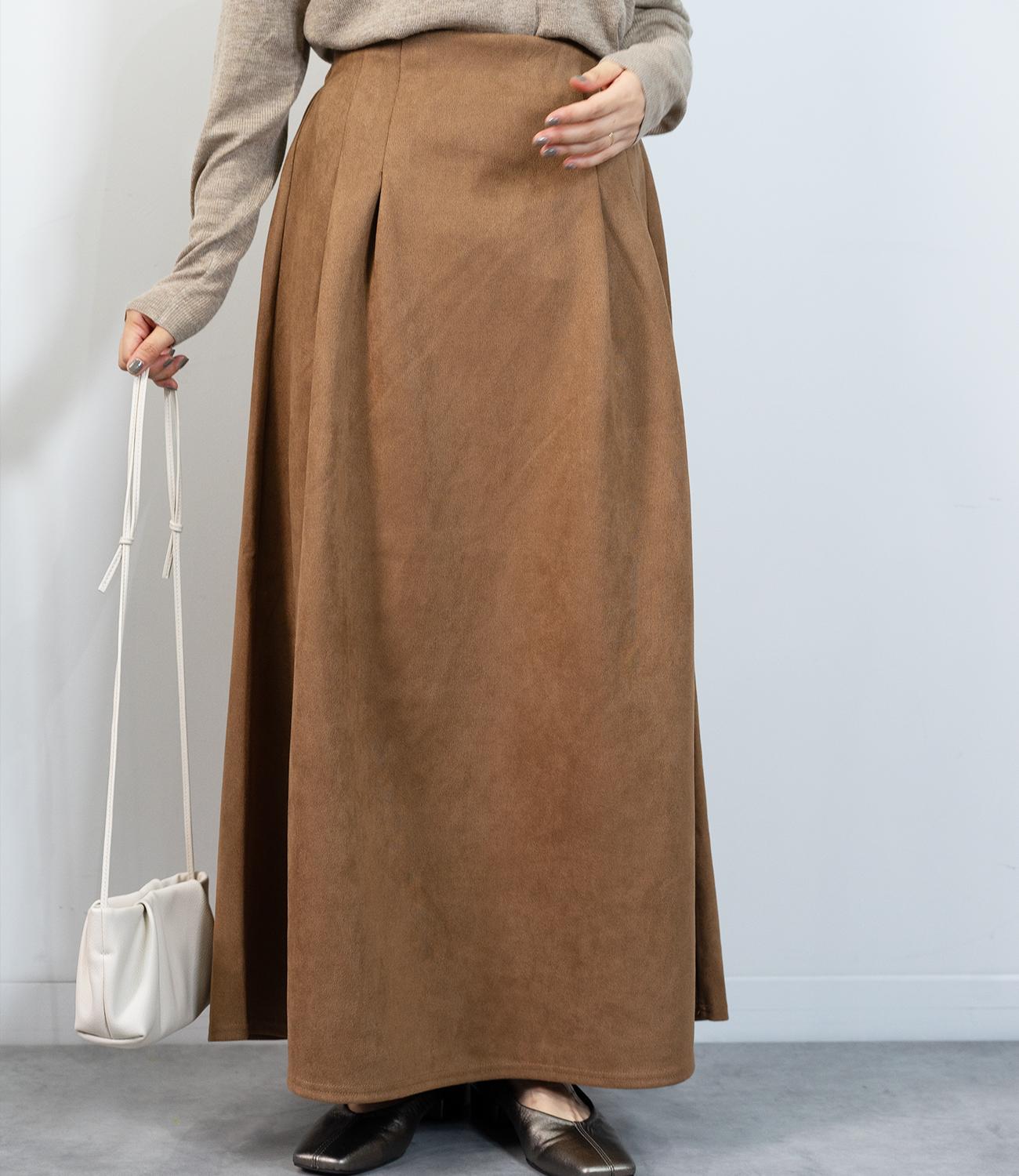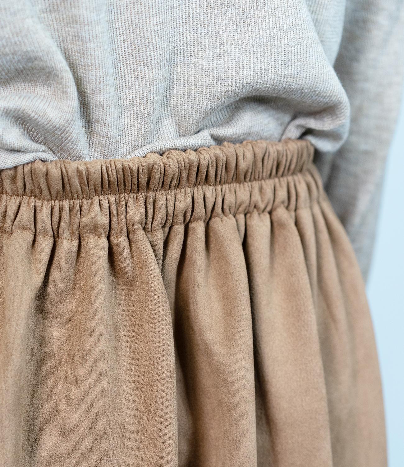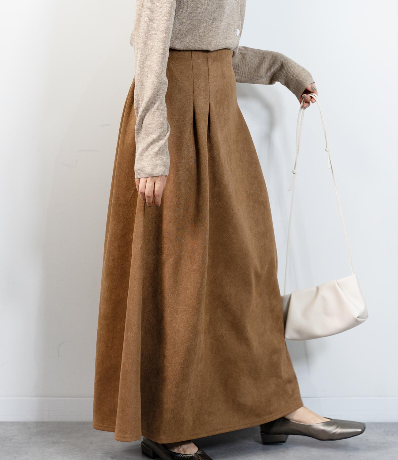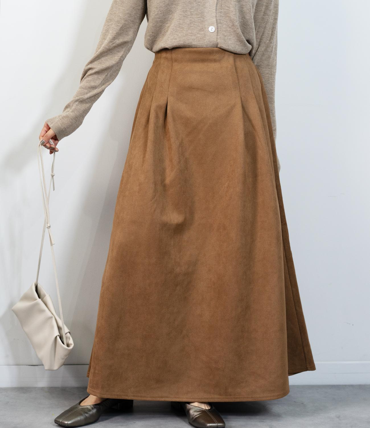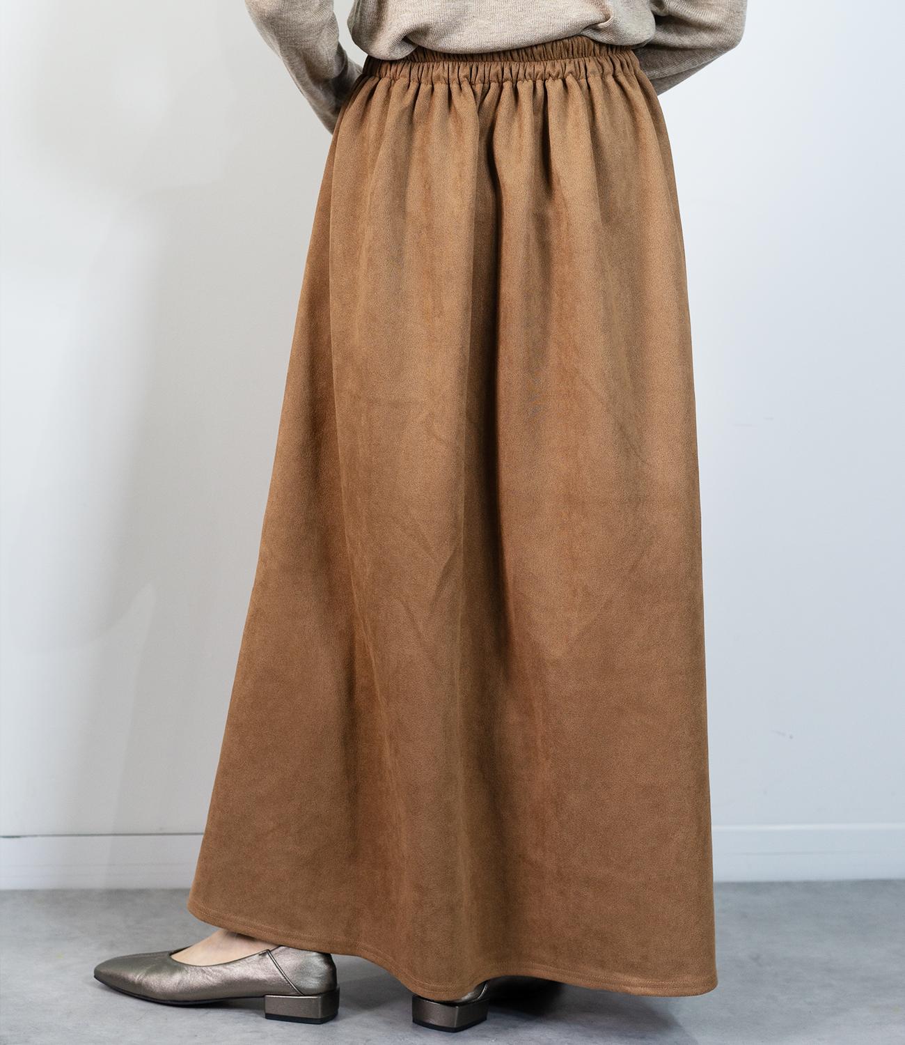 たっぷりとした分量感で上品に揺れる、フレアシルエットのスエード調スカート。