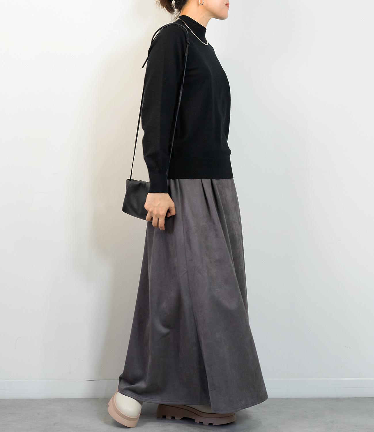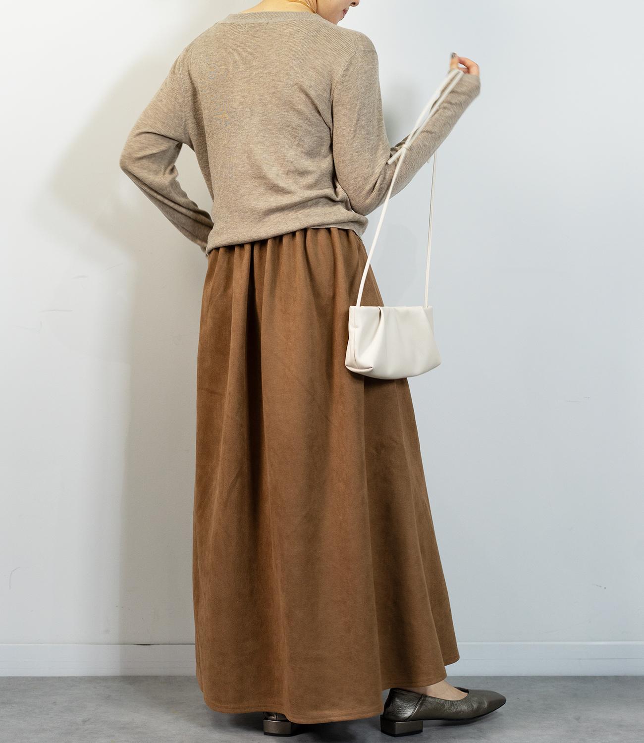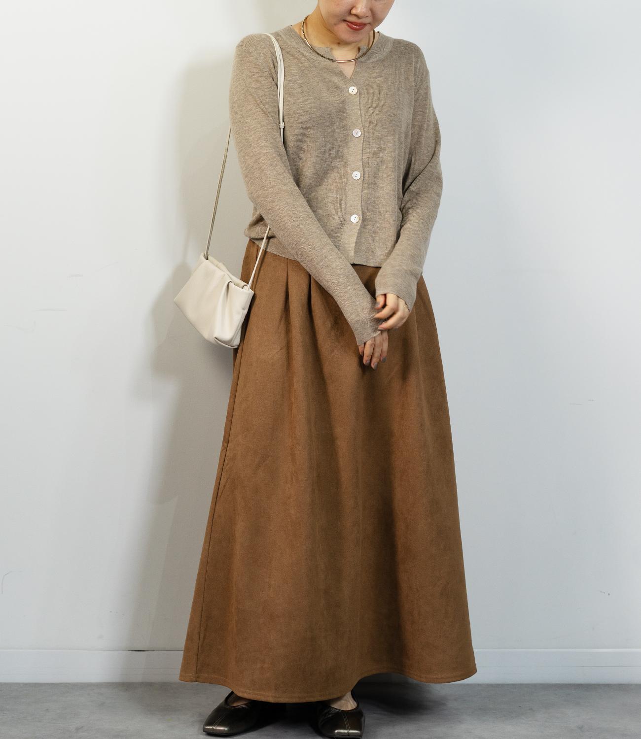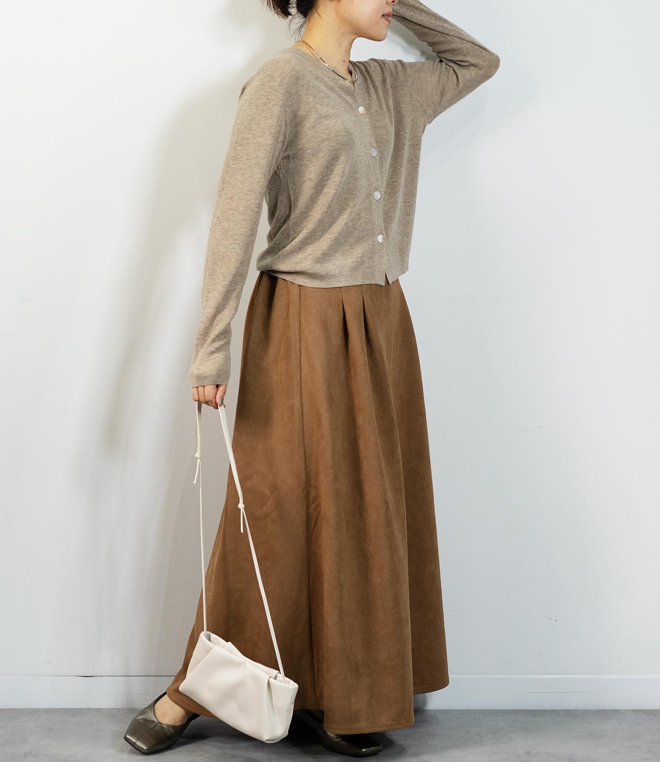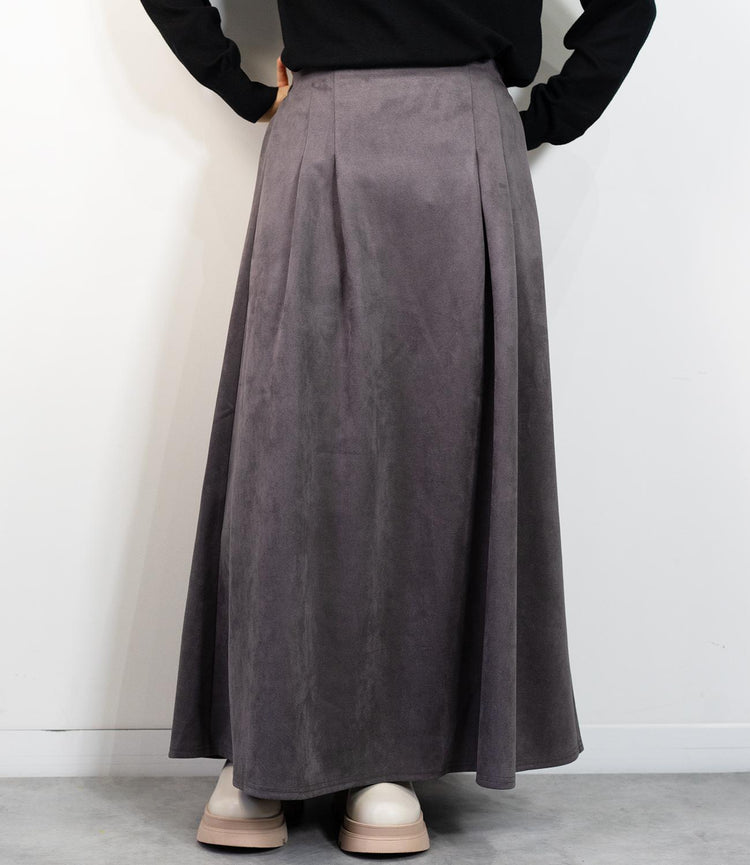 たっぷりとした分量感で上品に揺れる、フレアシルエットのスエード調スカート。