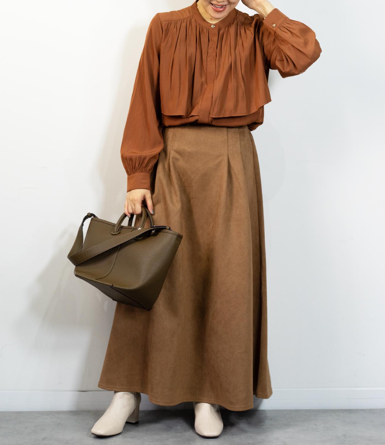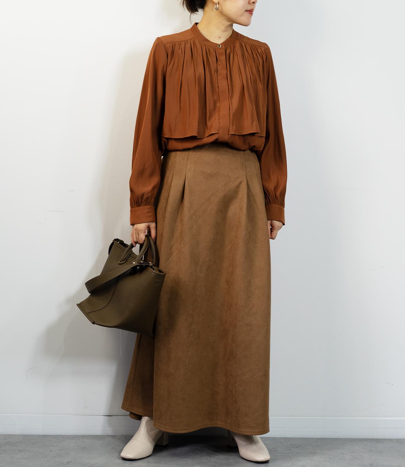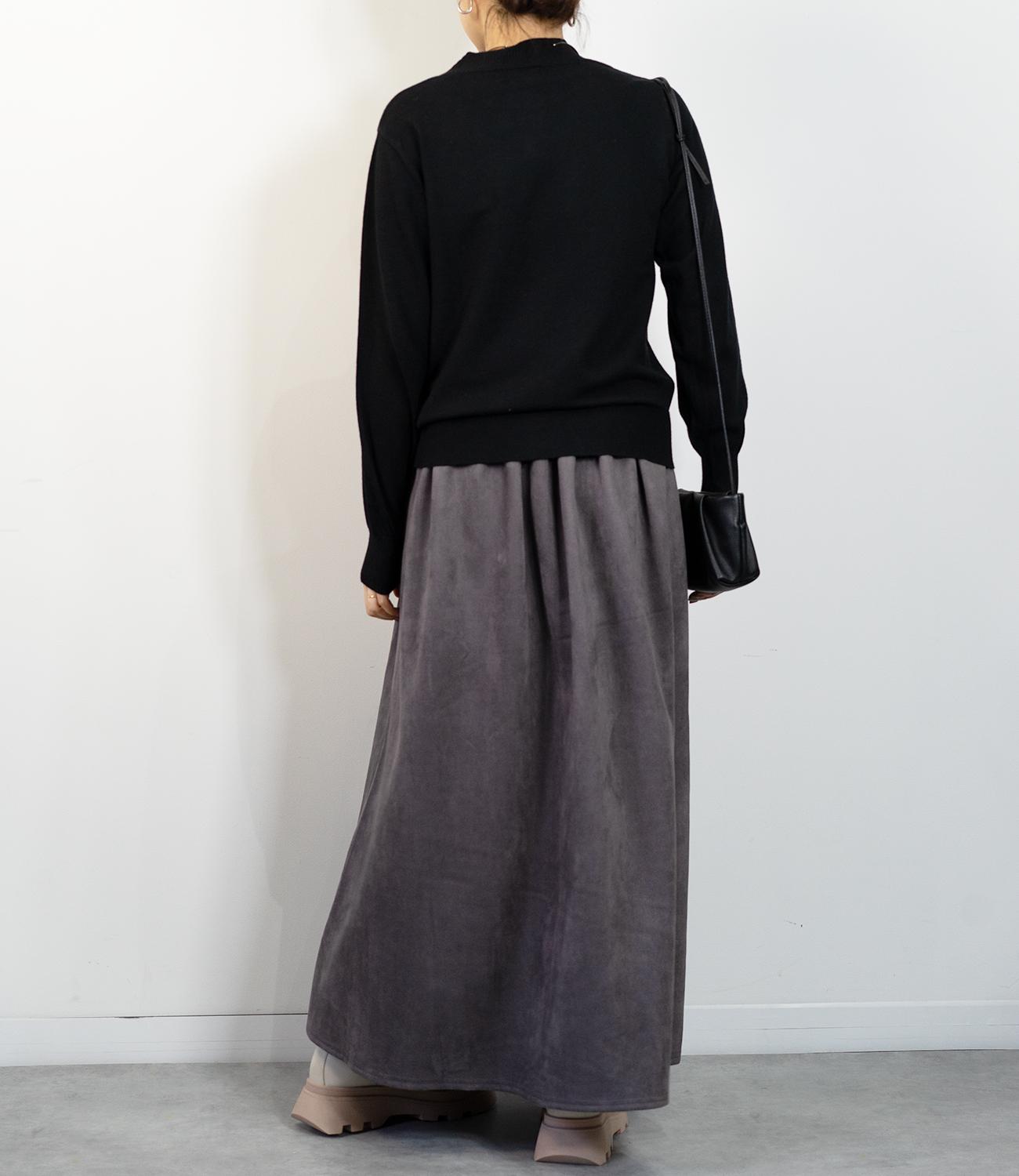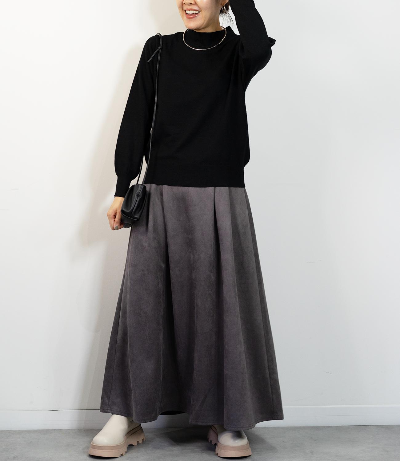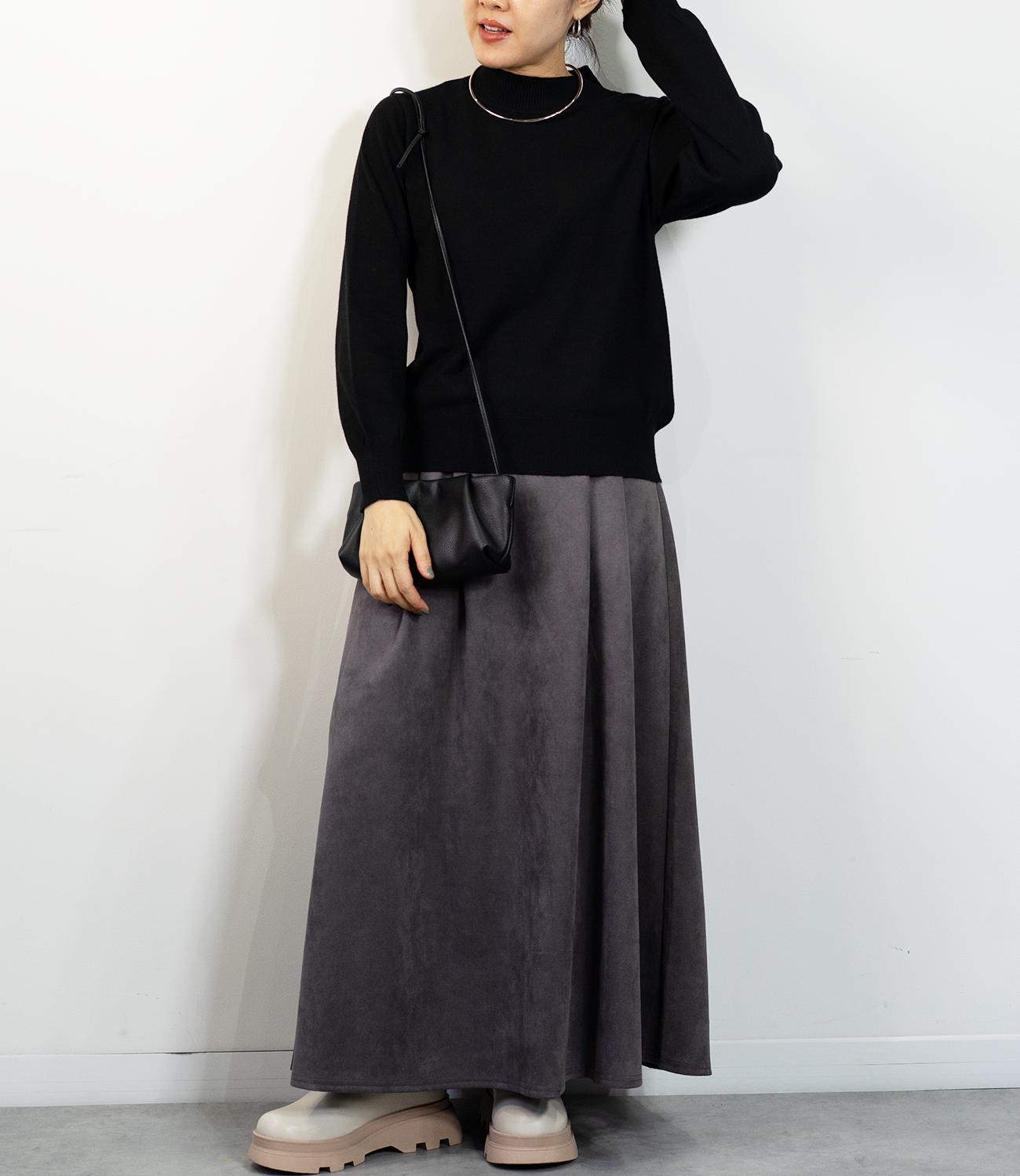 たっぷりとした分量感で上品に揺れる、フレアシルエットのスエード調スカート。
