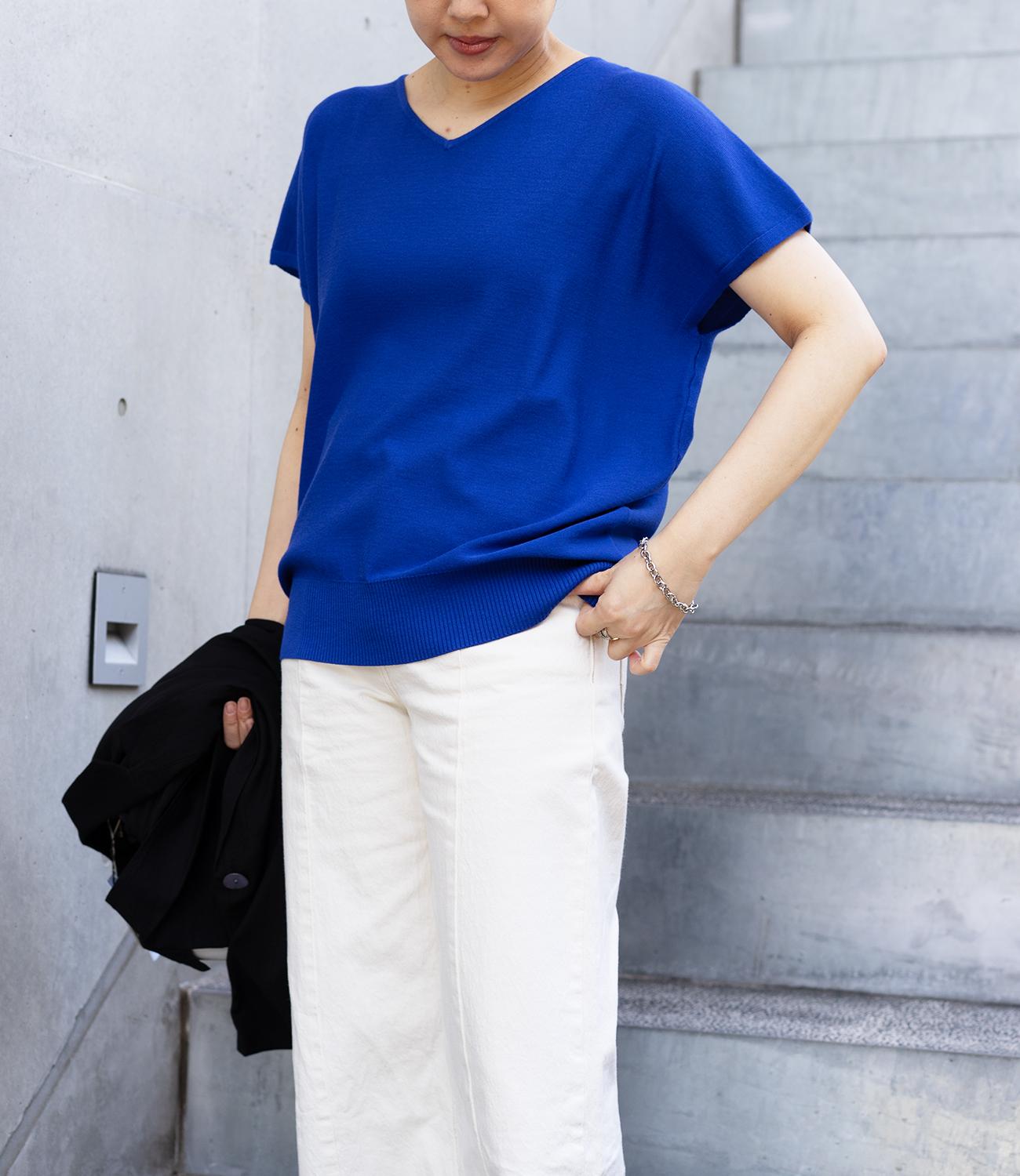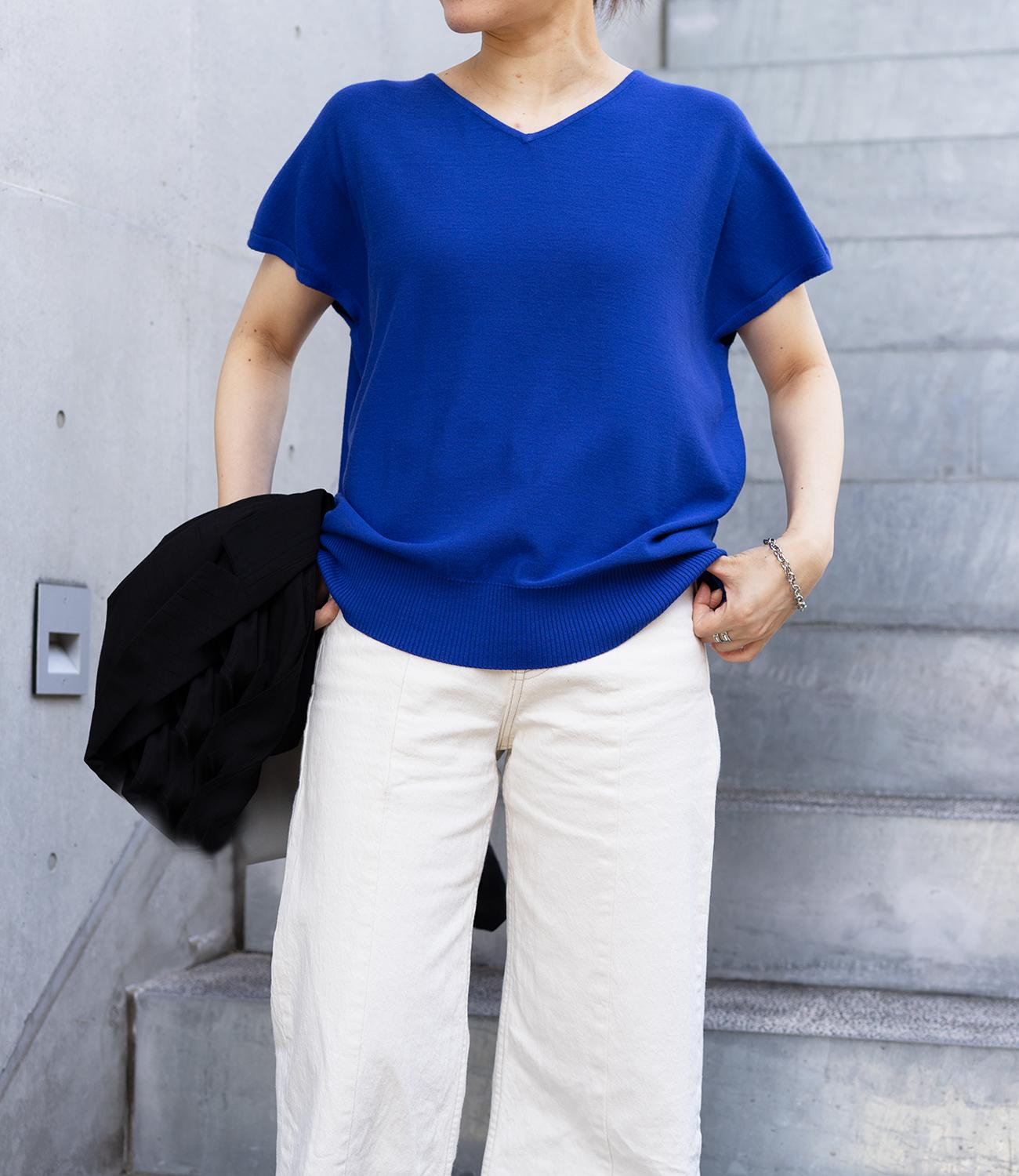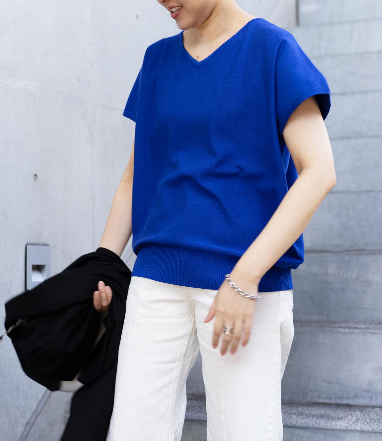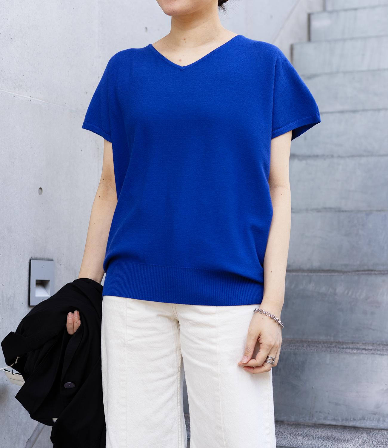 レーヨン混の落ち感の美しいハイゲージニット。柔らかい肌触りは夏場の暑い日にもストレスなくご着用いただける素材に。