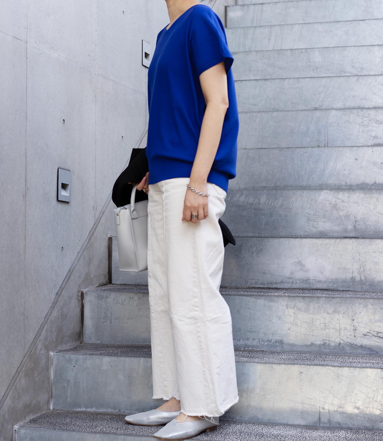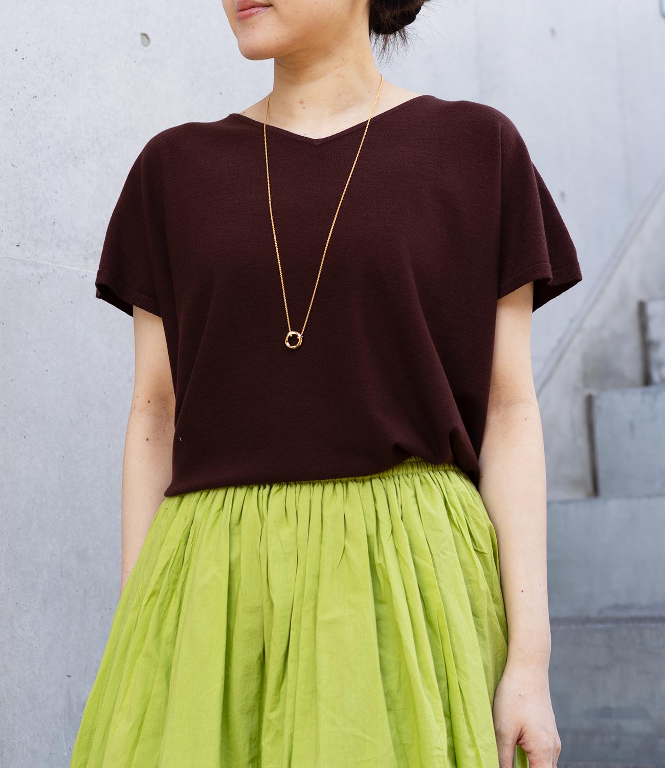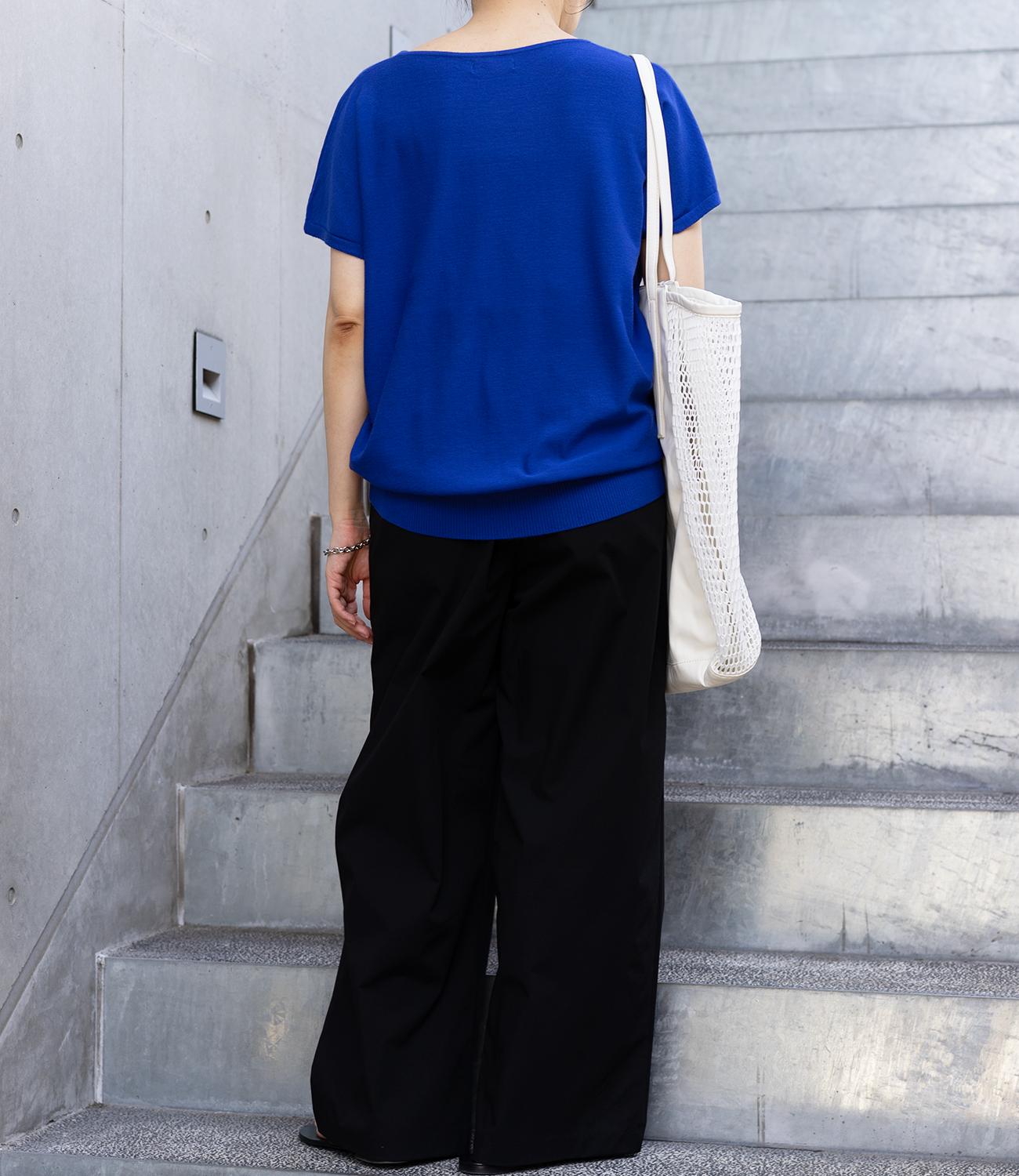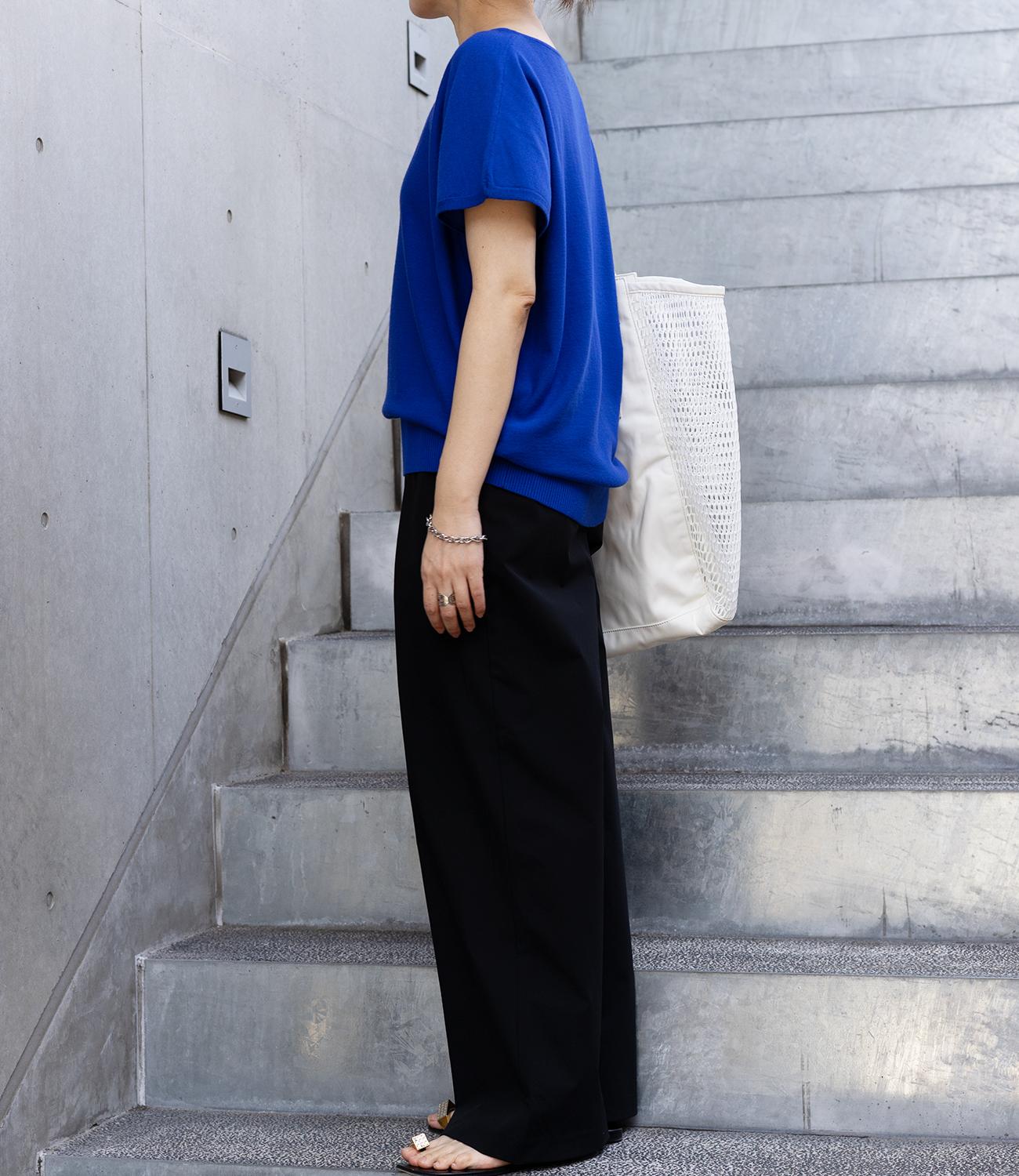 レーヨン混の落ち感の美しいハイゲージニット。柔らかい肌触りは夏場の暑い日にもストレスなくご着用いただける素材に。