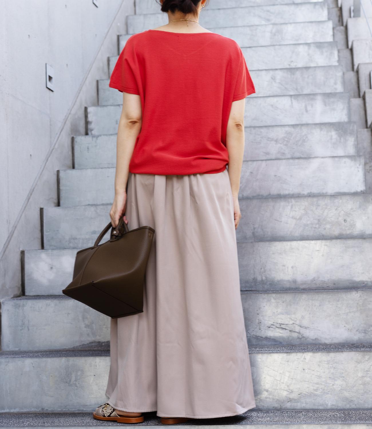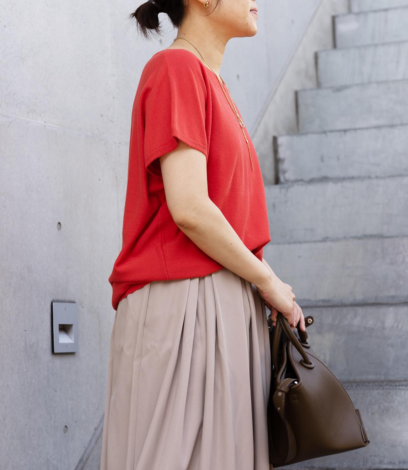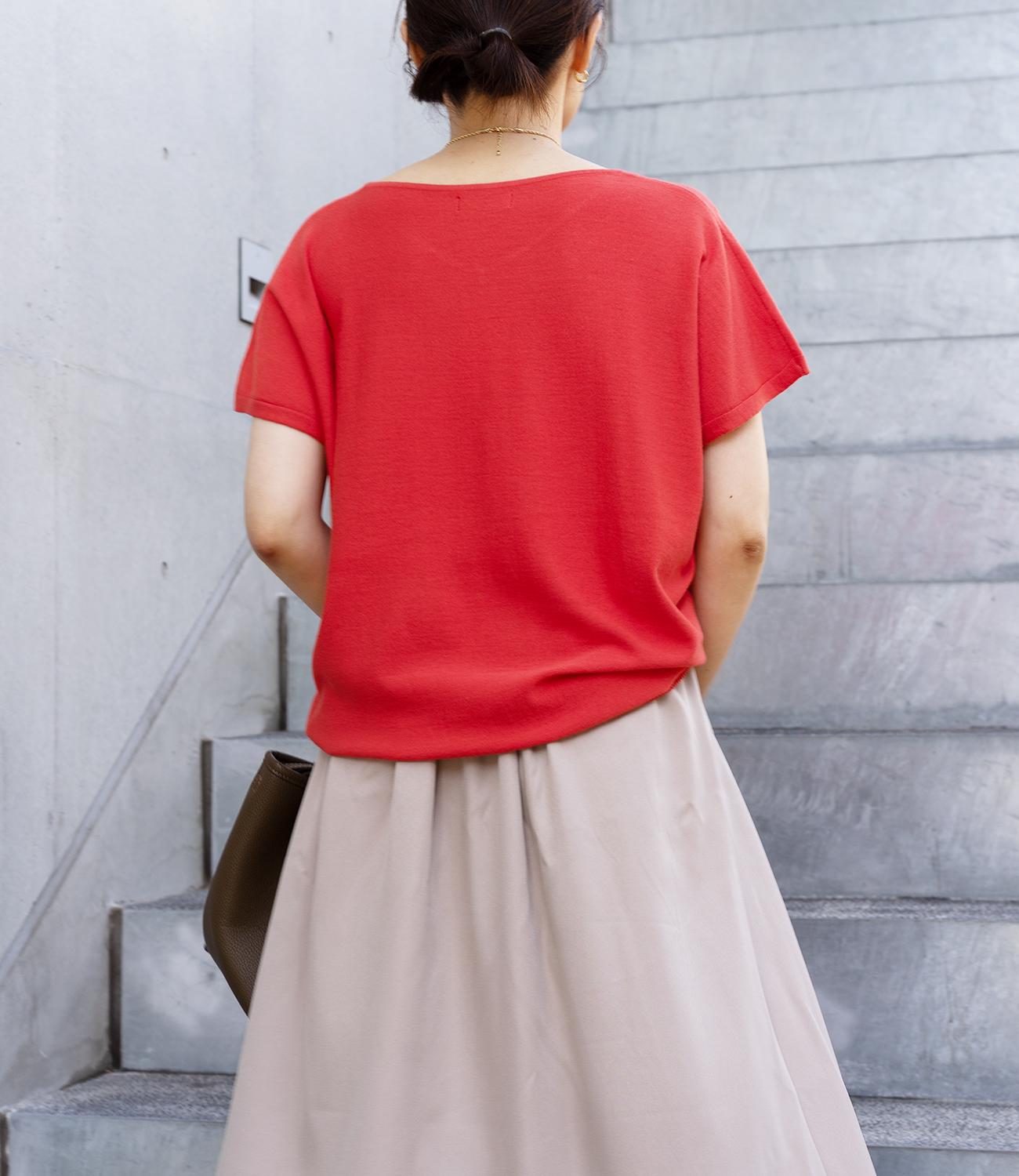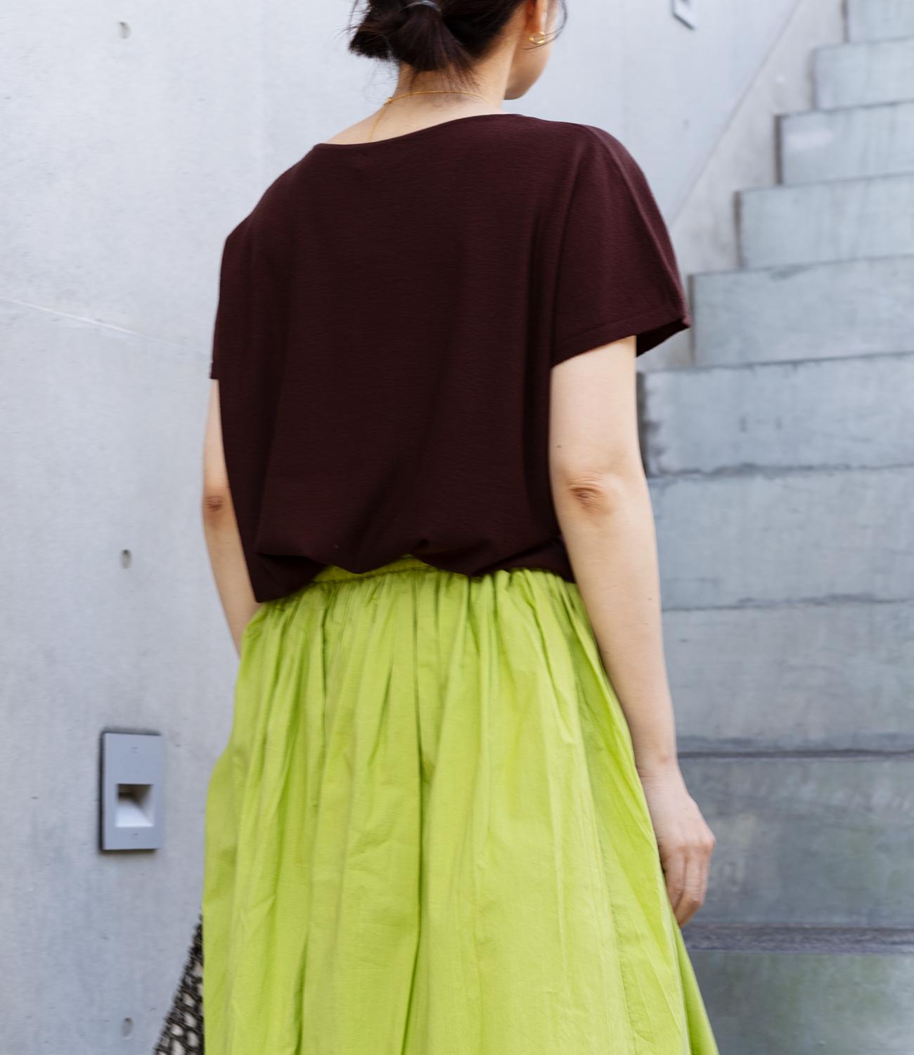 二の腕をしっかりとカバーしてくれる半袖丈のドルマンスリーブ。バスト周りもゆったりとしたサイズ感ではあるものの、タックインできるほどの柔らかな素材を使用しているので、かさばらず収まりの良いシルエットを作り出してくれます。