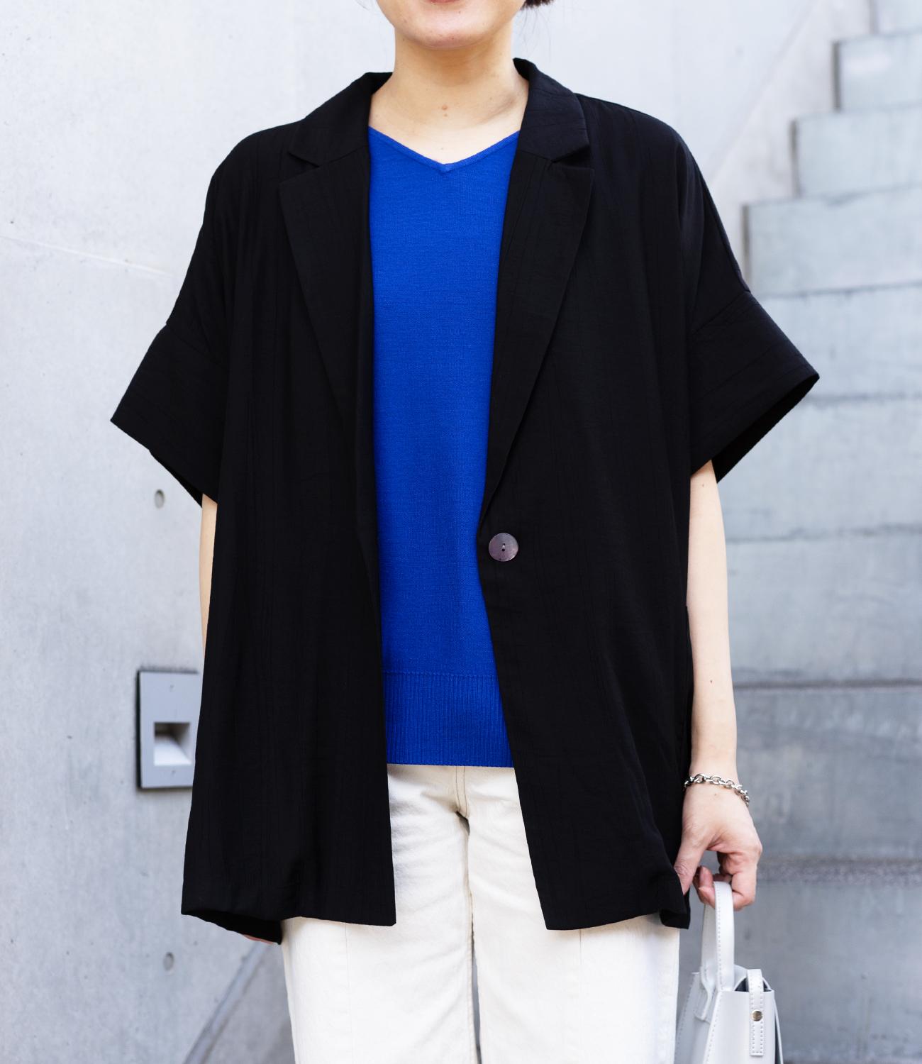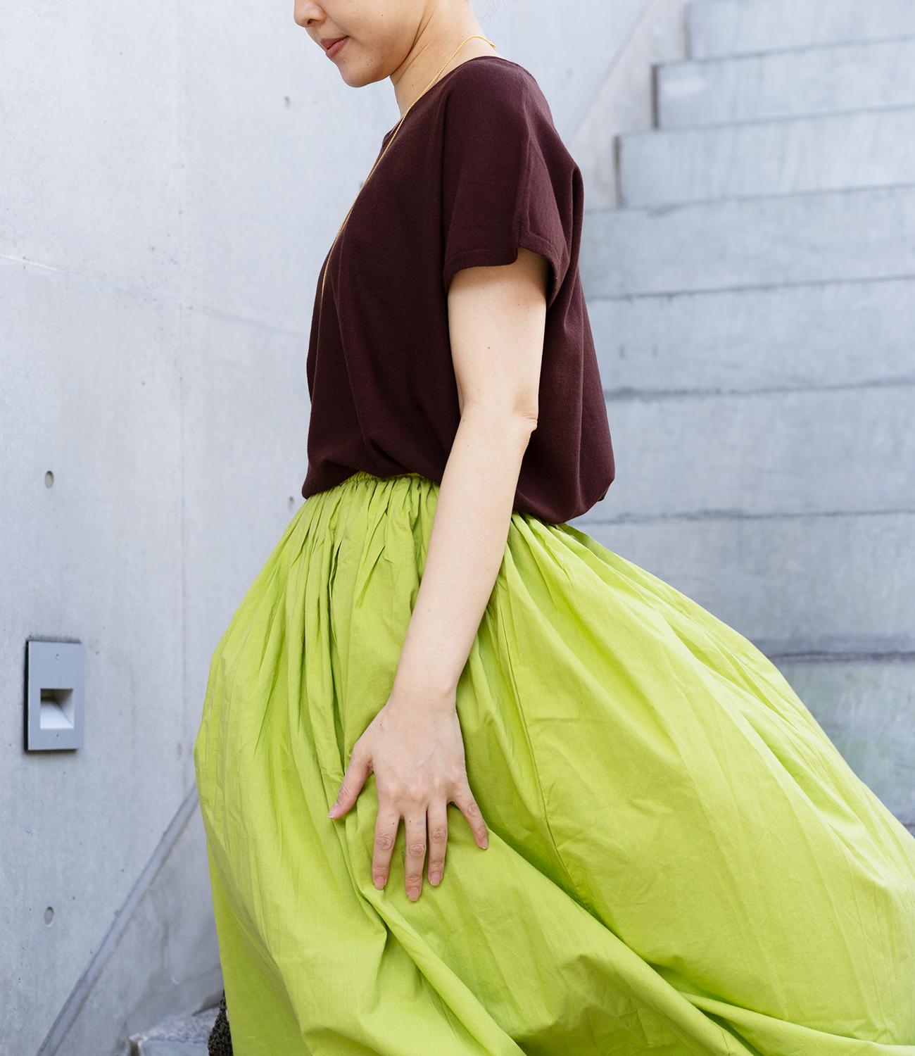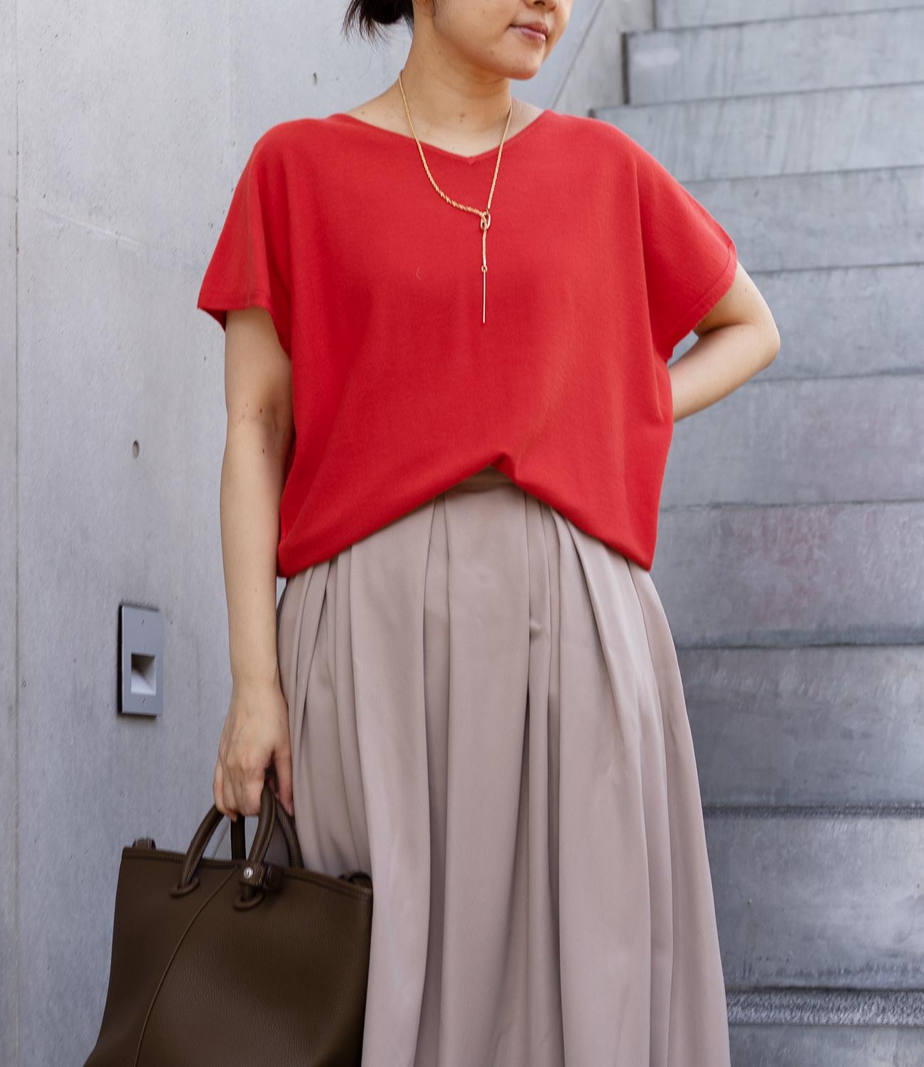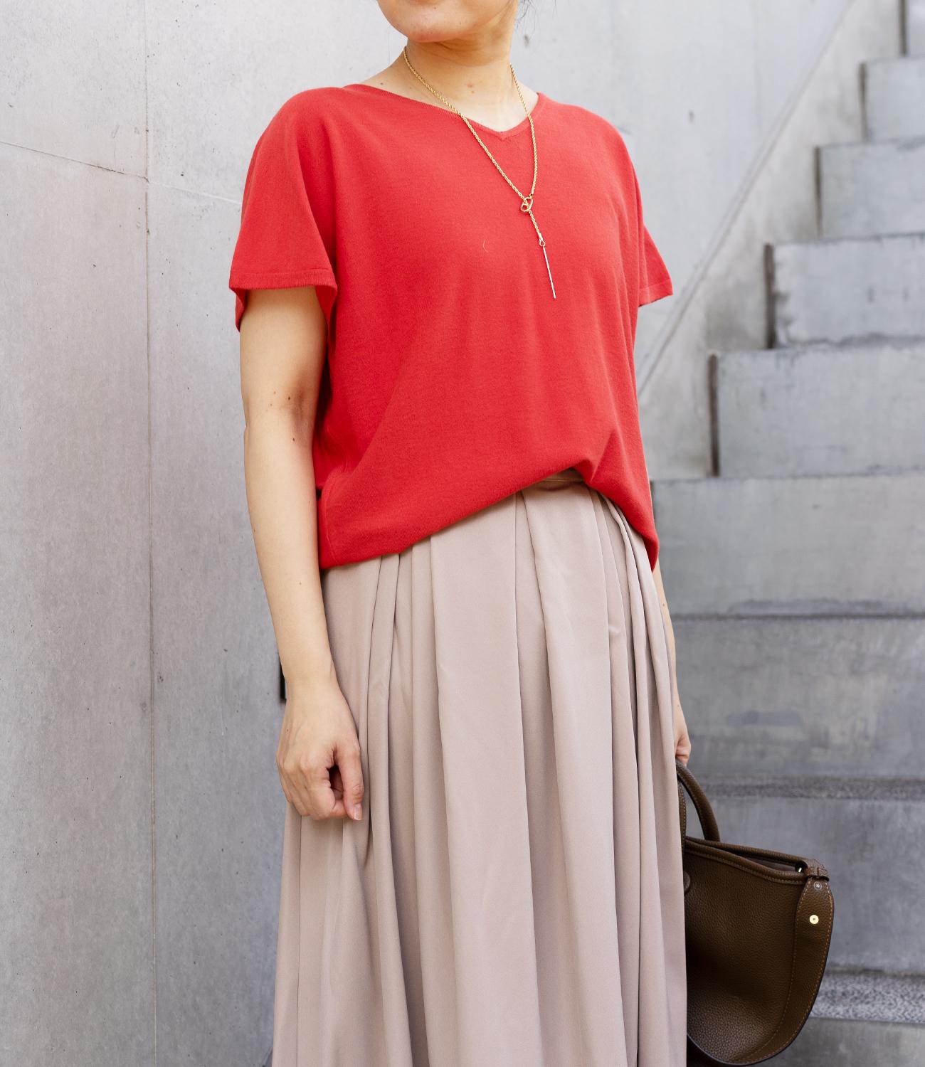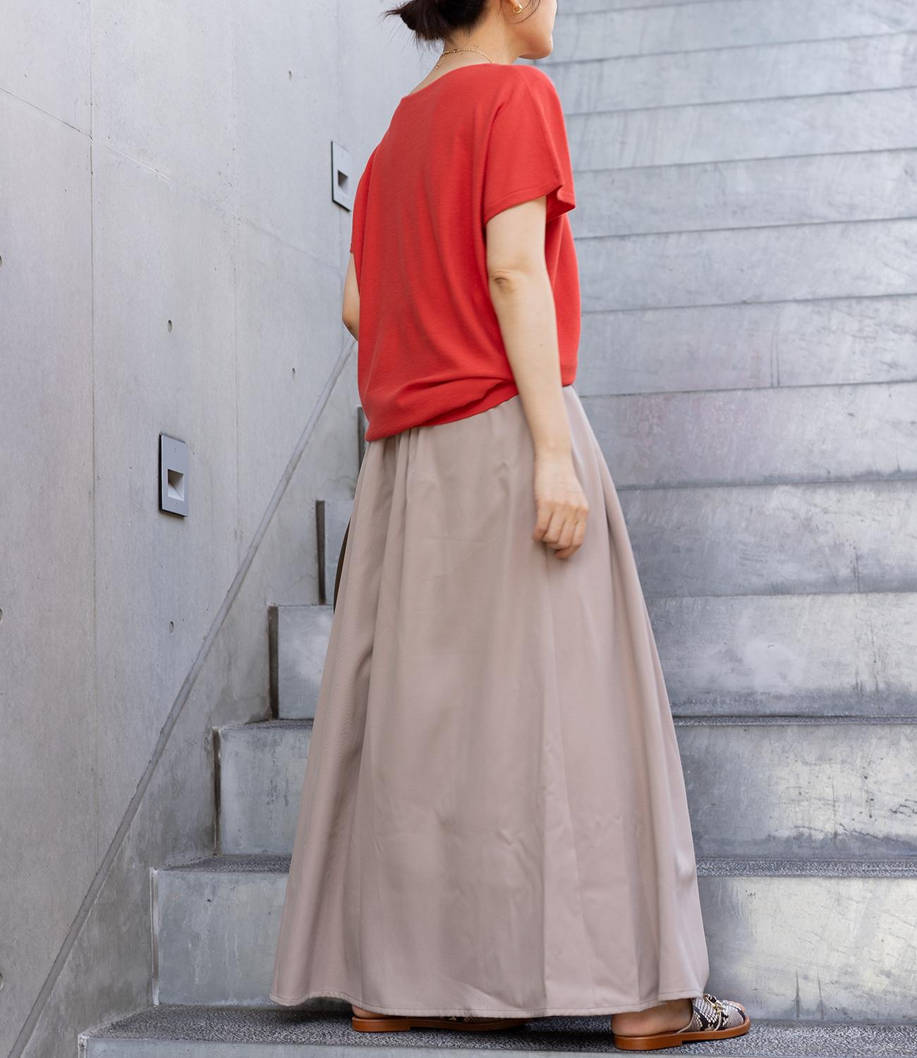 二の腕をしっかりとカバーしてくれる半袖丈のドルマンスリーブ。バスト周りもゆったりとしたサイズ感ではあるものの、タックインできるほどの柔らかな素材を使用しているので、かさばらず収まりの良いシルエットを作り出してくれます。