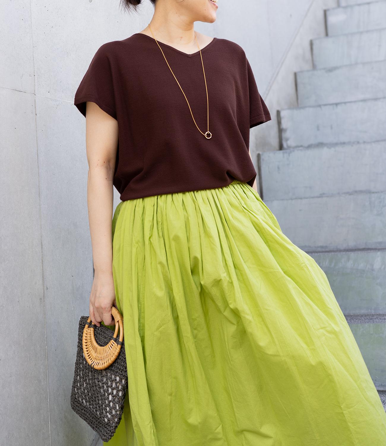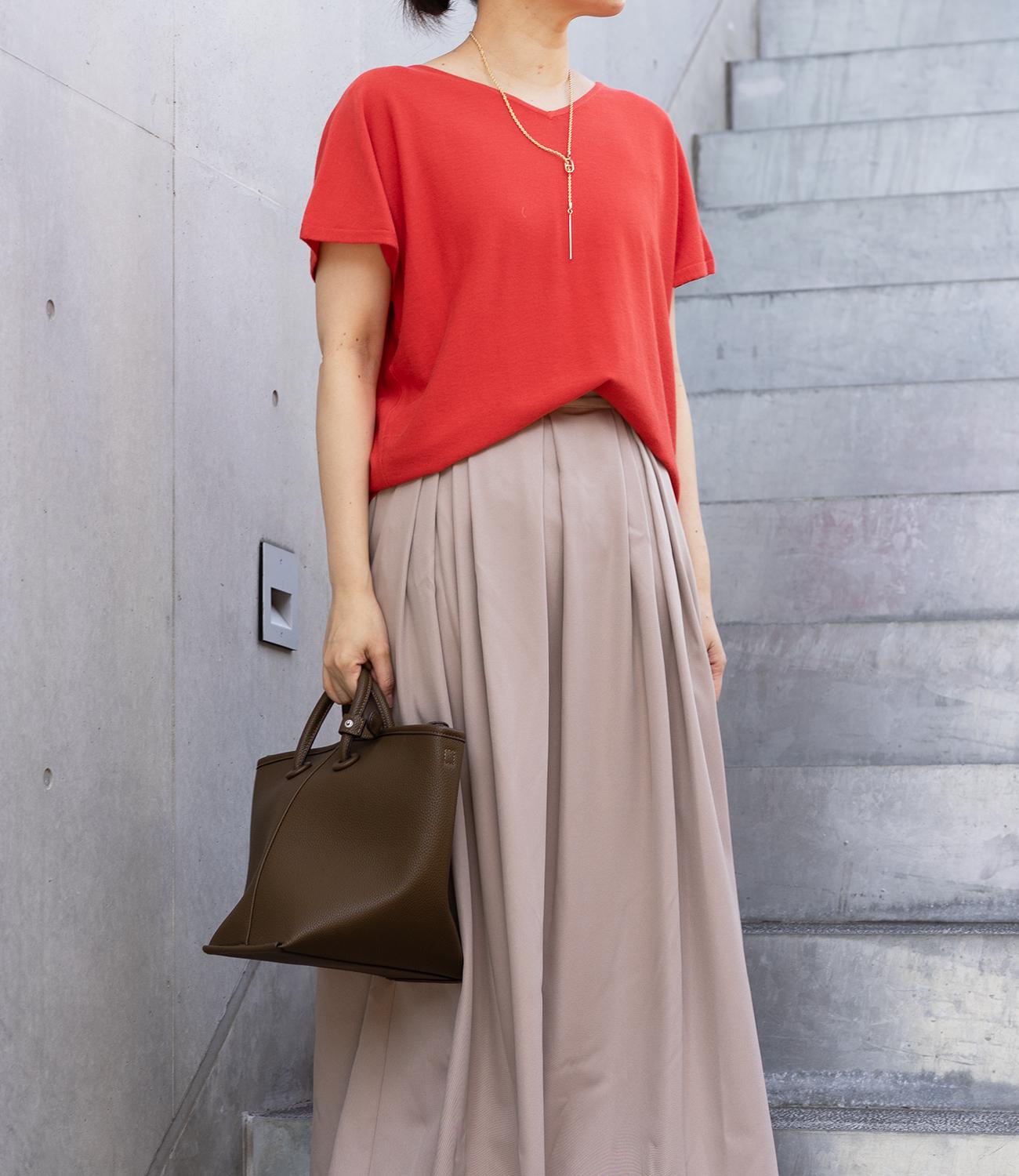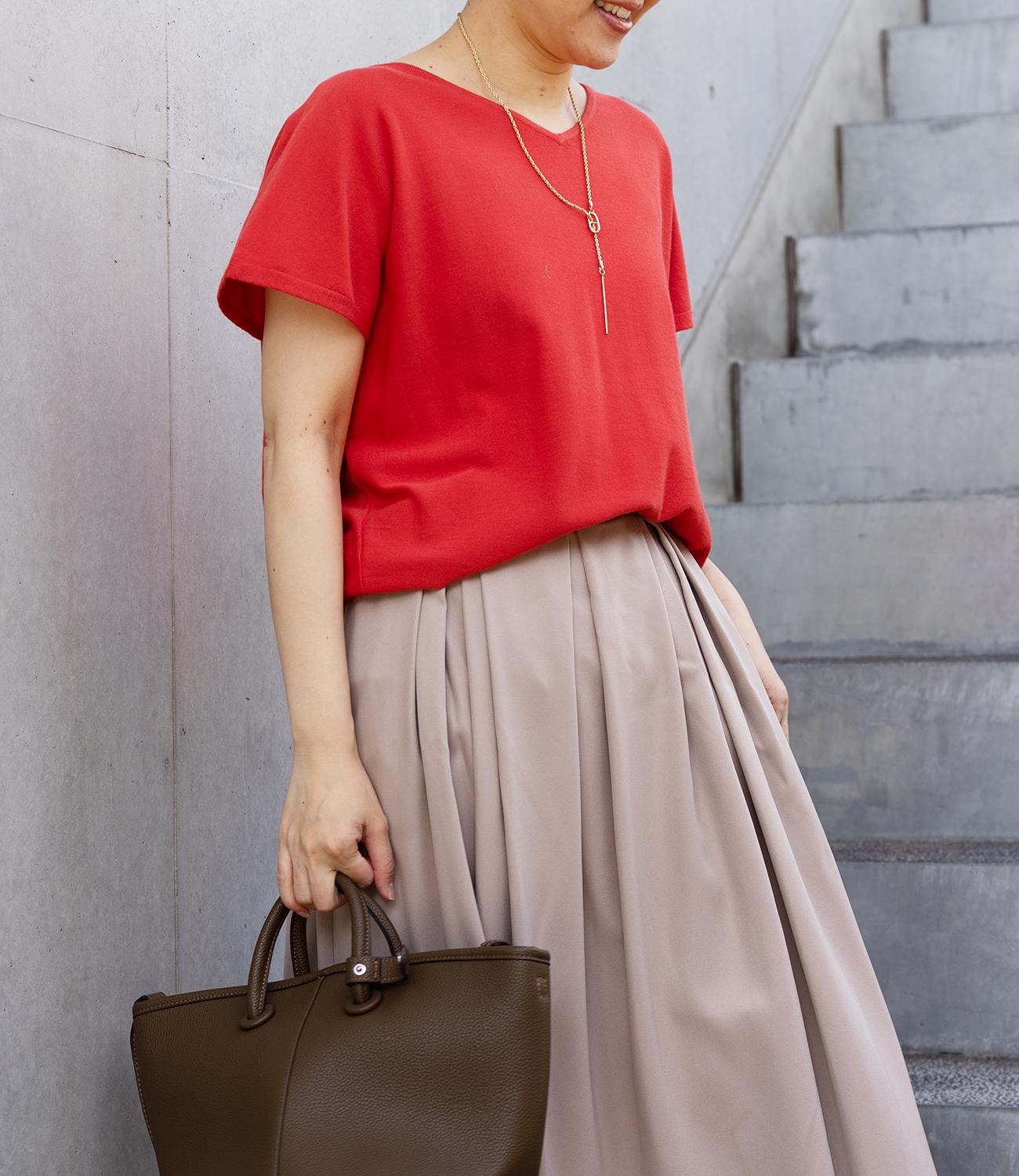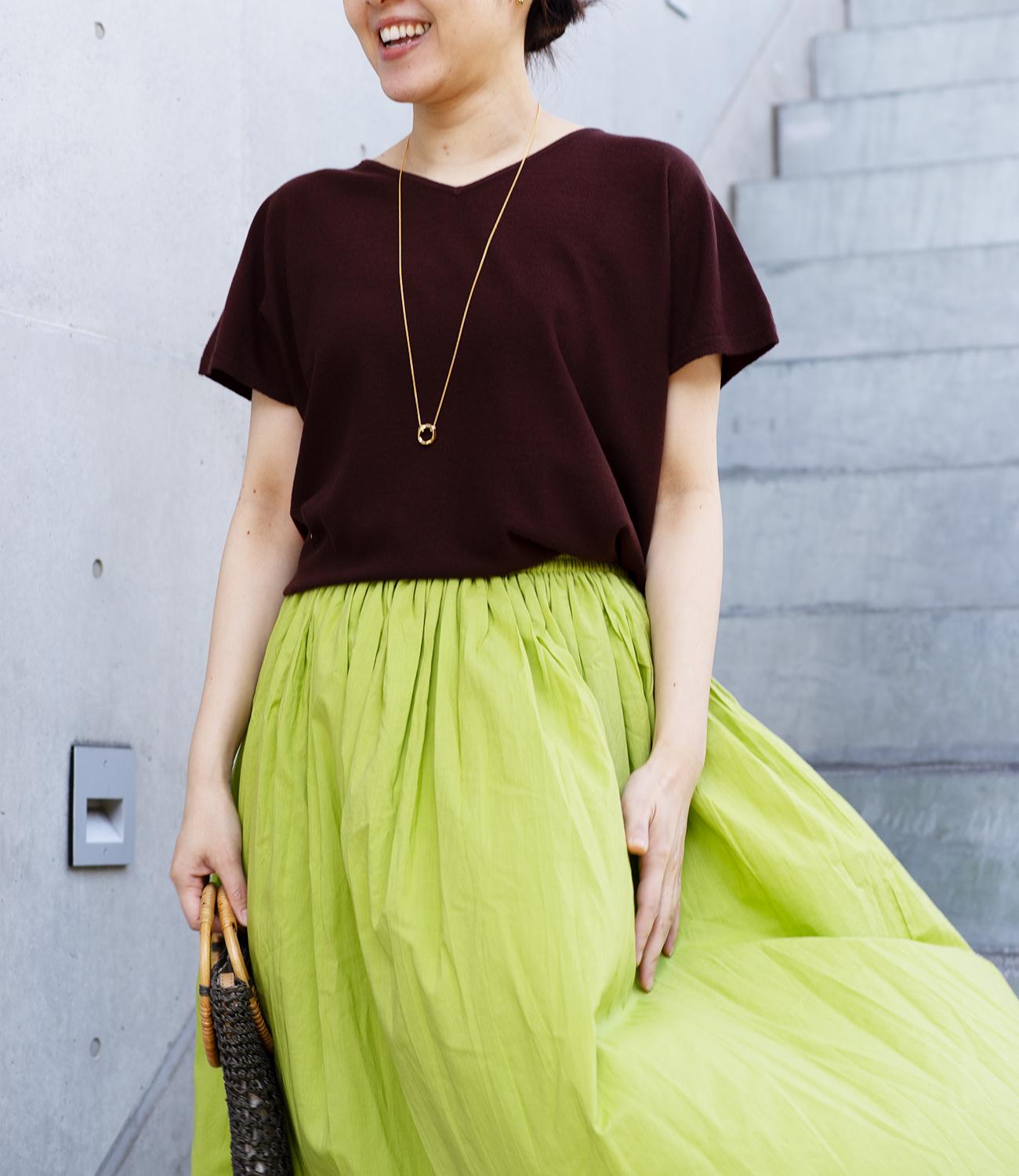 二の腕をしっかりとカバーしてくれる半袖丈のドルマンスリーブ。バスト周りもゆったりとしたサイズ感ではあるものの、タックインできるほどの柔らかな素材を使用しているので、かさばらず収まりの良いシルエットを作り出してくれます。