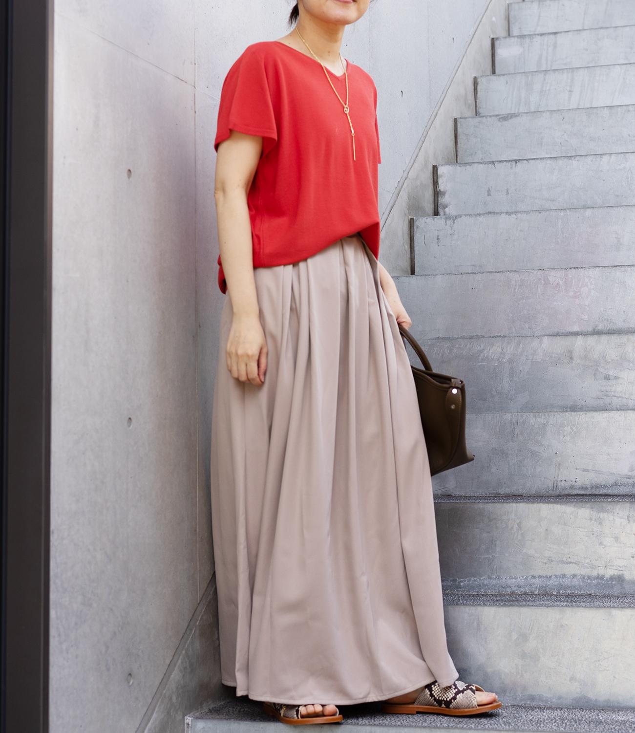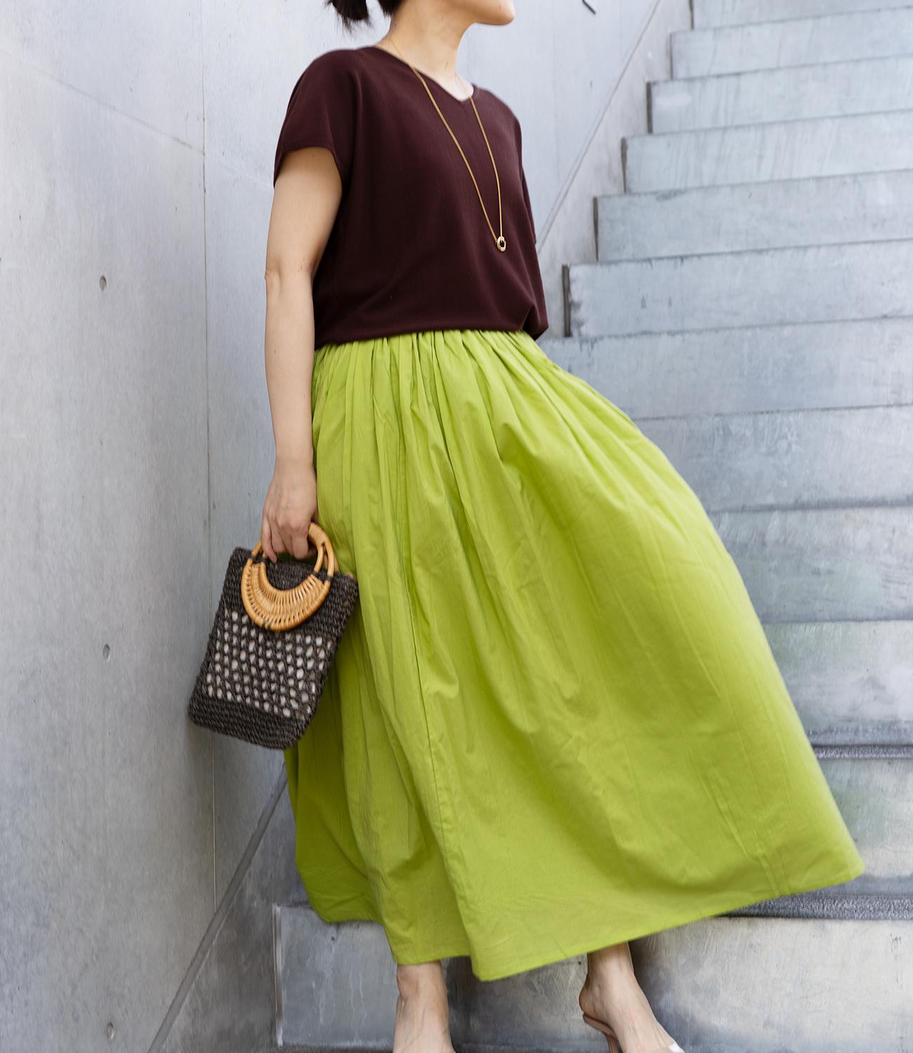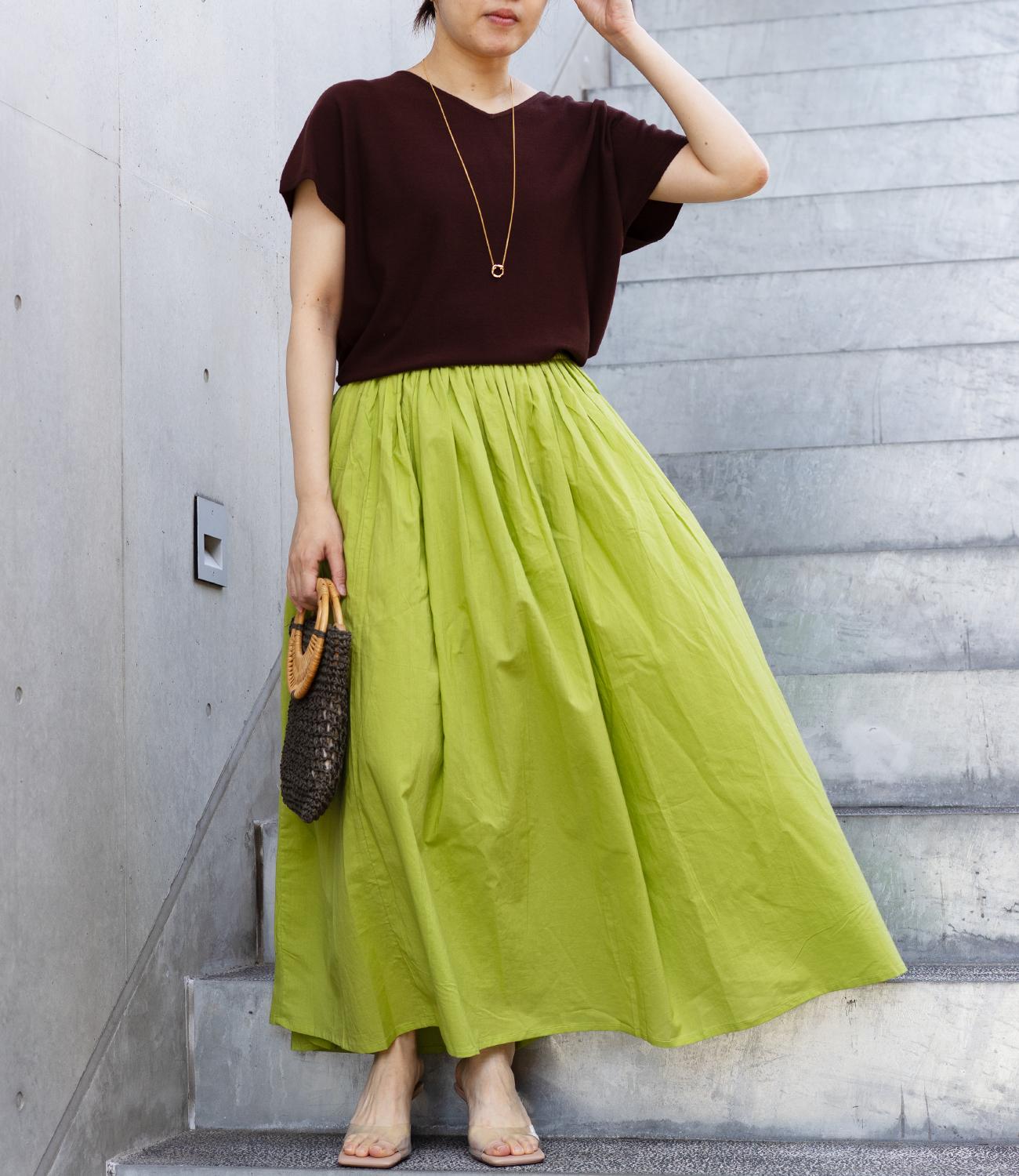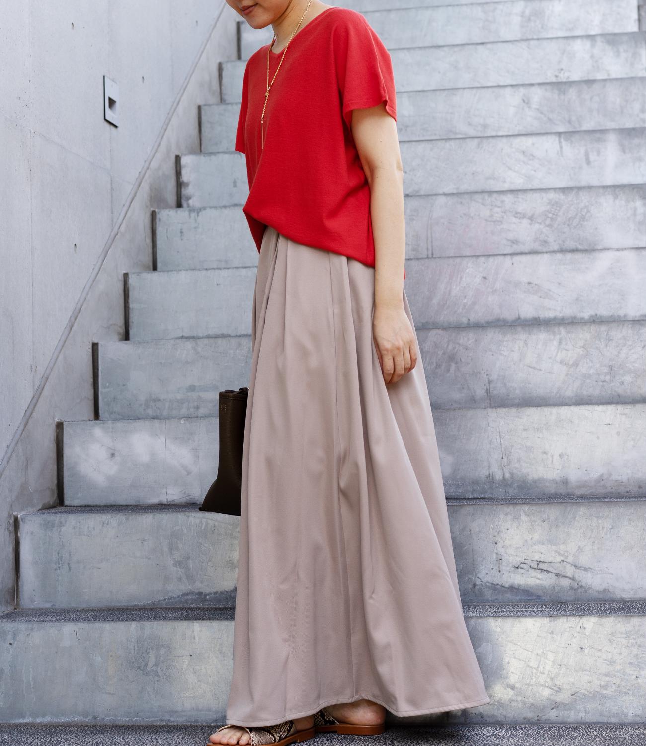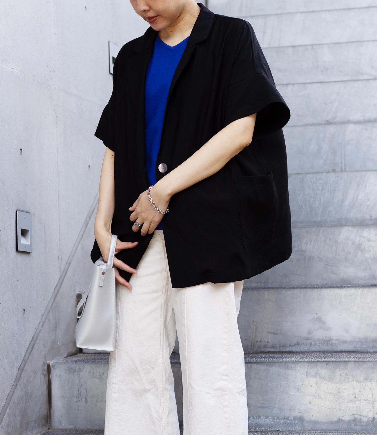 二の腕をしっかりとカバーしてくれる半袖丈のドルマンスリーブ。バスト周りもゆったりとしたサイズ感ではあるものの、タックインできるほどの柔らかな素材を使用しているので、かさばらず収まりの良いシルエットを作り出してくれます。