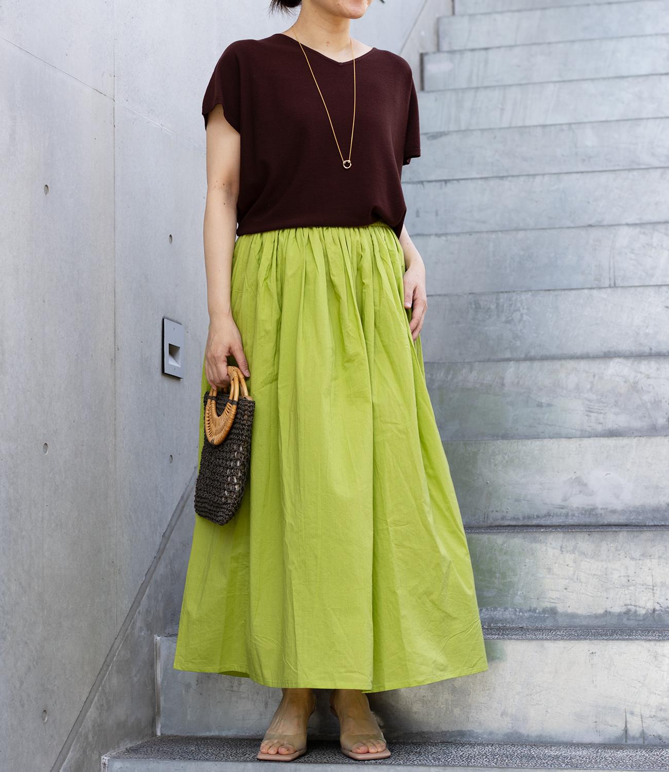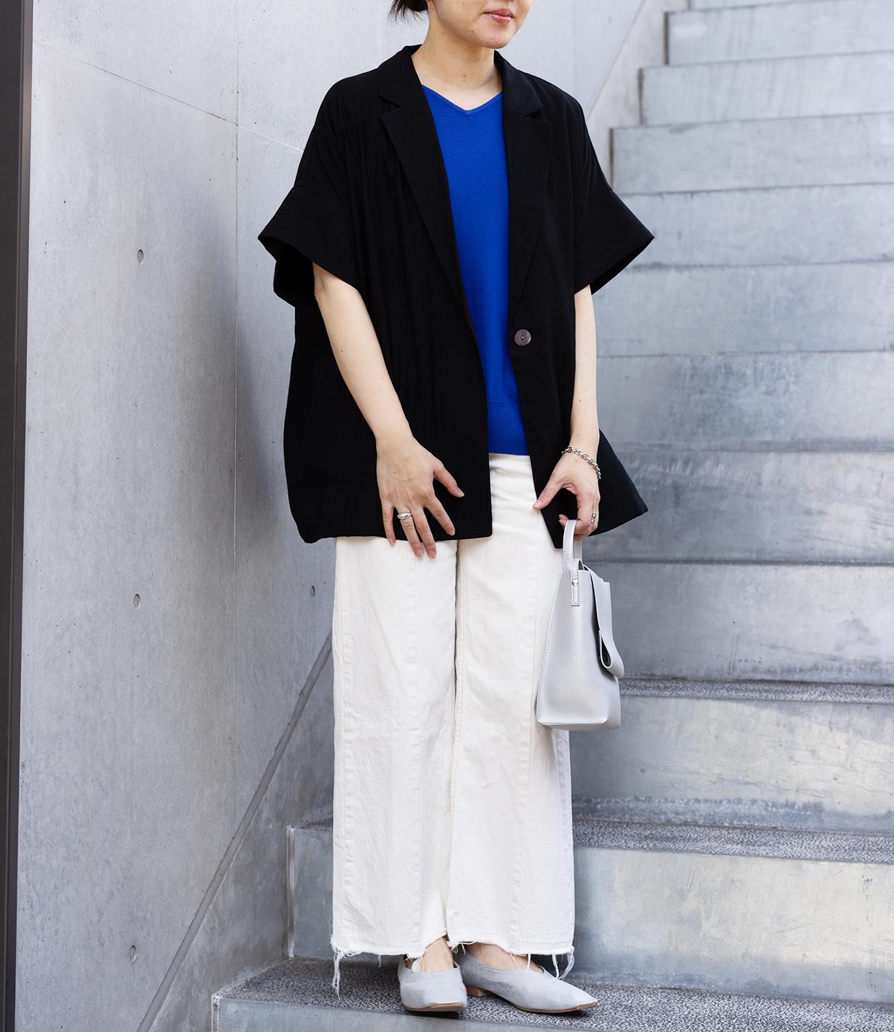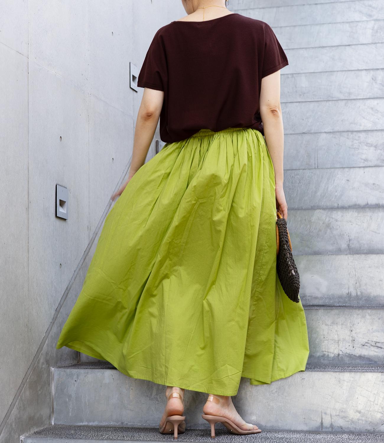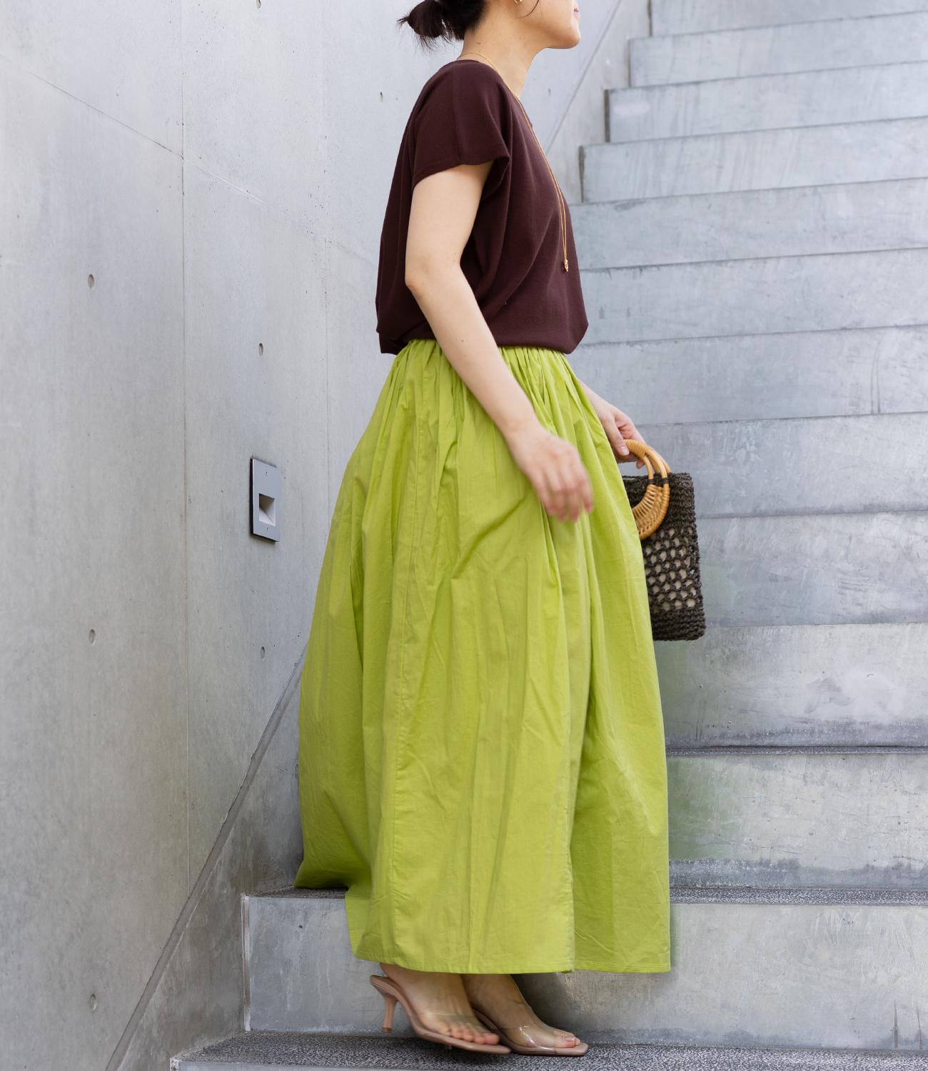 二の腕をしっかりとカバーしてくれる半袖丈のドルマンスリーブ。バスト周りもゆったりとしたサイズ感ではあるものの、タックインできるほどの柔らかな素材を使用しているので、かさばらず収まりの良いシルエットを作り出してくれます。