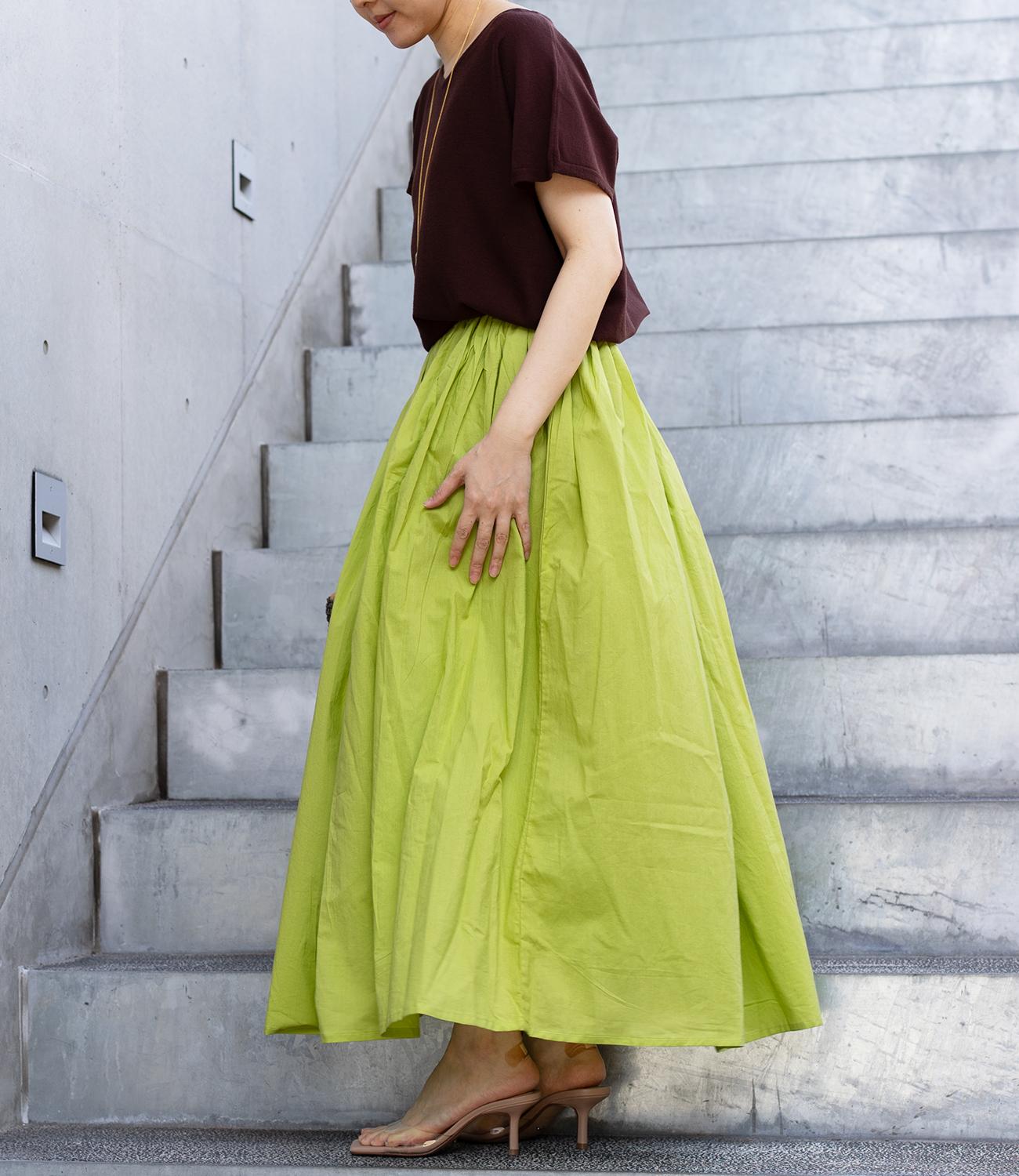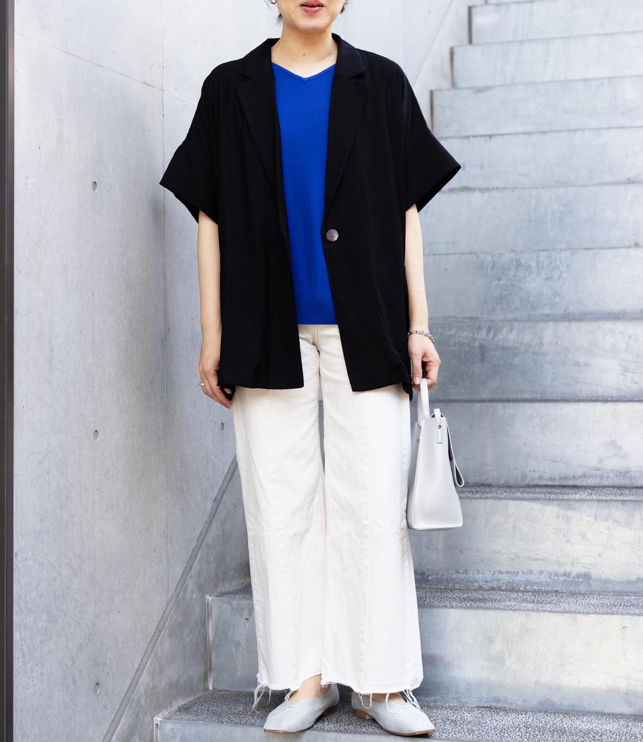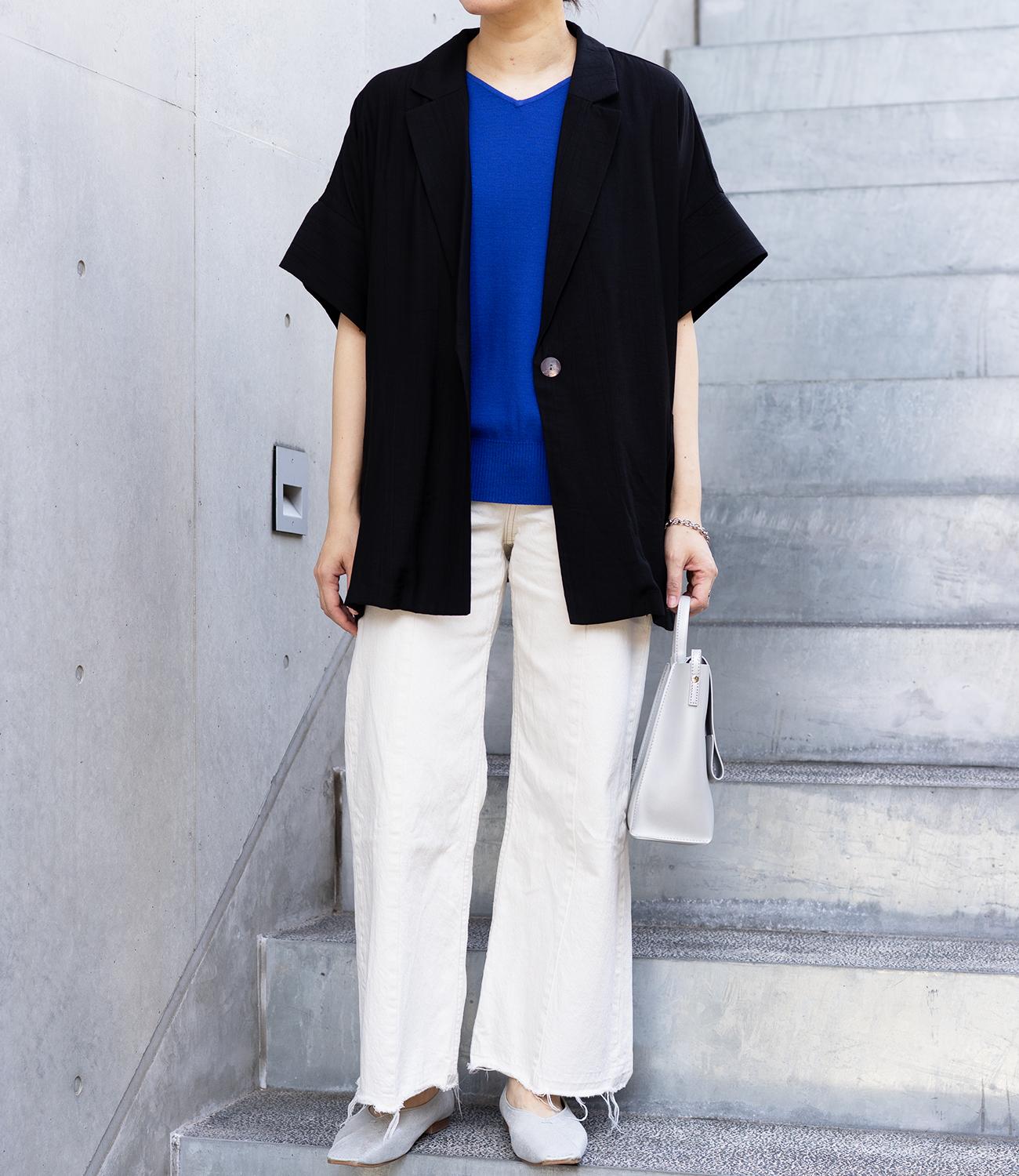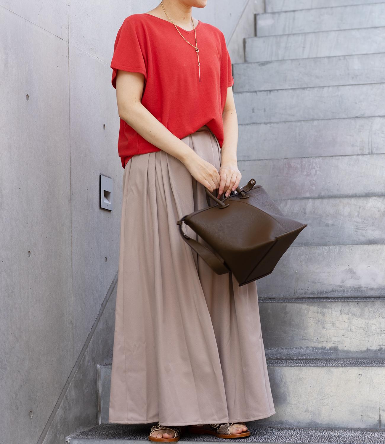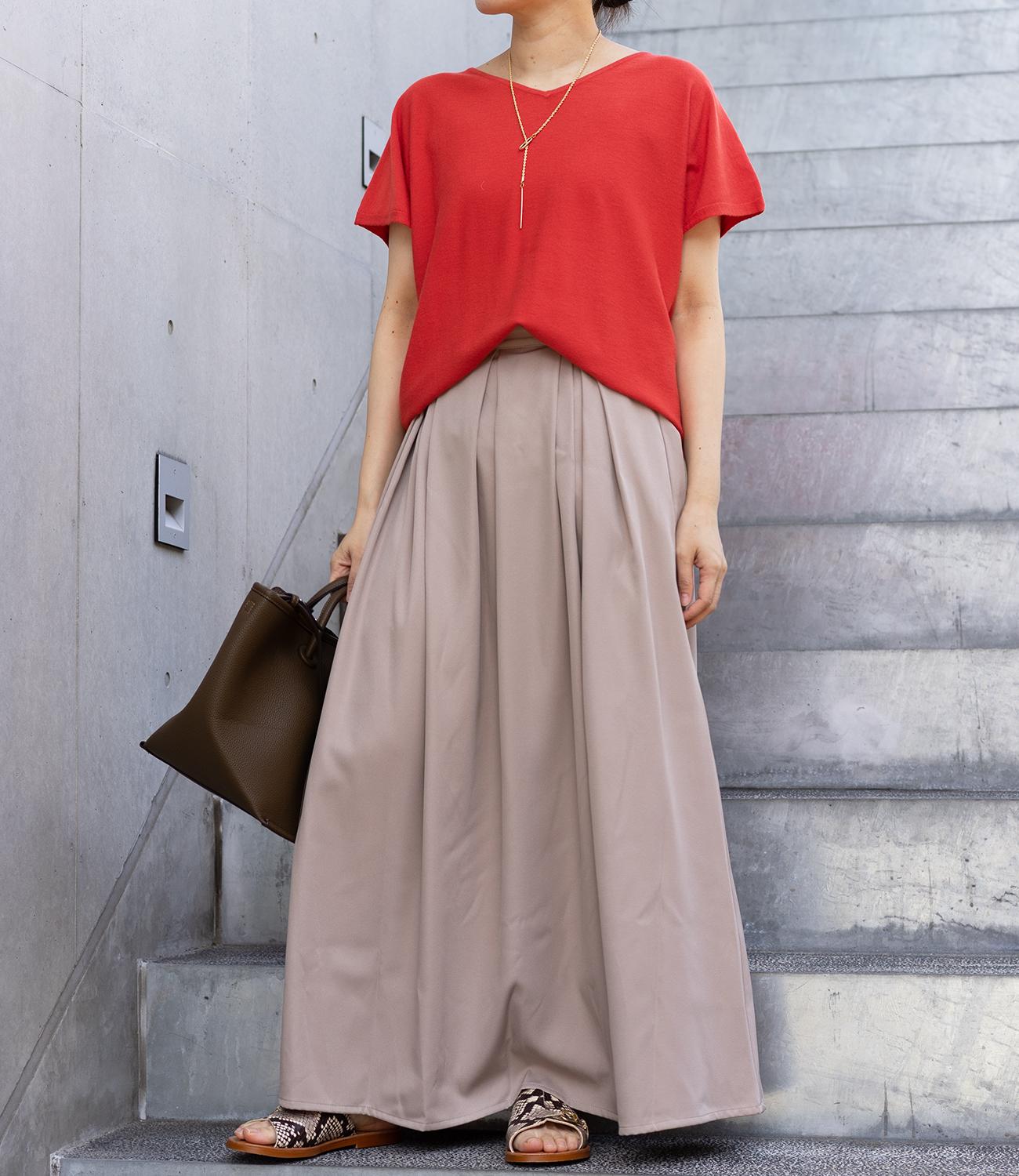 二の腕をしっかりとカバーしてくれる半袖丈のドルマンスリーブ。バスト周りもゆったりとしたサイズ感ではあるものの、タックインできるほどの柔らかな素材を使用しているので、かさばらず収まりの良いシルエットを作り出してくれます。