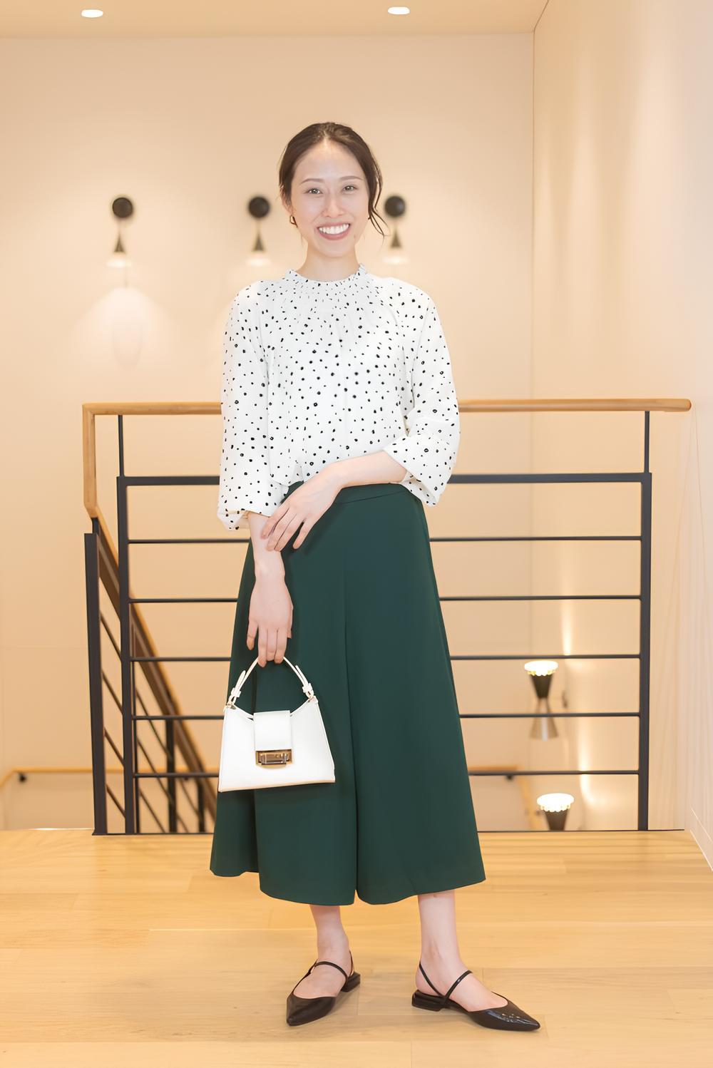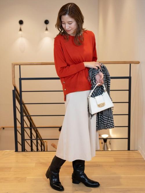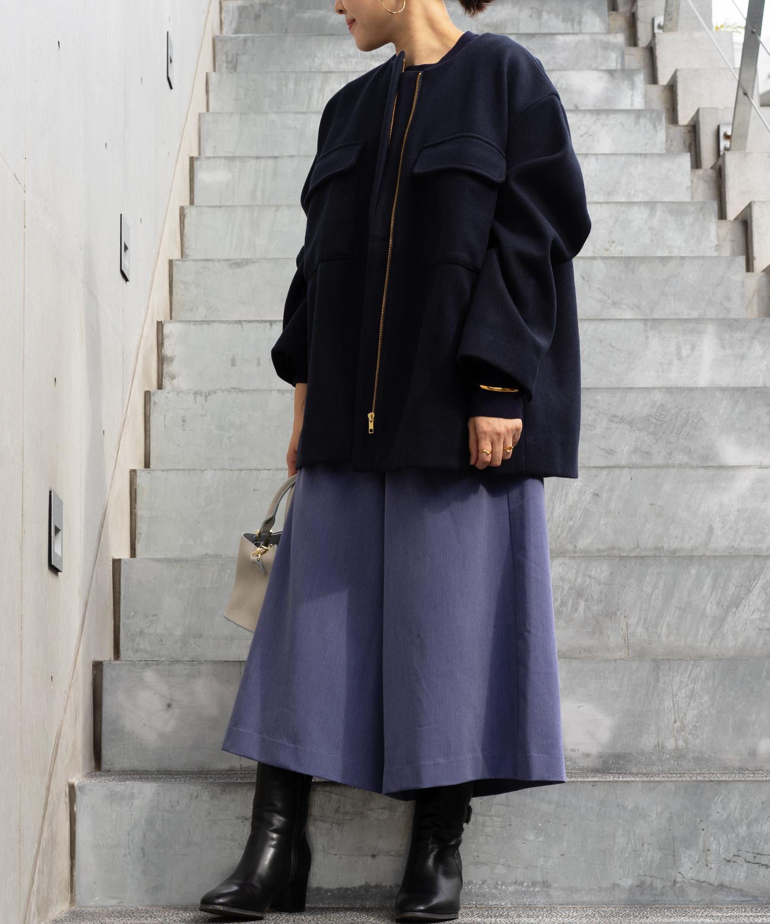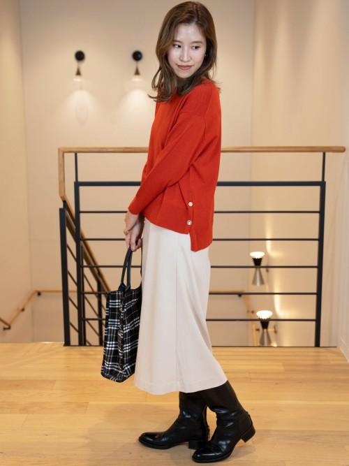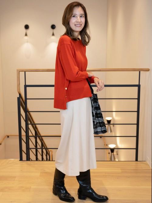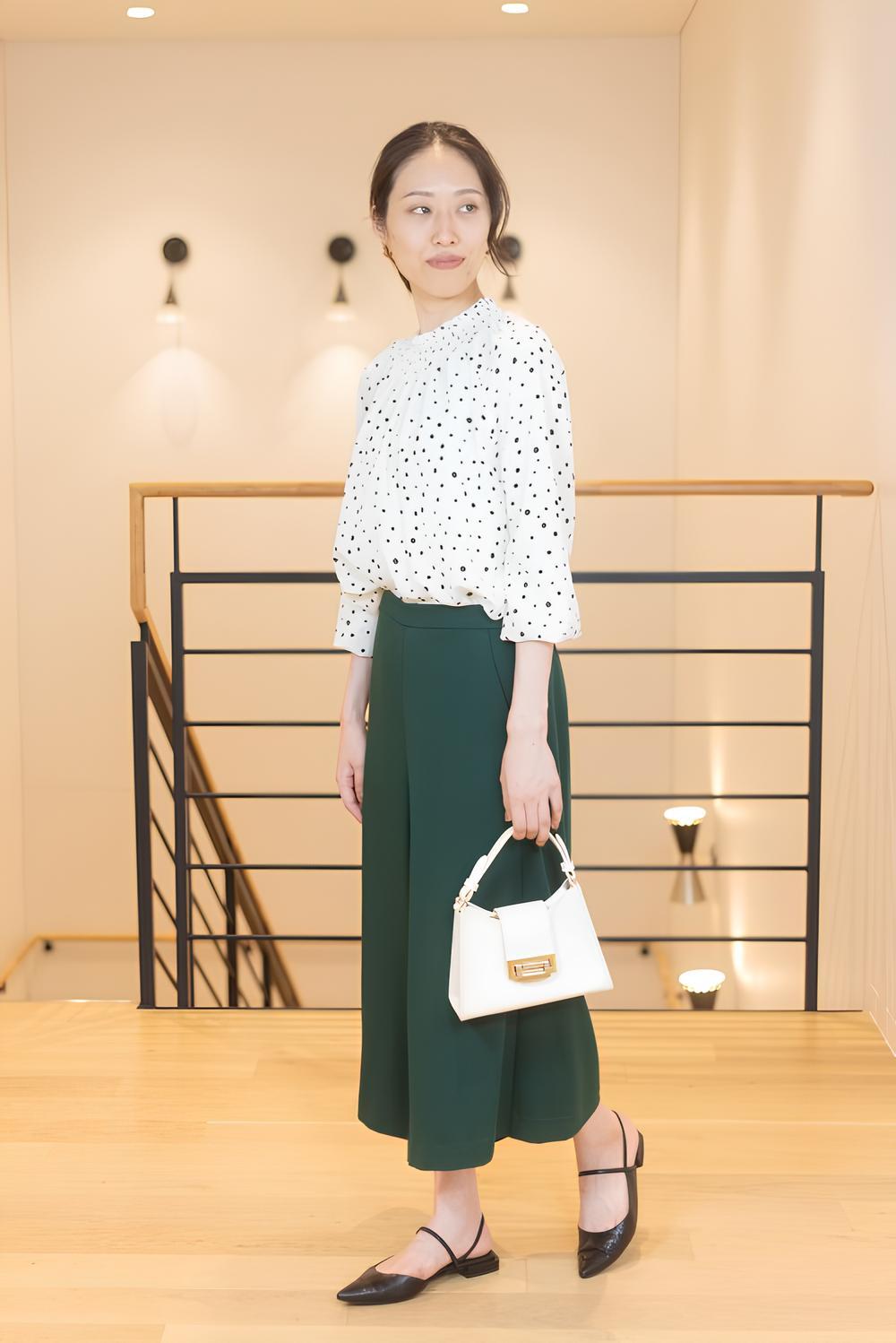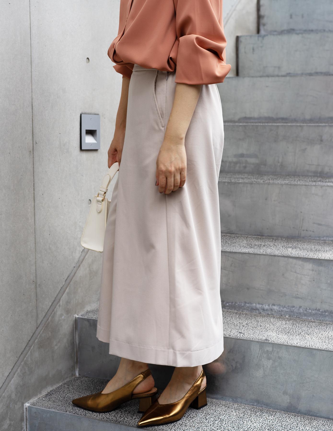 後ろウエストはゴムを入れ、左脇ファスナーあき仕様なので、楽な着心地ときれい見えを両立してくれます。