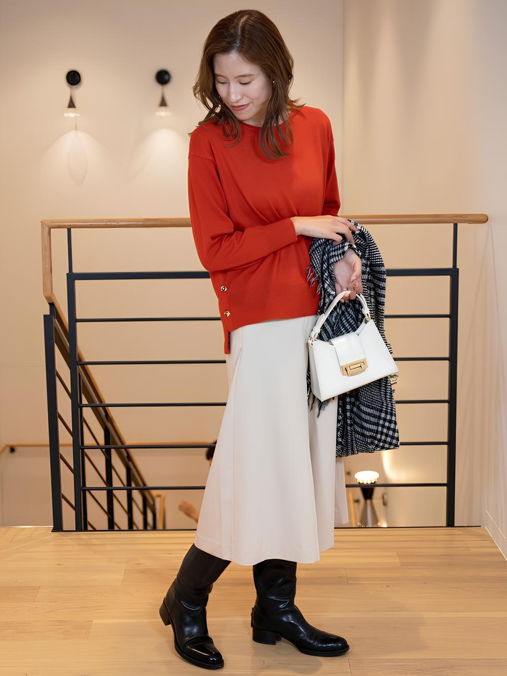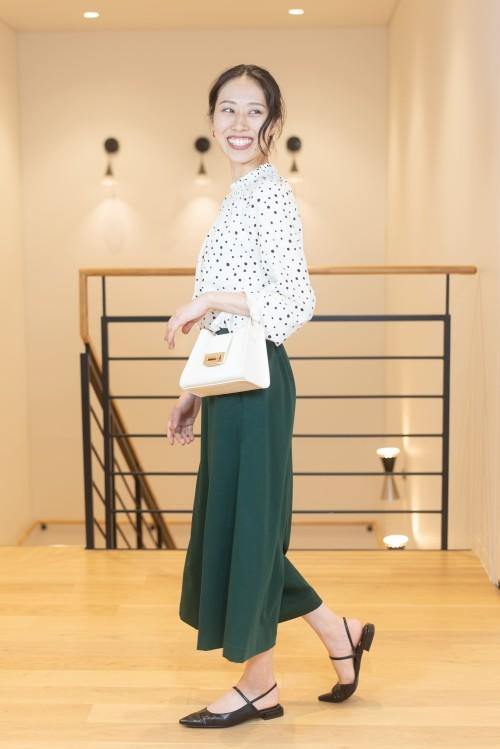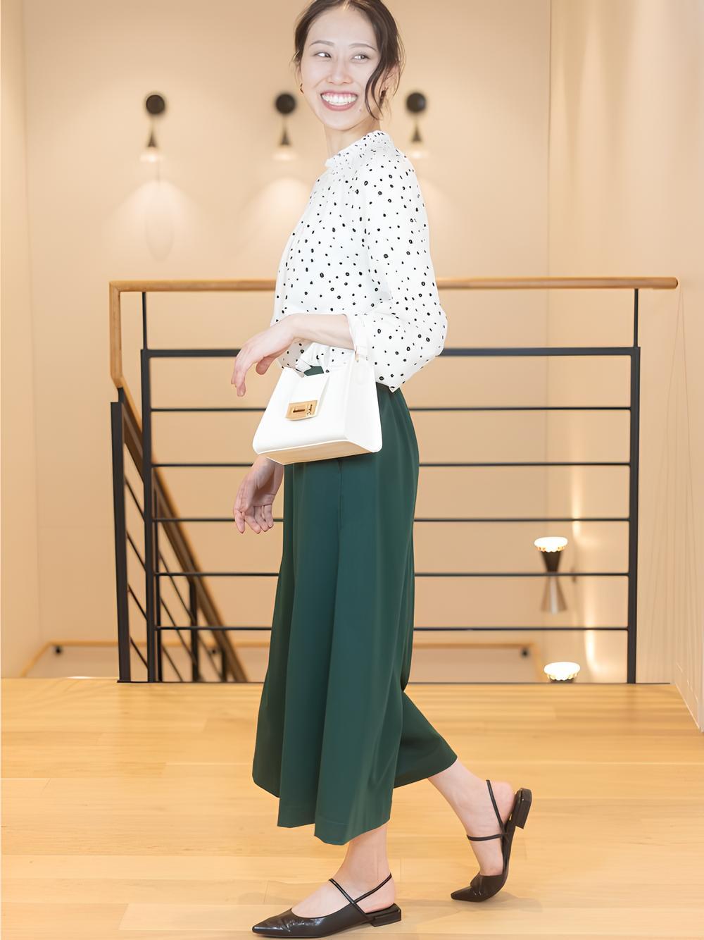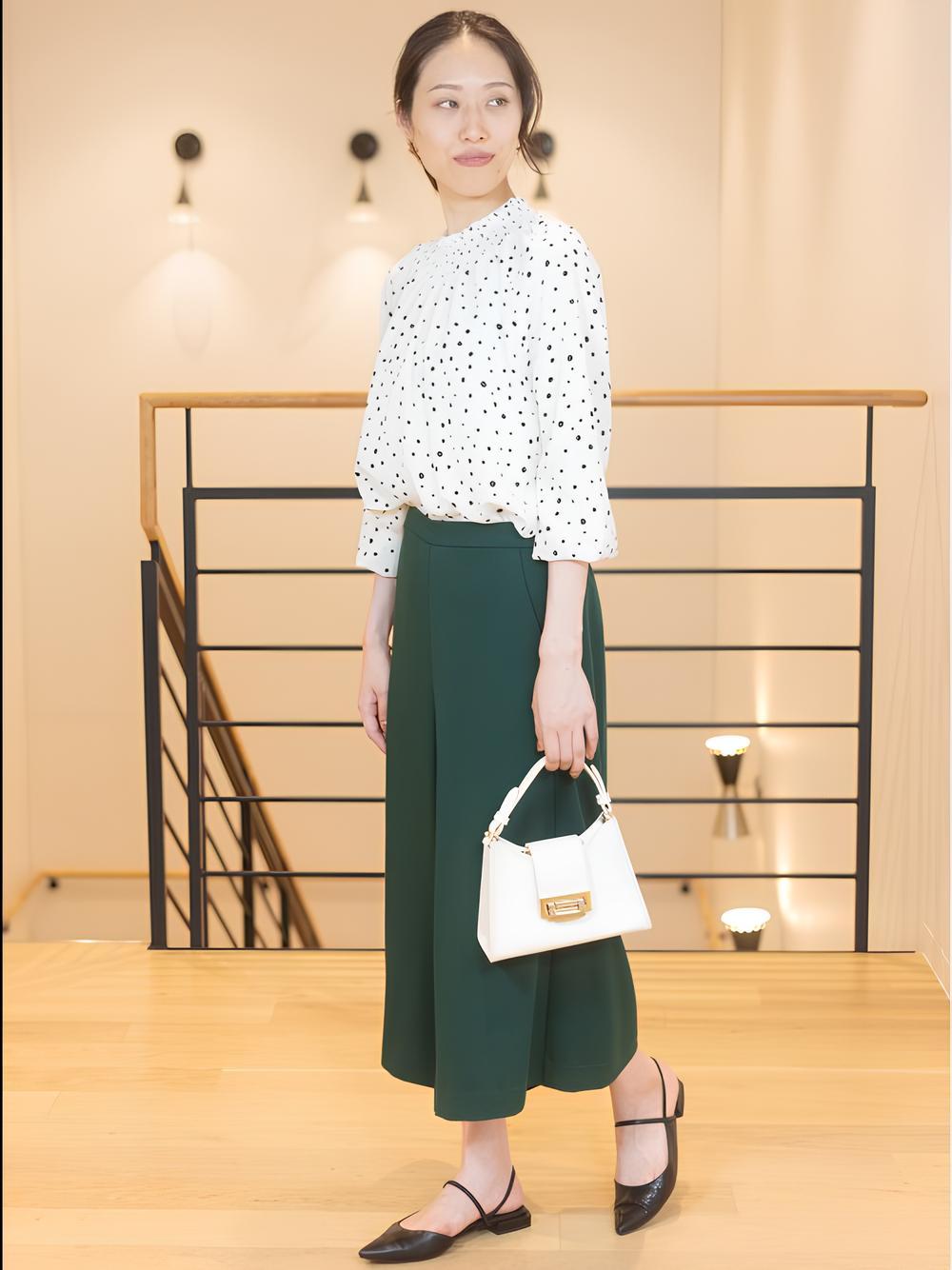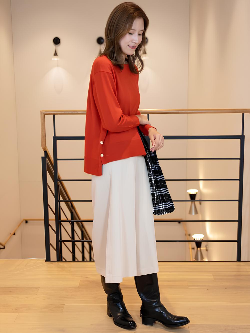 後ろウエストはゴムを入れ、左脇ファスナーあき仕様なので、楽な着心地ときれい見えを両立してくれます。