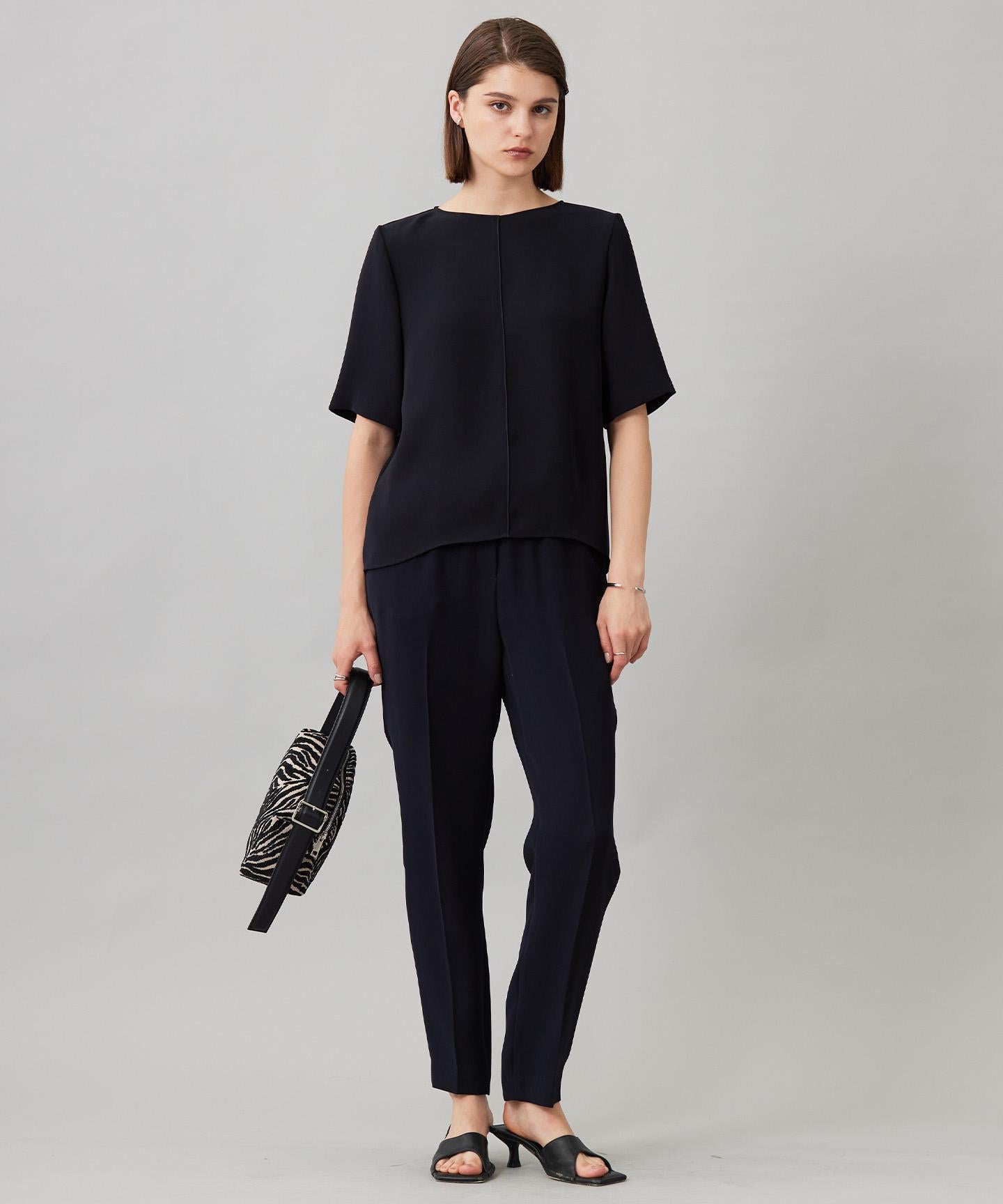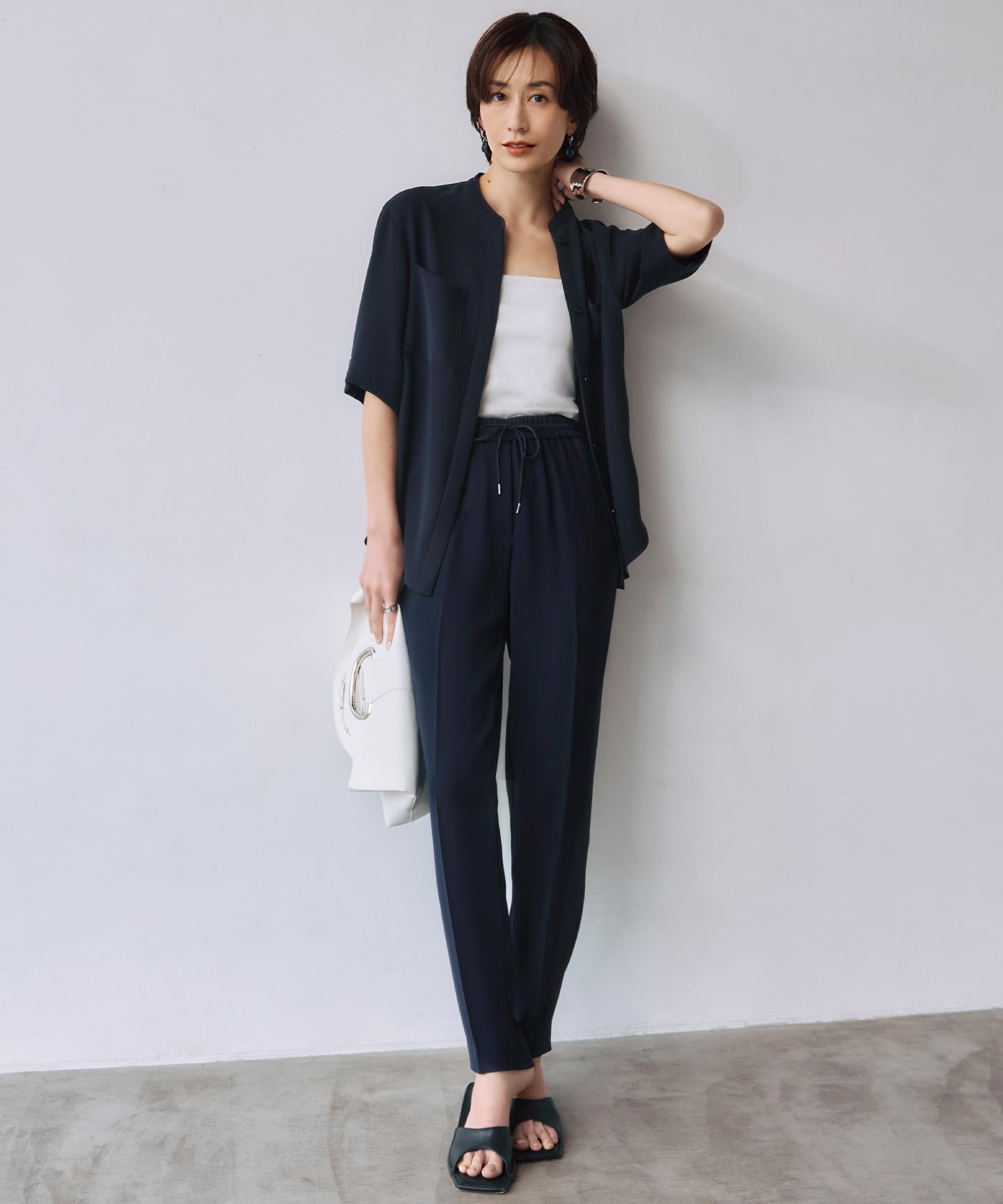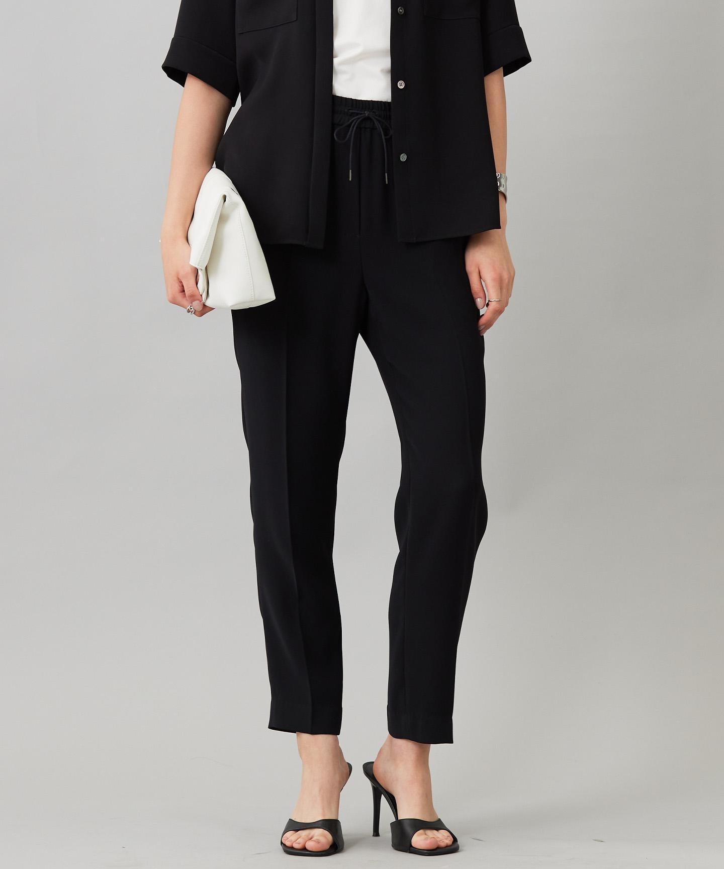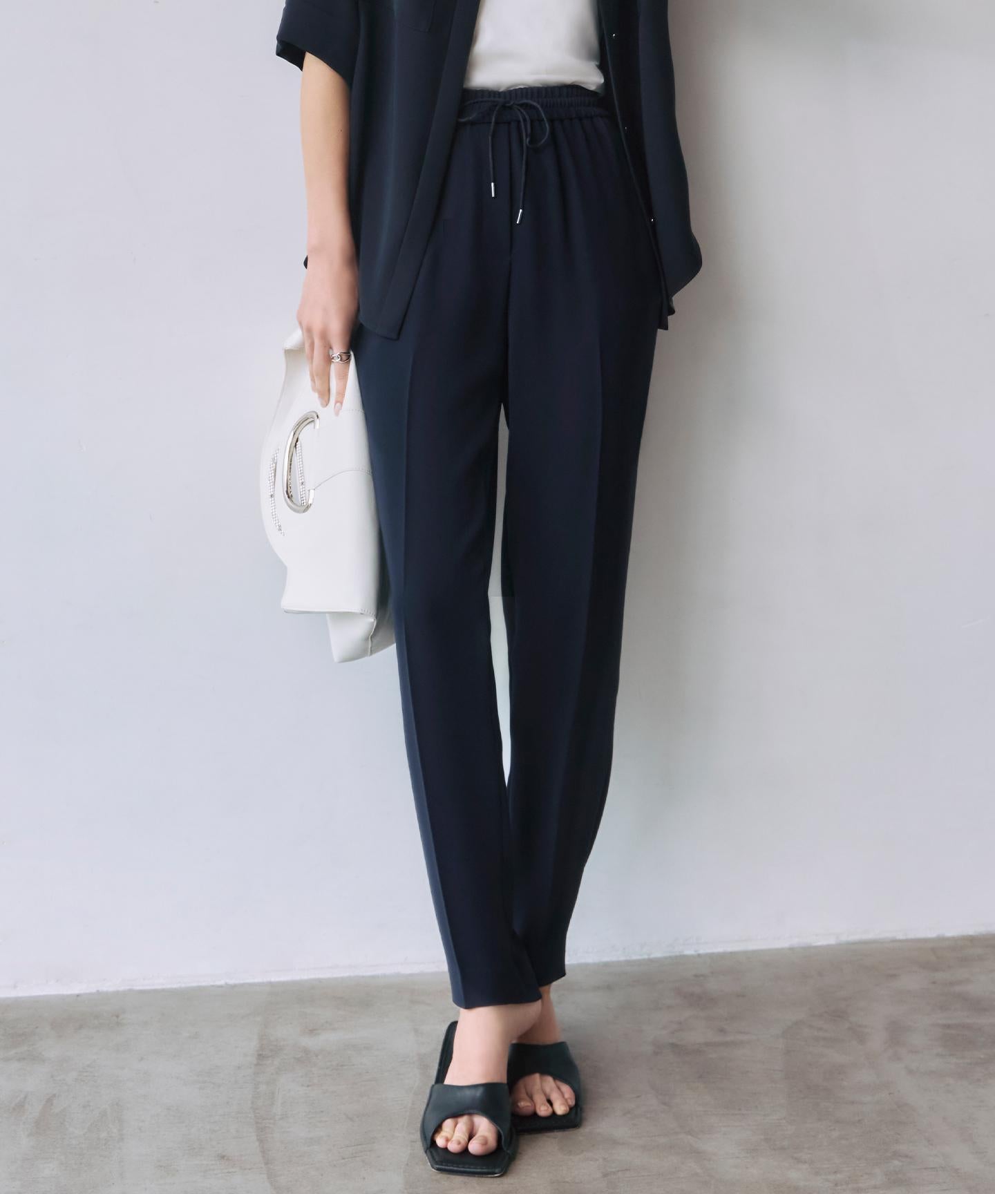 ■デザインウエストがドロスト仕様で、ストレスフリーな履き心地のスティックパンツです。合わせるトップスを選ばず、カジュアルからビジネス、セレモニーまで幅広いシーンで活躍します。単品でも同シリーズのブラウスとのセットアップでの着用もおすすめです。