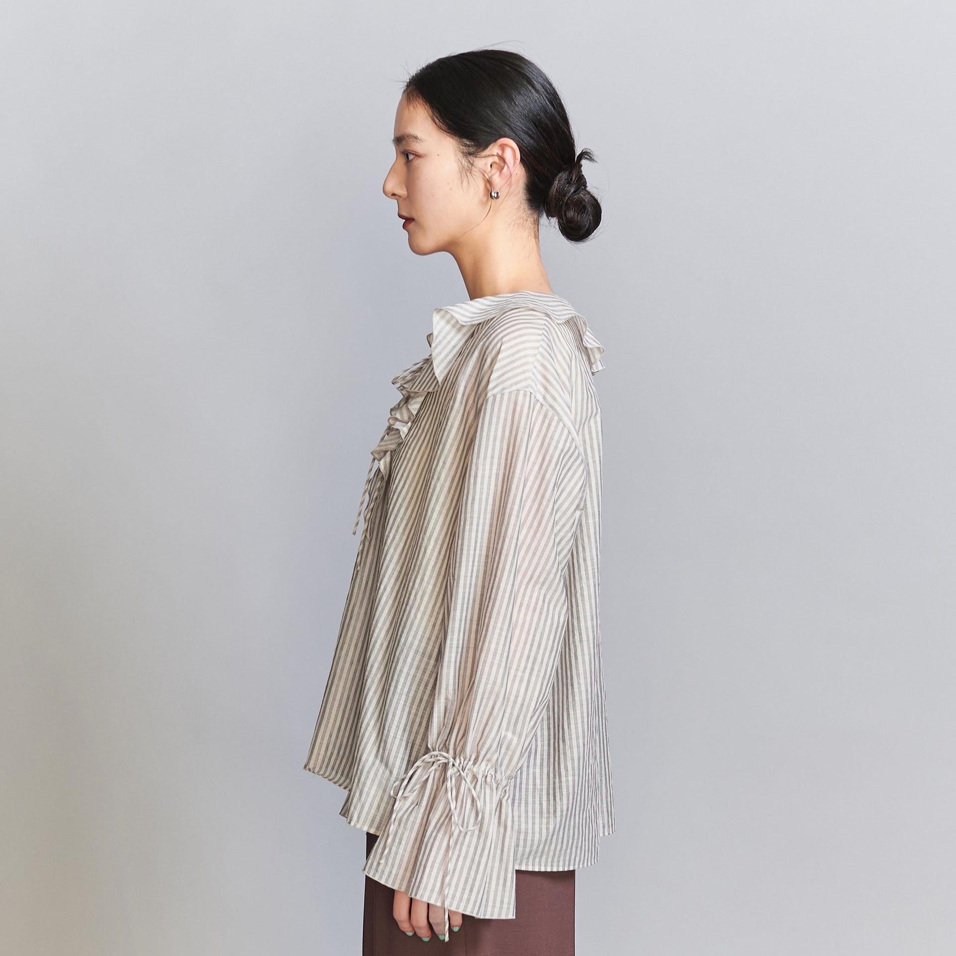ややハリ感とシャリ味のあるシアー素材で、軽い質感が美しいフリルシルエットを演出。