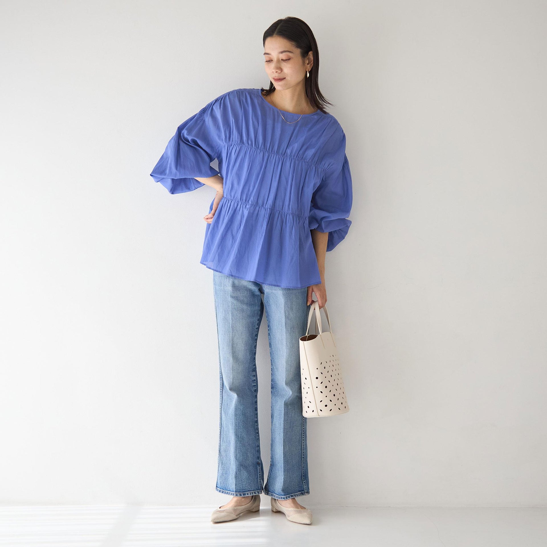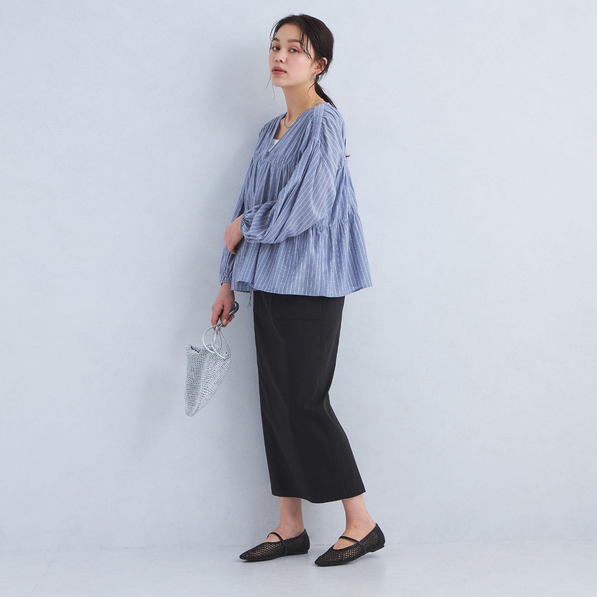 ふんわりとしたシルエットなので、タイトスカートや細身のボトムスと好相性。