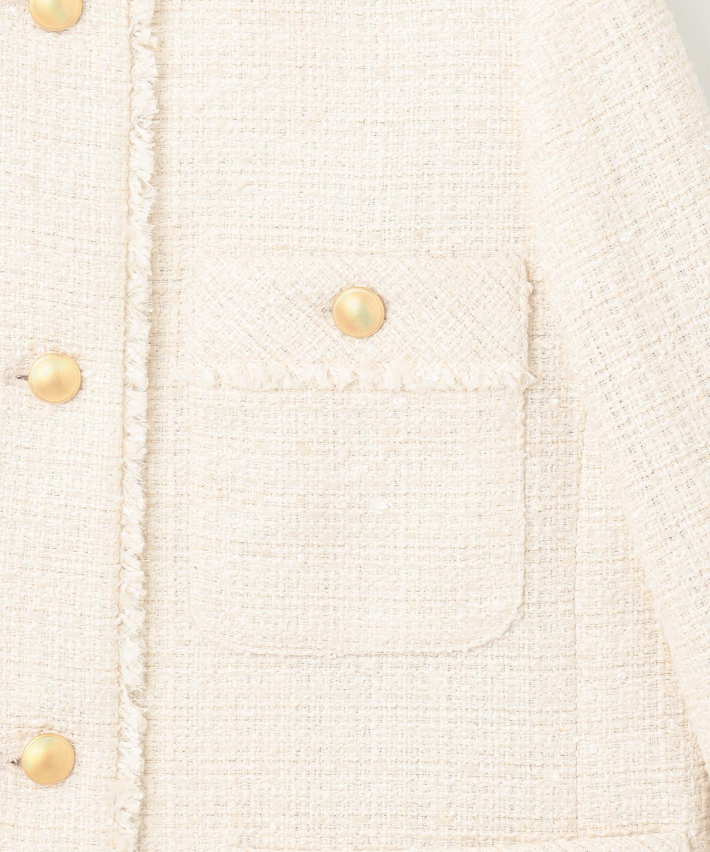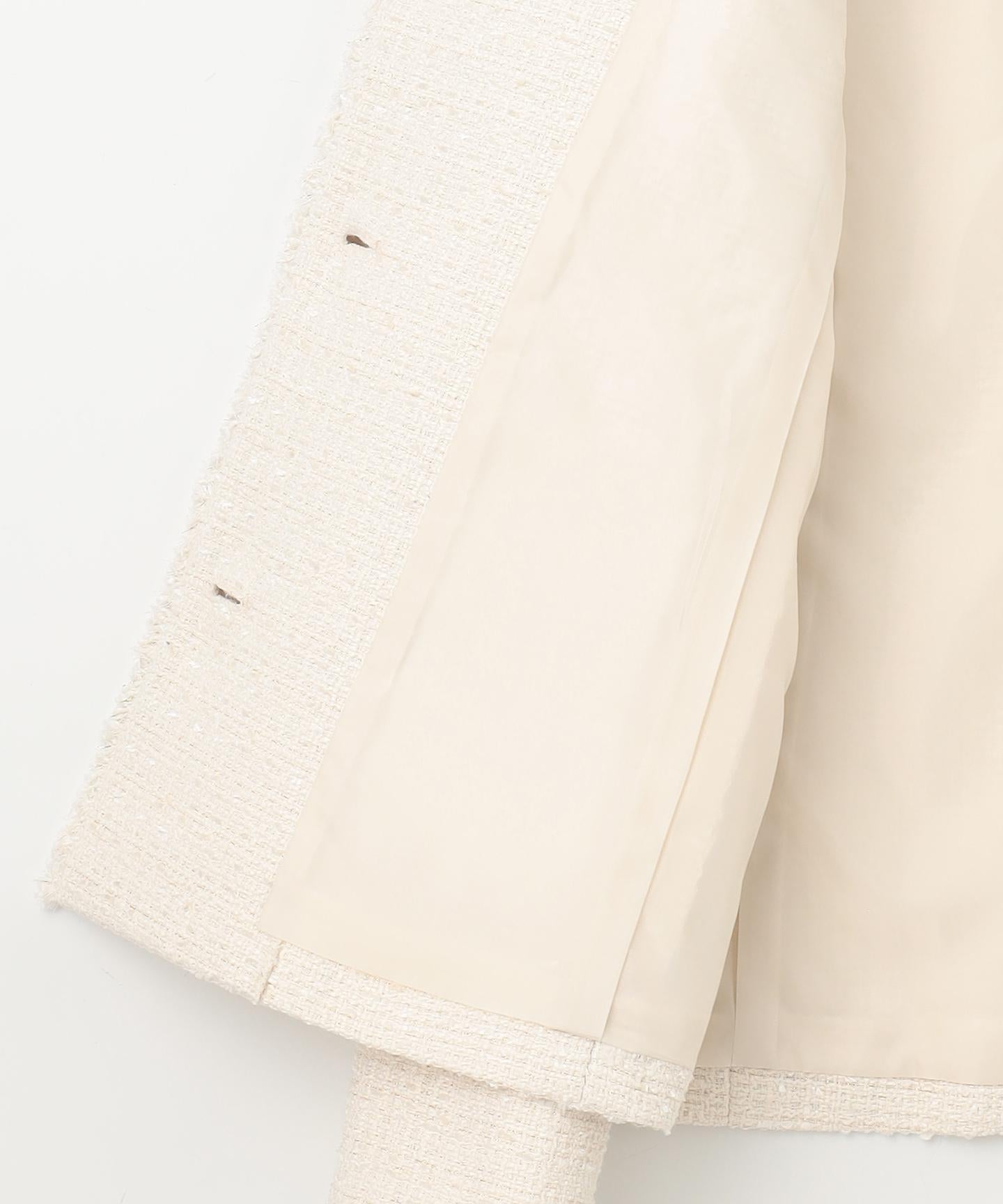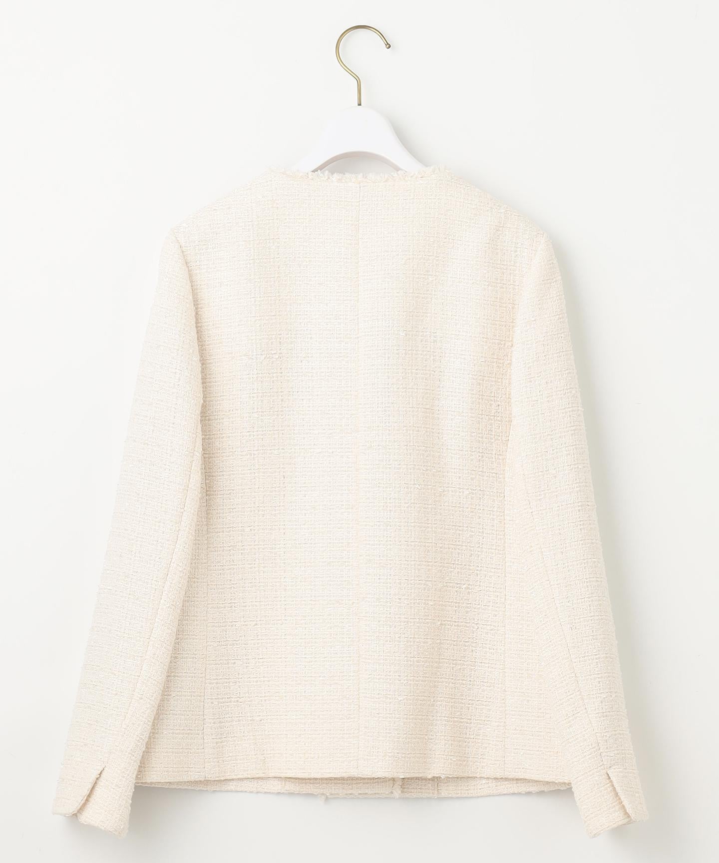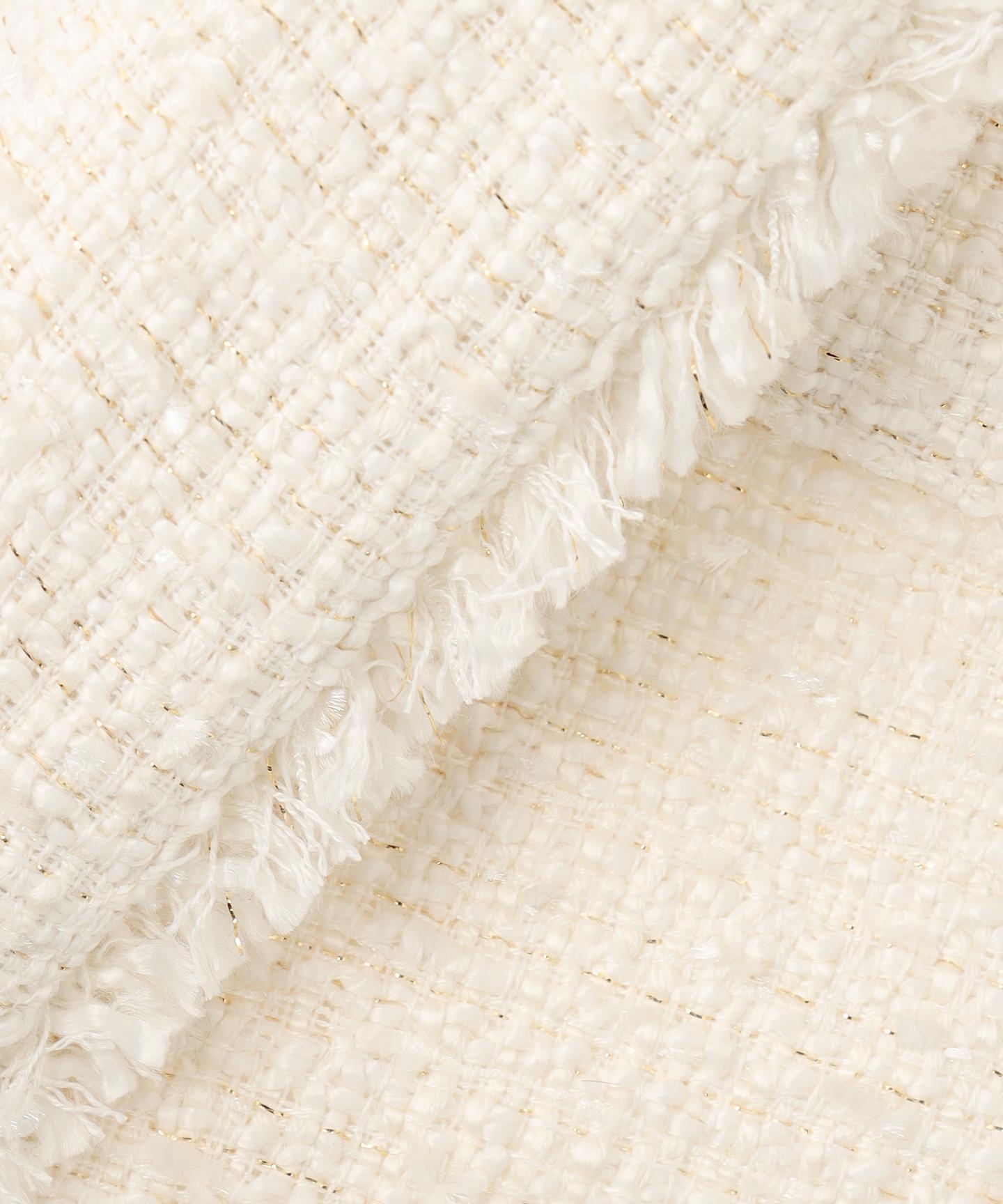 ざっくりとした織りが魅力の厚みのあるツイード素材を使用。ロングシーズン着られるスッキリとした手触りになっています。寒い時期には上からコートも羽織って、春先には華やかさを添える羽織りアウターとしておすすめです。繊細なラメ糸を生地に織り込んでいるので、落ち着いた華やかさのある素材感が特徴。
