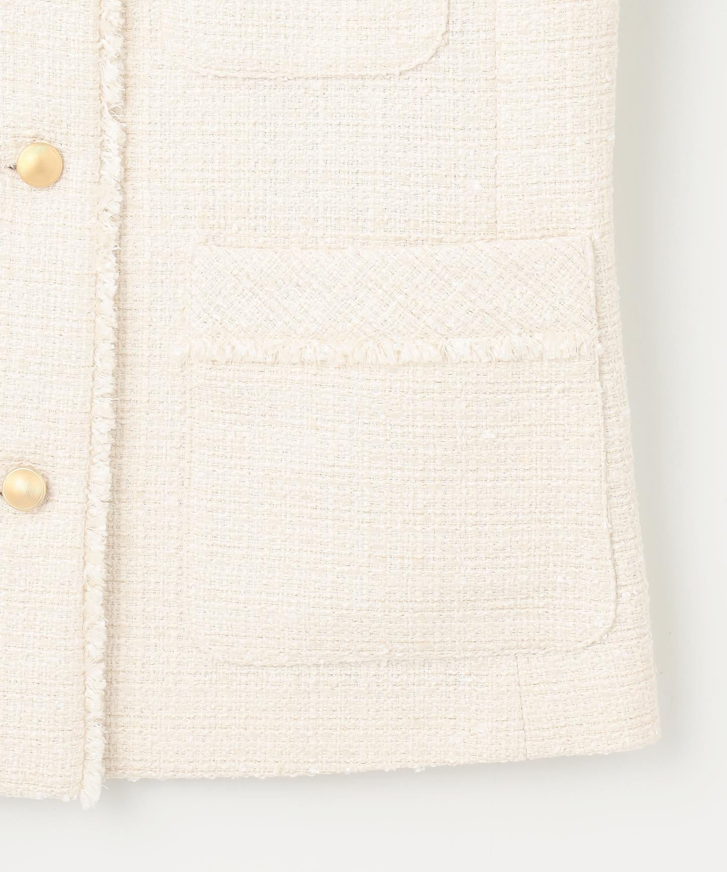フリンジ使いとゴールドボタン付きのポケットデザインが効いたノーカラーのツイードジャケット。ややボクシーなシルエットで、腕周りも程よくゆとりのある着心地になっています。ハレの日コーデにも、またデニムなどと合わせた綺麗めカジュアルなスタイリングにも使いまわせる洒落感ジャケットとして活躍。華やかさが際立つアイボリーと、シックな印象のネイビーの2色展開です。