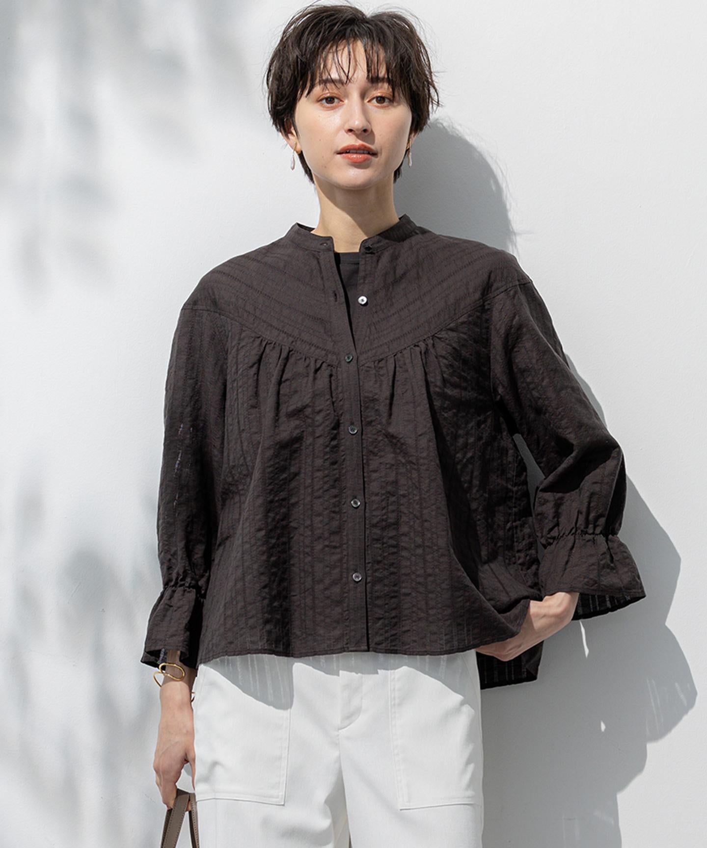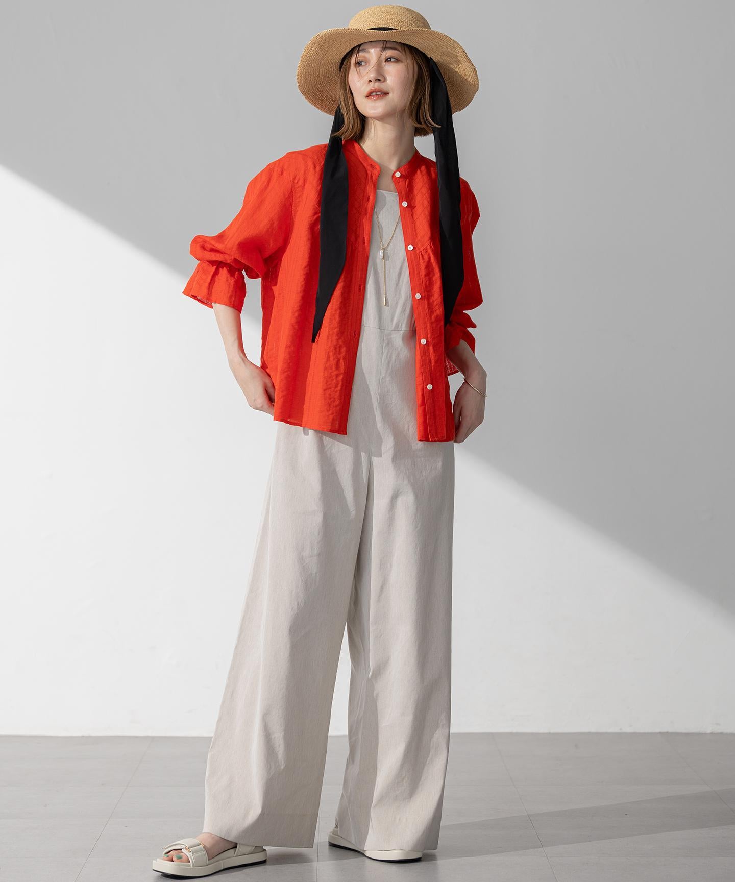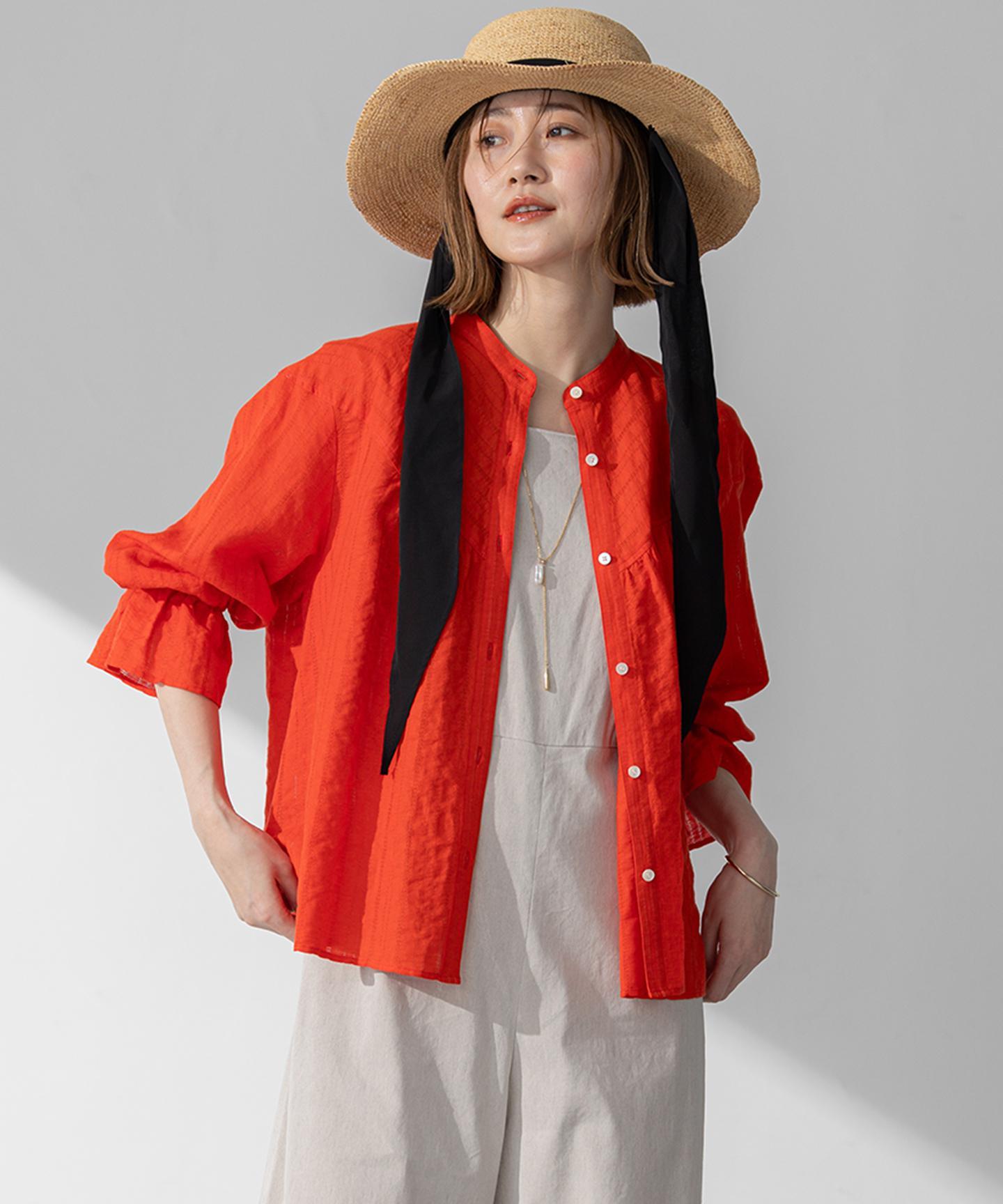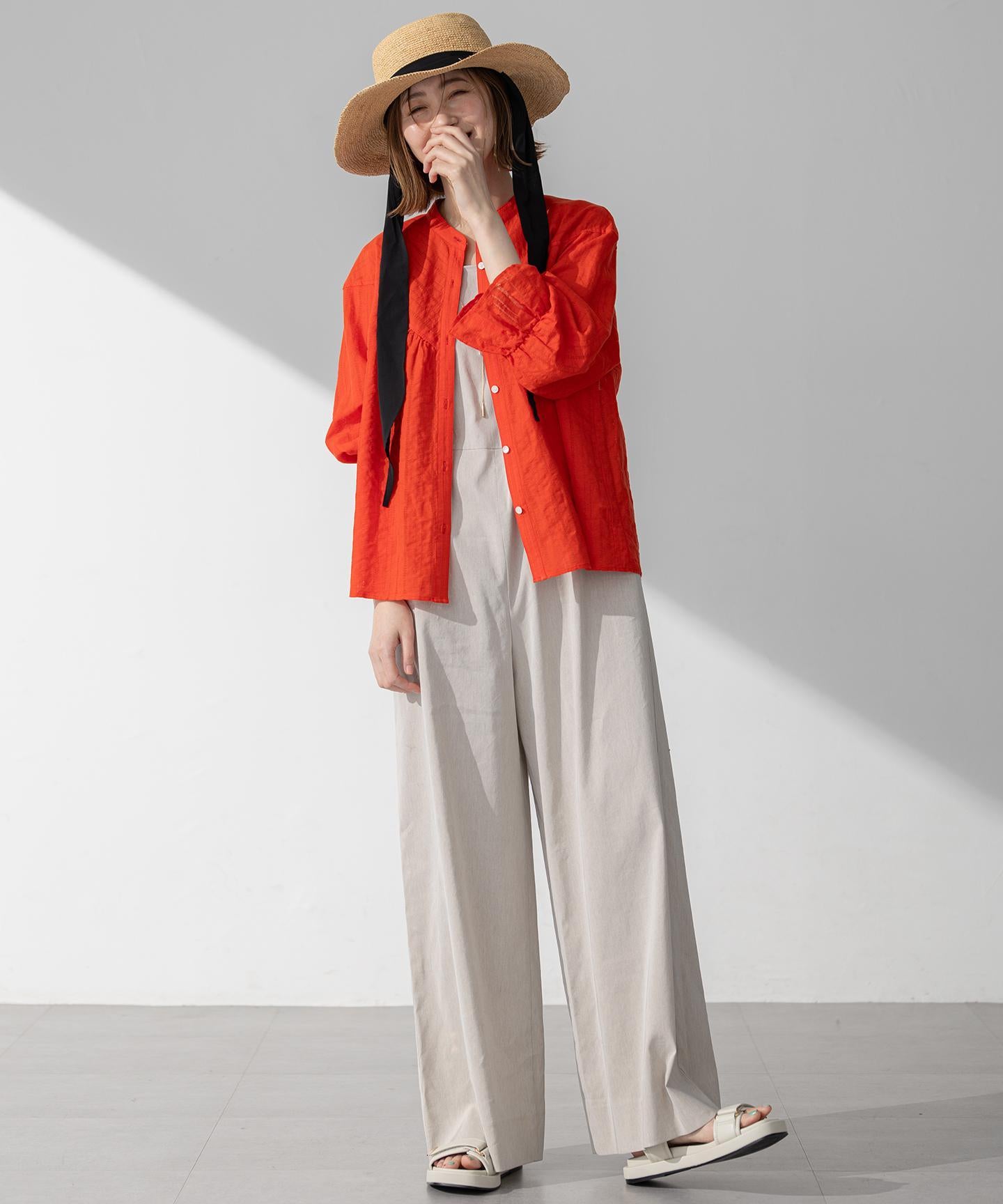 肩まわりはすっきりとコンパクトな作りで、胸元の切り替え下からはギャザーを入れているので、身体のラインを拾わず、切り替え下からはギャザーフレアになっているので張り付かず、涼しげな印象でご着用いただけます。前の釦を閉じていても開けてもサマになる1枚です。カジュアルにもきれいめにも着回せるので、さまざまなシーンで活躍してくれます。カラーはシックなブラック(#005)、爽やかで清涼感のあるホワイト(#001)、目を惹くオレンジ(#020)の3色展開です。