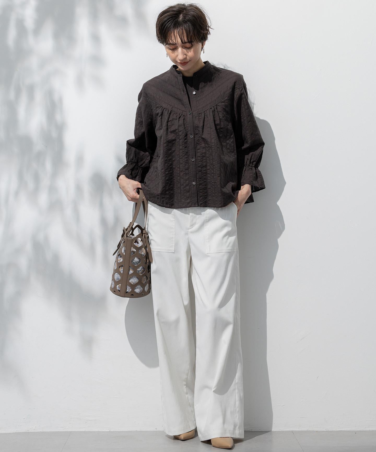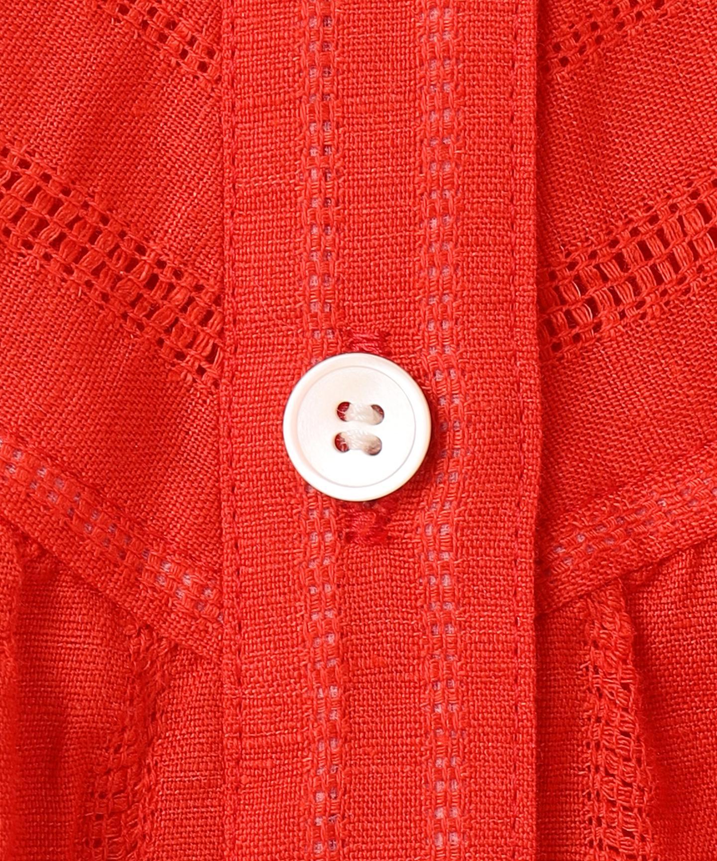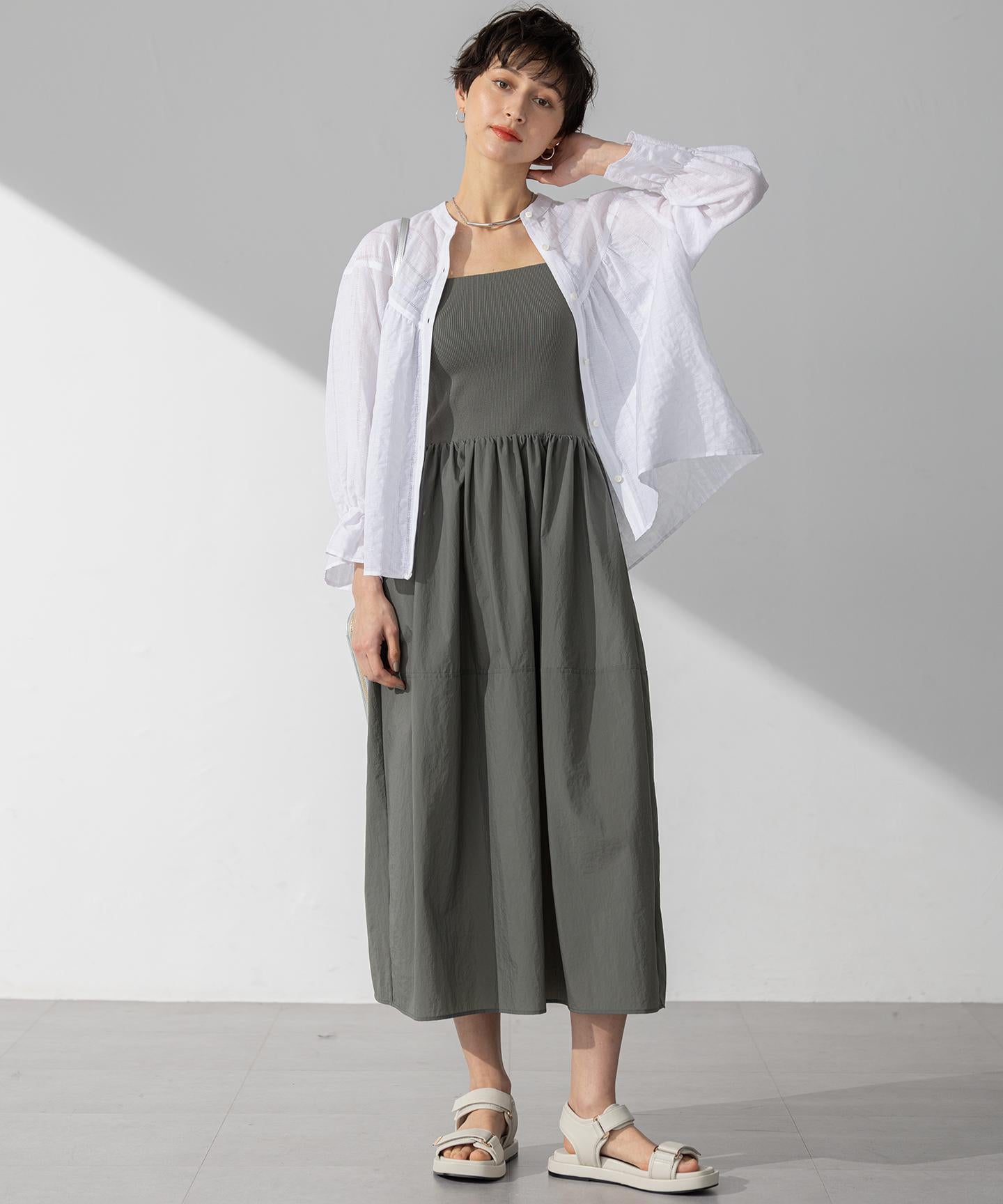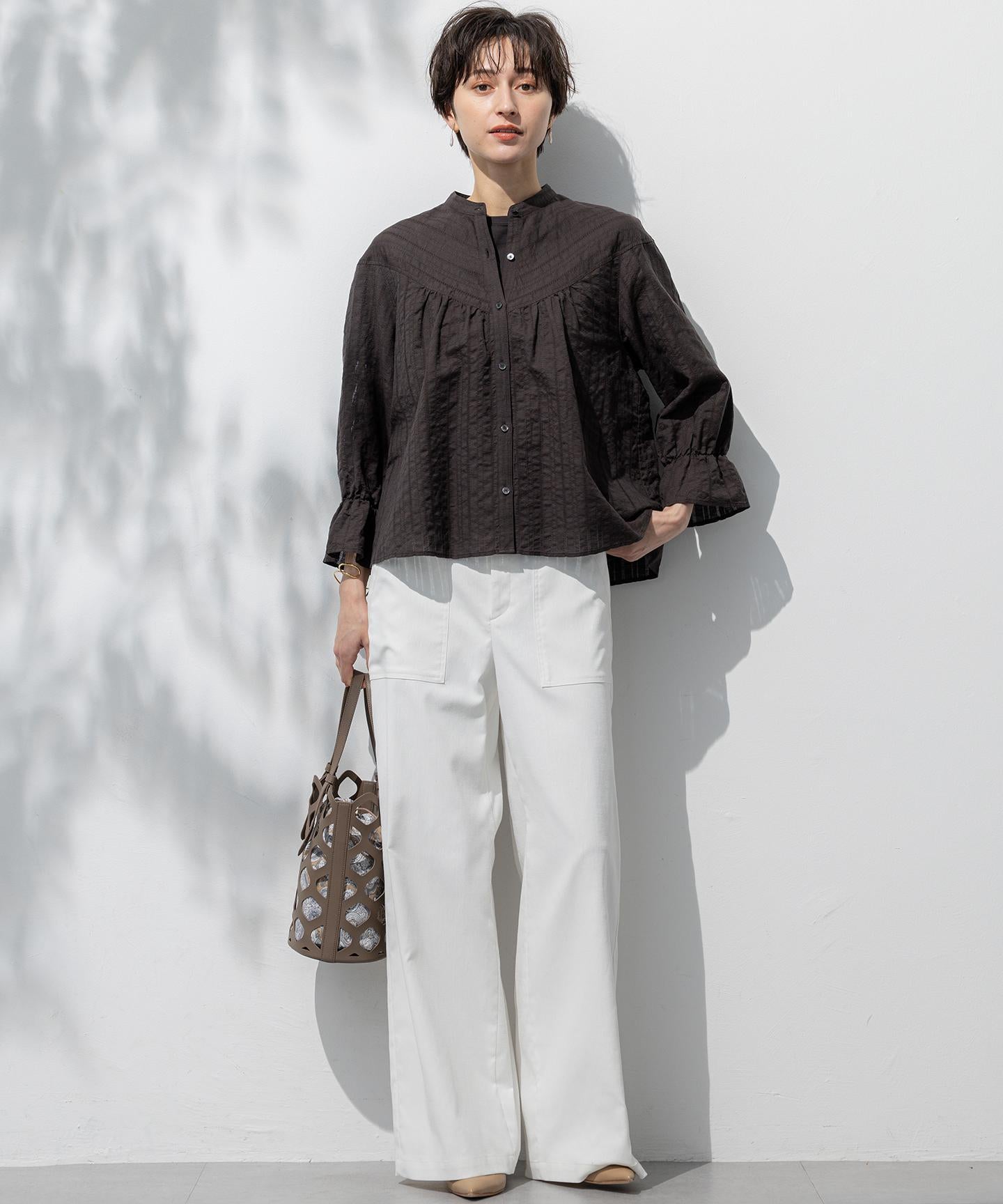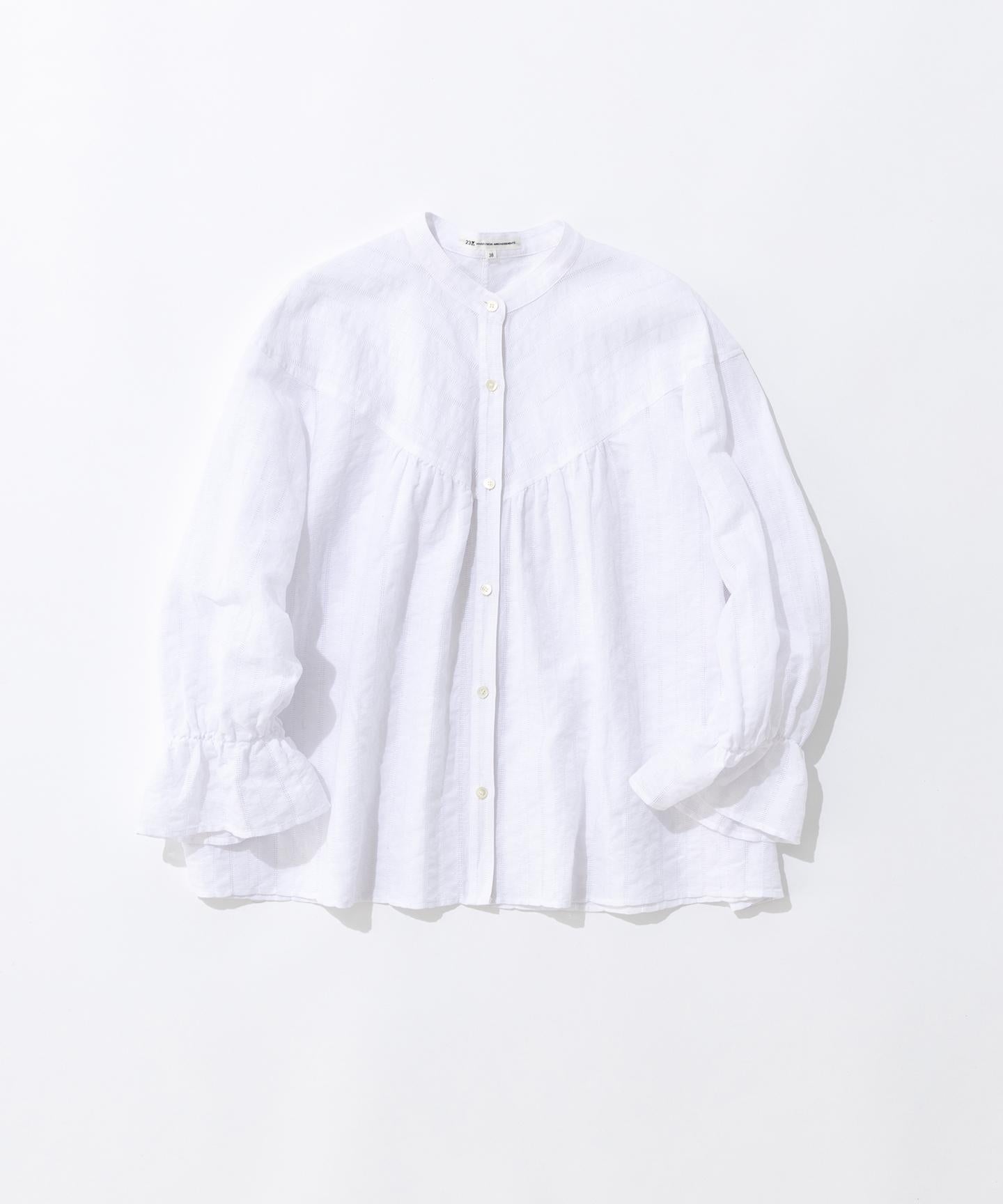 肩まわりはすっきりとコンパクトな作りで、胸元の切り替え下からはギャザーを入れているので、身体のラインを拾わず、切り替え下からはギャザーフレアになっているので張り付かず、涼しげな印象でご着用いただけます。前の釦を閉じていても開けてもサマになる1枚です。カジュアルにもきれいめにも着回せるので、さまざまなシーンで活躍してくれます。カラーはシックなブラック(#005)、爽やかで清涼感のあるホワイト(#001)、目を惹くオレンジ(#020)の3色展開です。