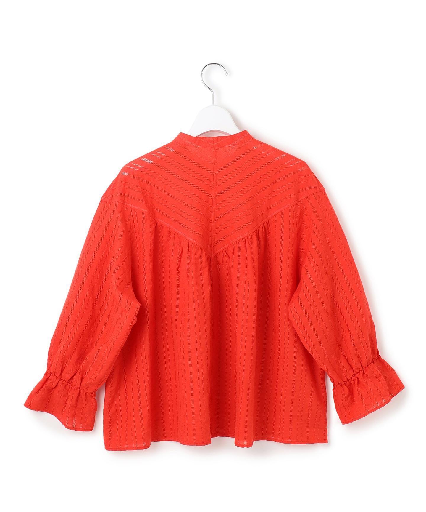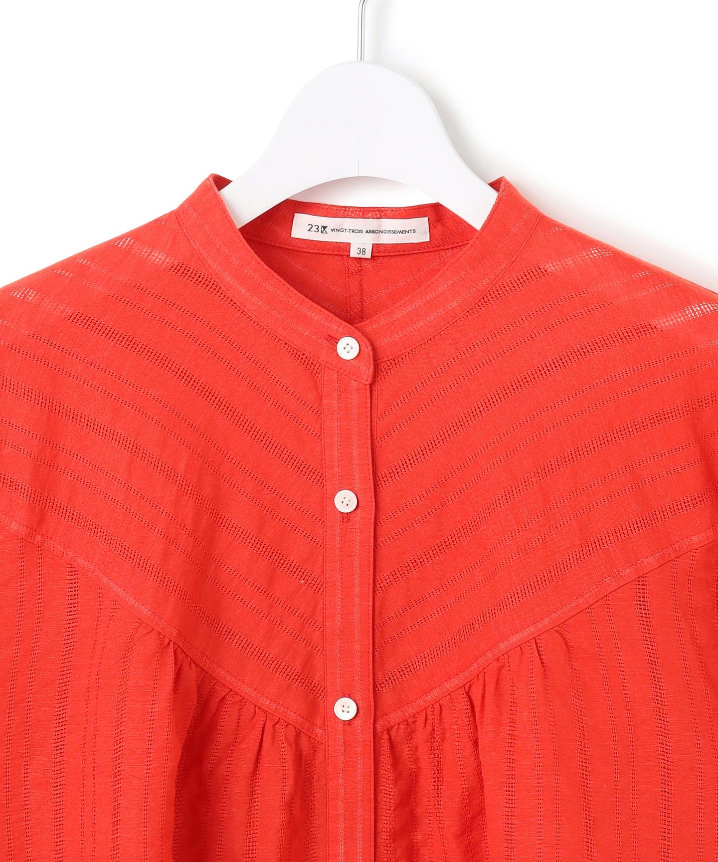 カラミのストライプ柄を活かした切り替えのシャツブラウス