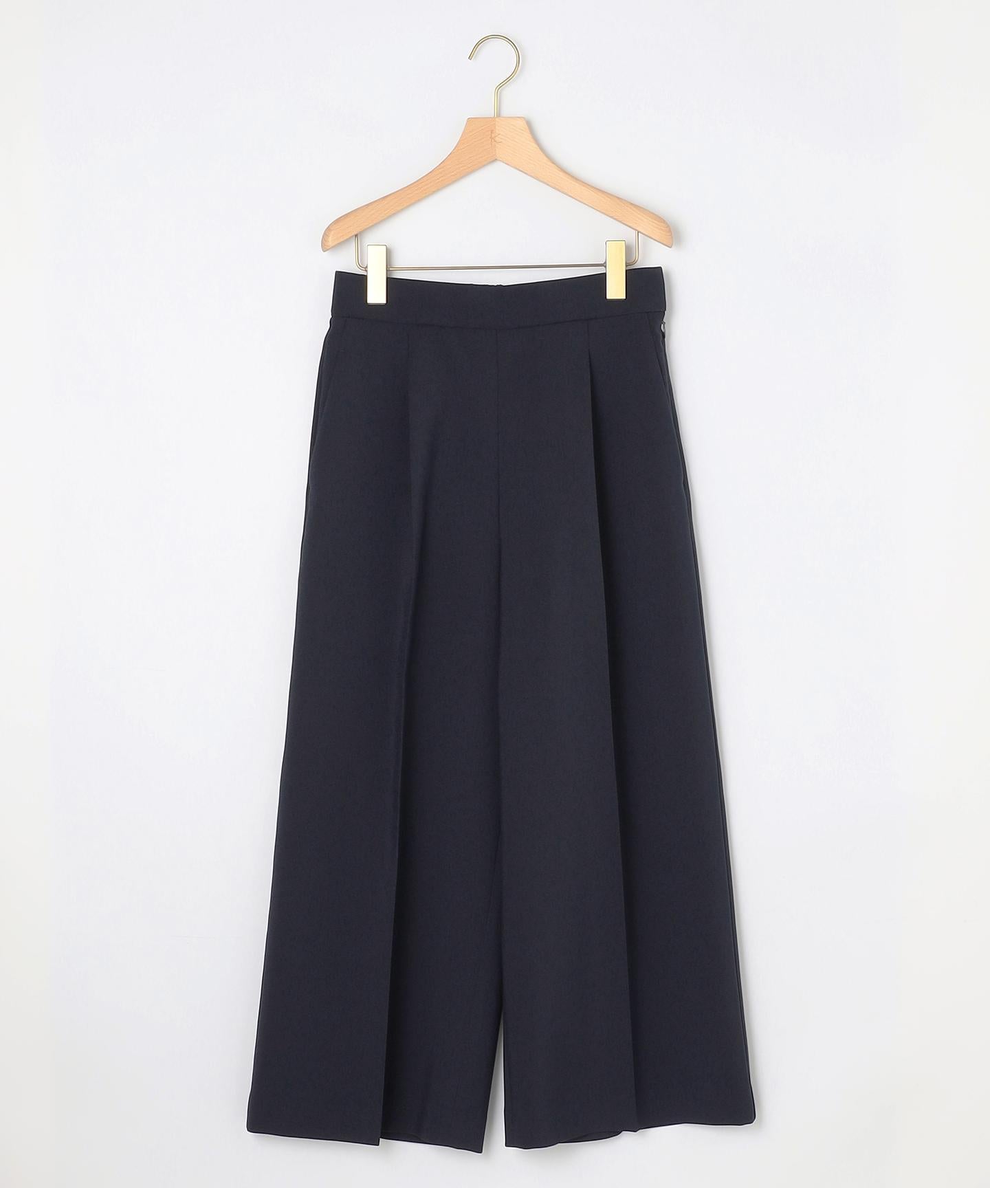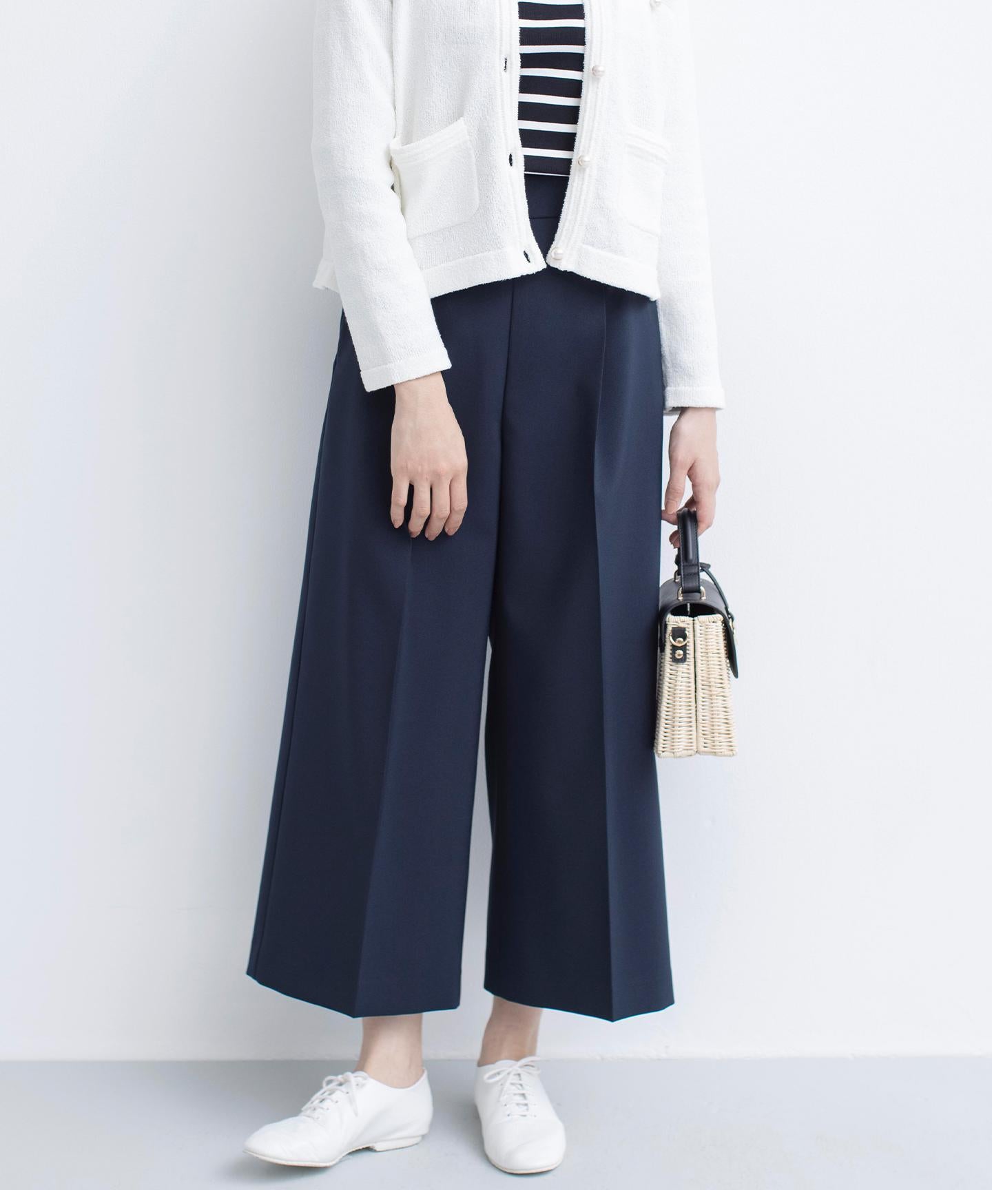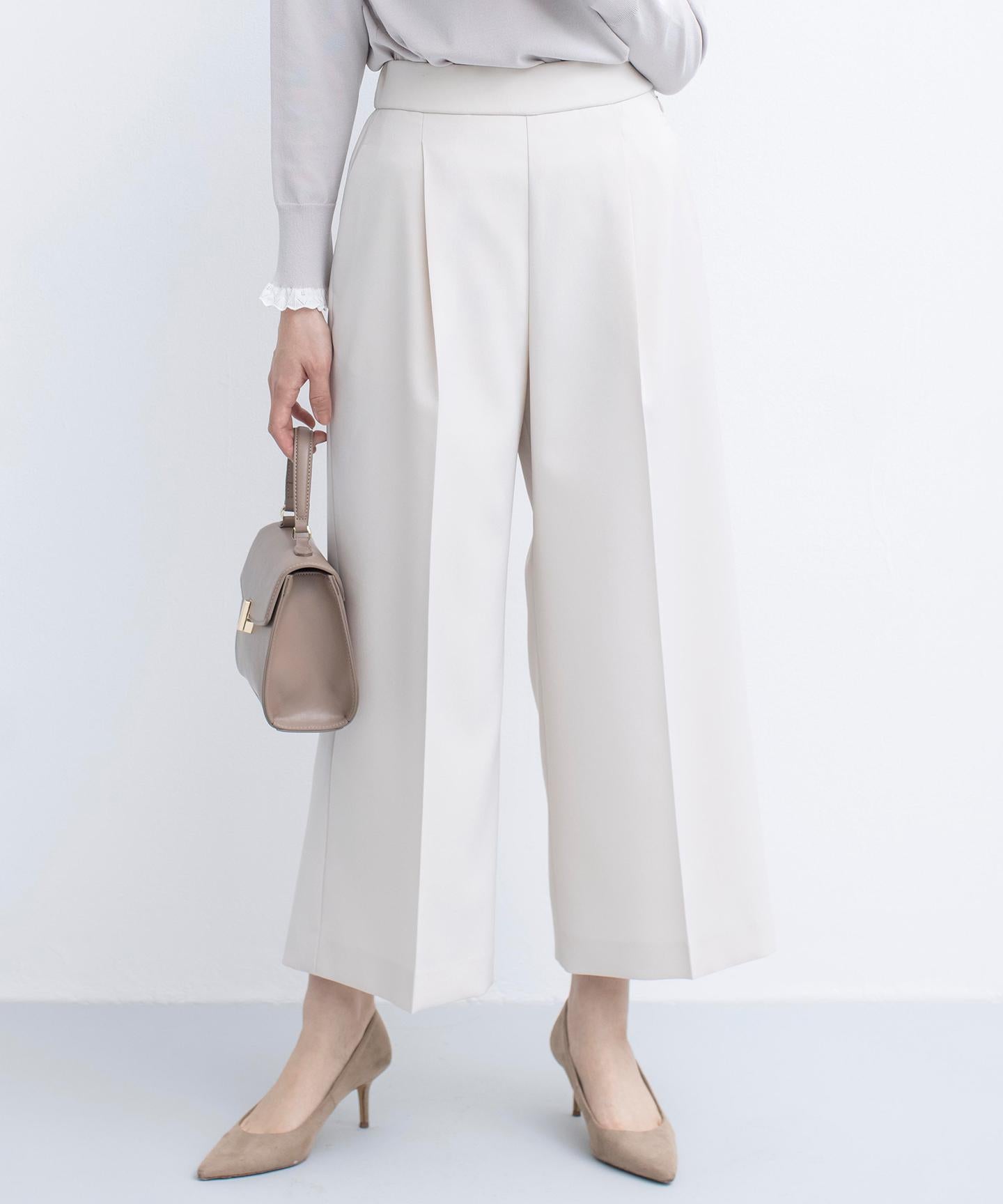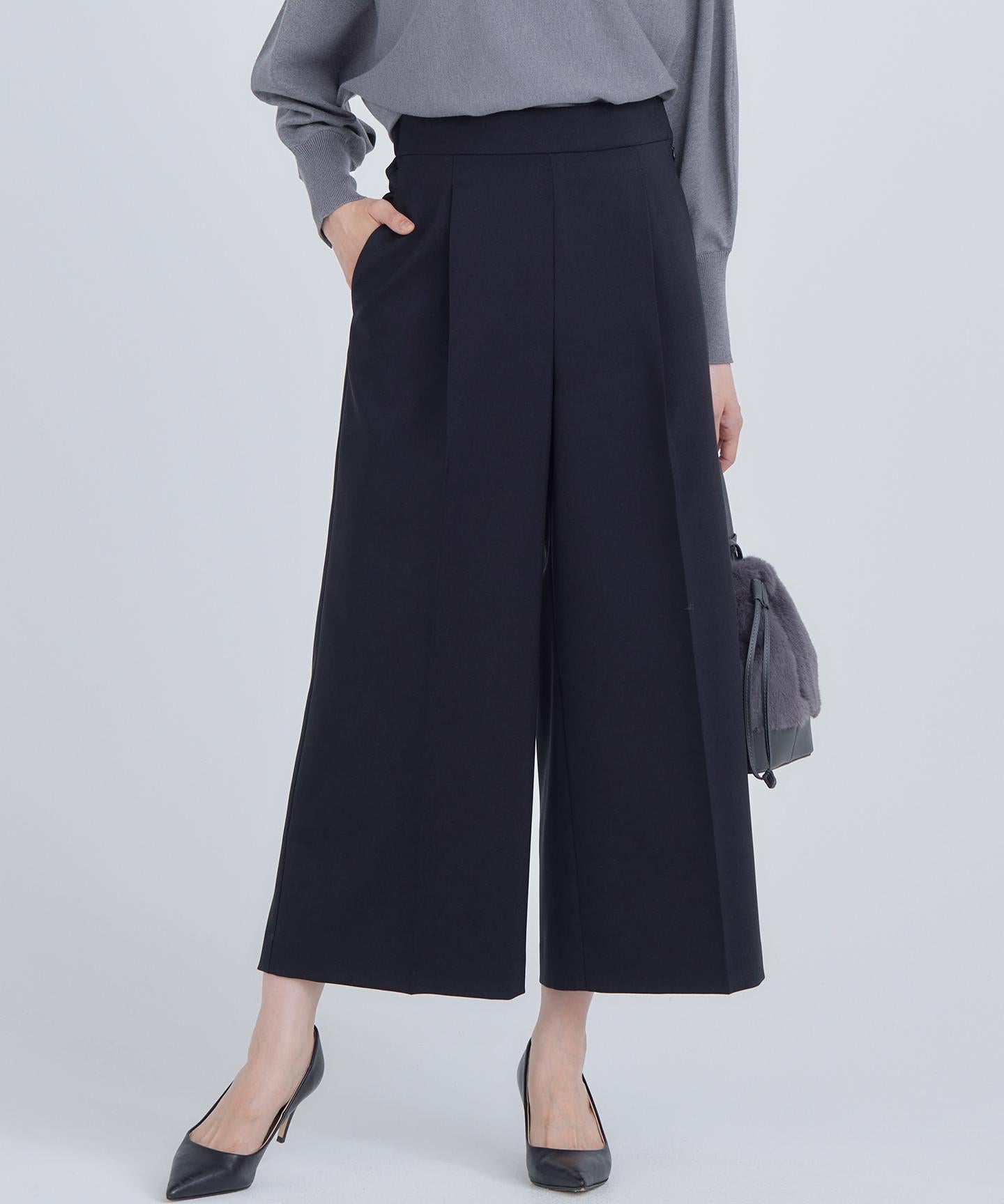 ■デザイン裾にかけて美しく広がるクロプト丈のガウチョパンツ。綺麗に落ちたシルエットと歩くたびに美しくなびく裾が魅力的です。ややハイウエストになっており、腰まわりはすっきりとしたシルエットでスタイルアップを叶えてくれます。ウエストベルトの後ろはゴム仕様でイージーなはき心地も。長時間の着用もラクチンながらもきれいめに見えるデザインがポイントです。