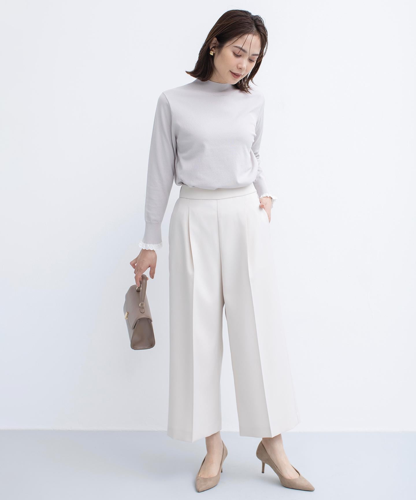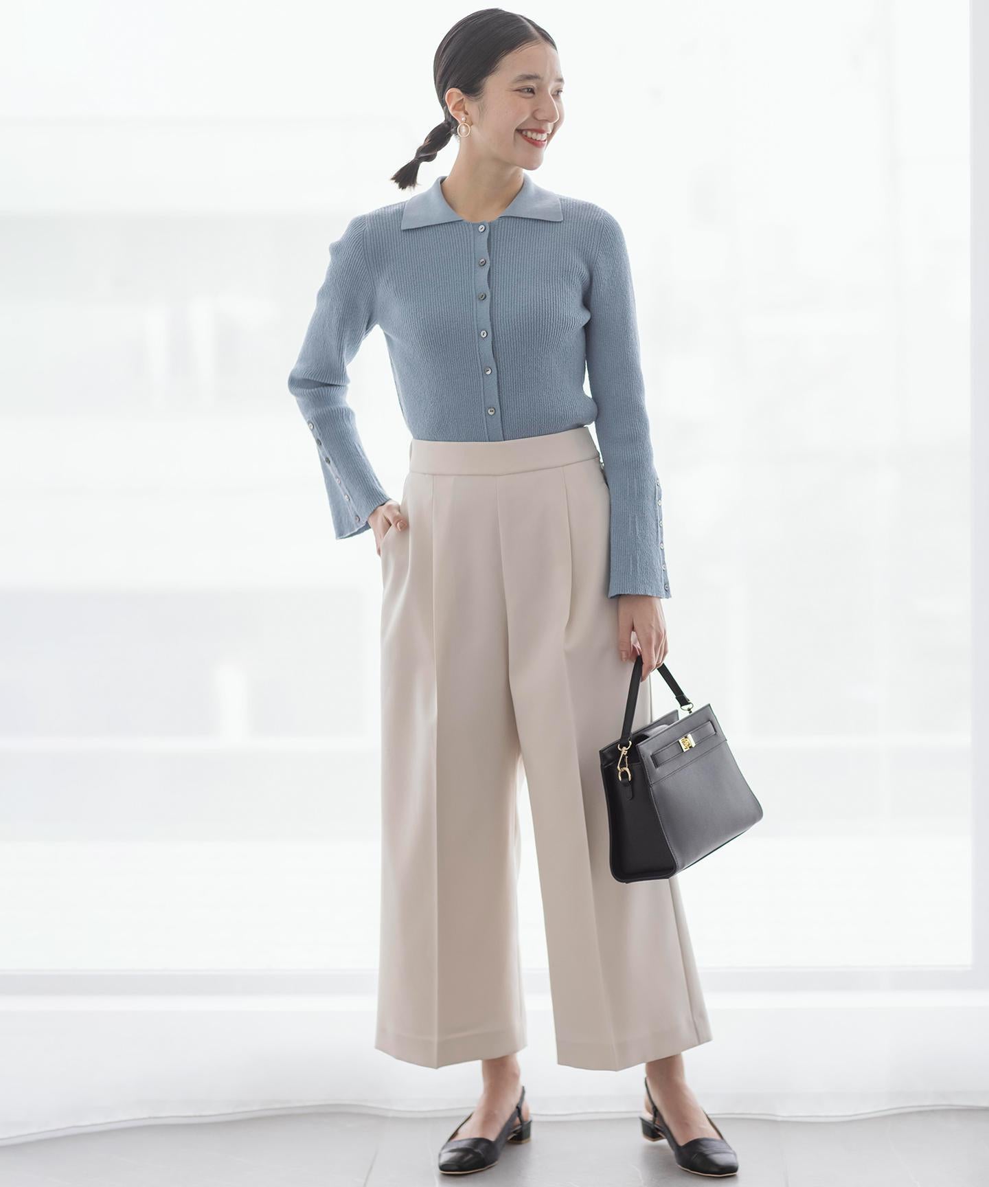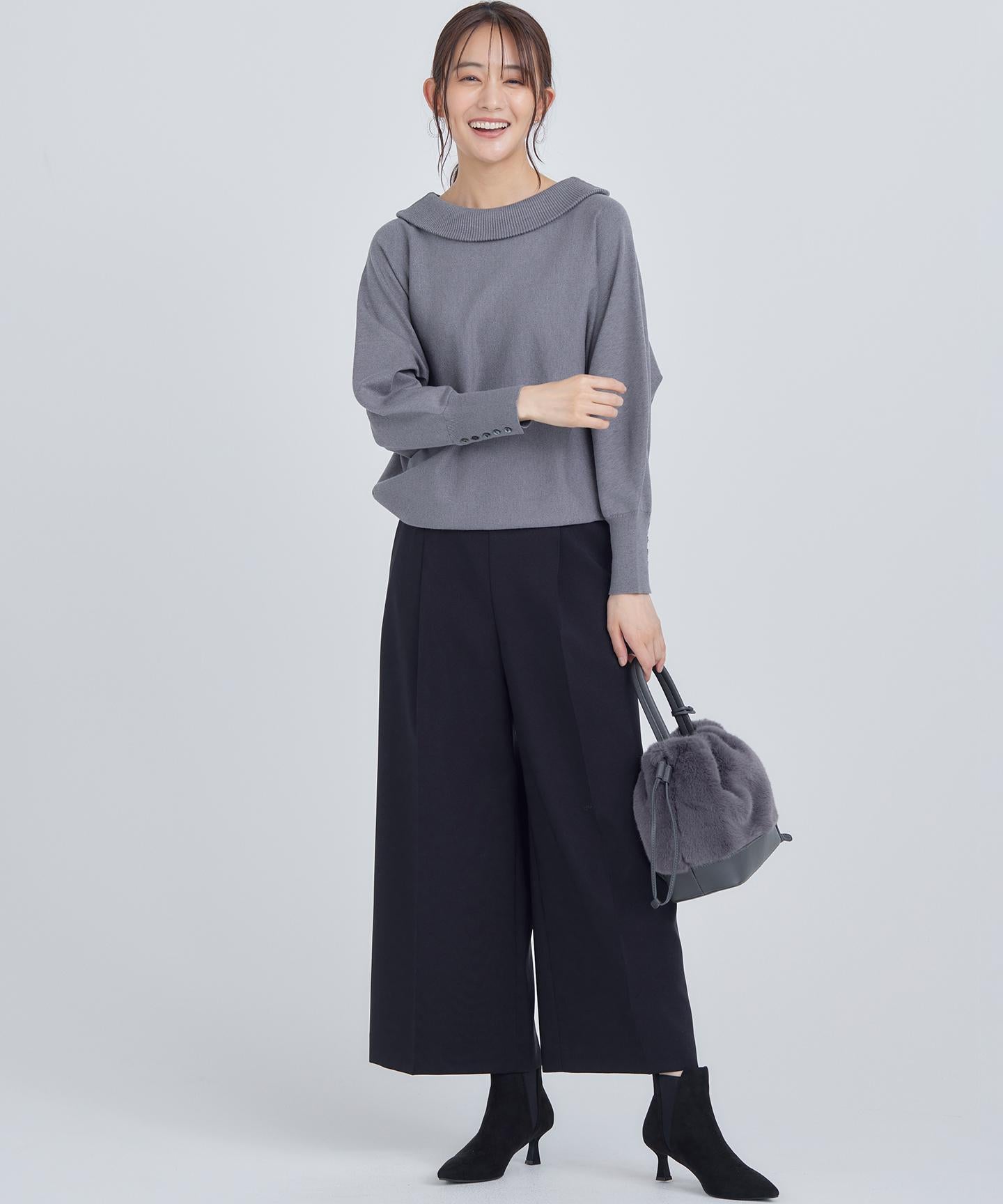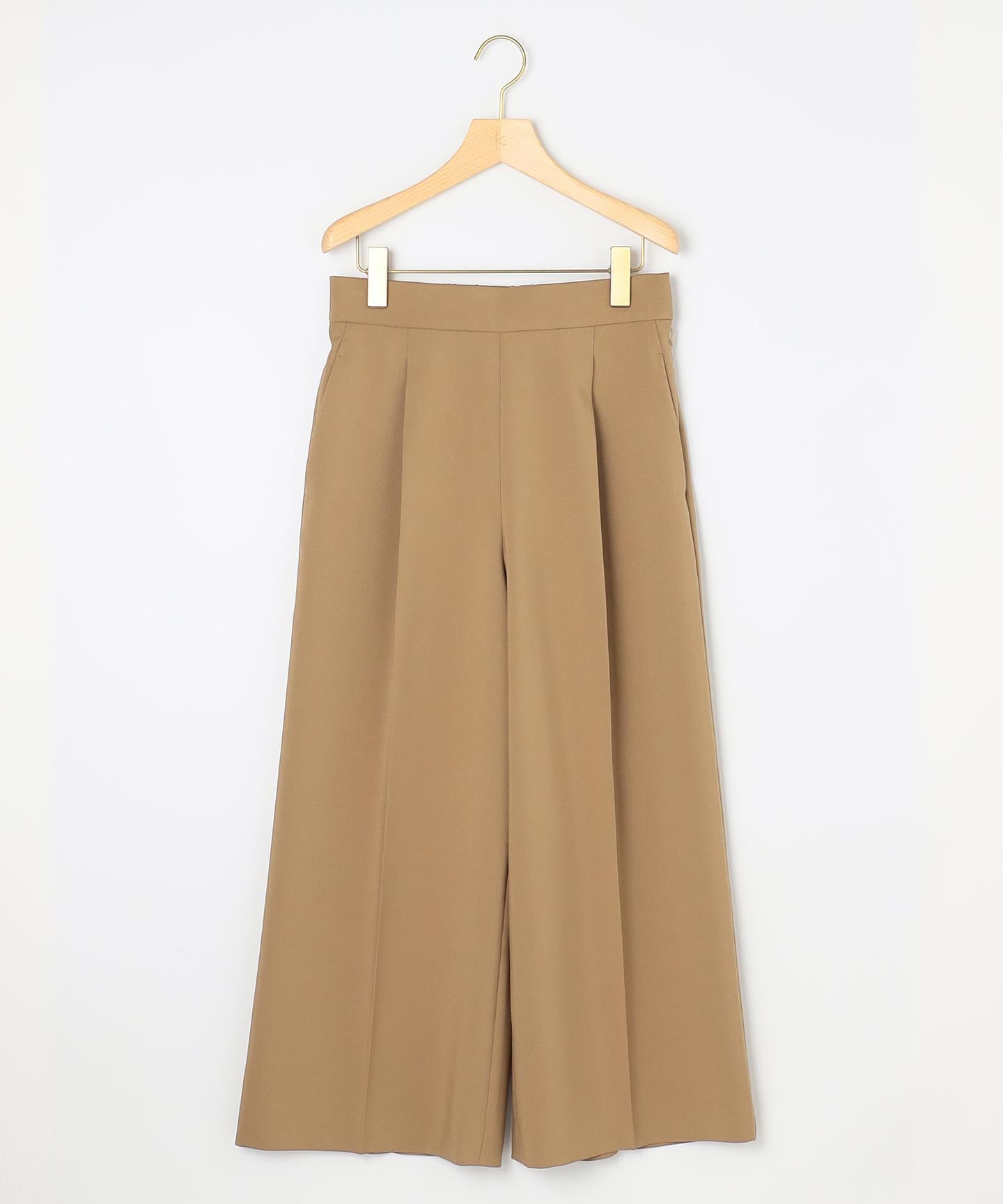 ■デザイン裾にかけて美しく広がるクロプト丈のガウチョパンツ。綺麗に落ちたシルエットと歩くたびに美しくなびく裾が魅力的です。ややハイウエストになっており、腰まわりはすっきりとしたシルエットでスタイルアップを叶えてくれます。ウエストベルトの後ろはゴム仕様でイージーなはき心地も。長時間の着用もラクチンながらもきれいめに見えるデザインがポイントです。