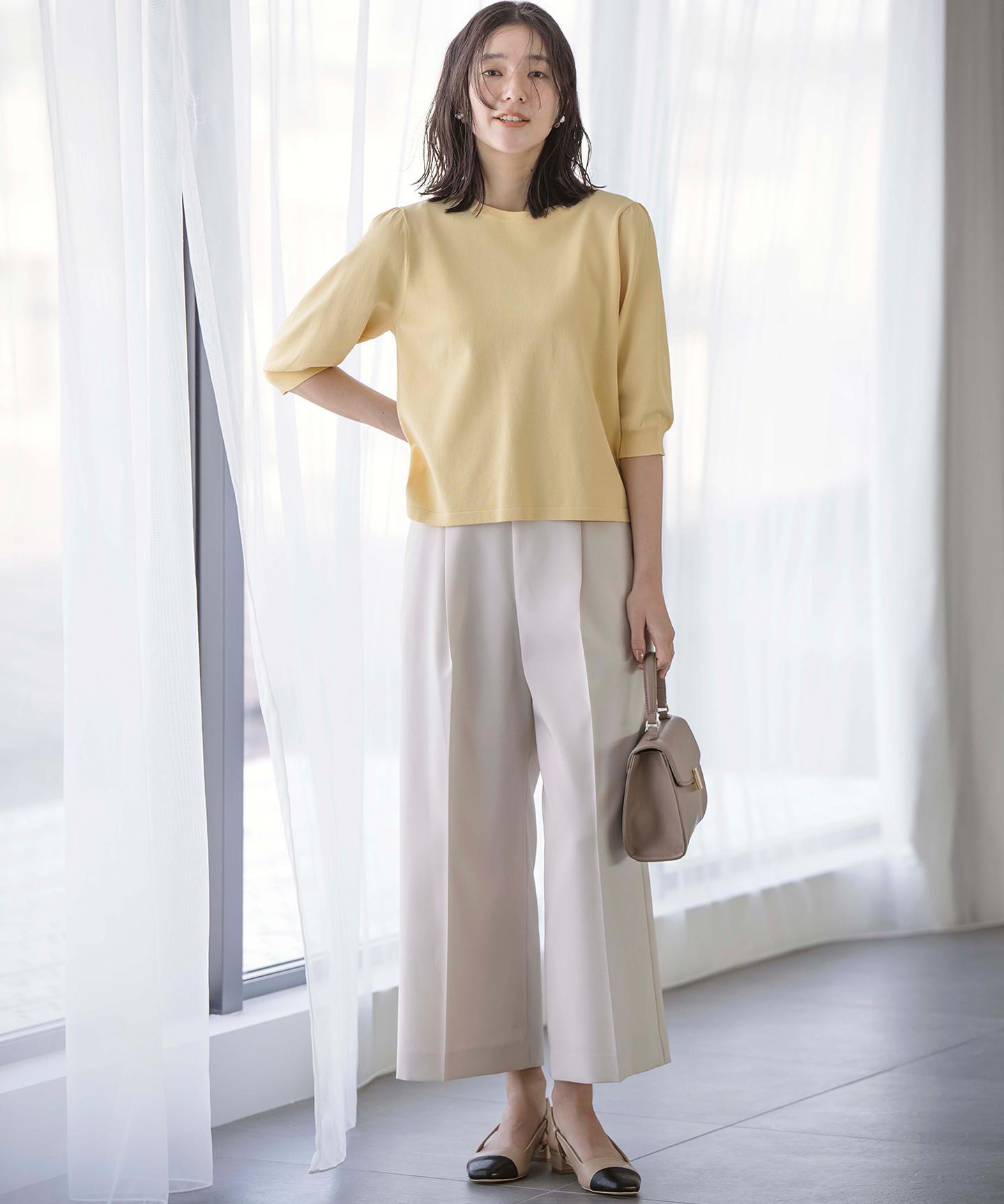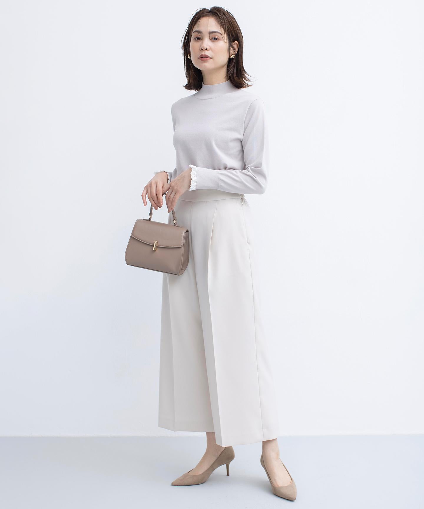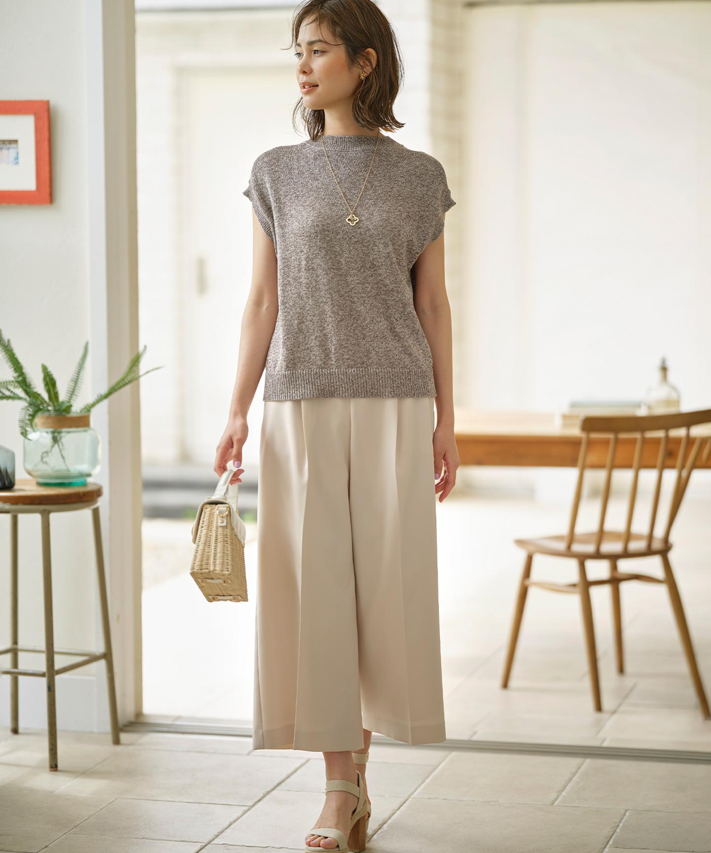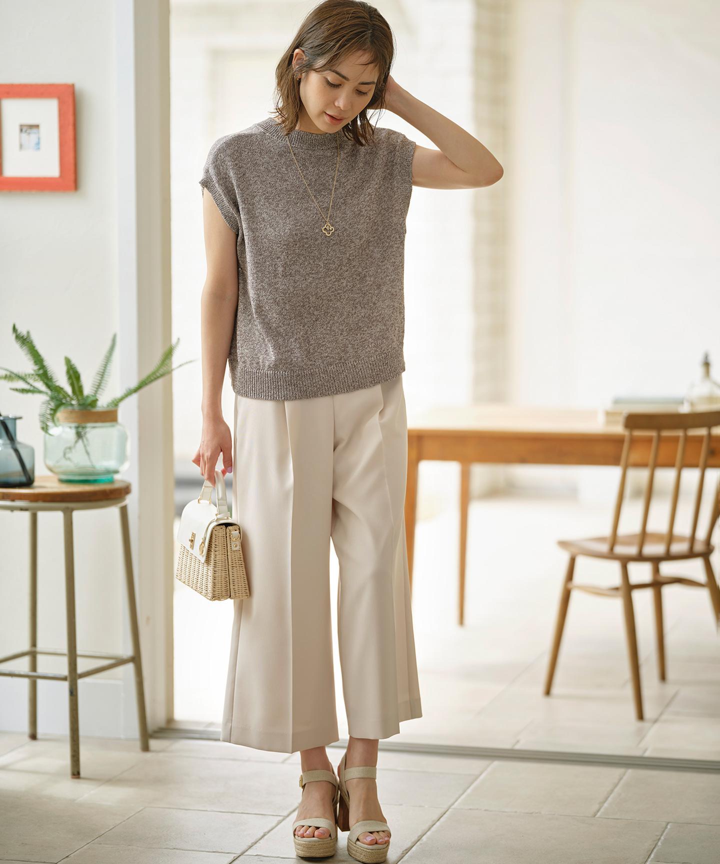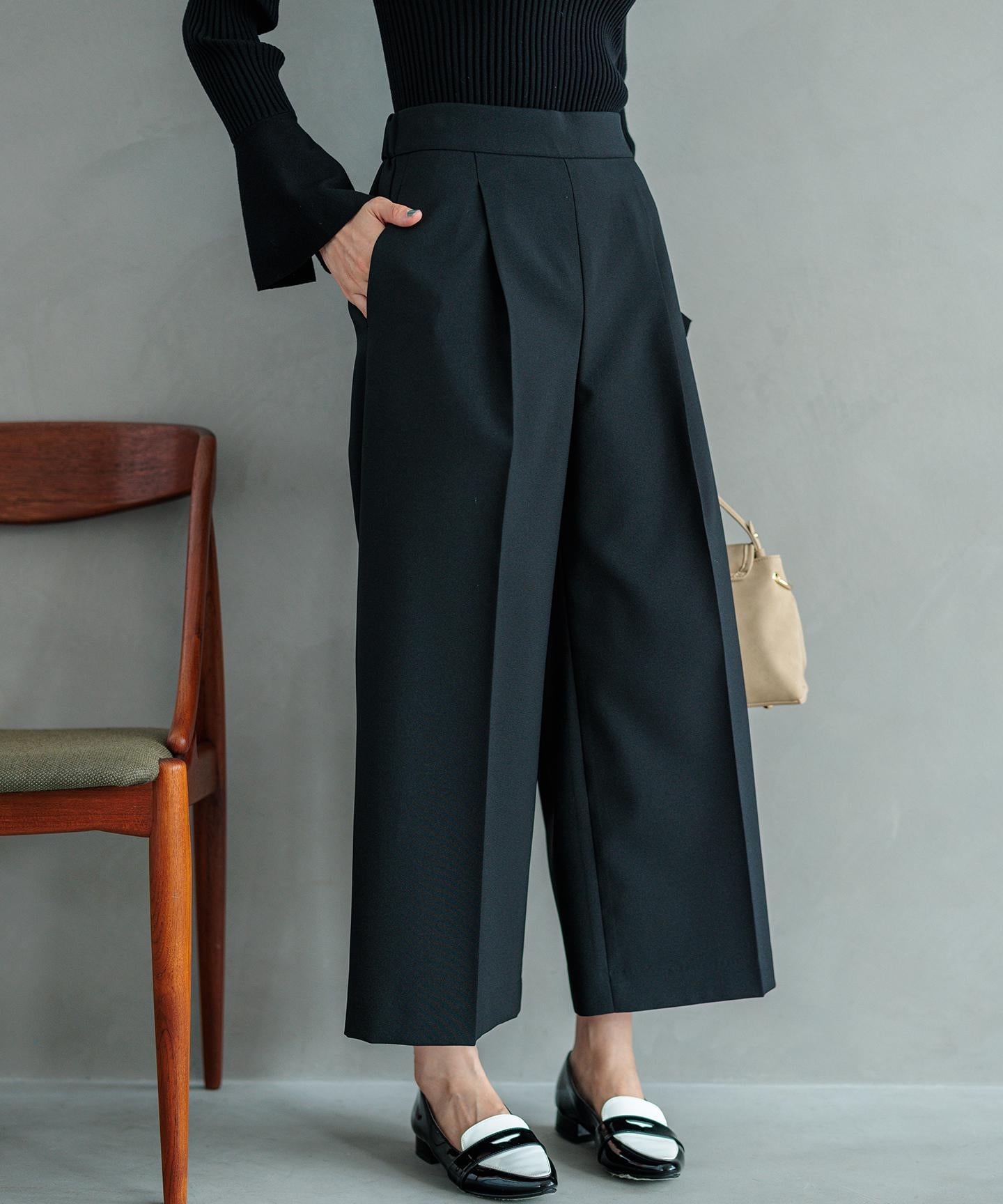 ■デザイン裾にかけて美しく広がるクロプト丈のガウチョパンツ。綺麗に落ちたシルエットと歩くたびに美しくなびく裾が魅力的です。ややハイウエストになっており、腰まわりはすっきりとしたシルエットでスタイルアップを叶えてくれます。ウエストベルトの後ろはゴム仕様でイージーなはき心地も。長時間の着用もラクチンながらもきれいめに見えるデザインがポイントです。