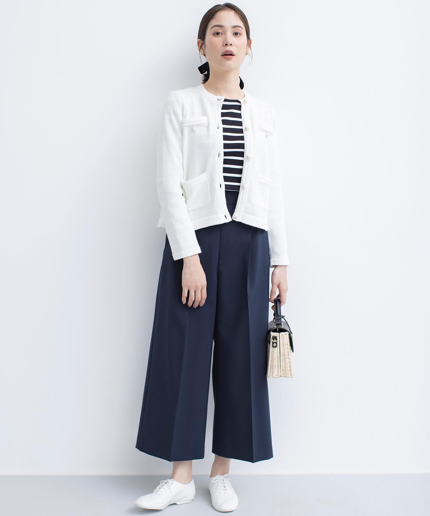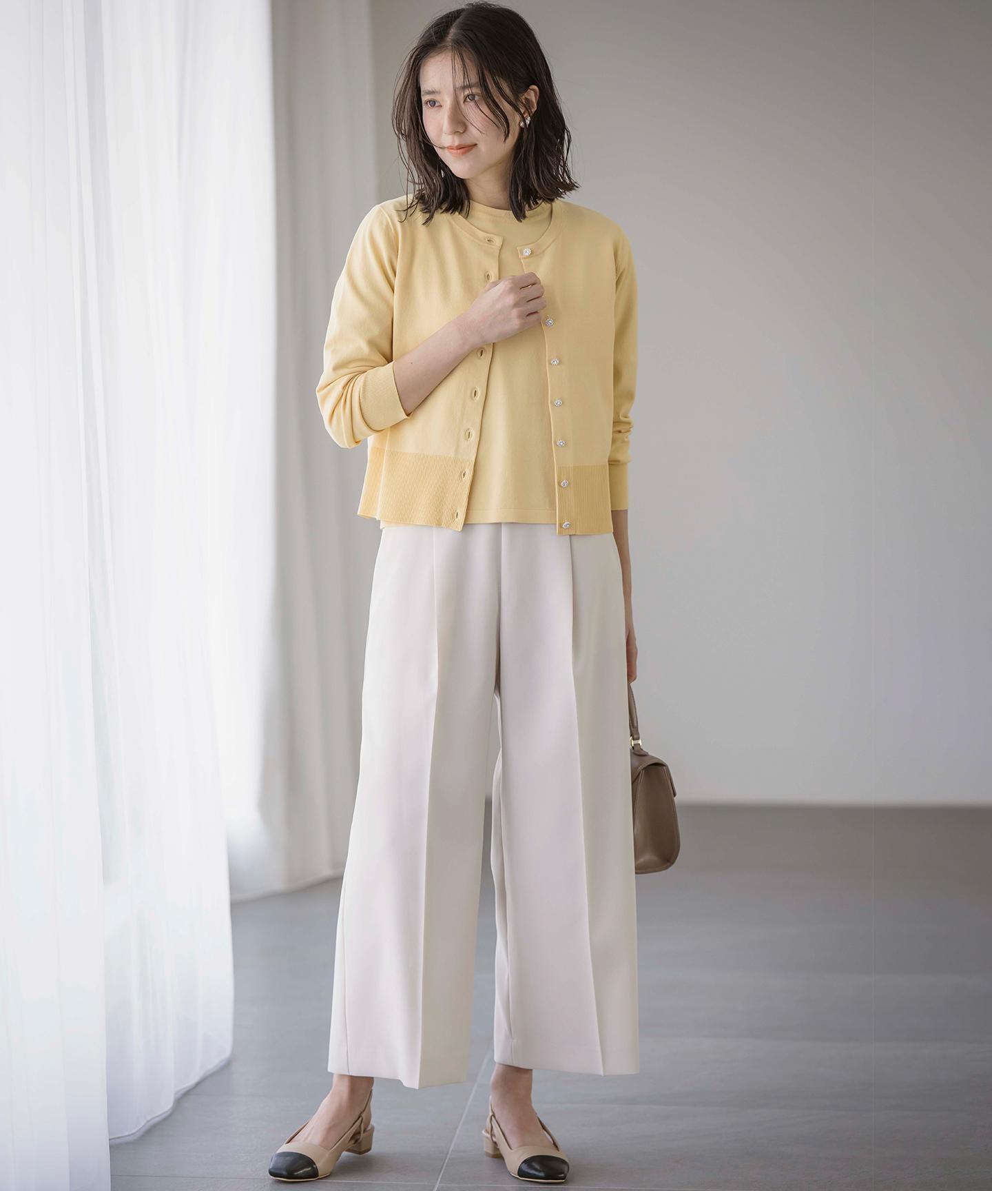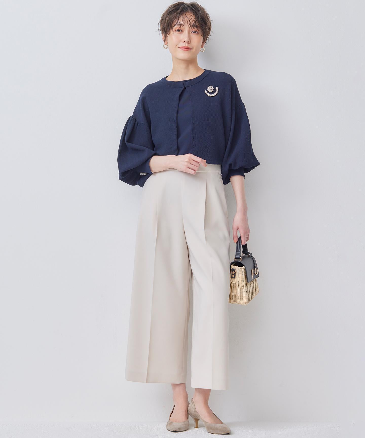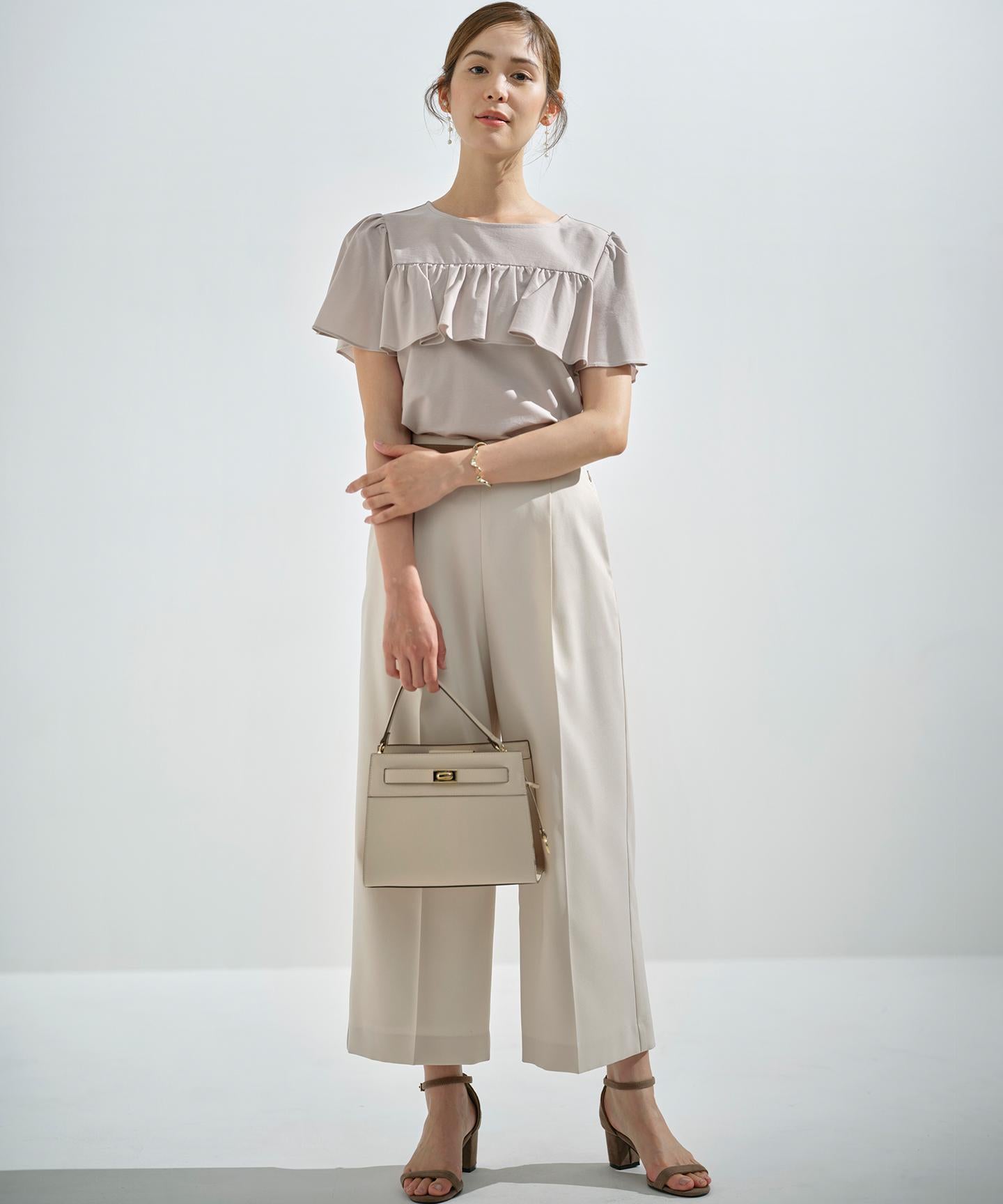 ■デザイン裾にかけて美しく広がるクロプト丈のガウチョパンツ。綺麗に落ちたシルエットと歩くたびに美しくなびく裾が魅力的です。ややハイウエストになっており、腰まわりはすっきりとしたシルエットでスタイルアップを叶えてくれます。ウエストベルトの後ろはゴム仕様でイージーなはき心地も。長時間の着用もラクチンながらもきれいめに見えるデザインがポイントです。