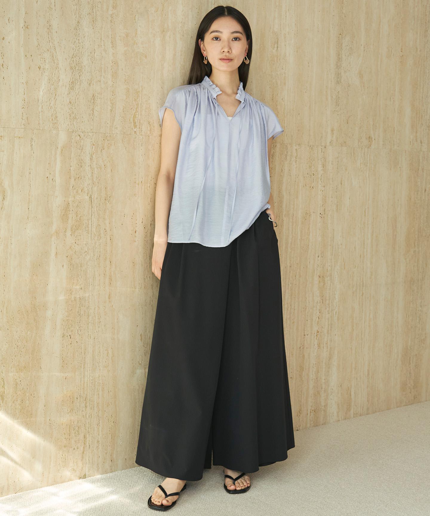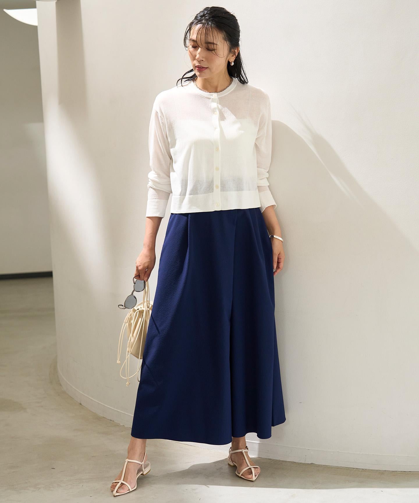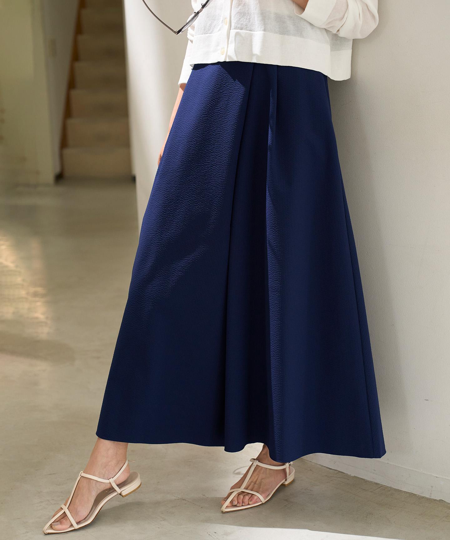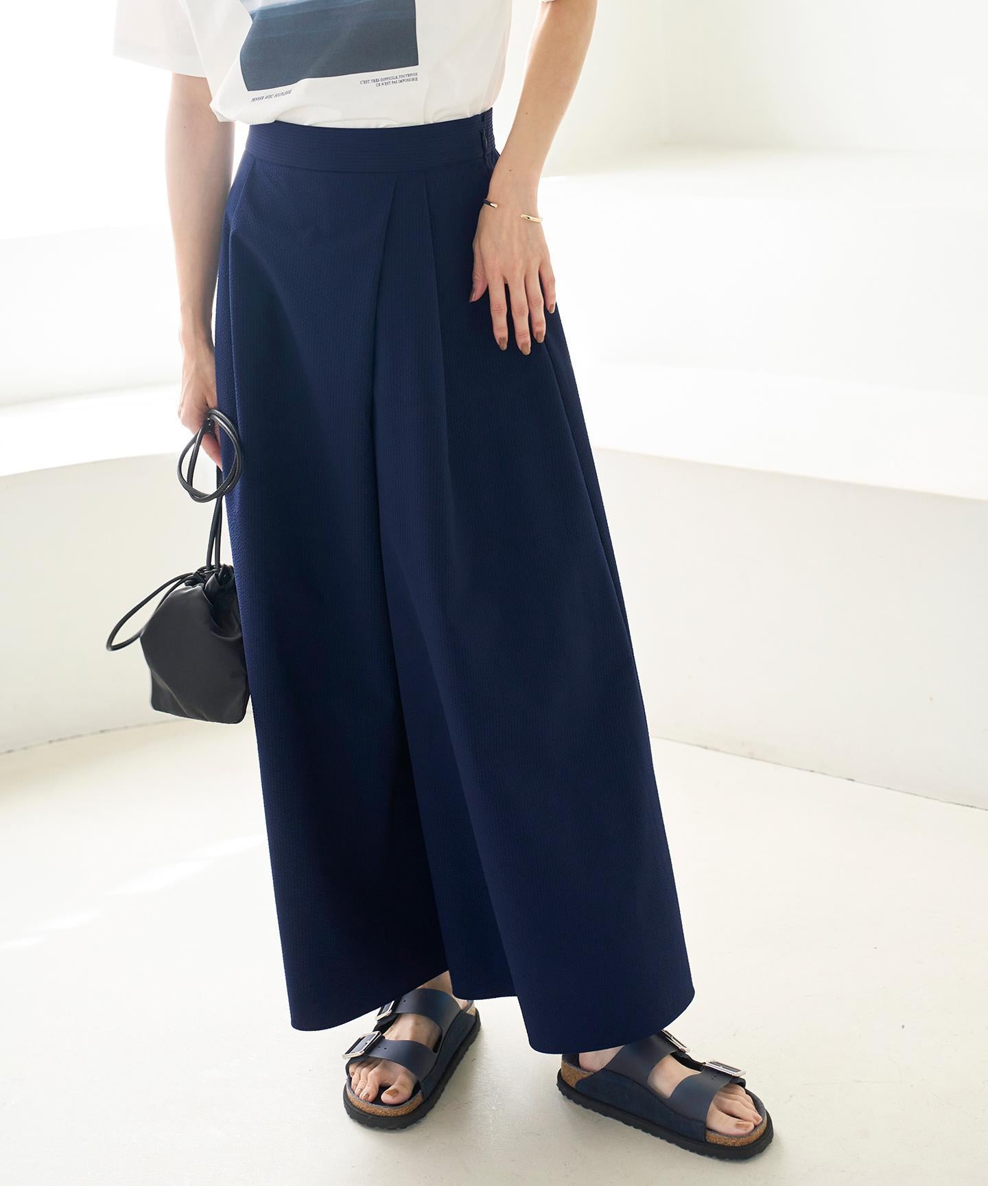 ■デザインアシンメトリーなタックデザインのラップパンツ。フレアスカートのように見えるシルエットで、パンツが苦手でも抵抗なく取り入れていただけます。足さばきが良く、風などでまくれる心配がないので、アクティブに動きたい日にもおすすめ。たっぷりとしたボリュームで、シンプルになりがちな夏コーデを華やかにしてくれる1枚です。