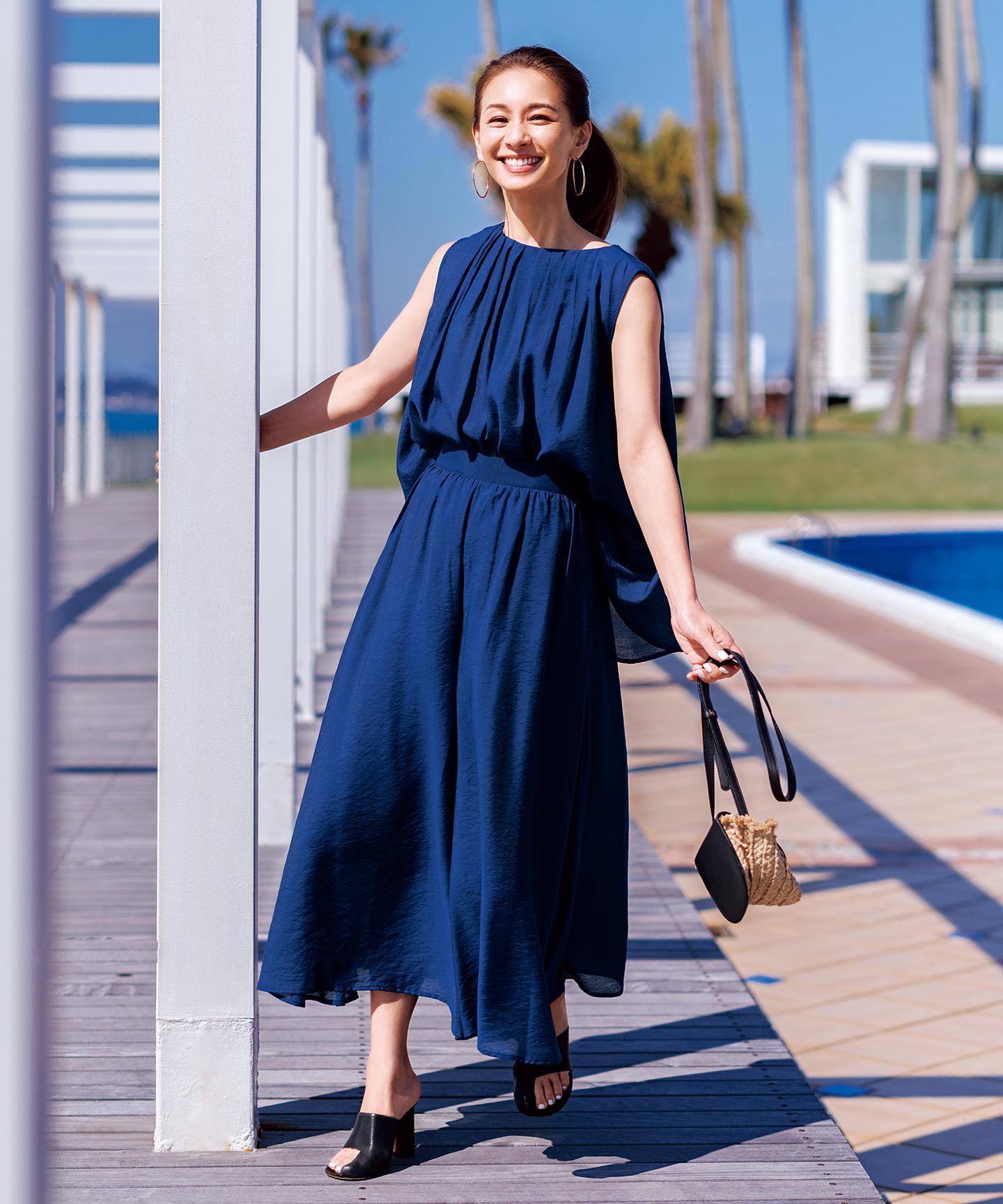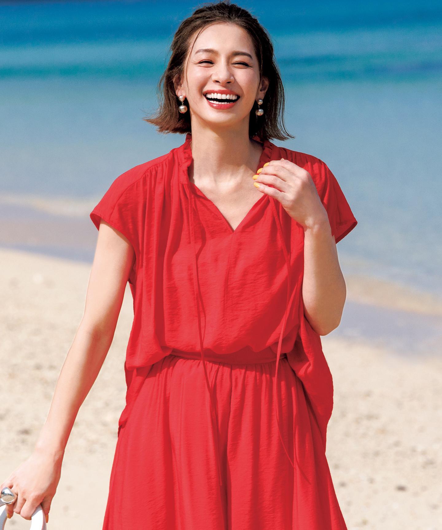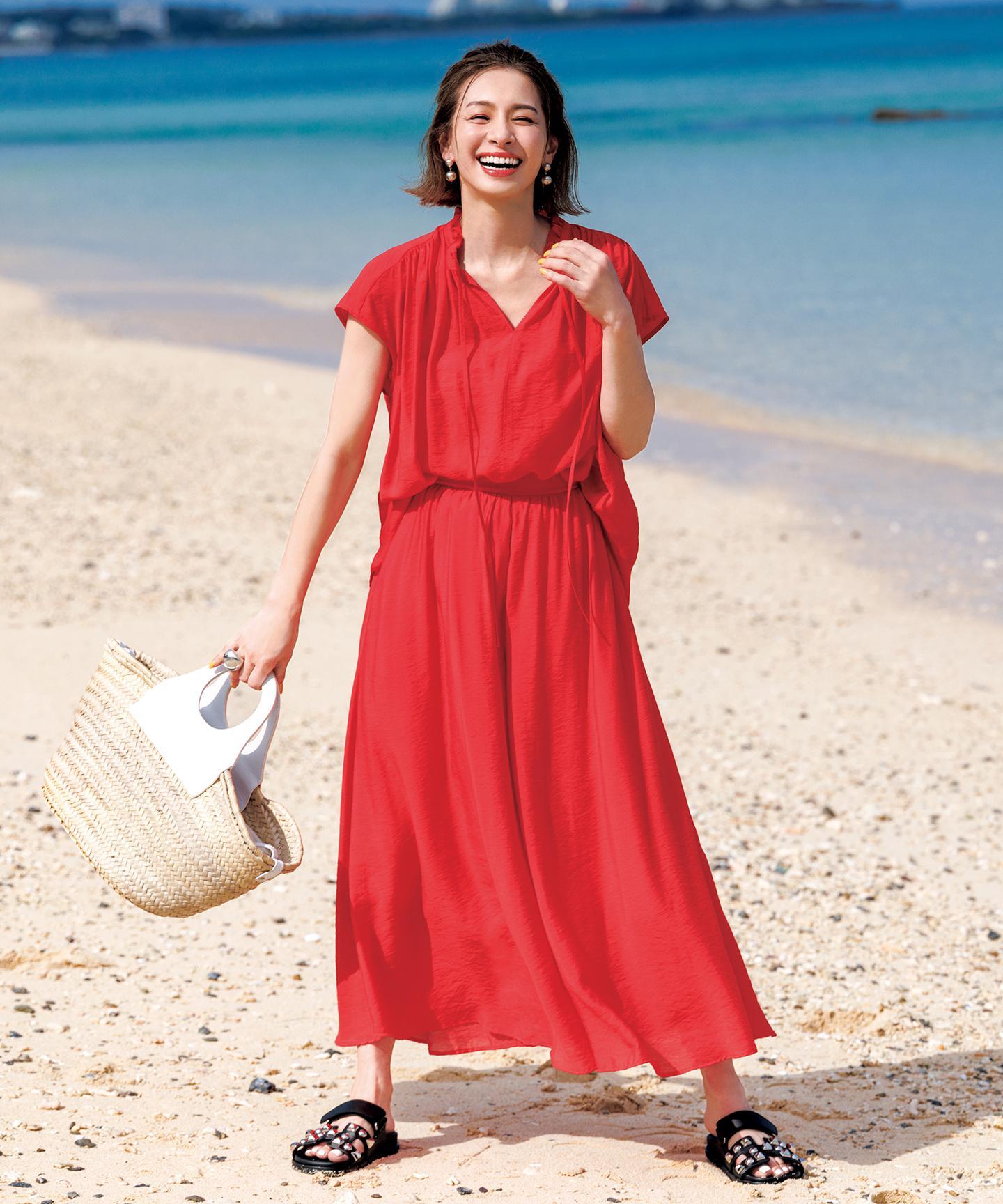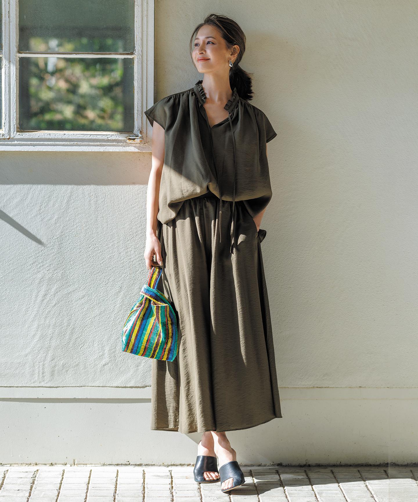 昨年ご好評いただいたパンツから新色スカーレット(010)・カーキ(054)・[WEB限定]ネイビー(075)登場!まるでロングスカート!すっきり見えワイドパンツ