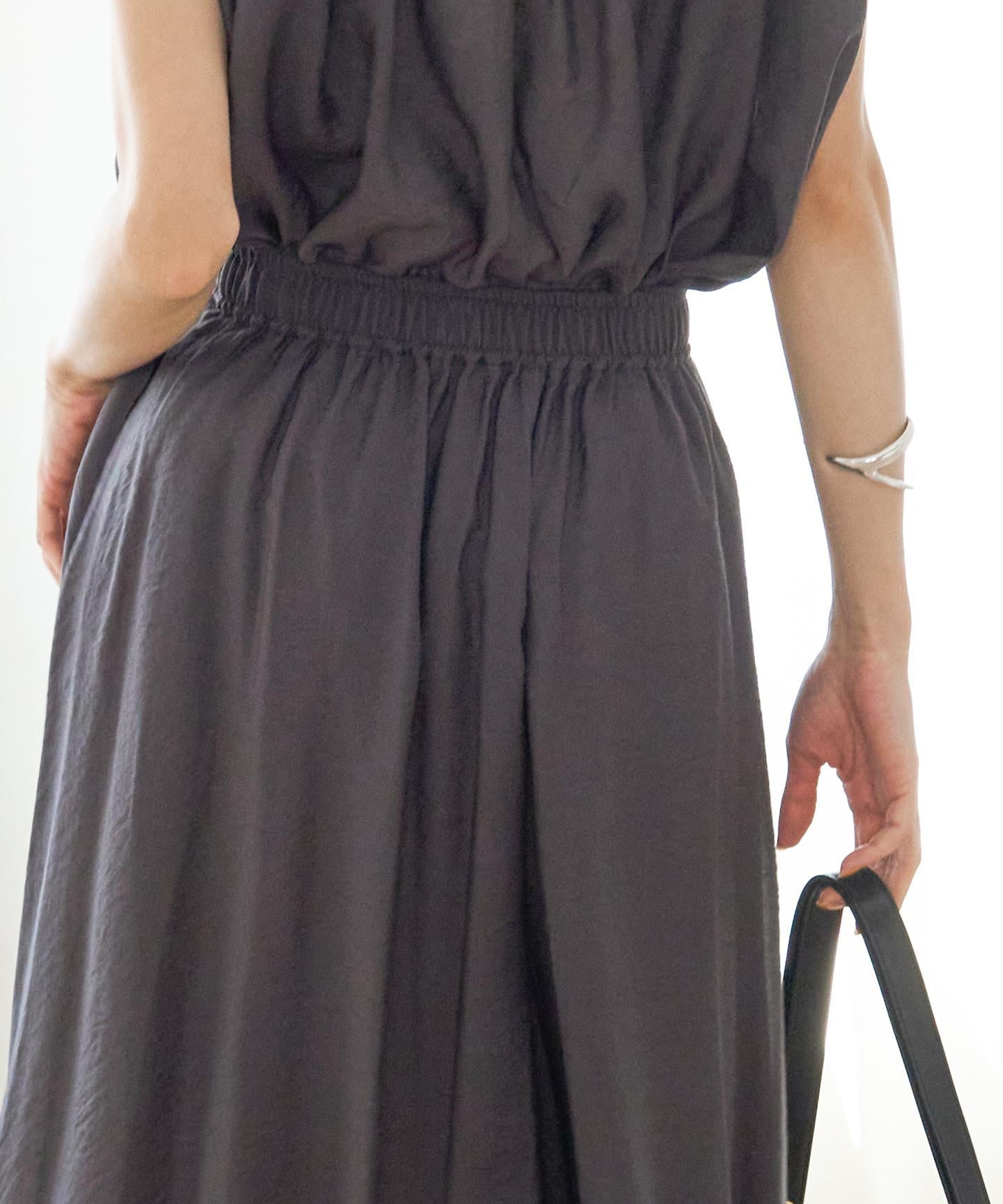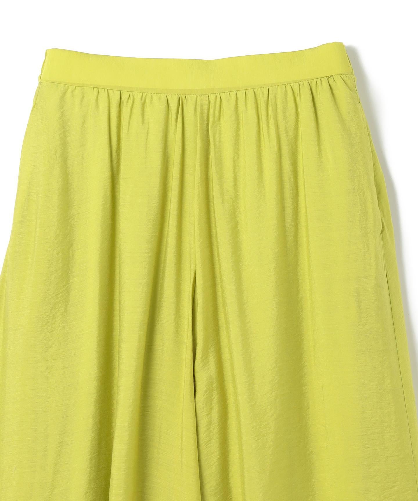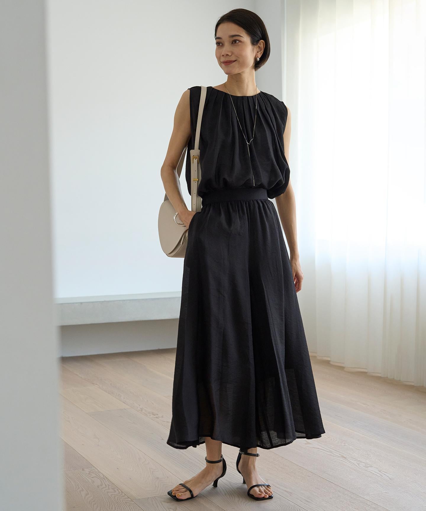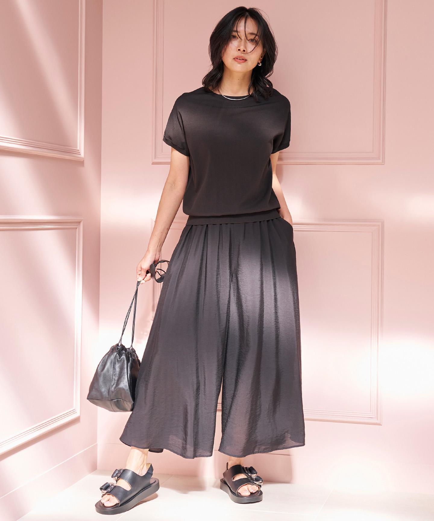 ■デザインまるでロングスカートを履いているような贅沢な分量感のワイドパンツです。落ち感のある生地を使用しているので、分量が多くても膨らみすぎずウエスト周りもスッキリ着ていただけます。ウエストもゴム仕様でストレスフリーな履き心地です。裏地も付いております。