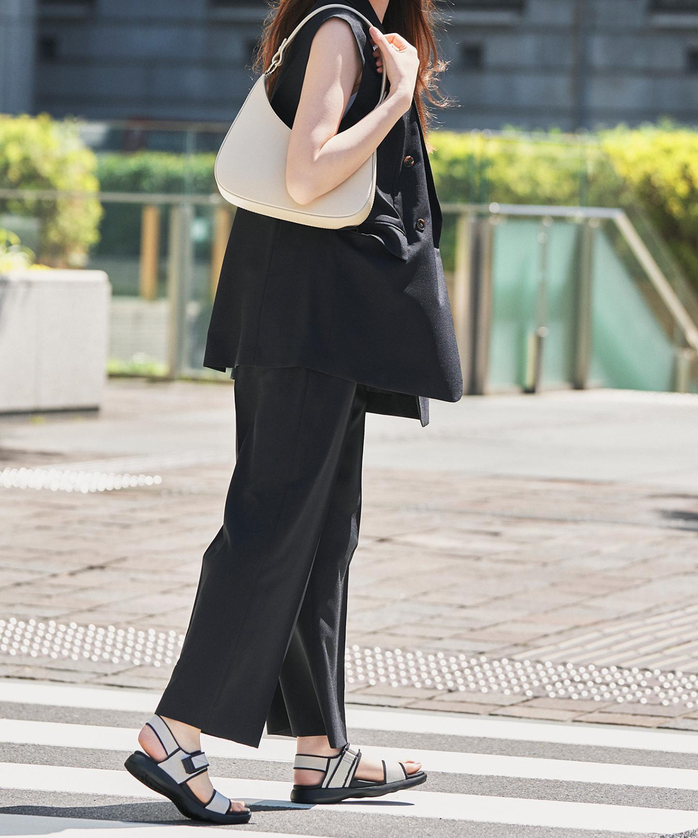 地面と直接触れるアウトソールは履き心地にこだわったオリジナル。軽量&柔らかなつくりのため屈曲性が良く、歩行の安定感を高めます。ラバー付きで滑りにくく、適度な弾性もあります。ニットで編み立てた甲のパーツが足を柔らかく包み込み、インソールもふかふかなのでソフトな履き心地です。インソールは表面に細かいシボ感のあるデザインを施すことでさらっとした着用感です。足首のテープでしっかりホールドされるので足がぶれずに疲れにくいのもうれしいポイント。