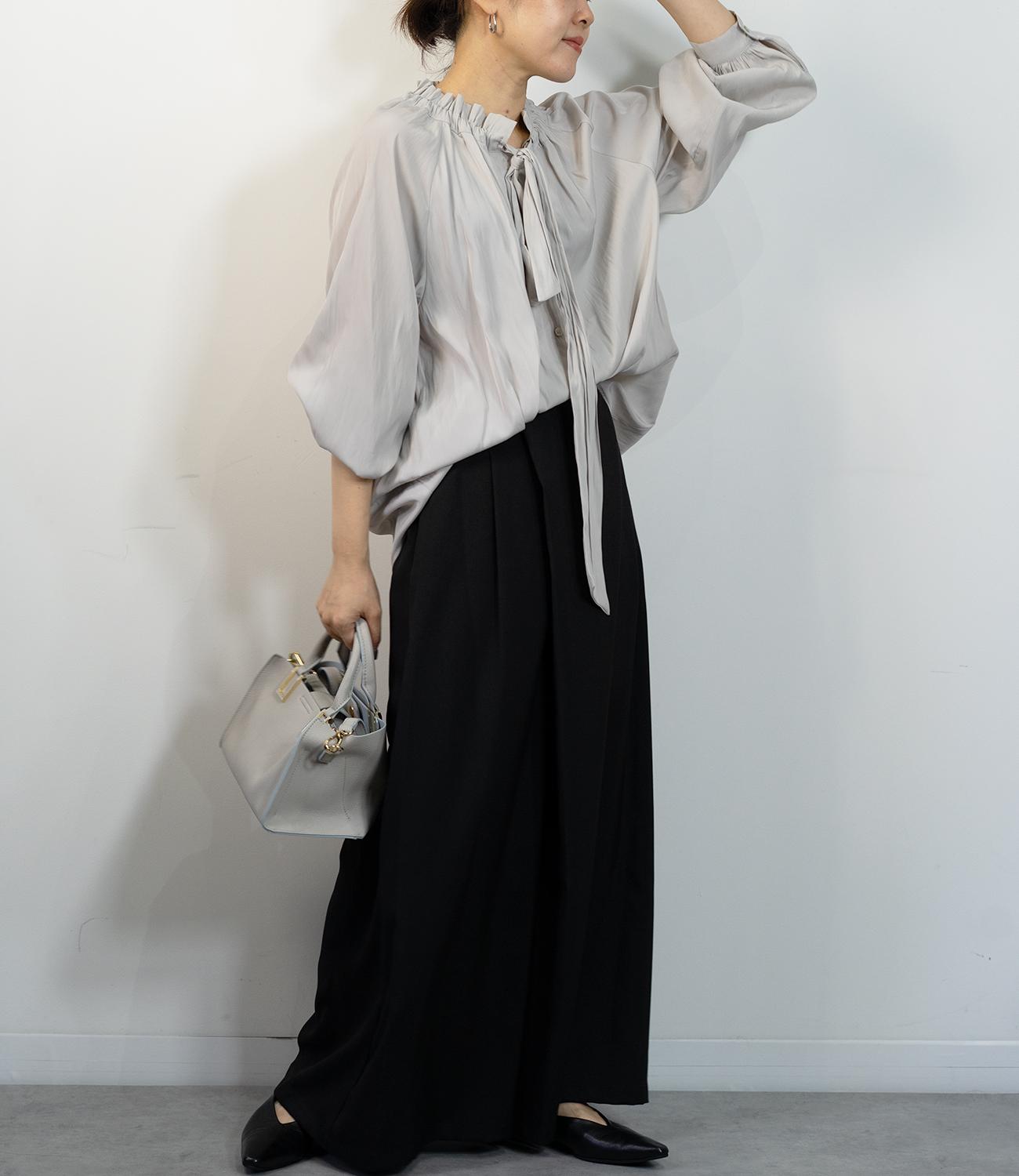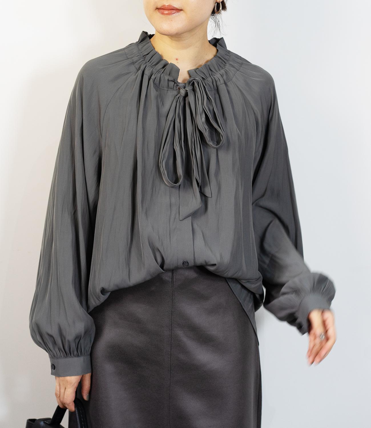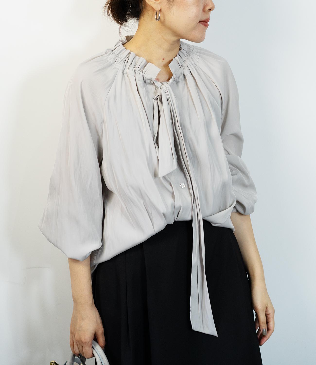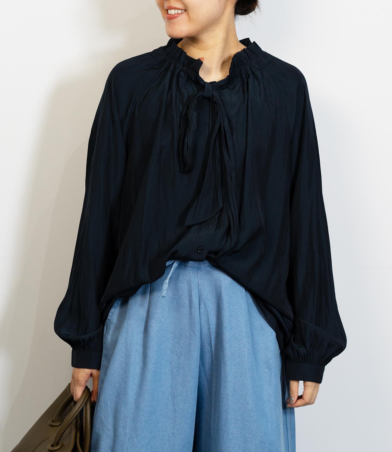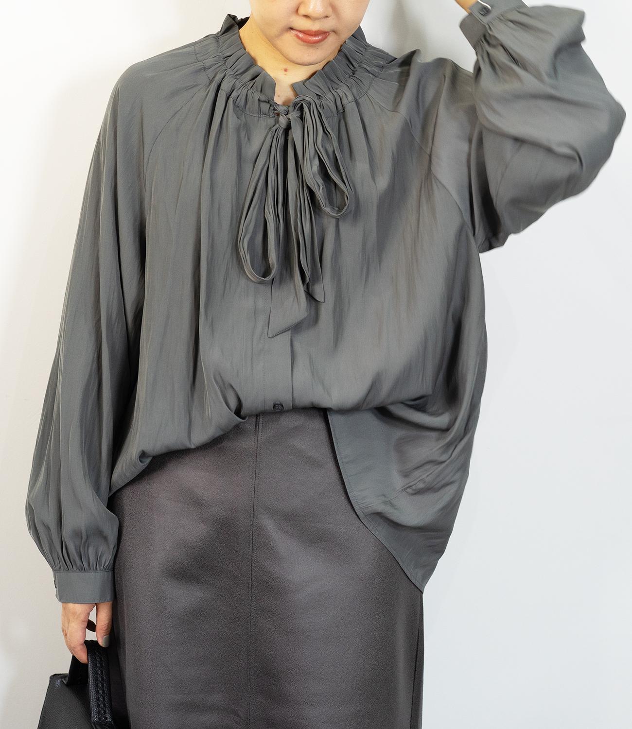 ゆとりのあるサイジング、きっちりしすぎないマットなパウダーサテン素材。デニムにもタイトスカートにもマッチする万能ブラウスです。