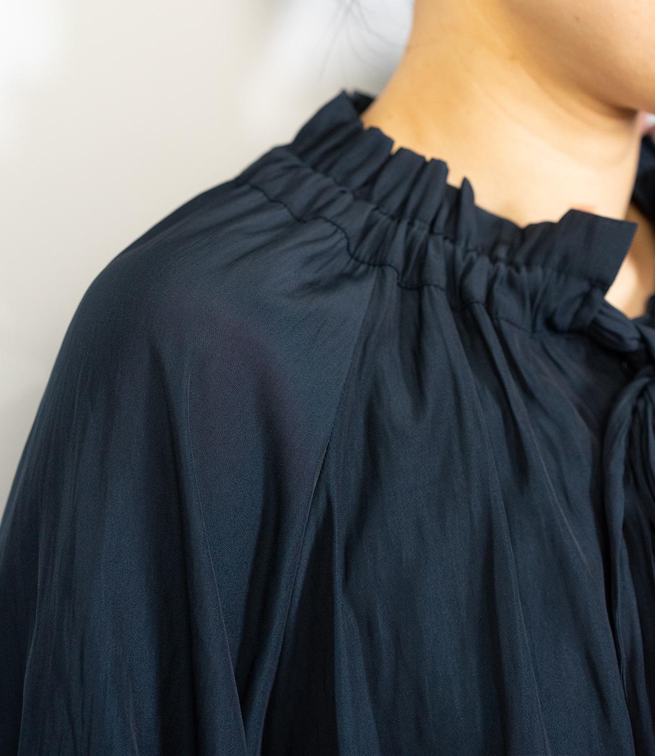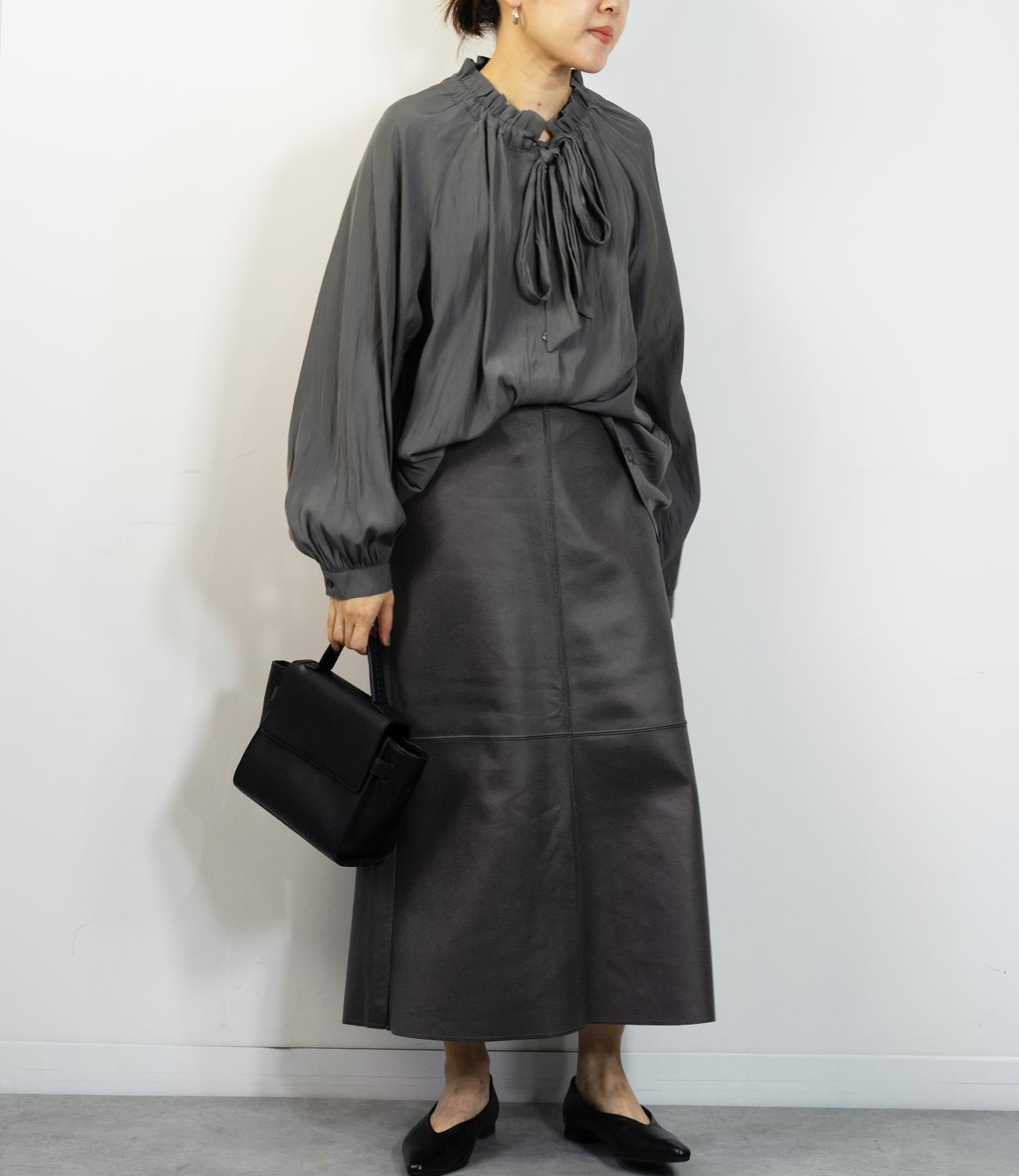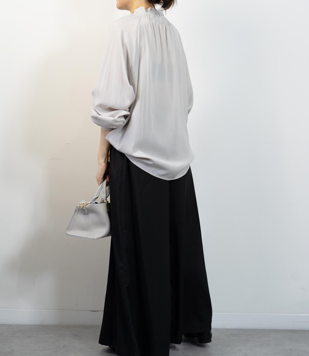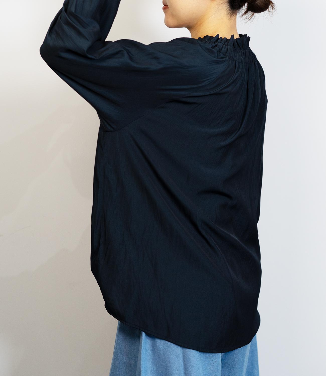 ゆとりのあるサイジング、きっちりしすぎないマットなパウダーサテン素材。デニムにもタイトスカートにもマッチする万能ブラウスです。