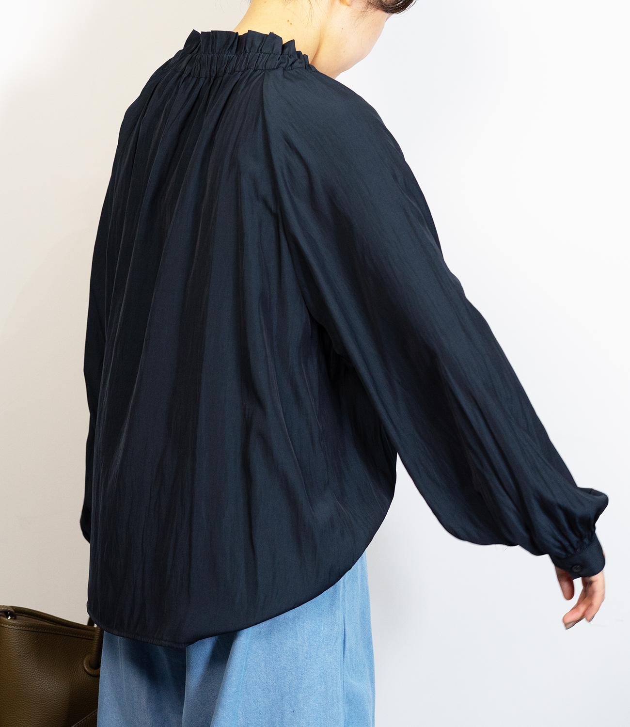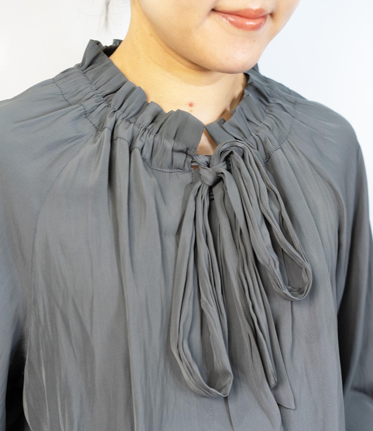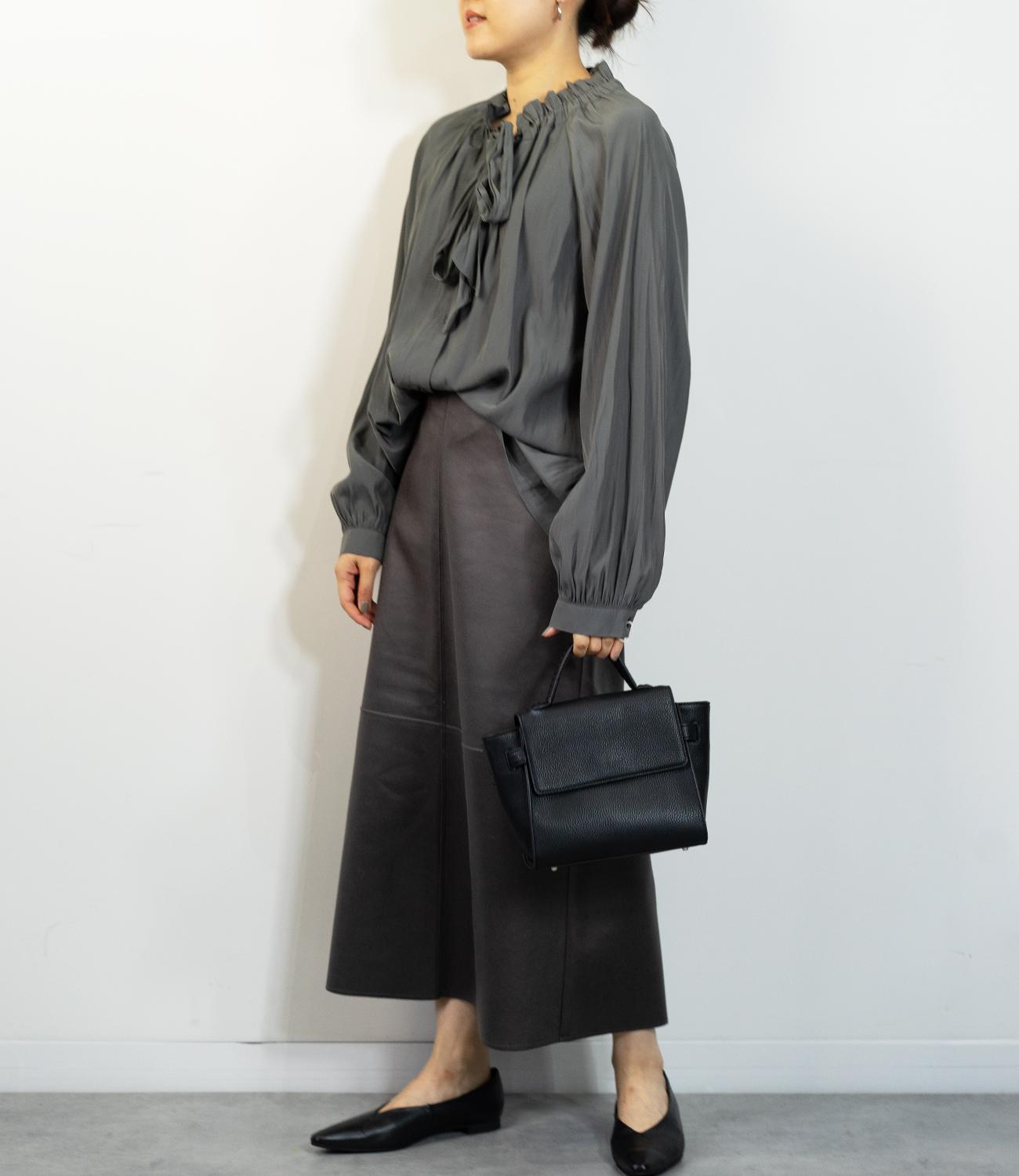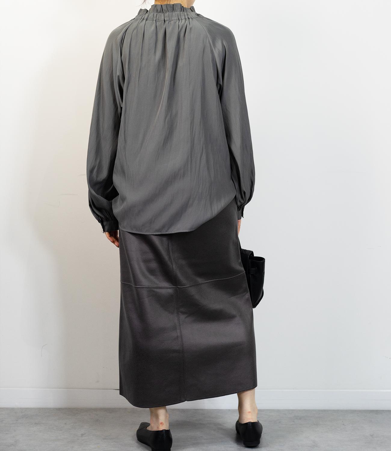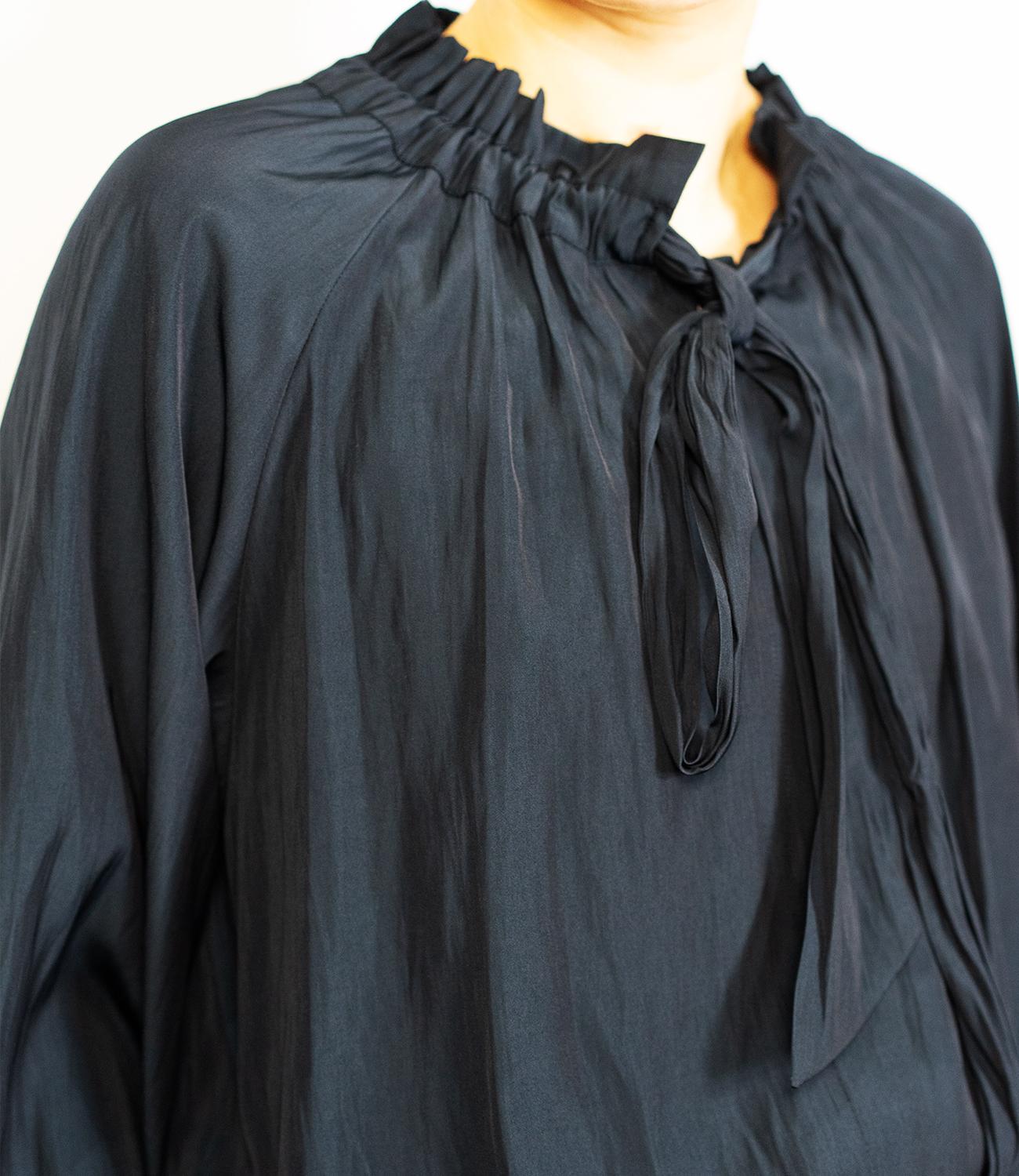 ゆとりのあるサイジング、きっちりしすぎないマットなパウダーサテン素材。デニムにもタイトスカートにもマッチする万能ブラウスです。
