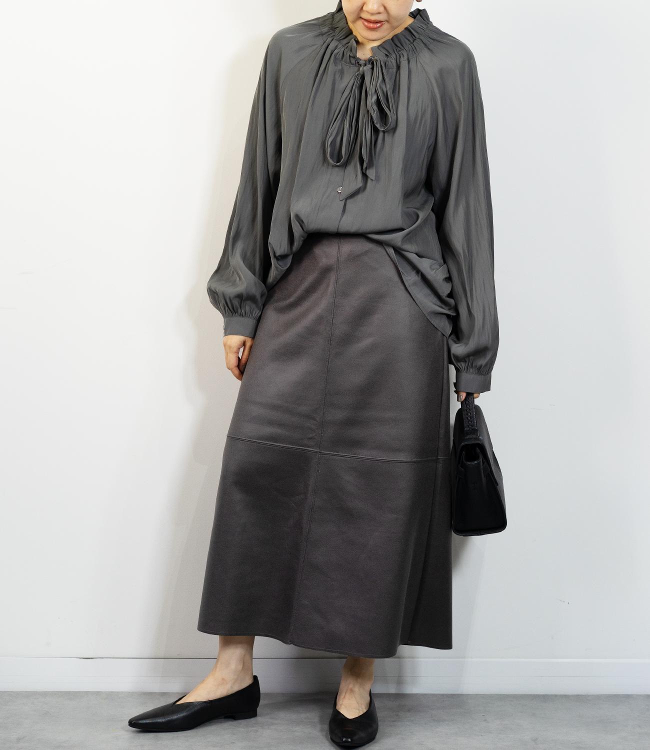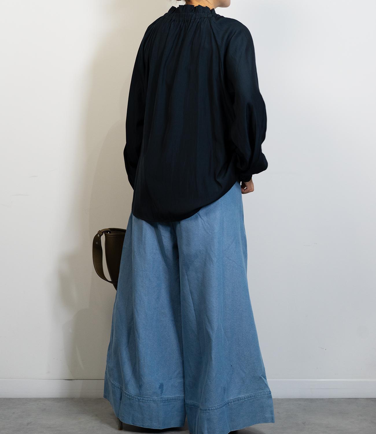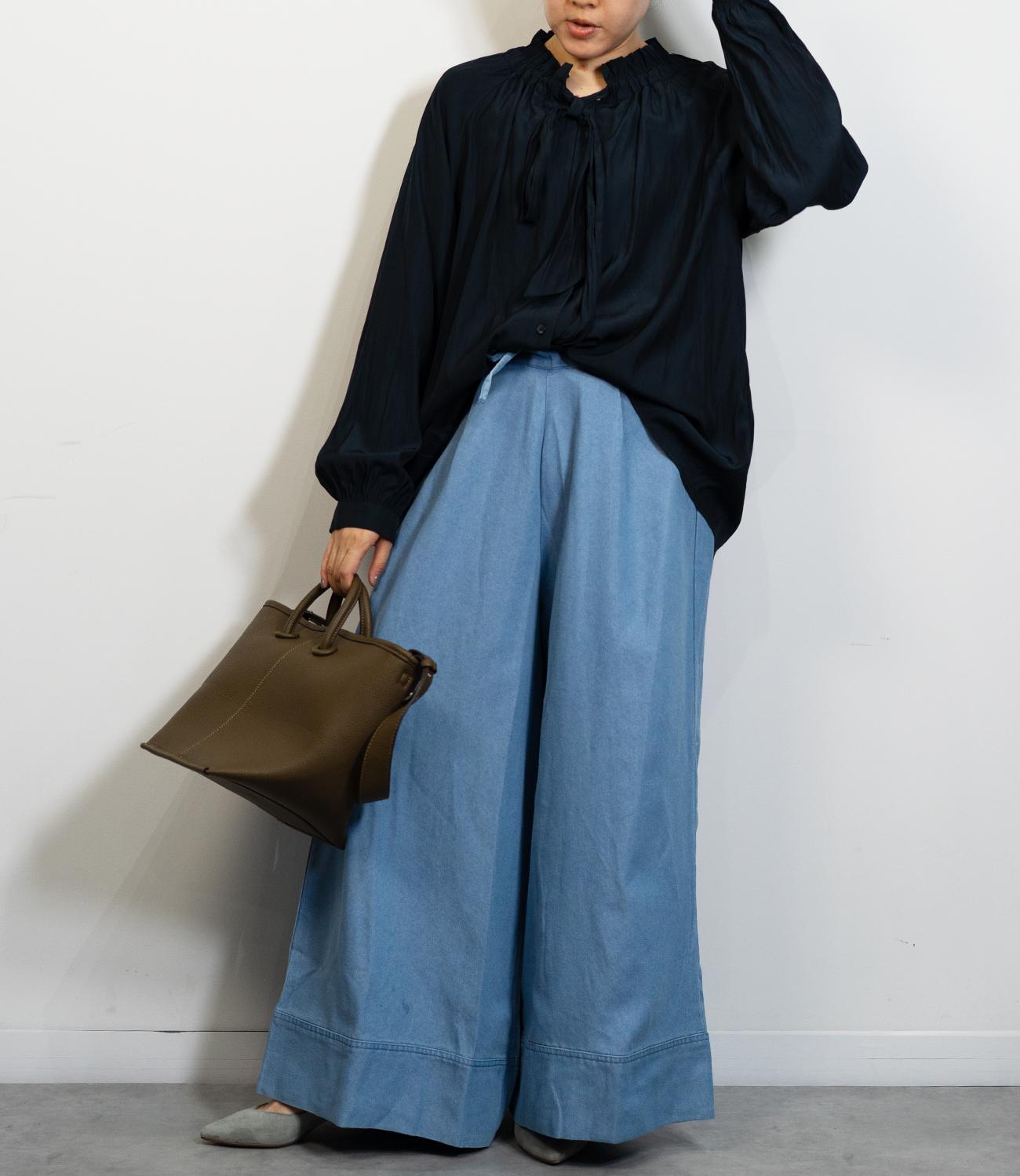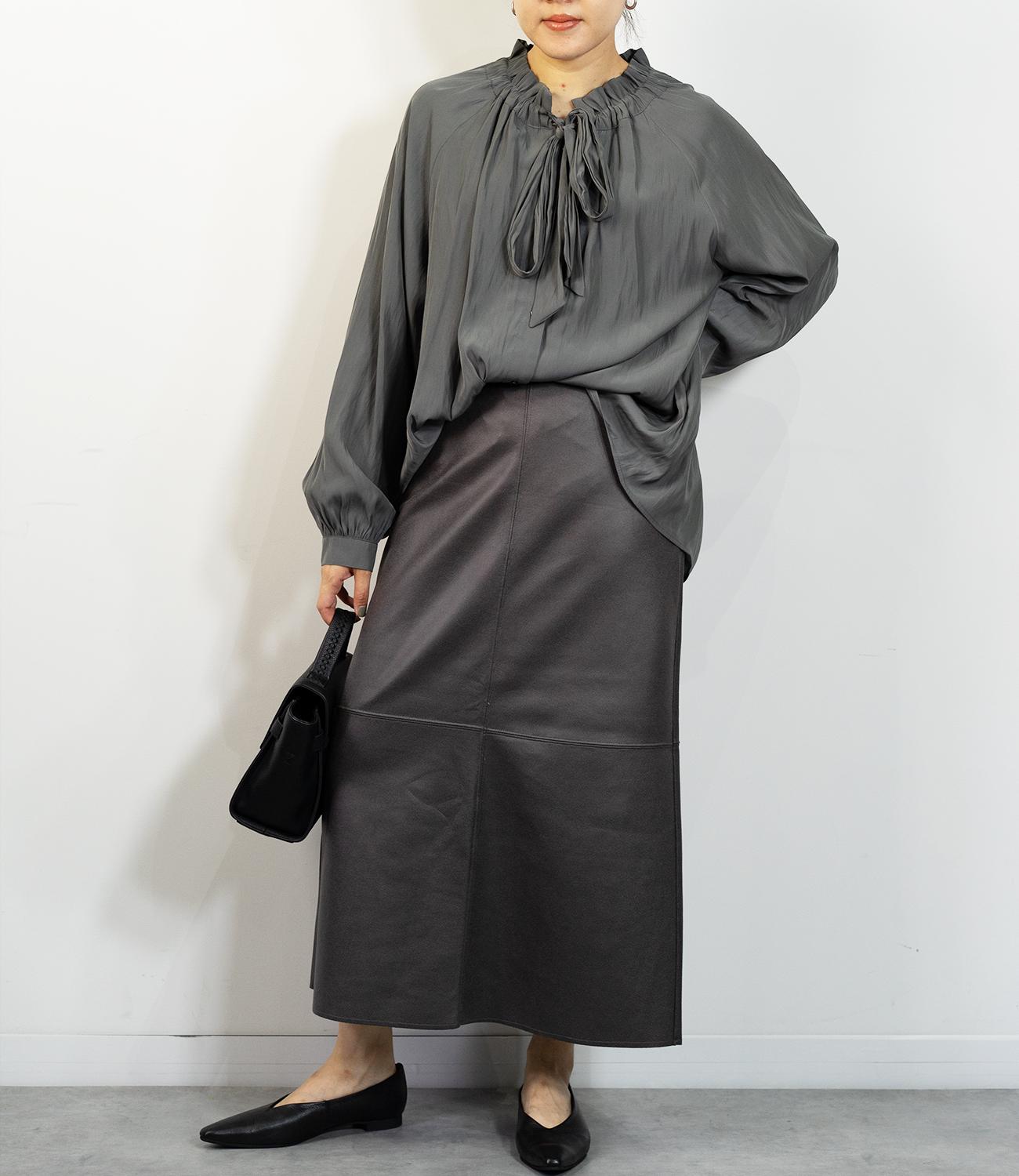 ゆとりのあるサイジング、きっちりしすぎないマットなパウダーサテン素材。デニムにもタイトスカートにもマッチする万能ブラウスです。