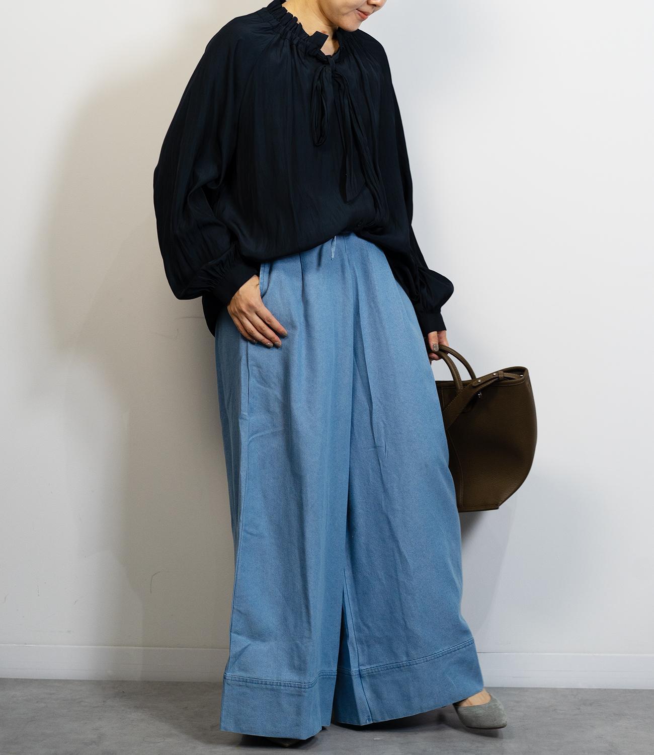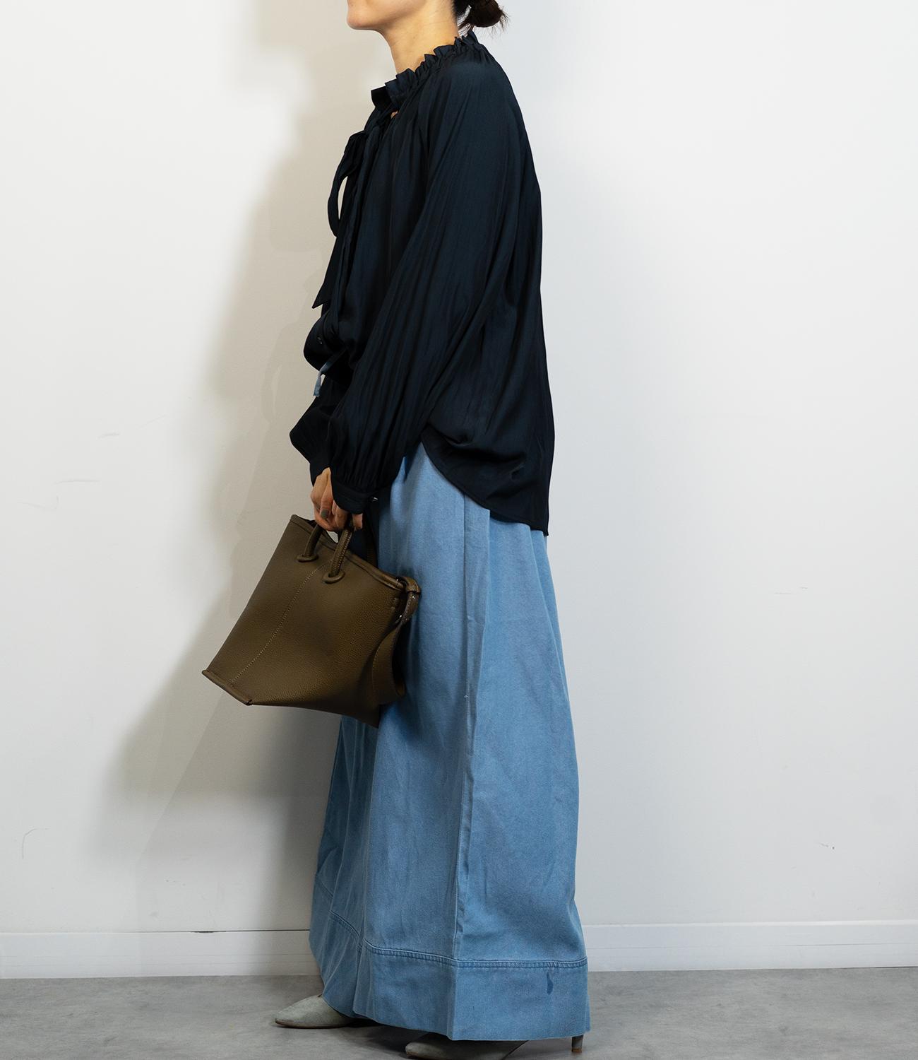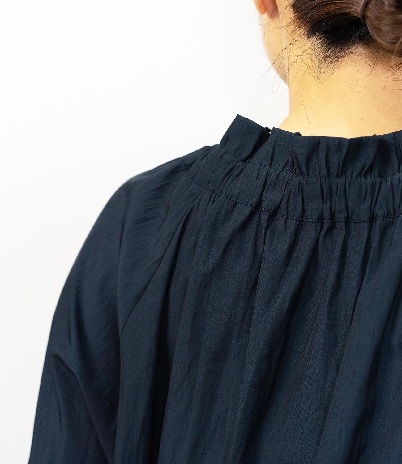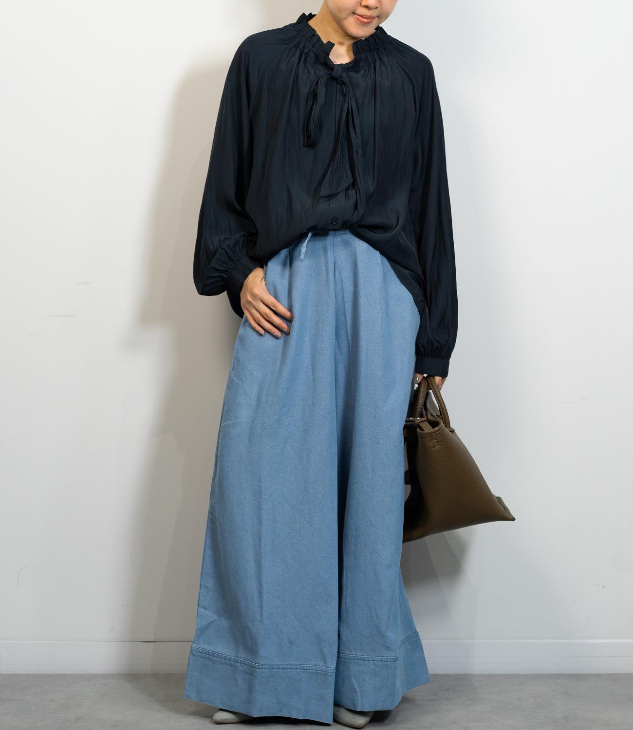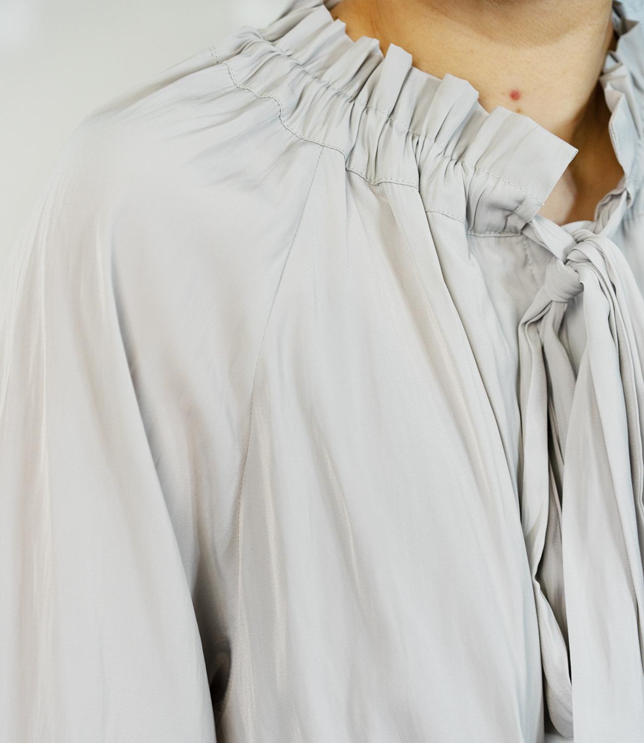 ゆとりのあるサイジング、きっちりしすぎないマットなパウダーサテン素材。デニムにもタイトスカートにもマッチする万能ブラウスです。