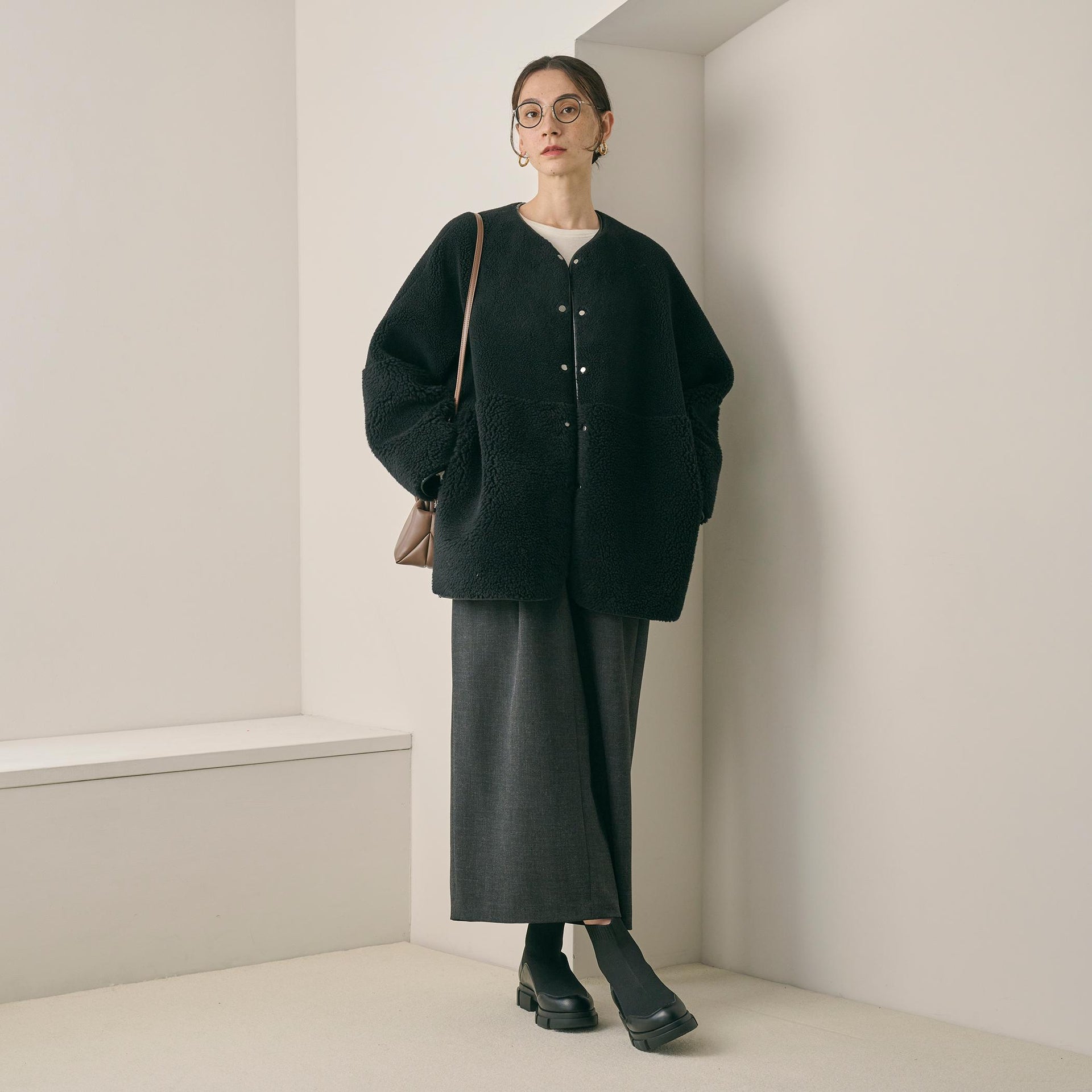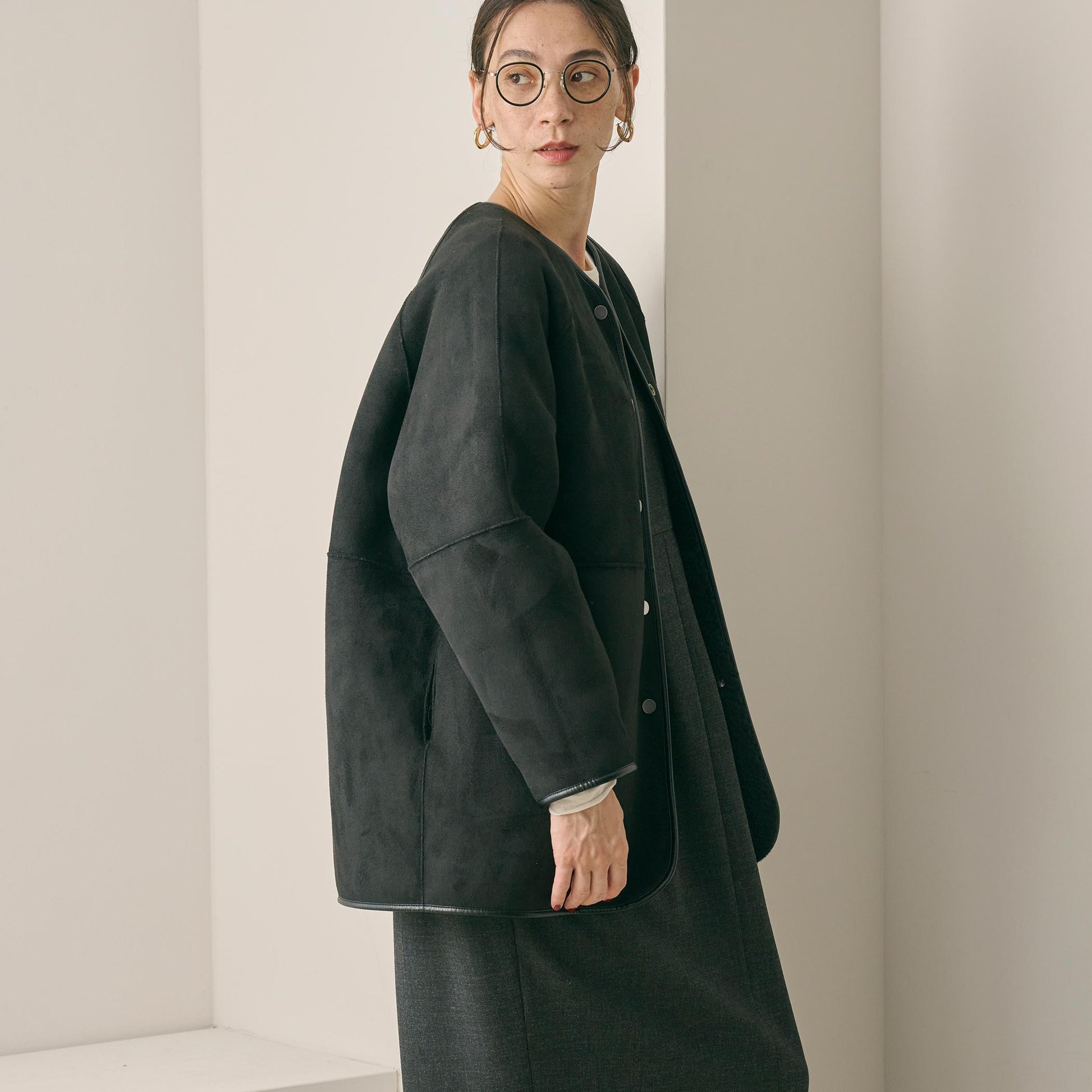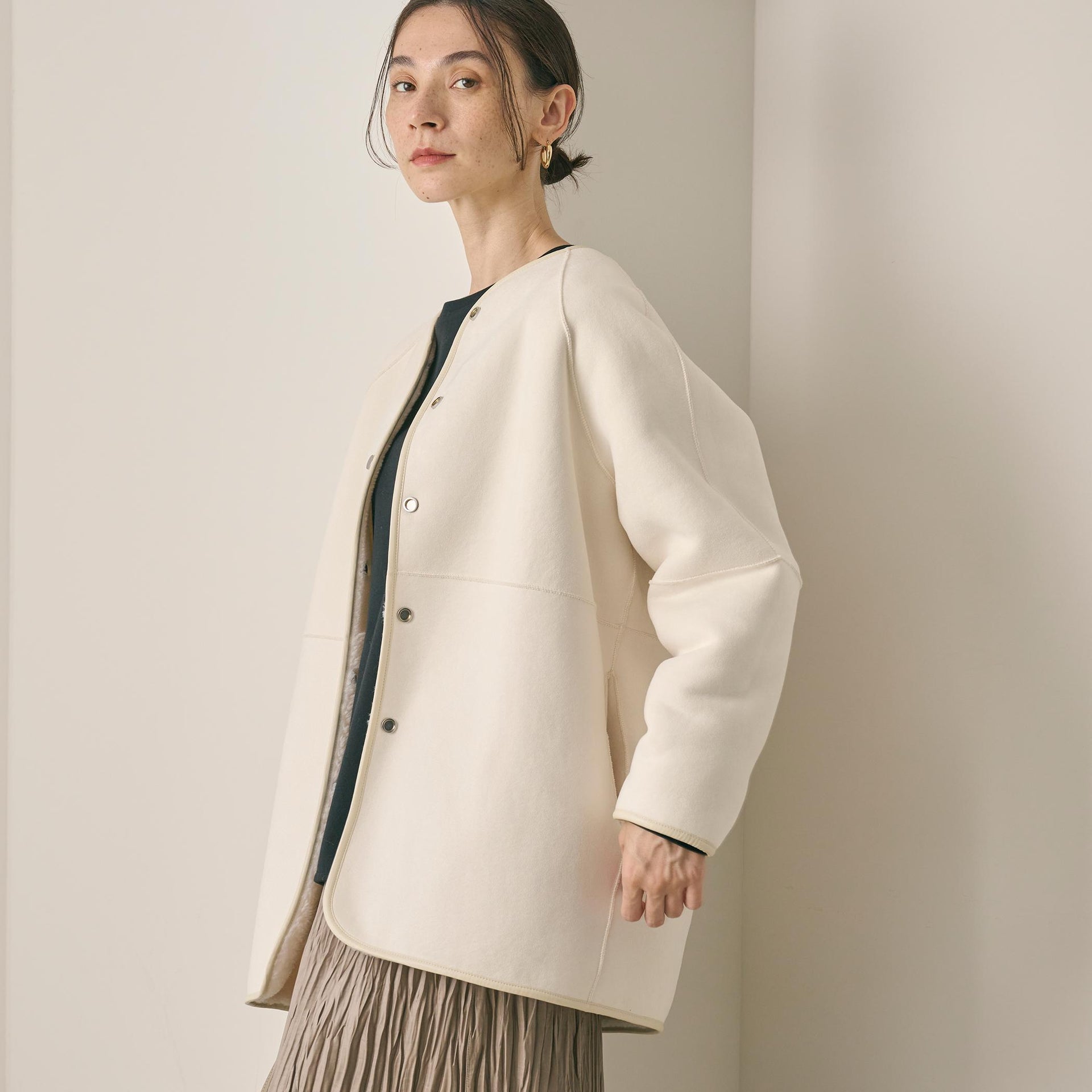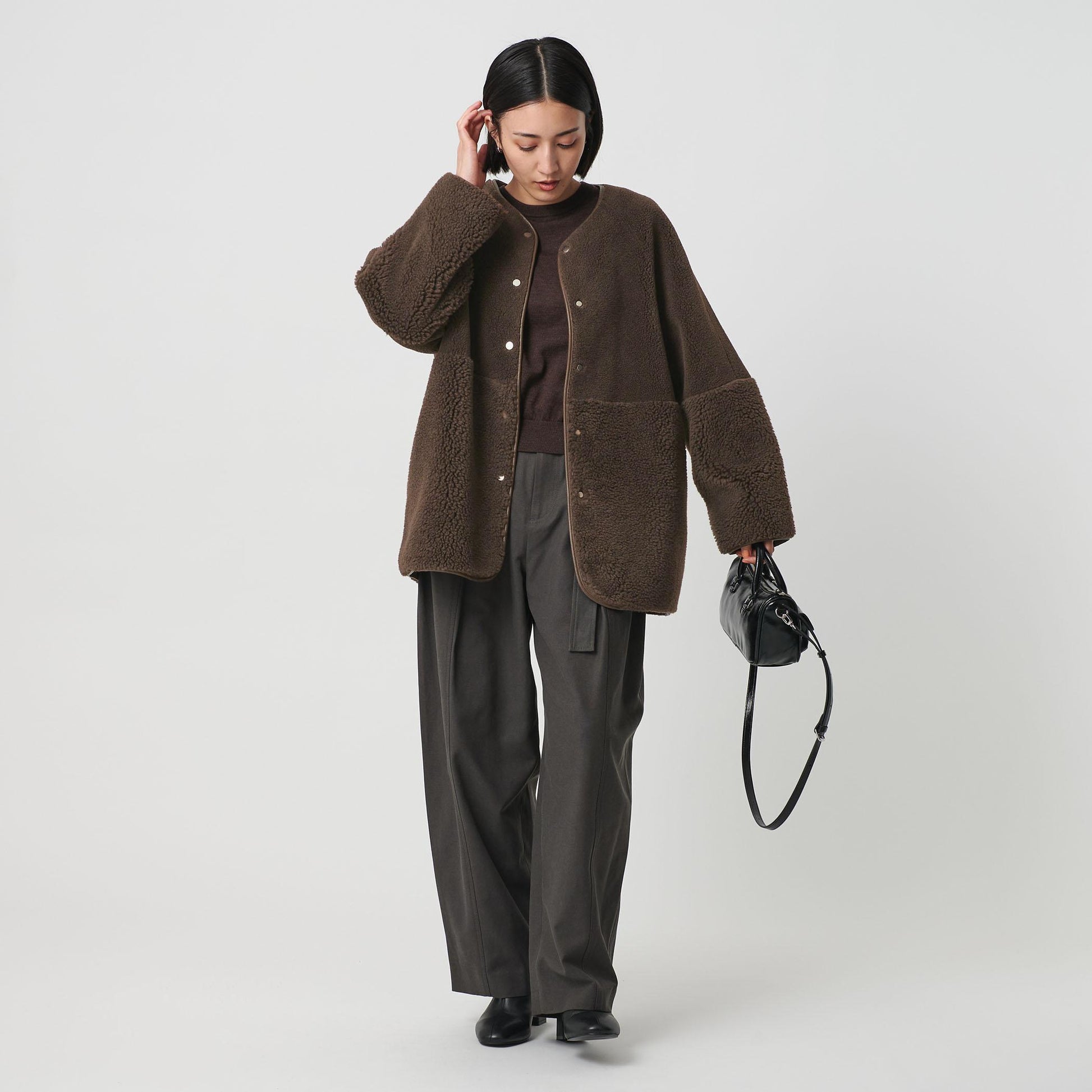 首元はノーカラーで仕上げ、ボリュームのあるシルエットに適度な抜け感をプラス。