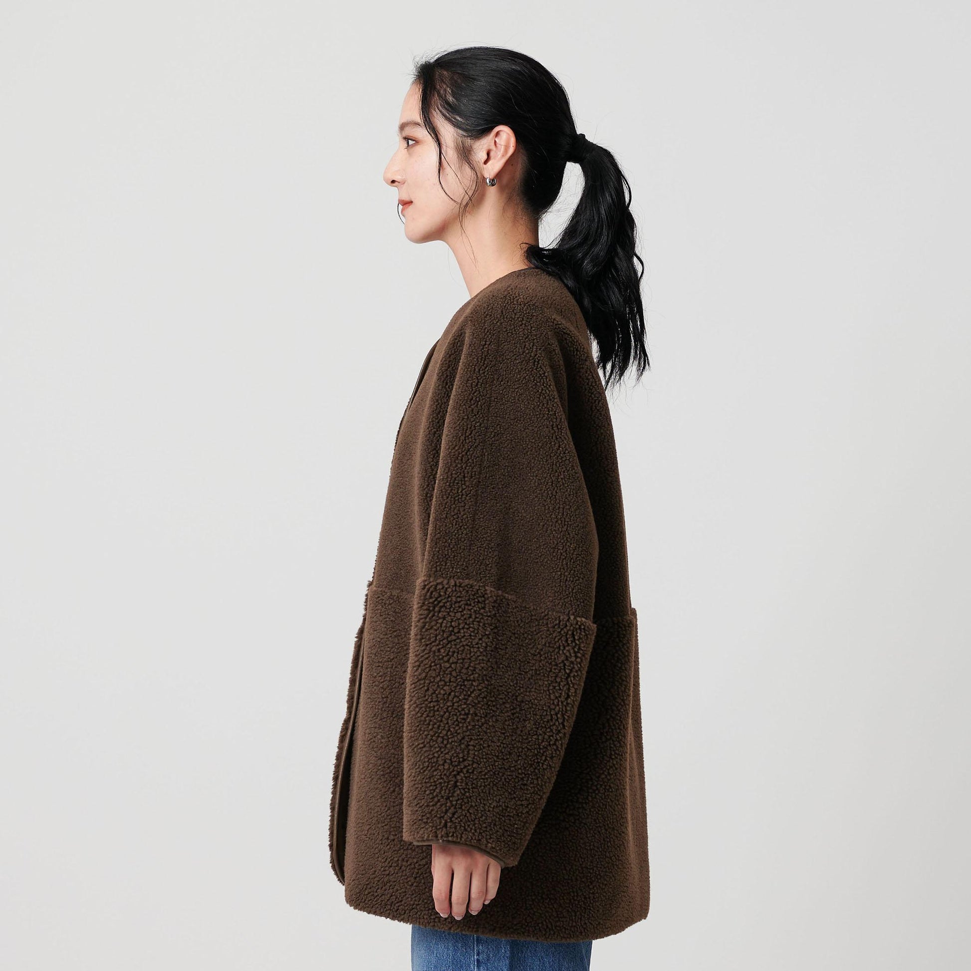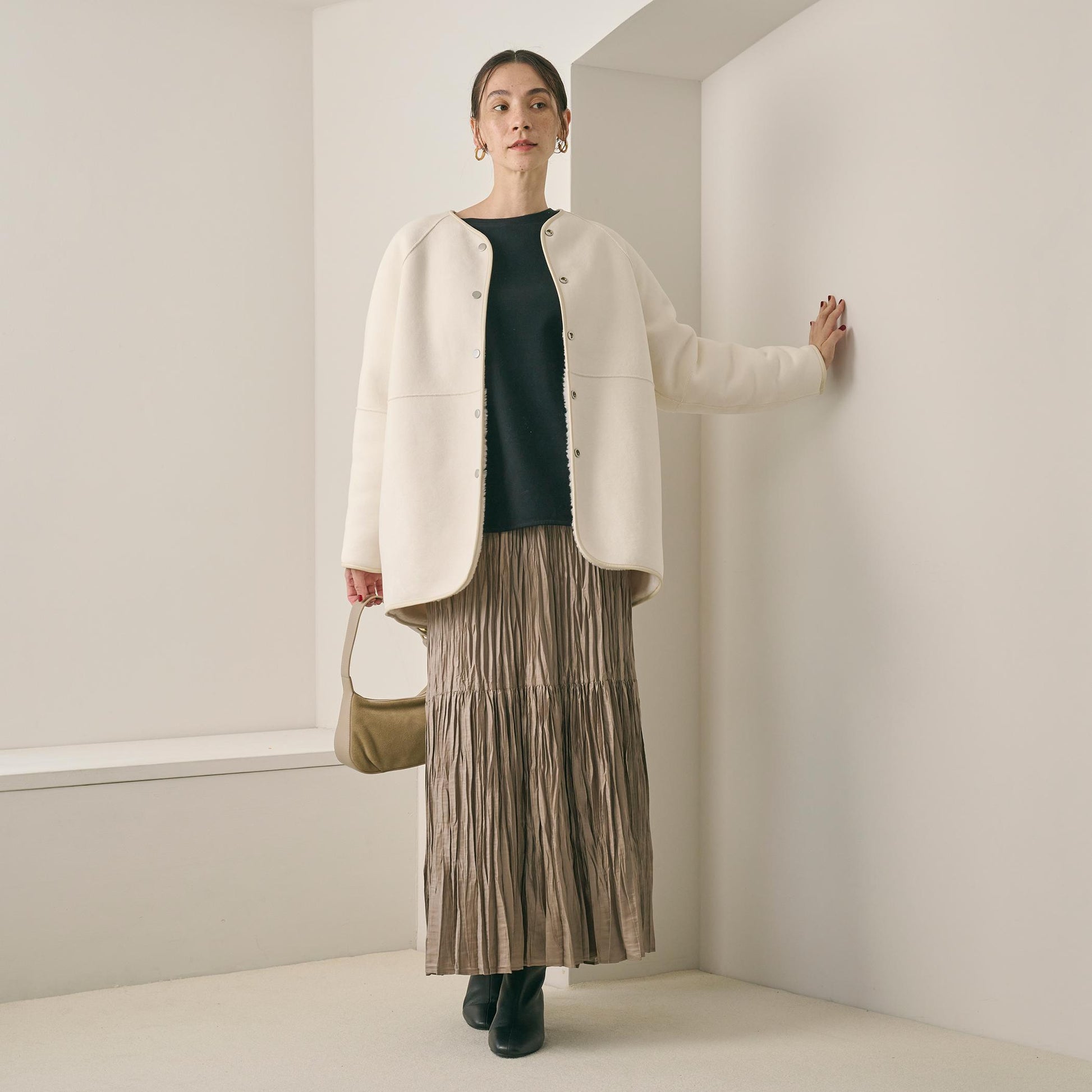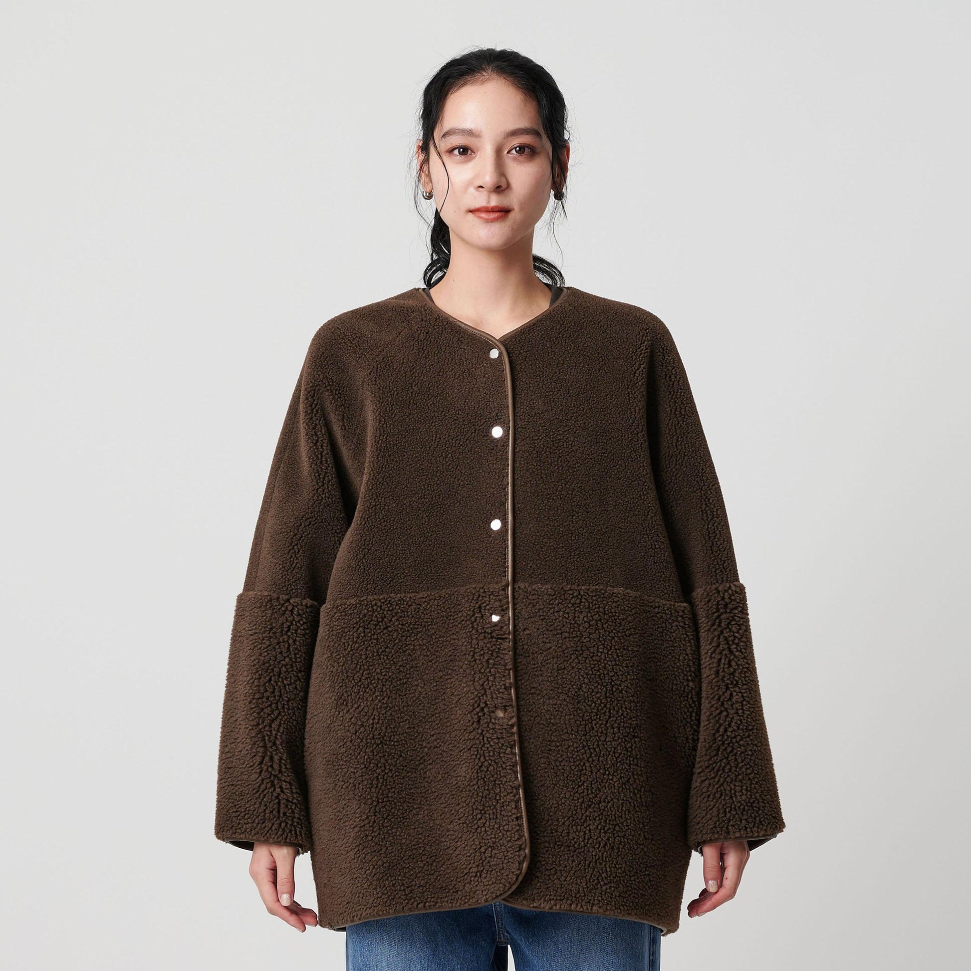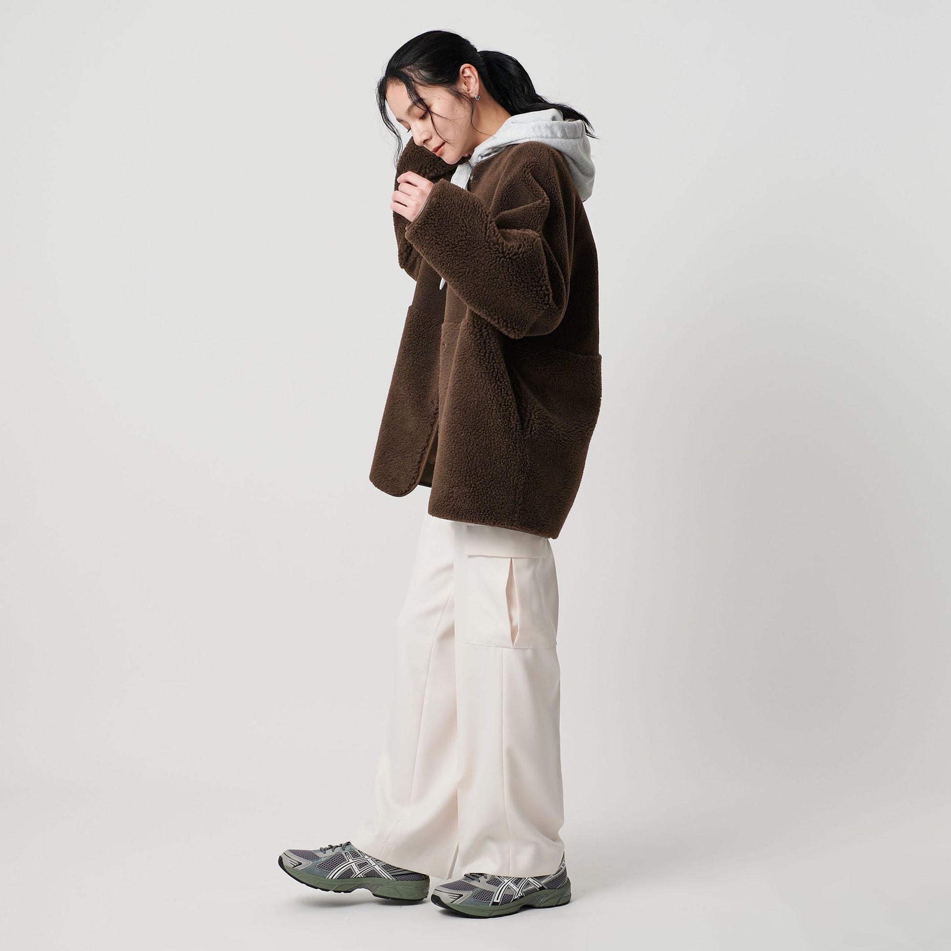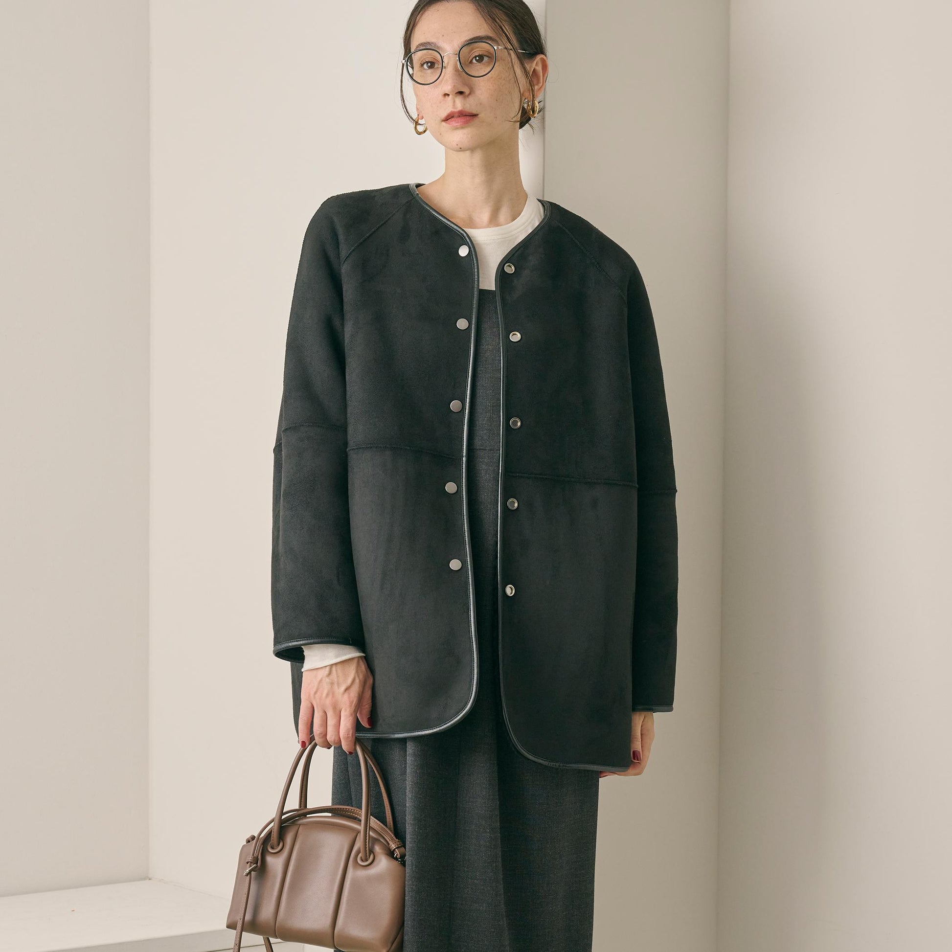 首元はノーカラーで仕上げ、ボリュームのあるシルエットに適度な抜け感をプラス。