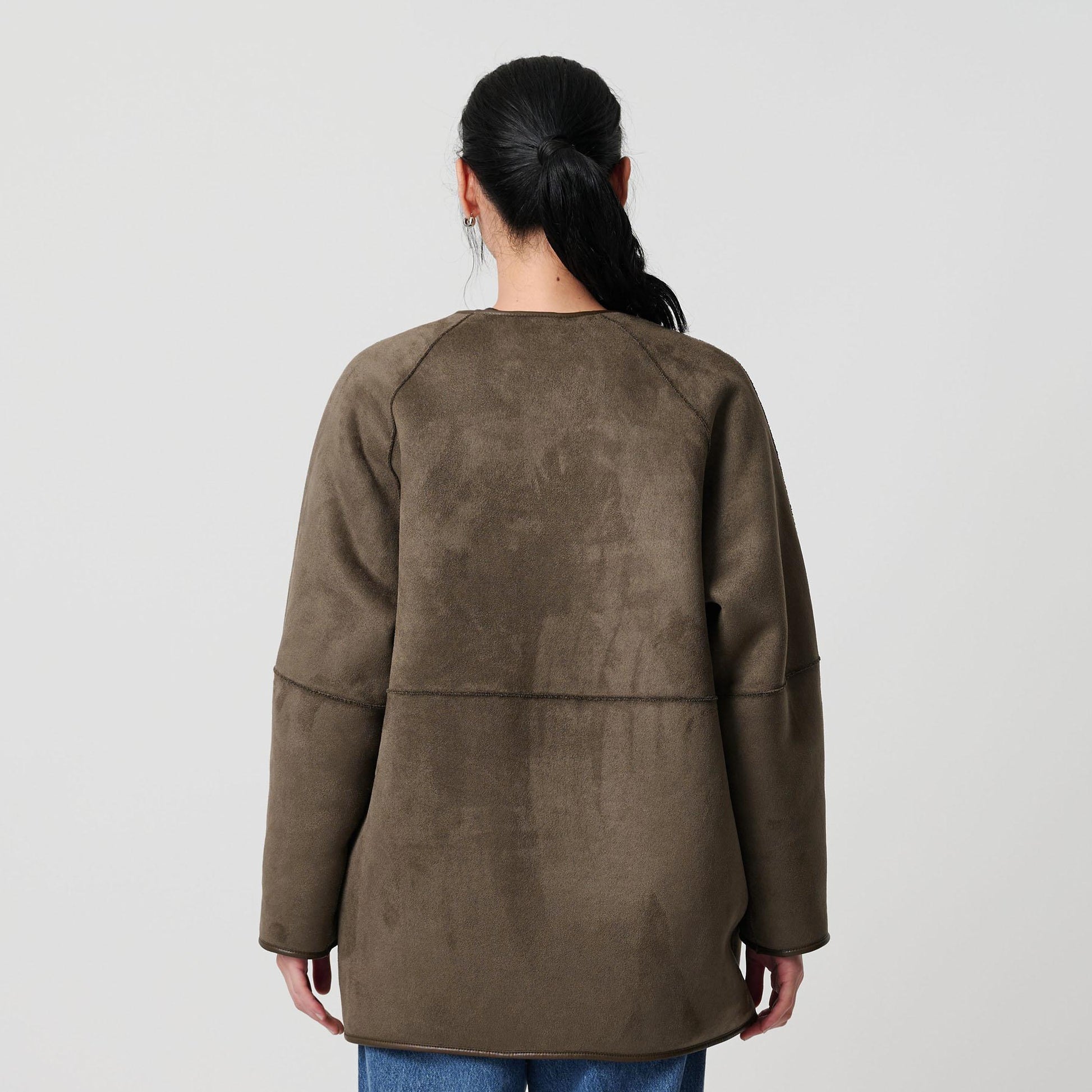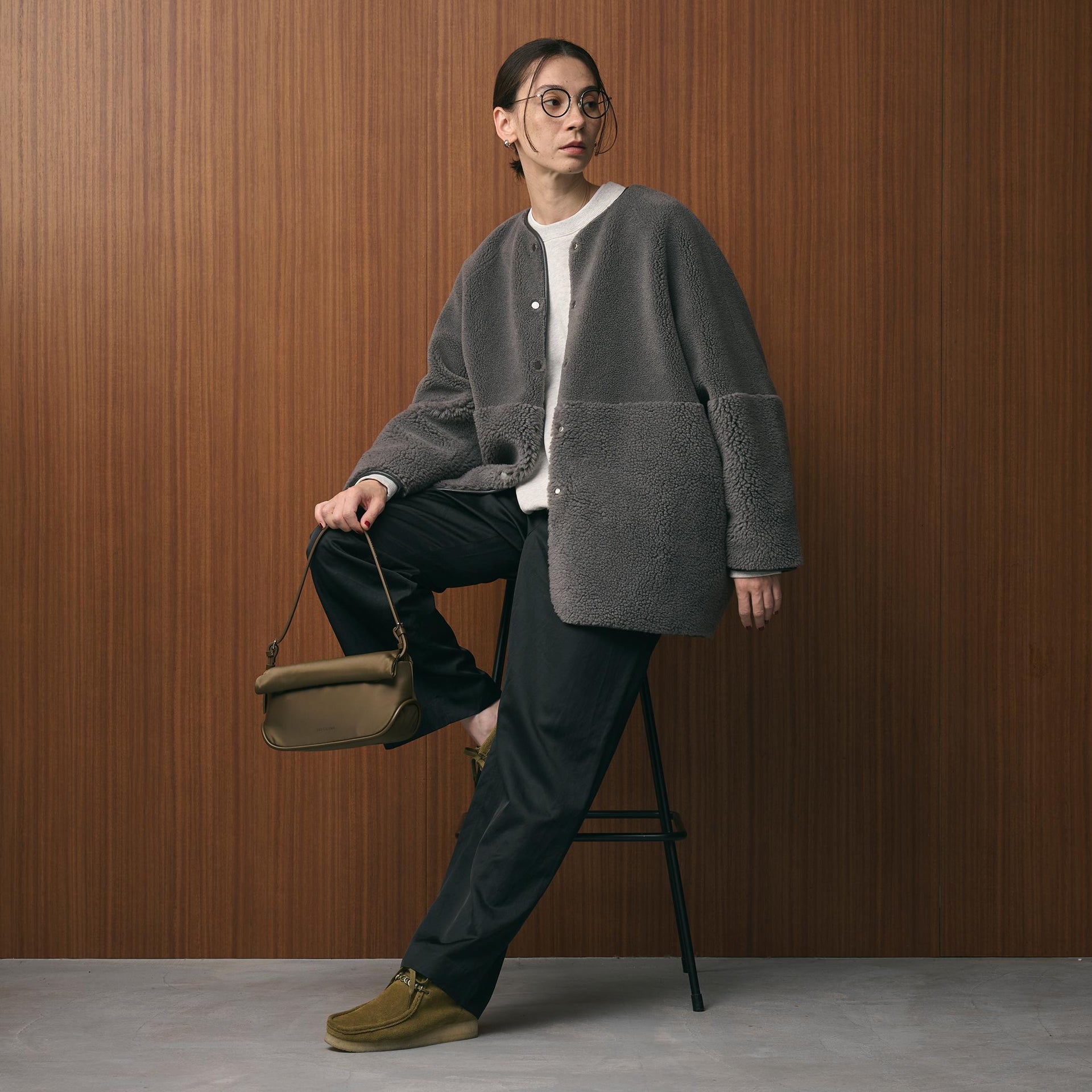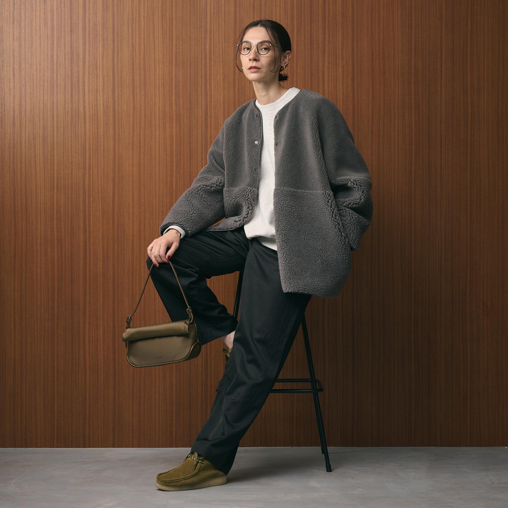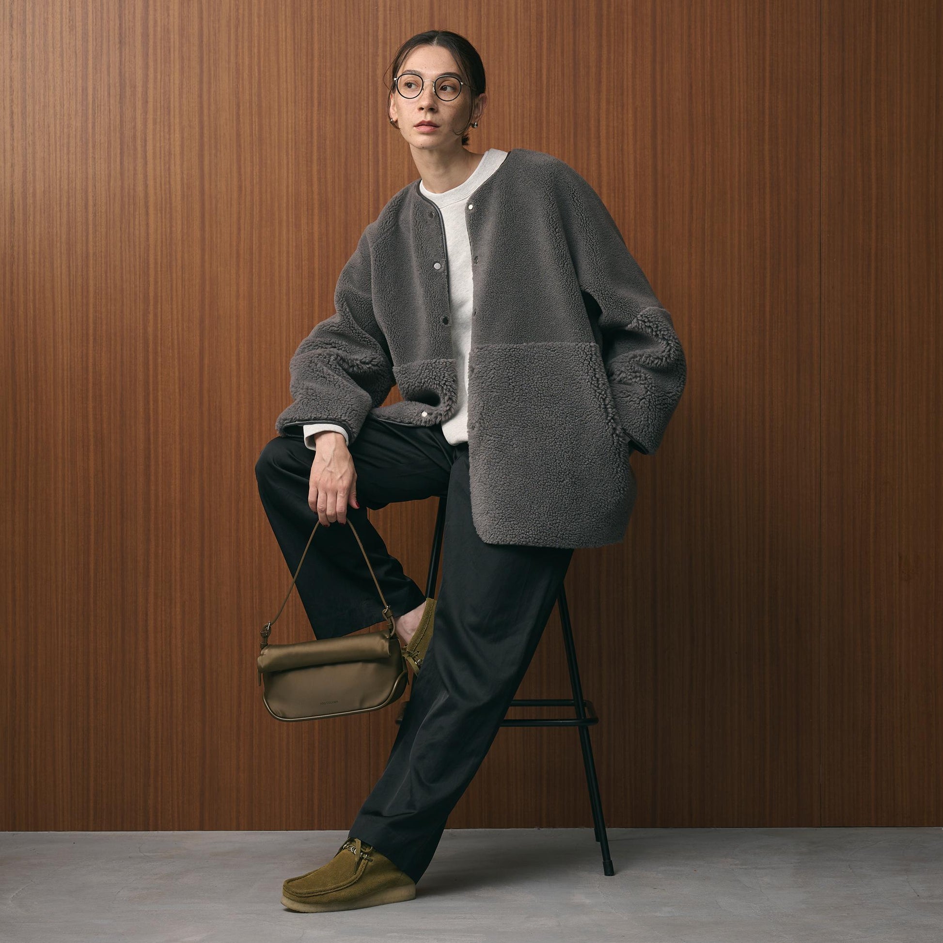 首元はノーカラーで仕上げ、ボリュームのあるシルエットに適度な抜け感をプラス。