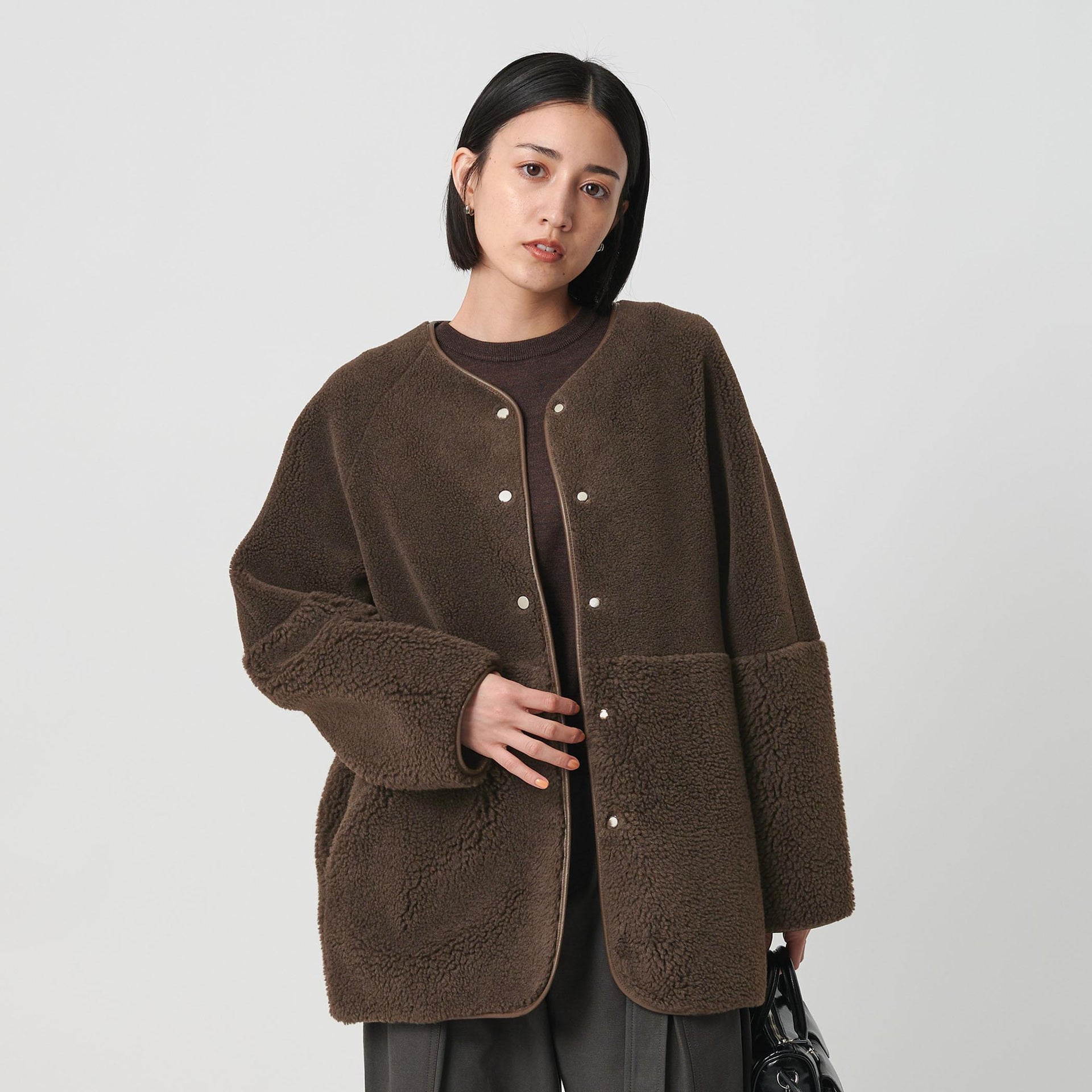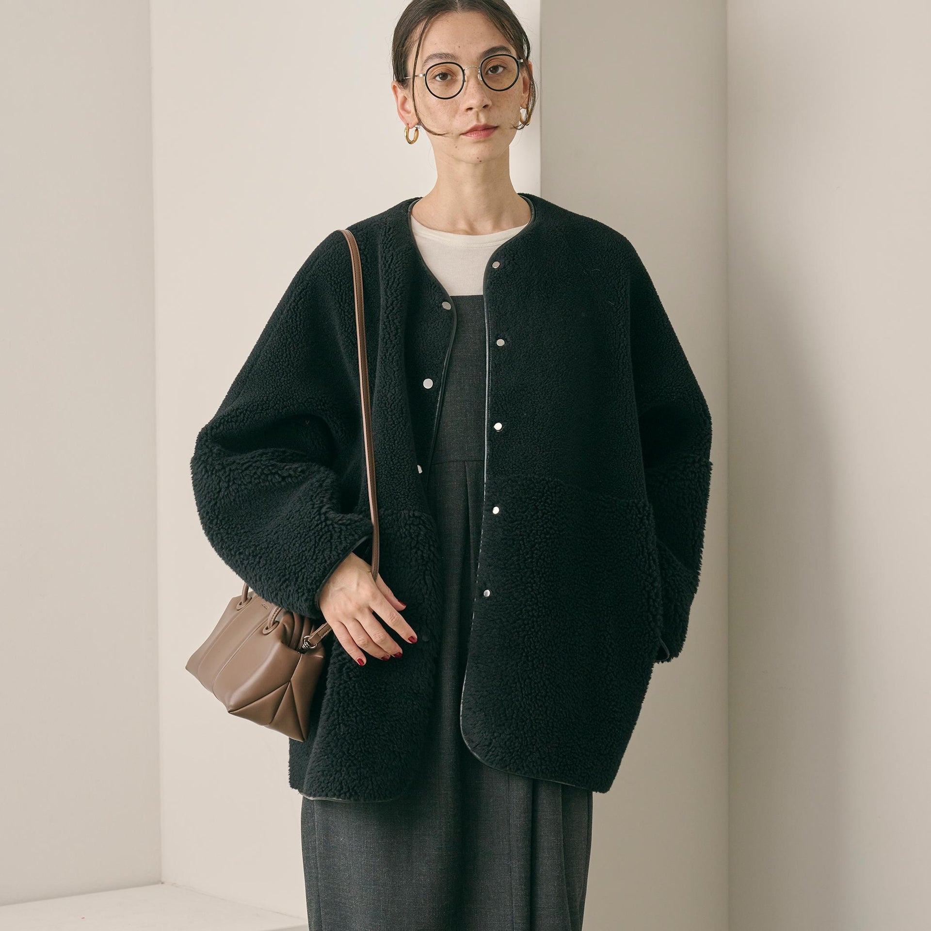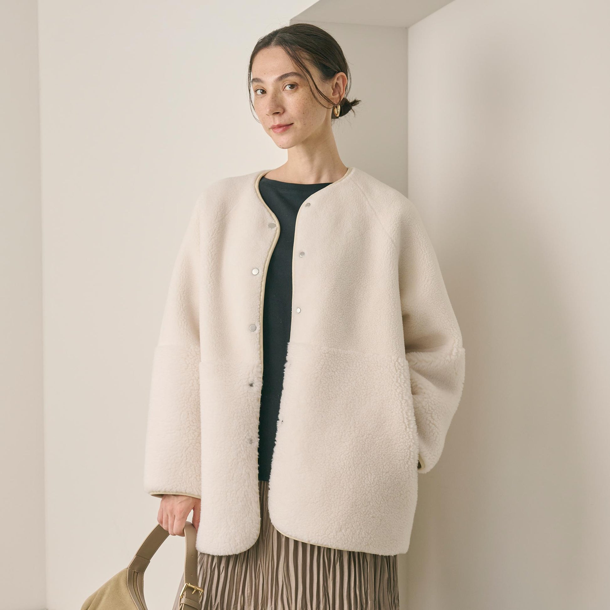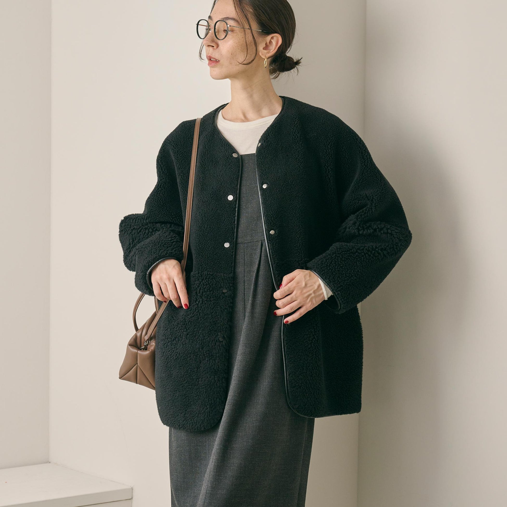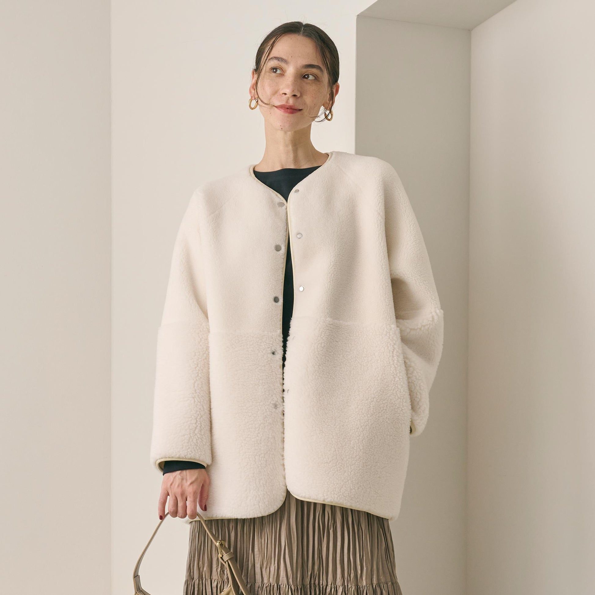 ゆとりのあるサイジングやボアのふんわりとした素材感が見た目にも暖かく、華やかな印象に導きます。