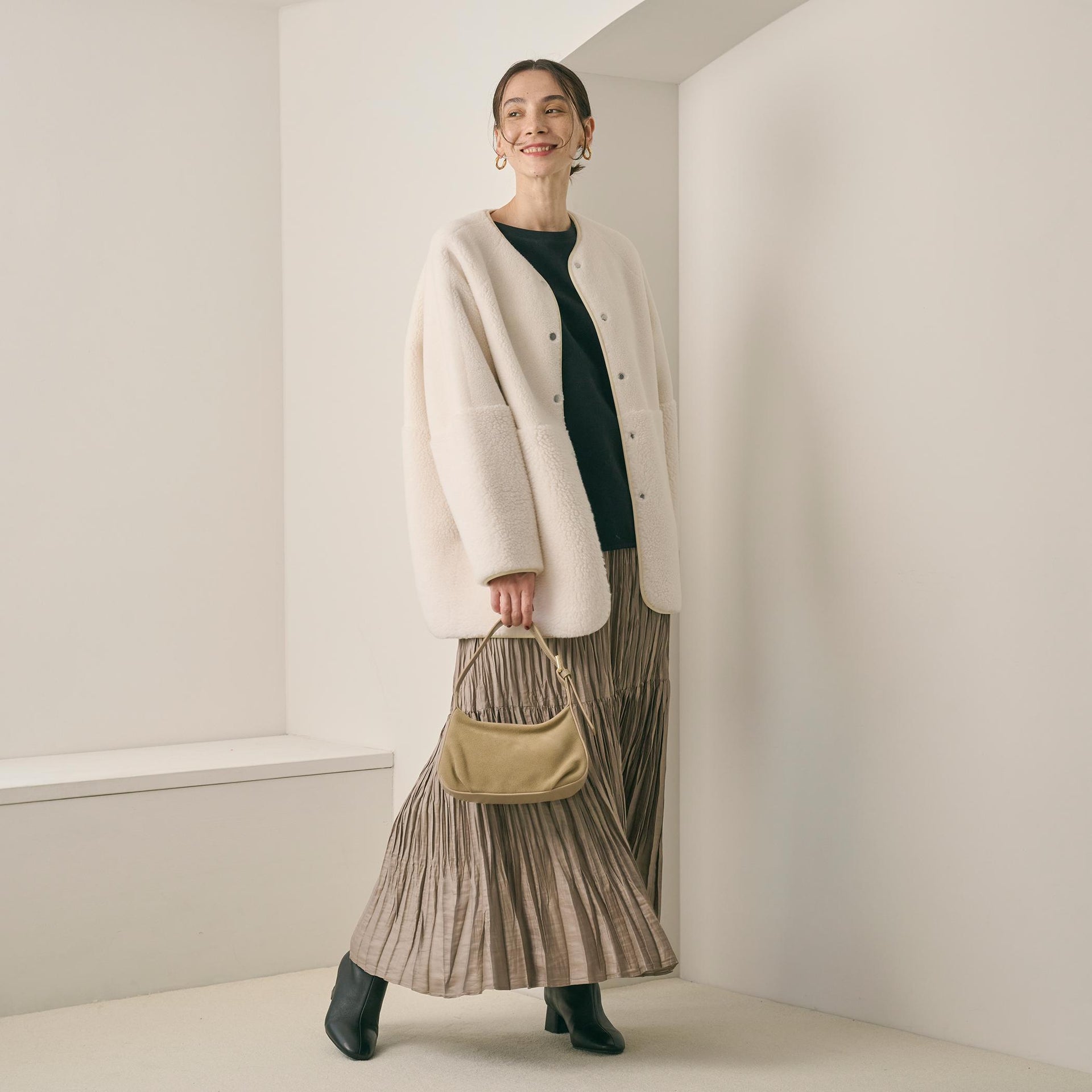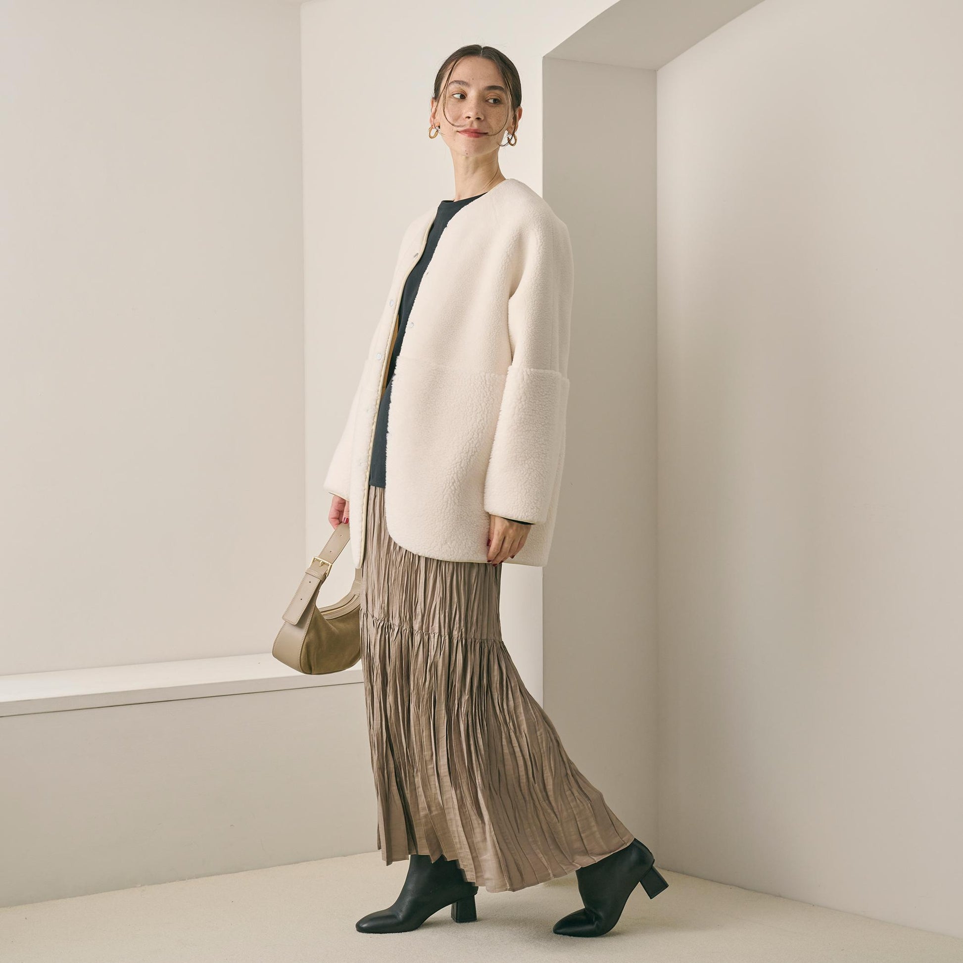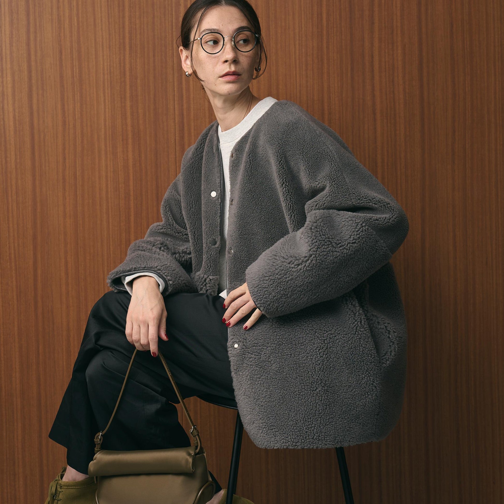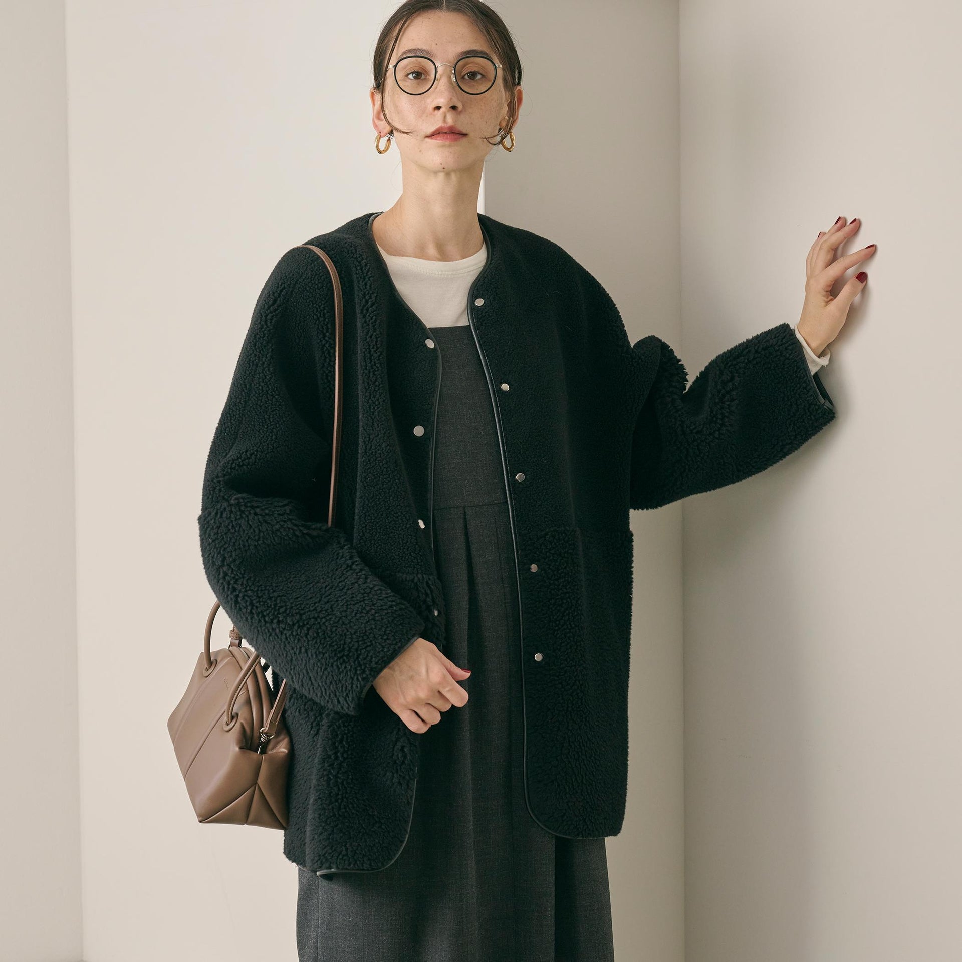 ゆとりのあるサイジングやボアのふんわりとした素材感が見た目にも暖かく、華やかな印象に導きます。