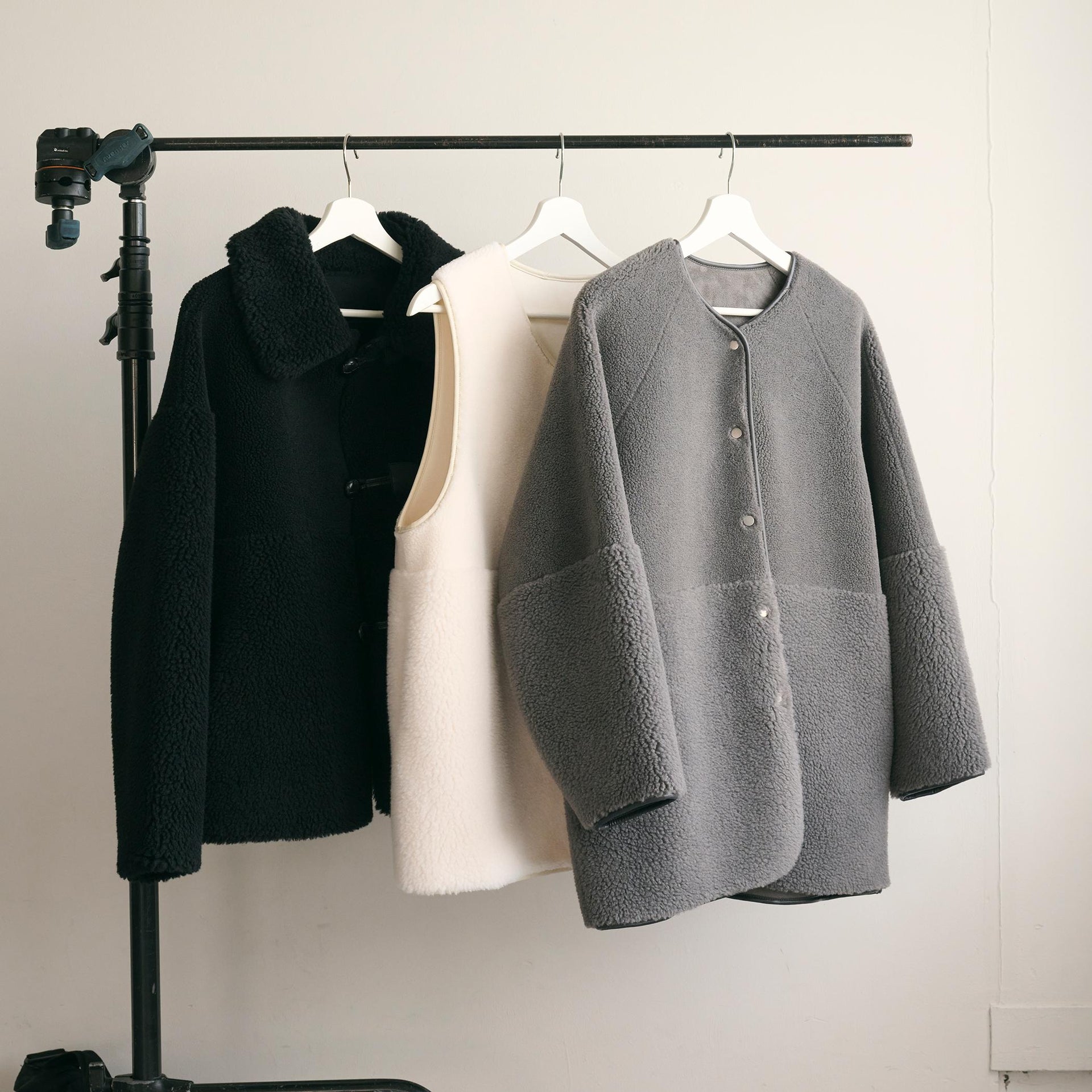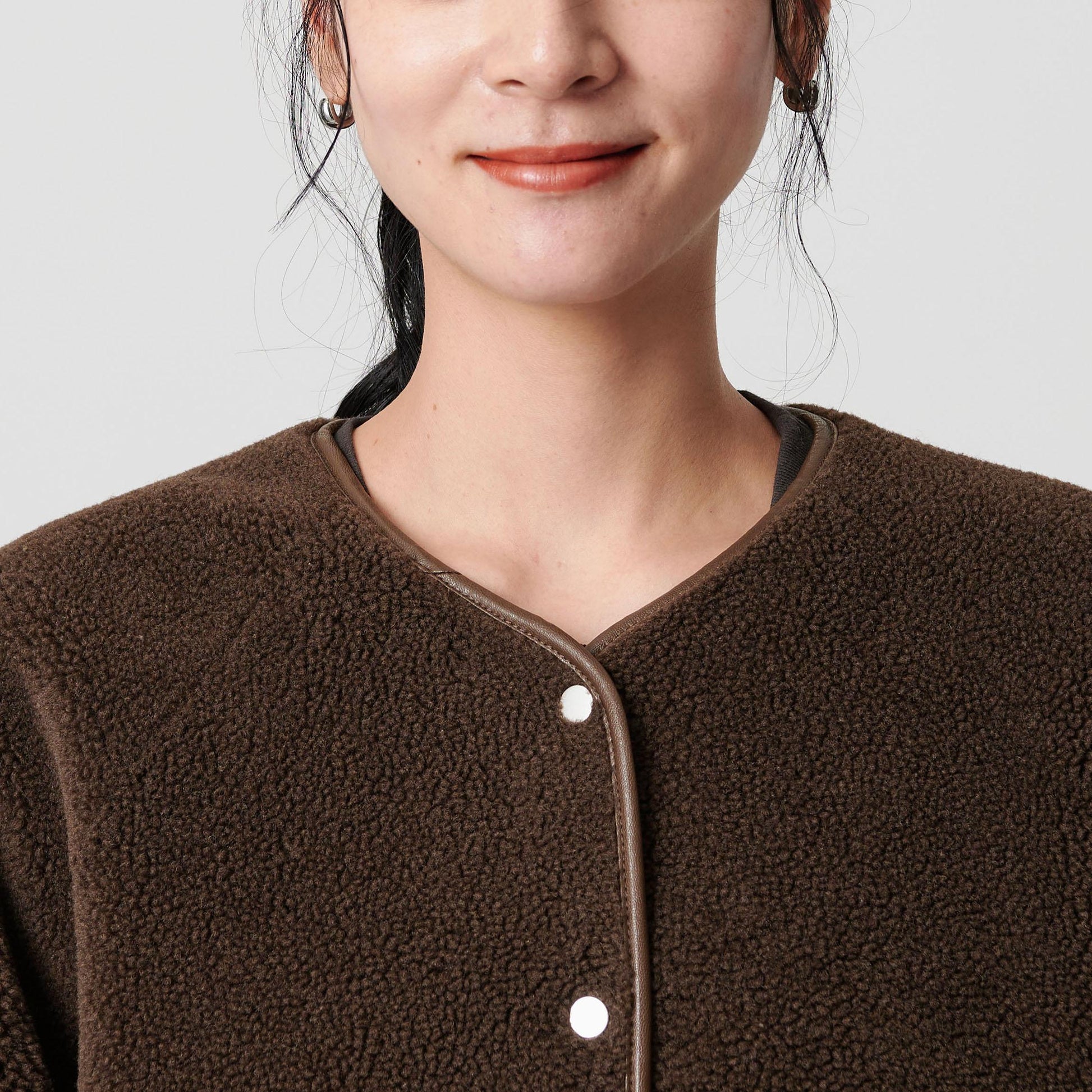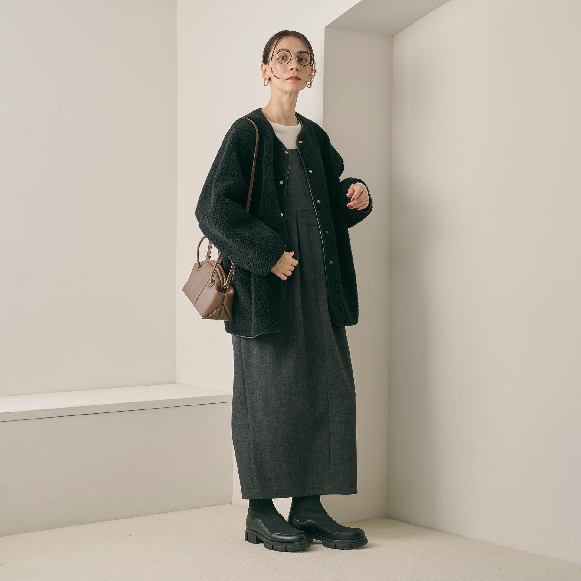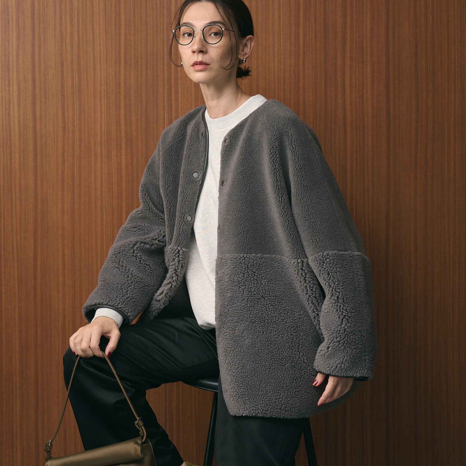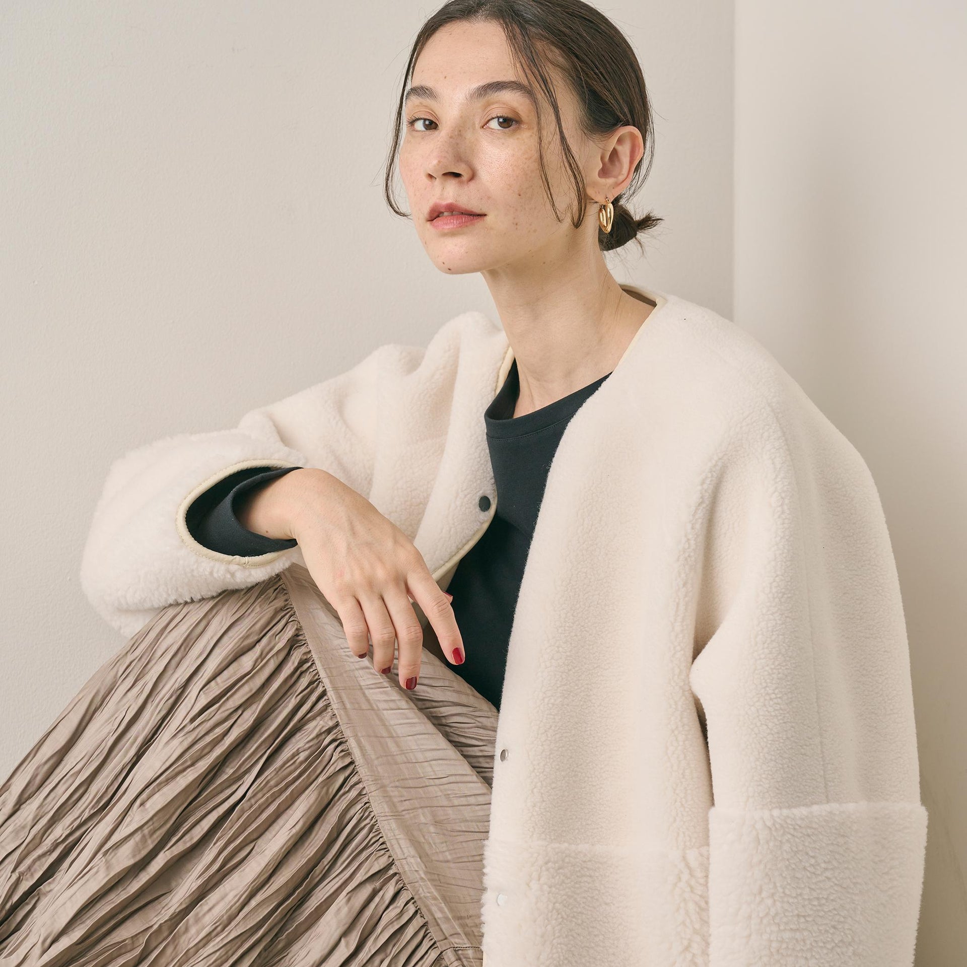 ゆとりのあるサイジングやボアのふんわりとした素材感が見た目にも暖かく、華やかな印象に導きます。