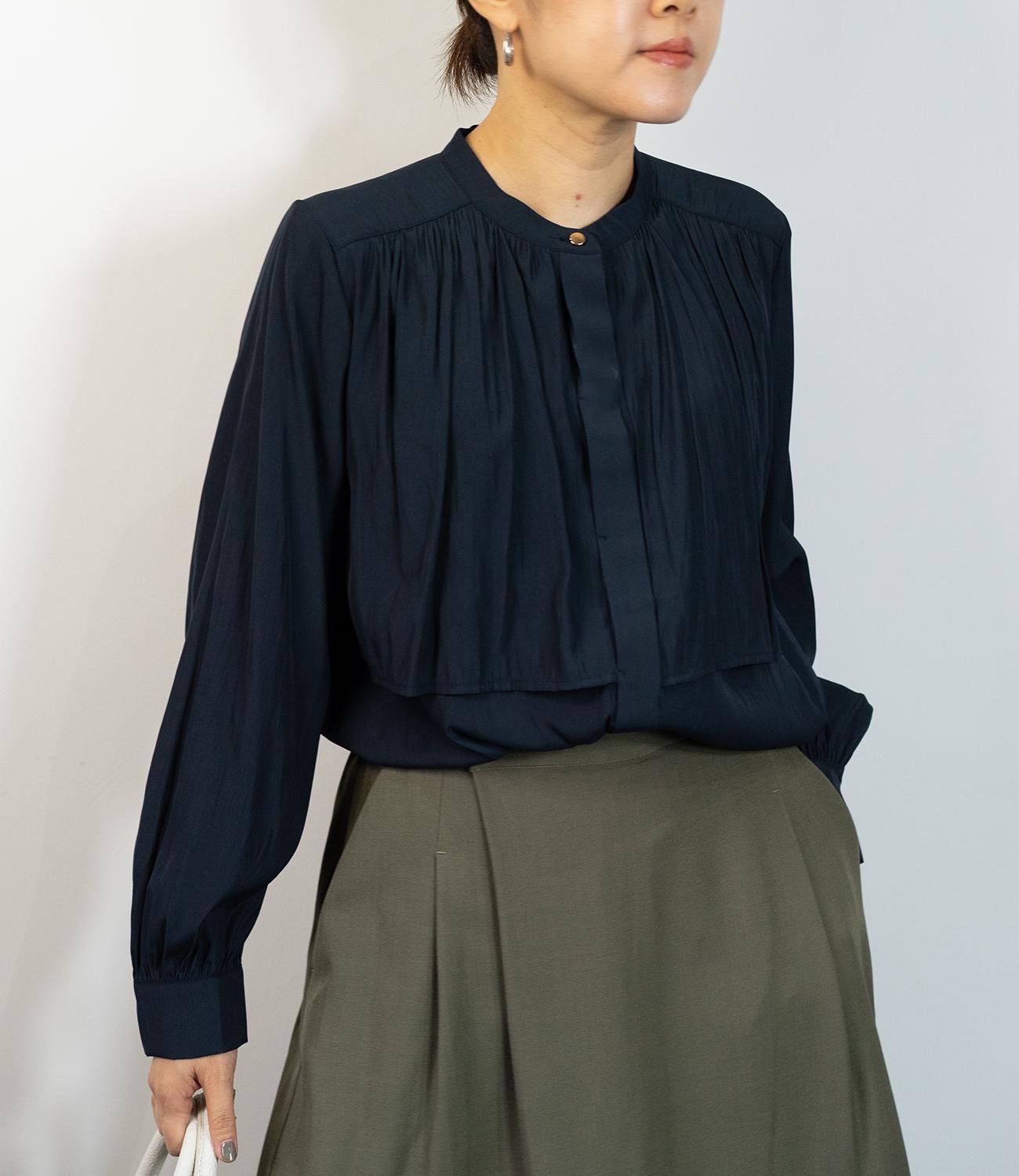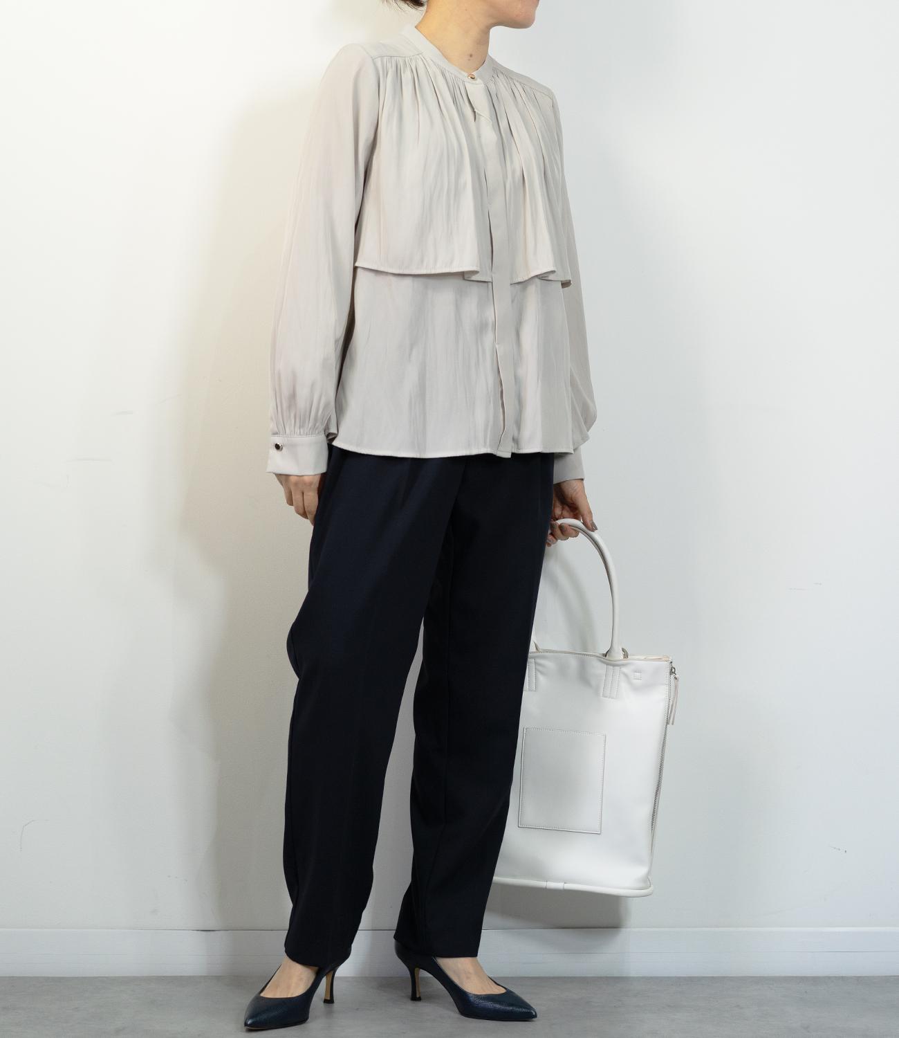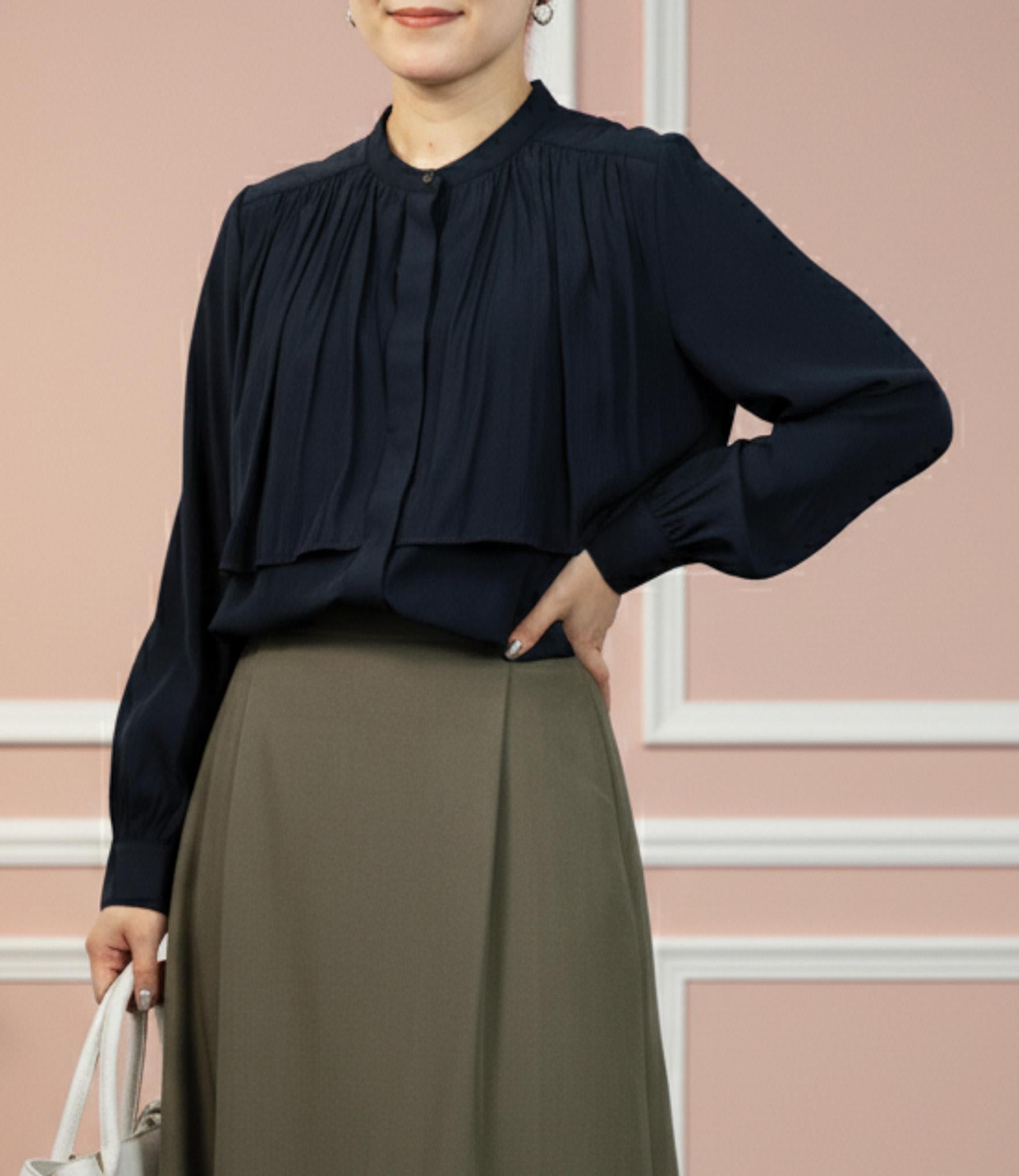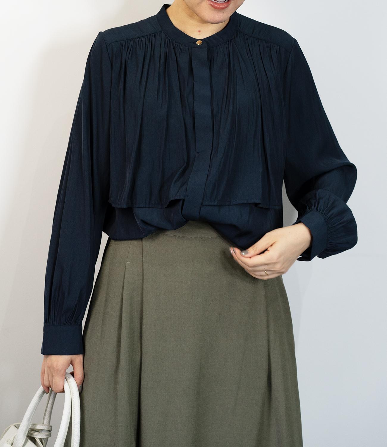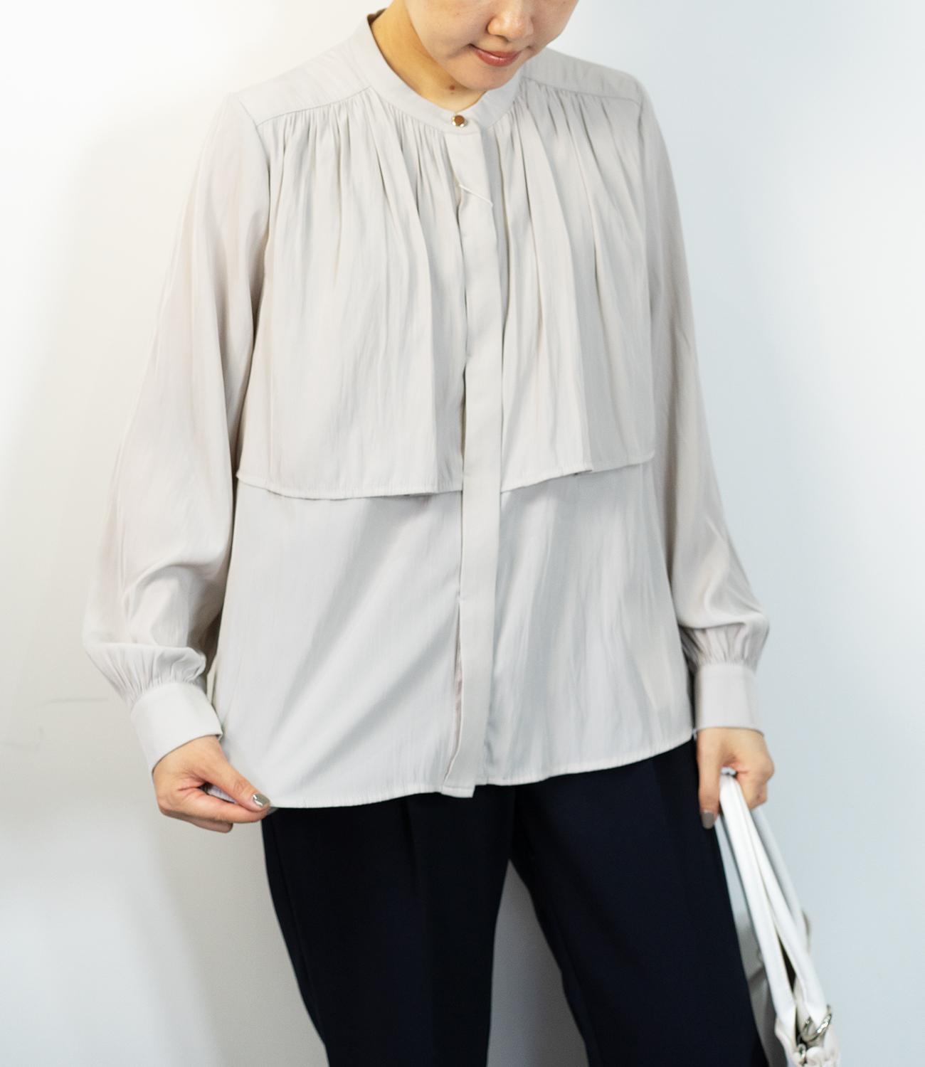 綺麗めスタイルに必須アイテム、バンドカラーブラウス。
