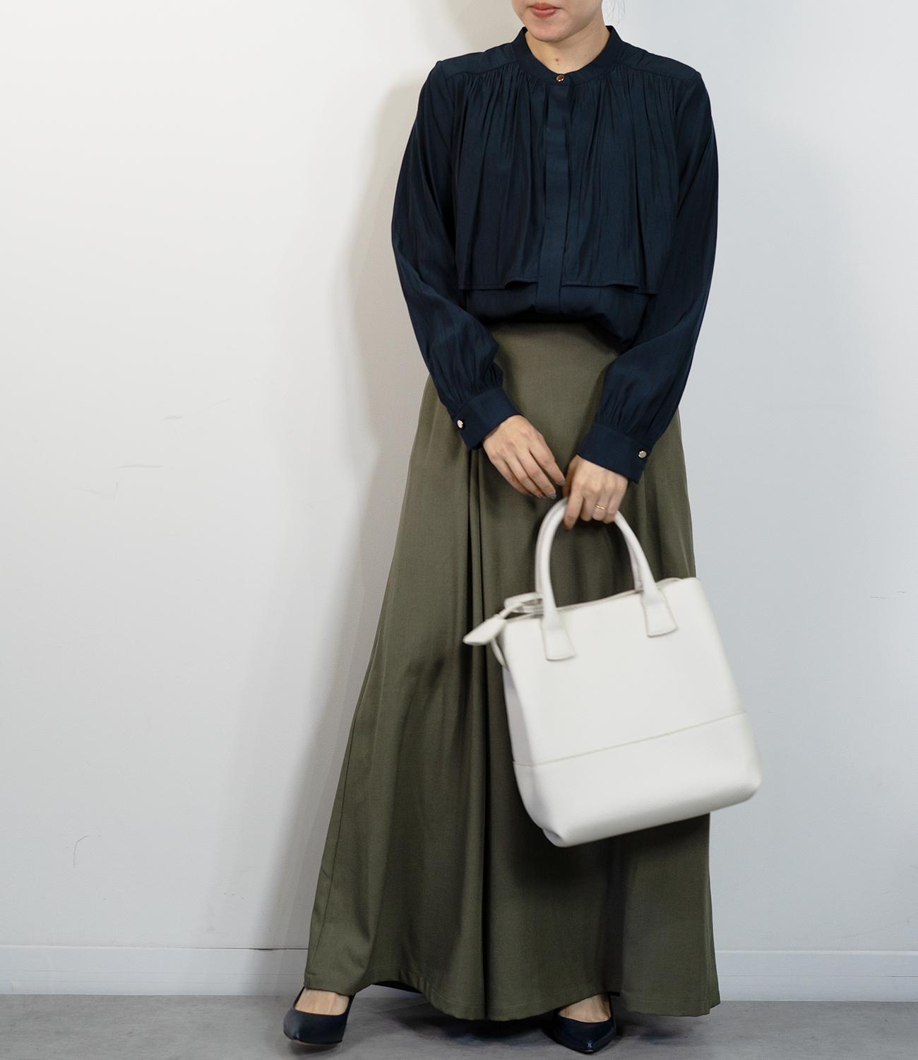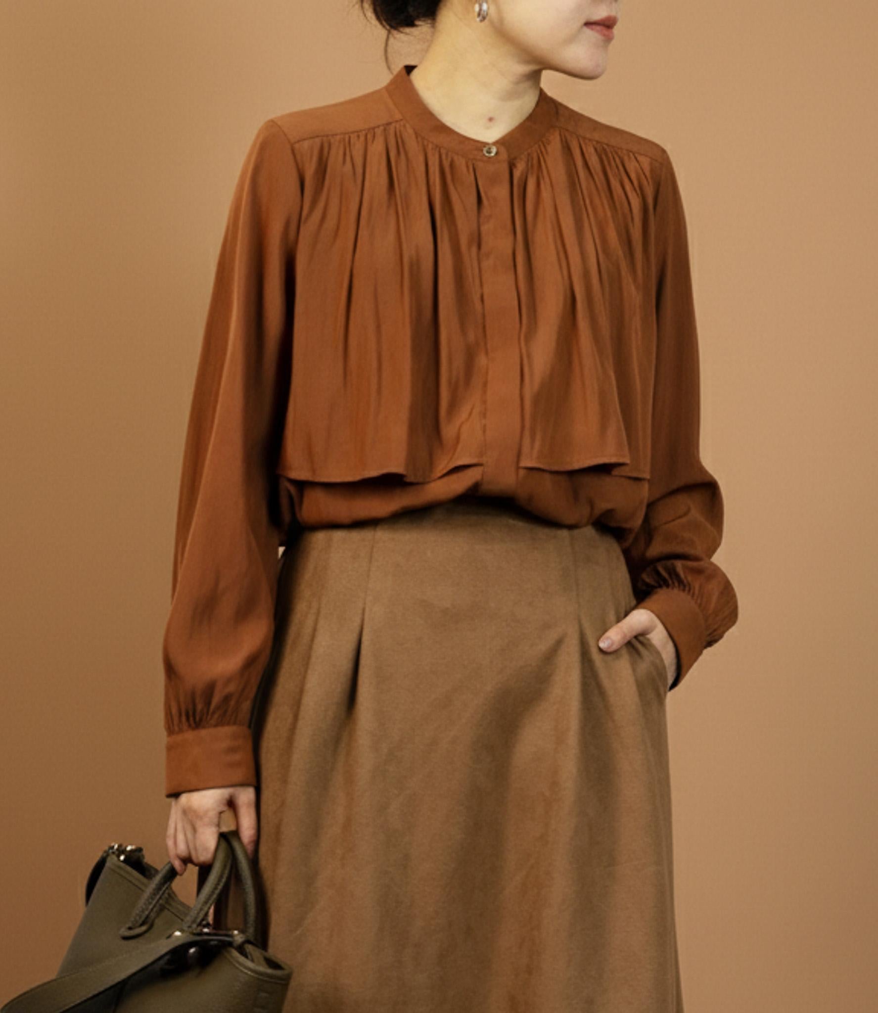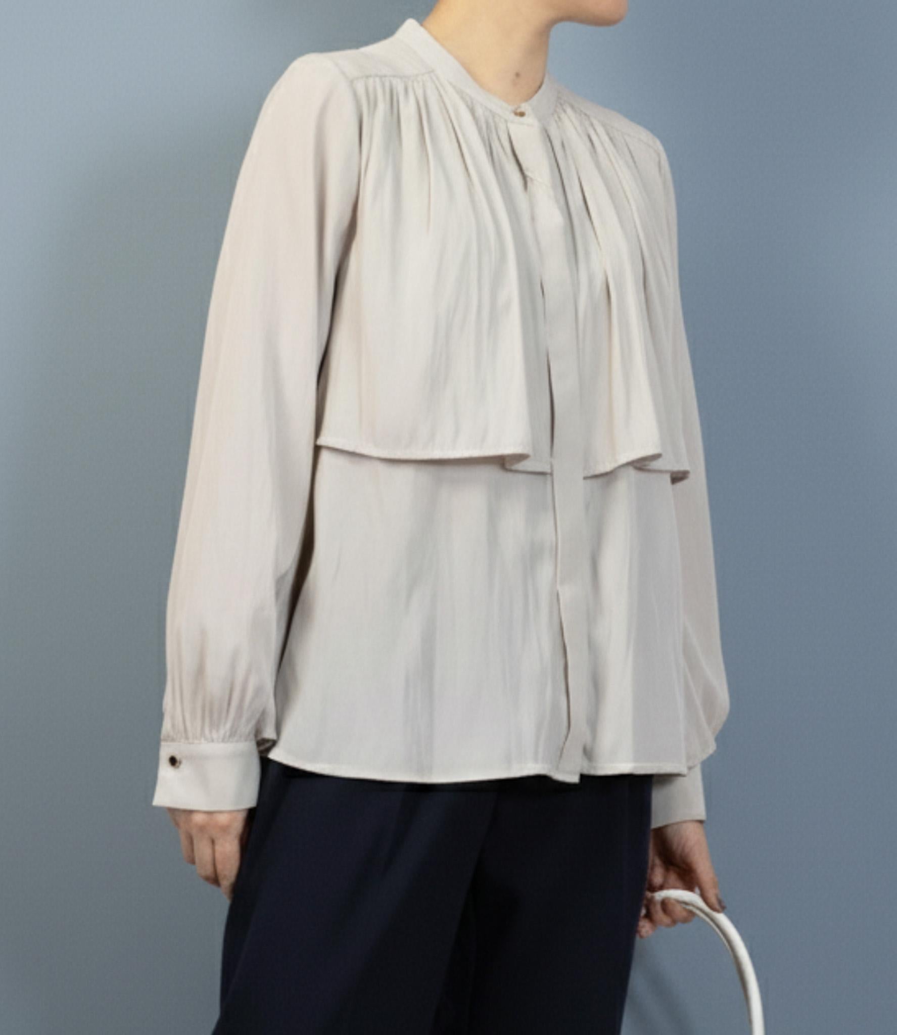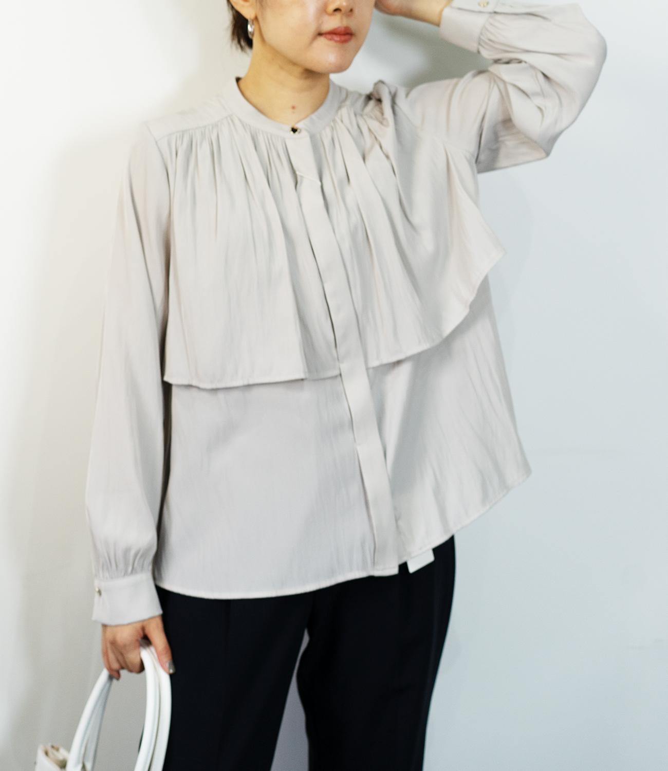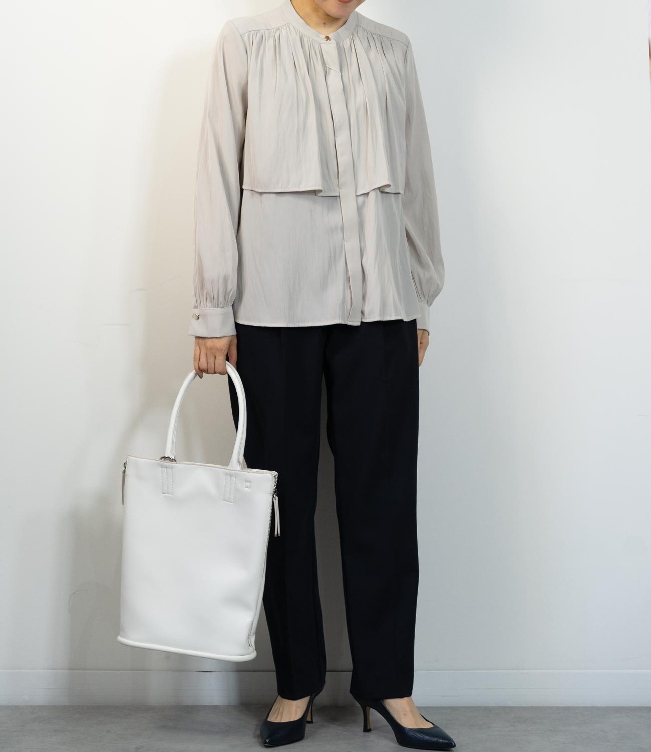 綺麗めスタイルに必須アイテム、バンドカラーブラウス。