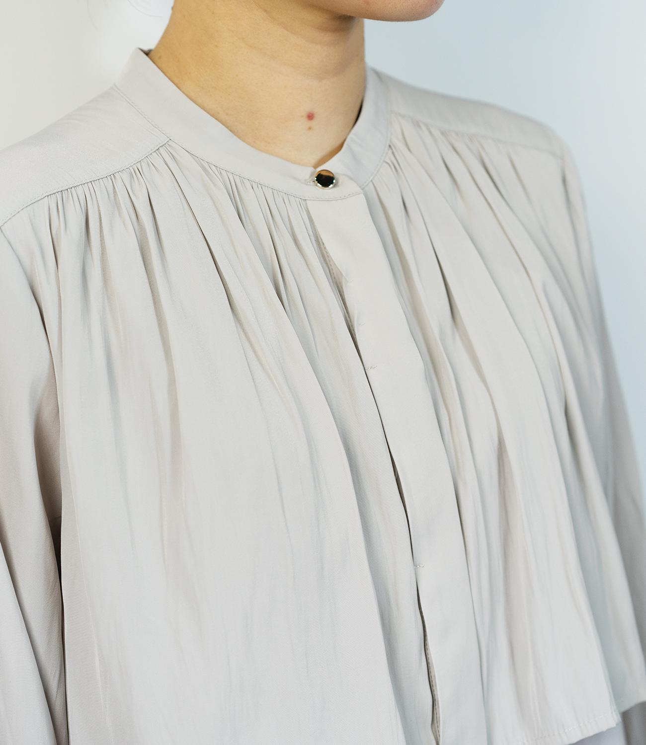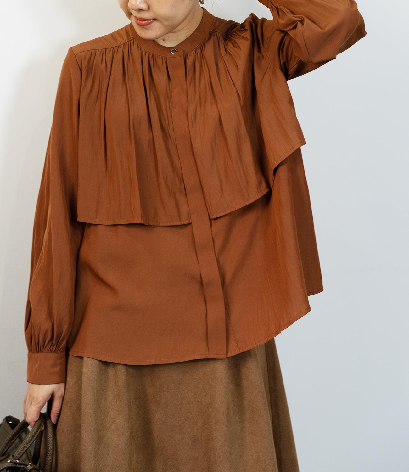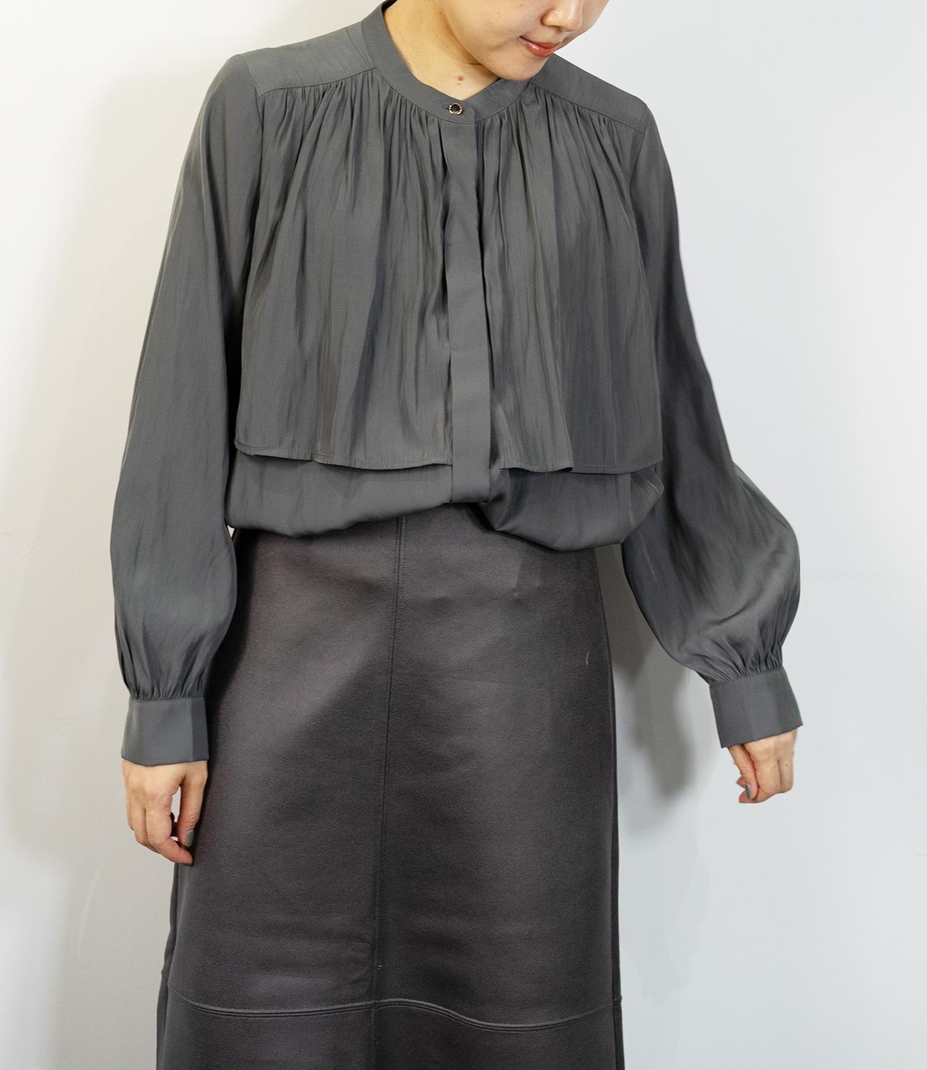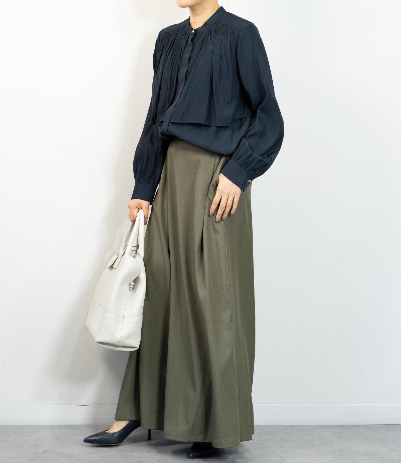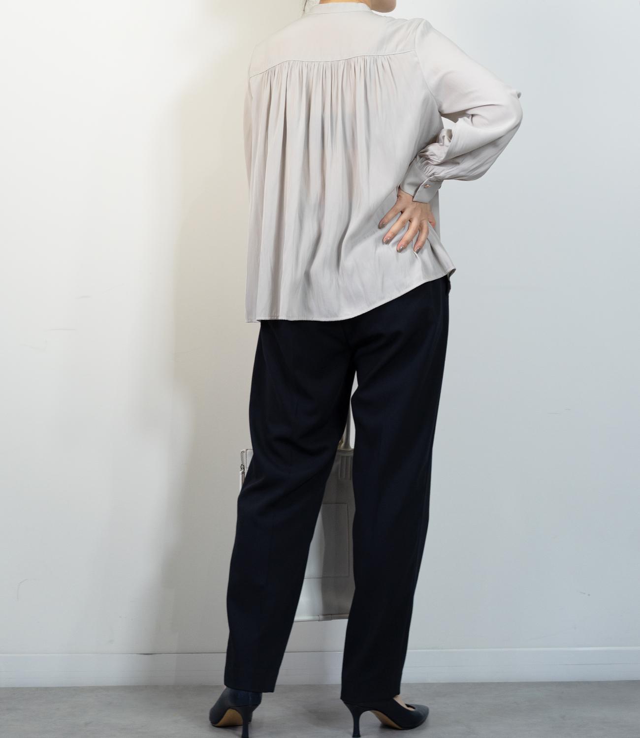 綺麗めスタイルに必須アイテム、バンドカラーブラウス。