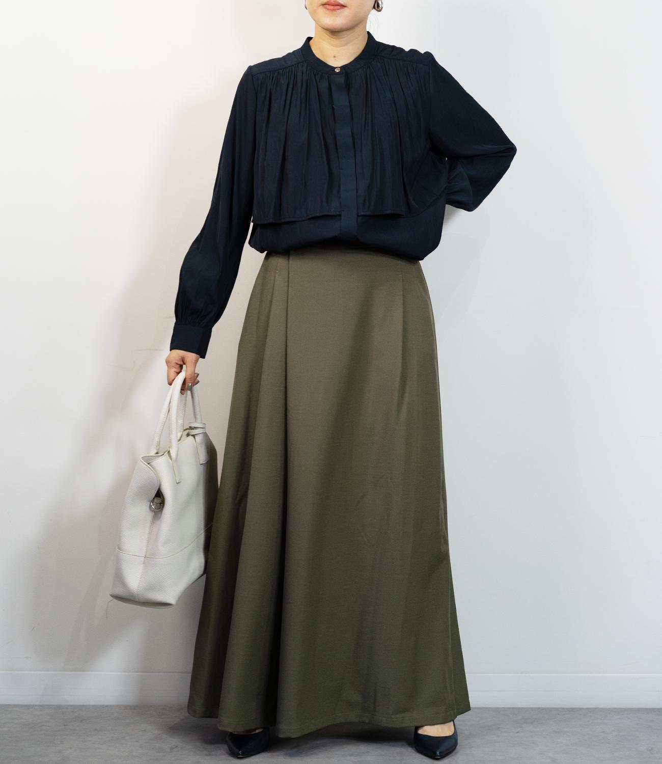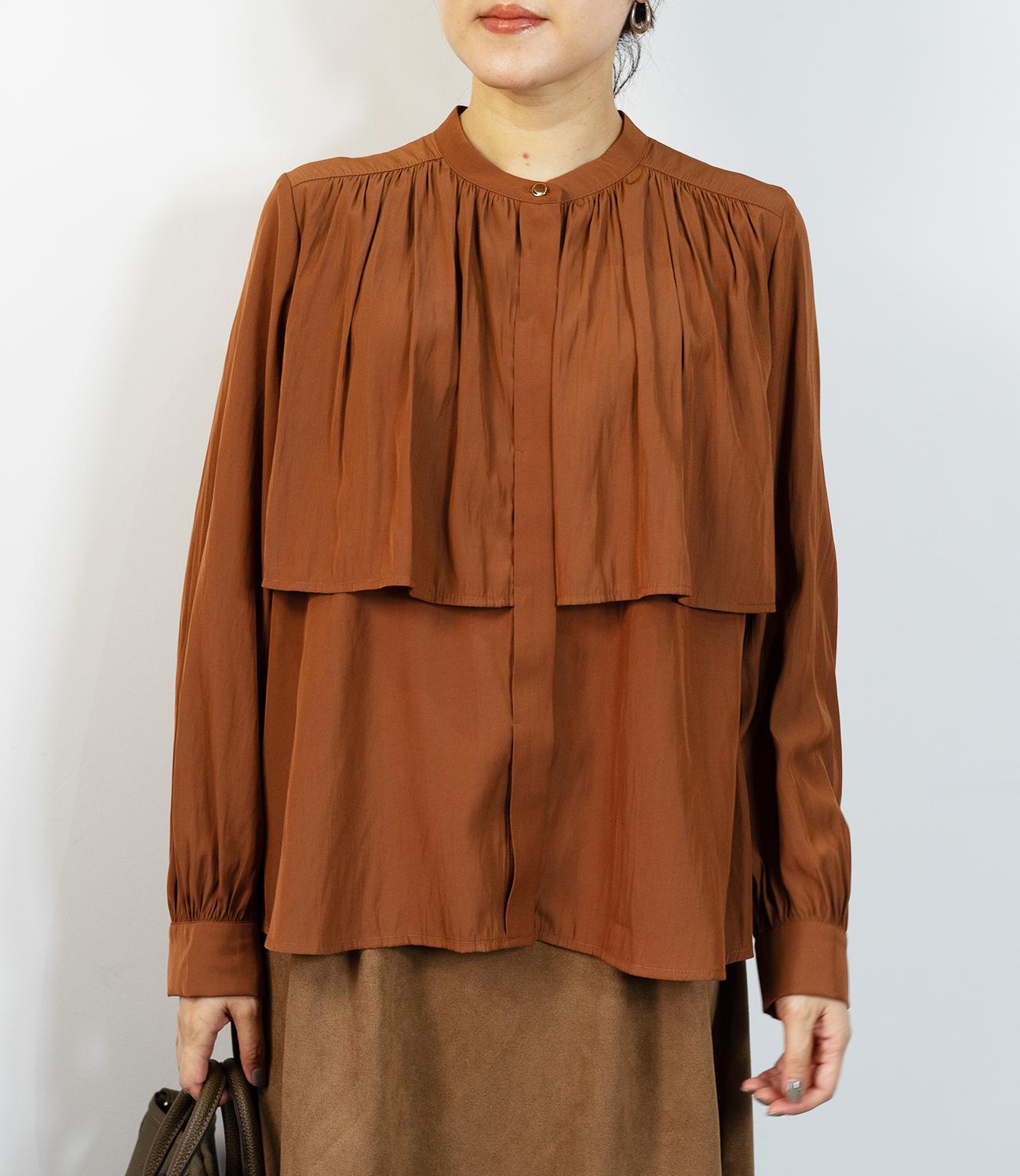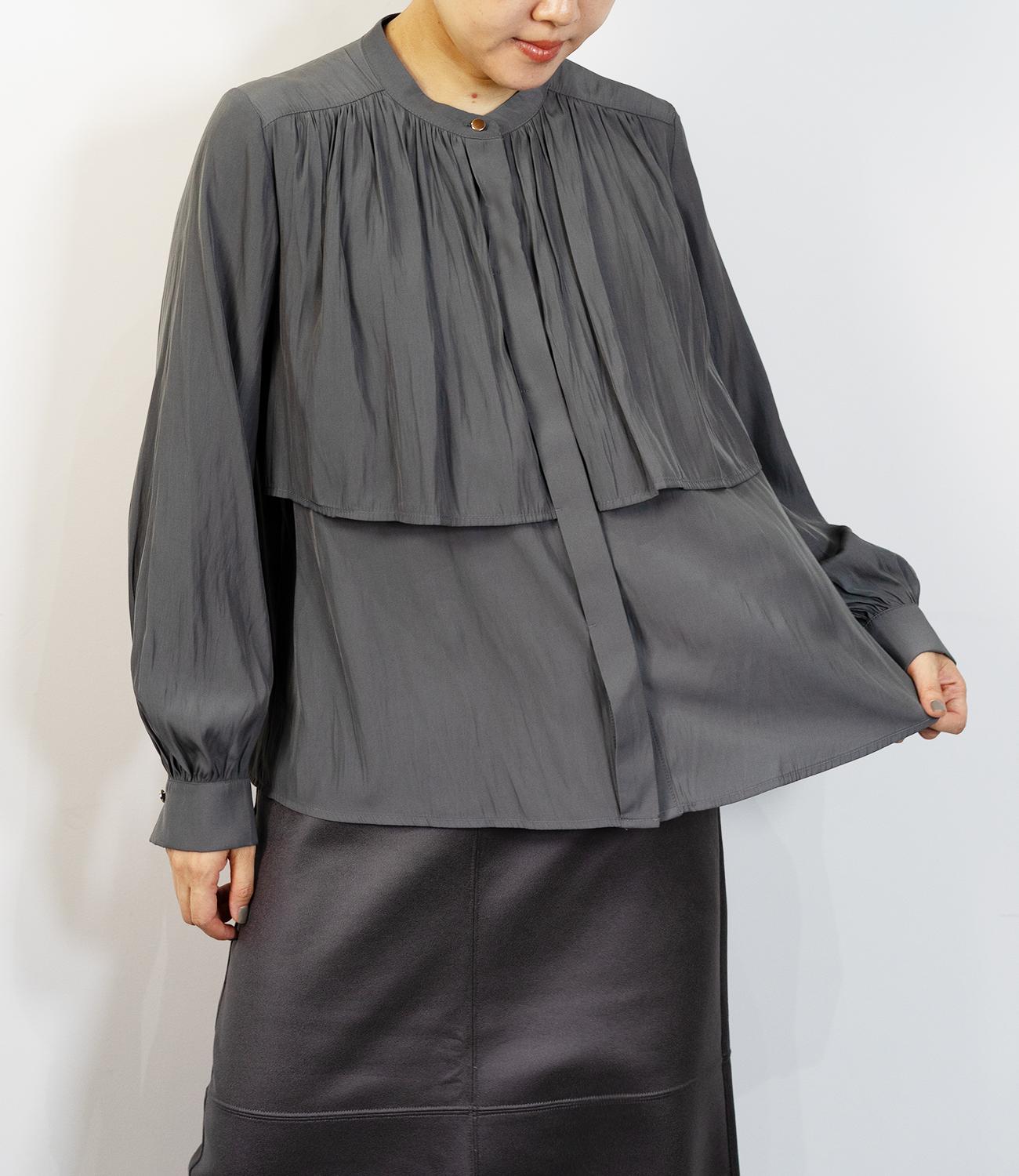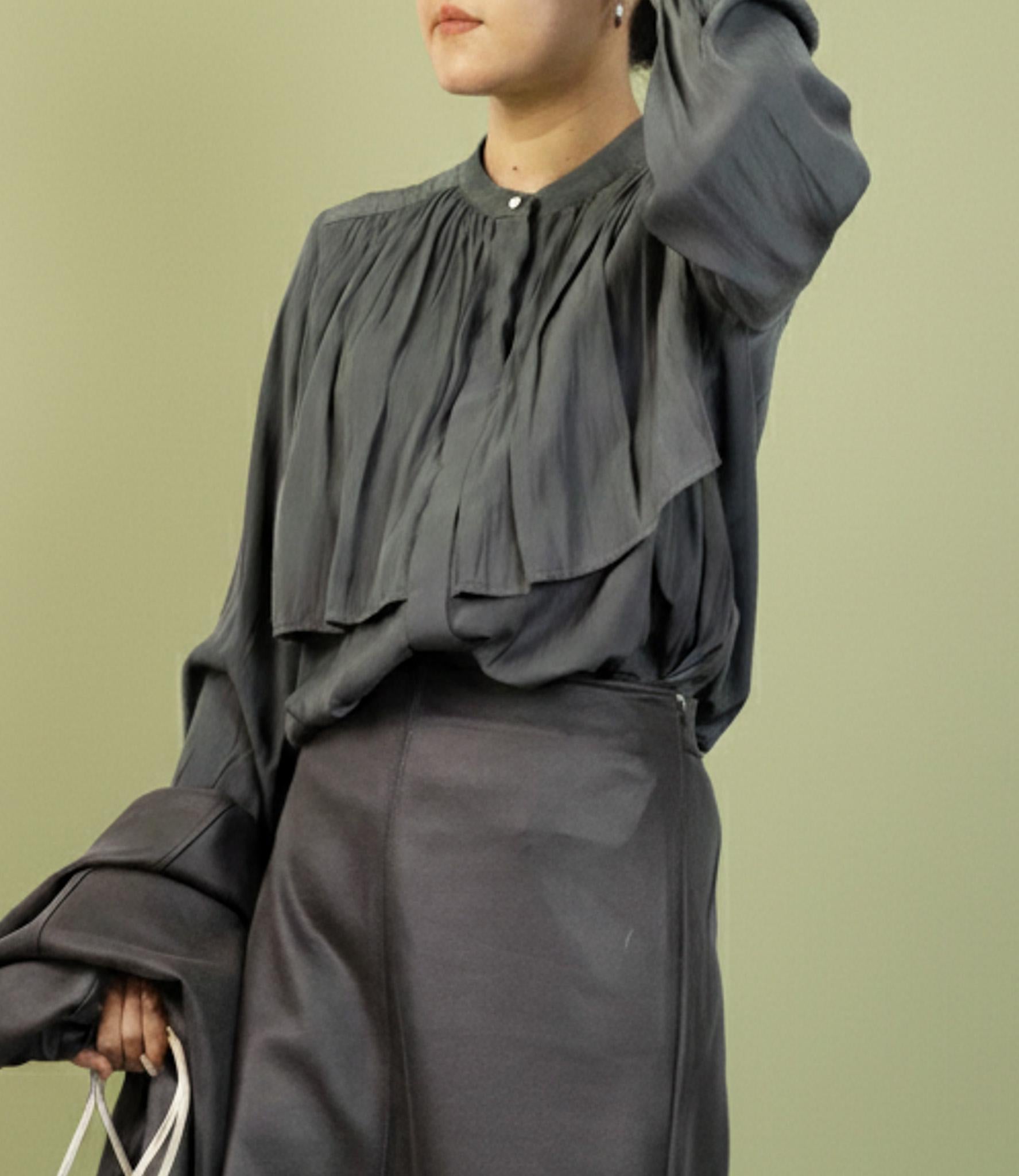 綺麗めスタイルに必須アイテム、バンドカラーブラウス。