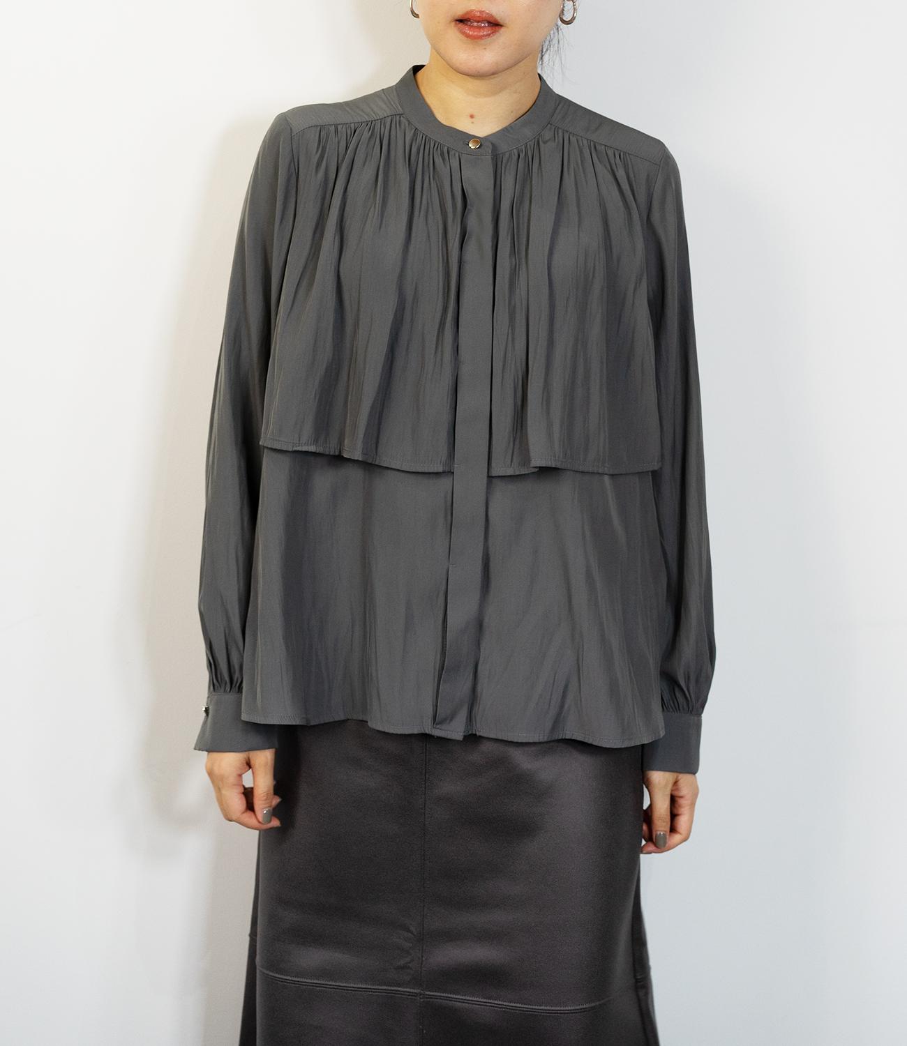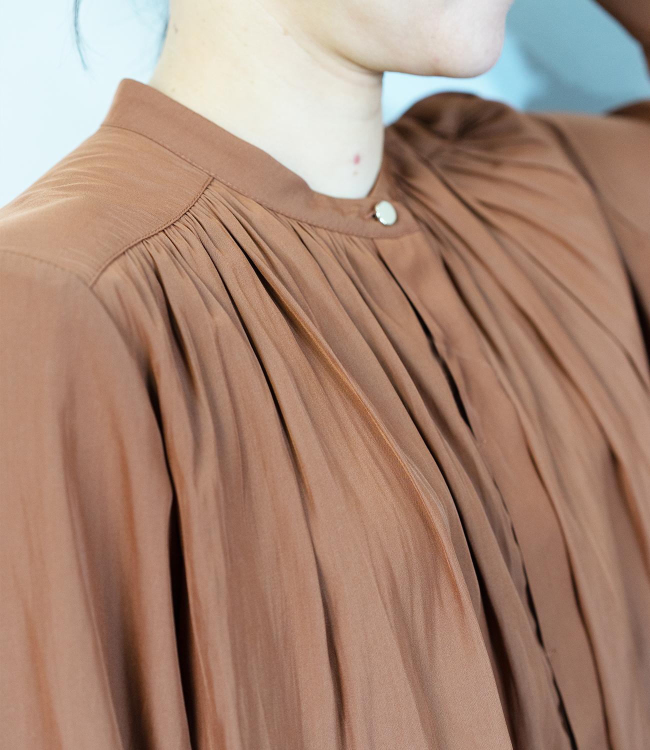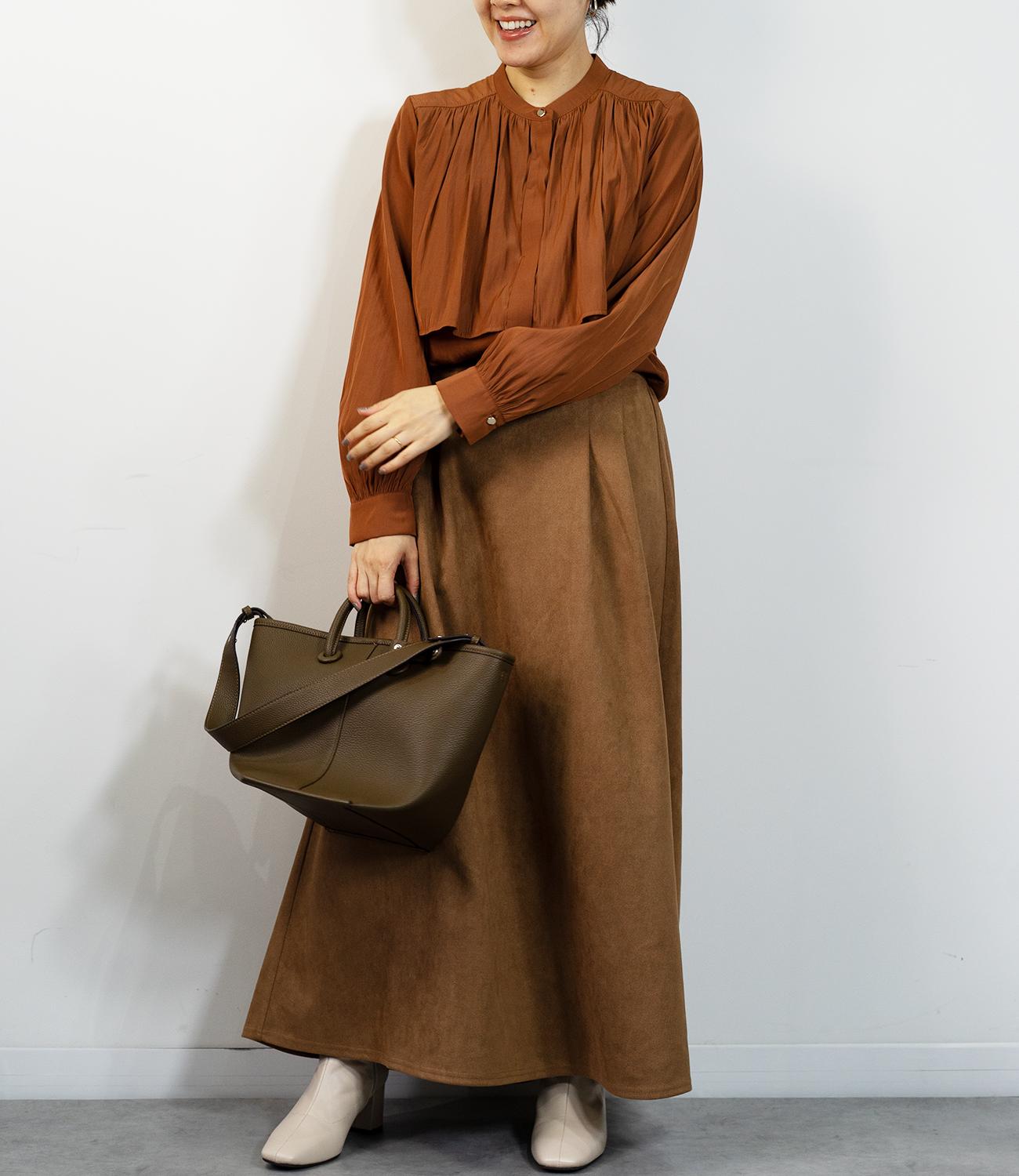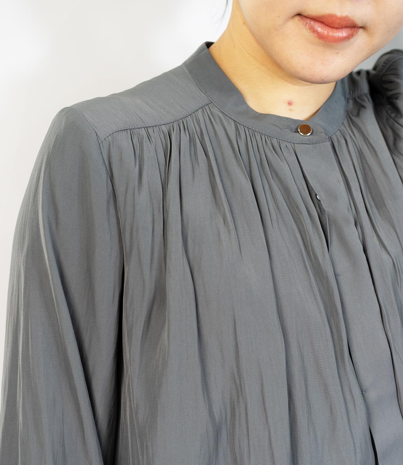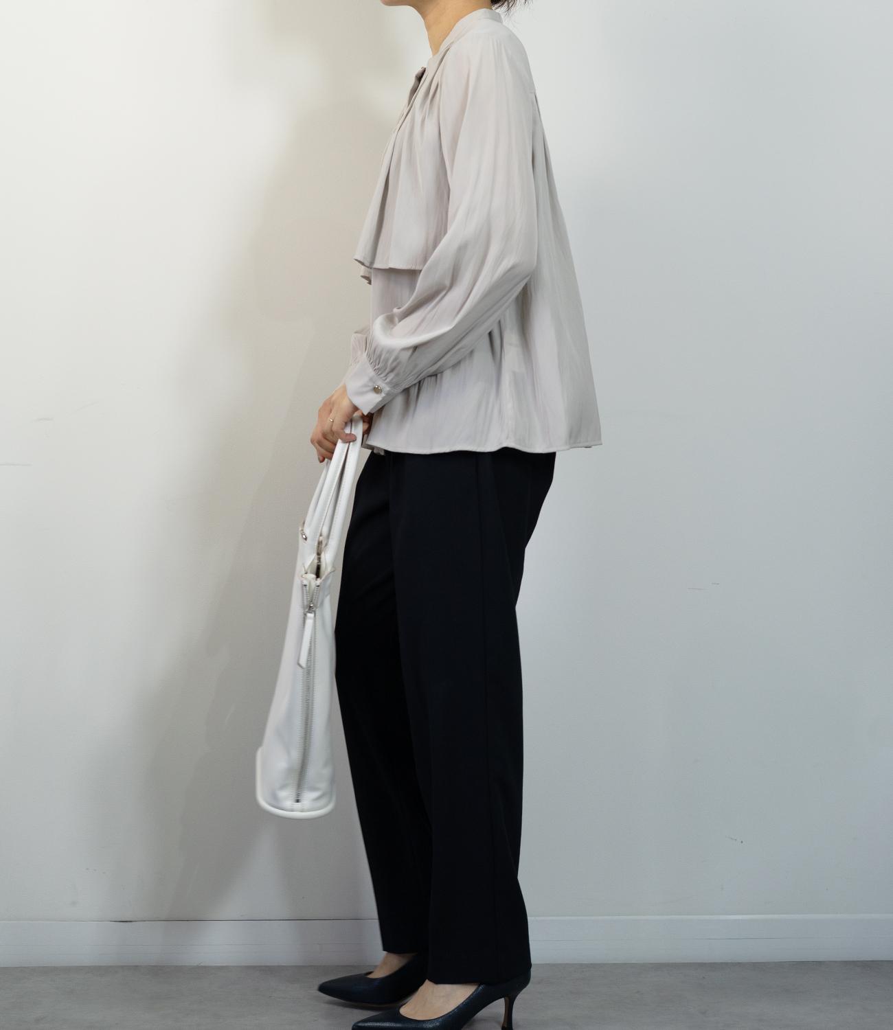 綺麗めスタイルに必須アイテム、バンドカラーブラウス。