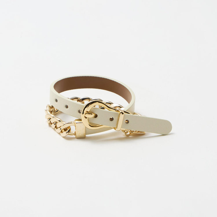 ベルトディテールを加えたレザーに、メタルチェーンの輝きが映える新鮮な一品。