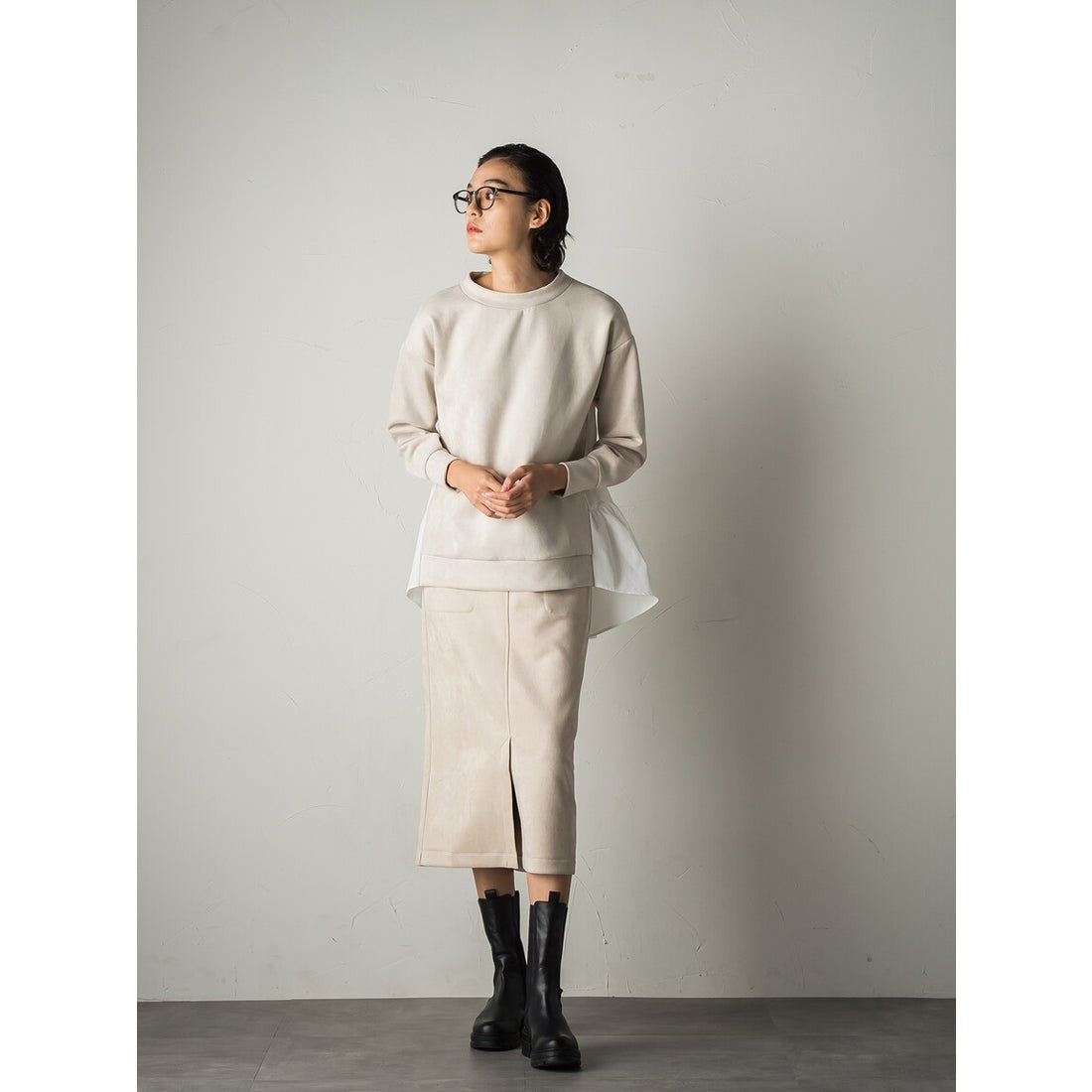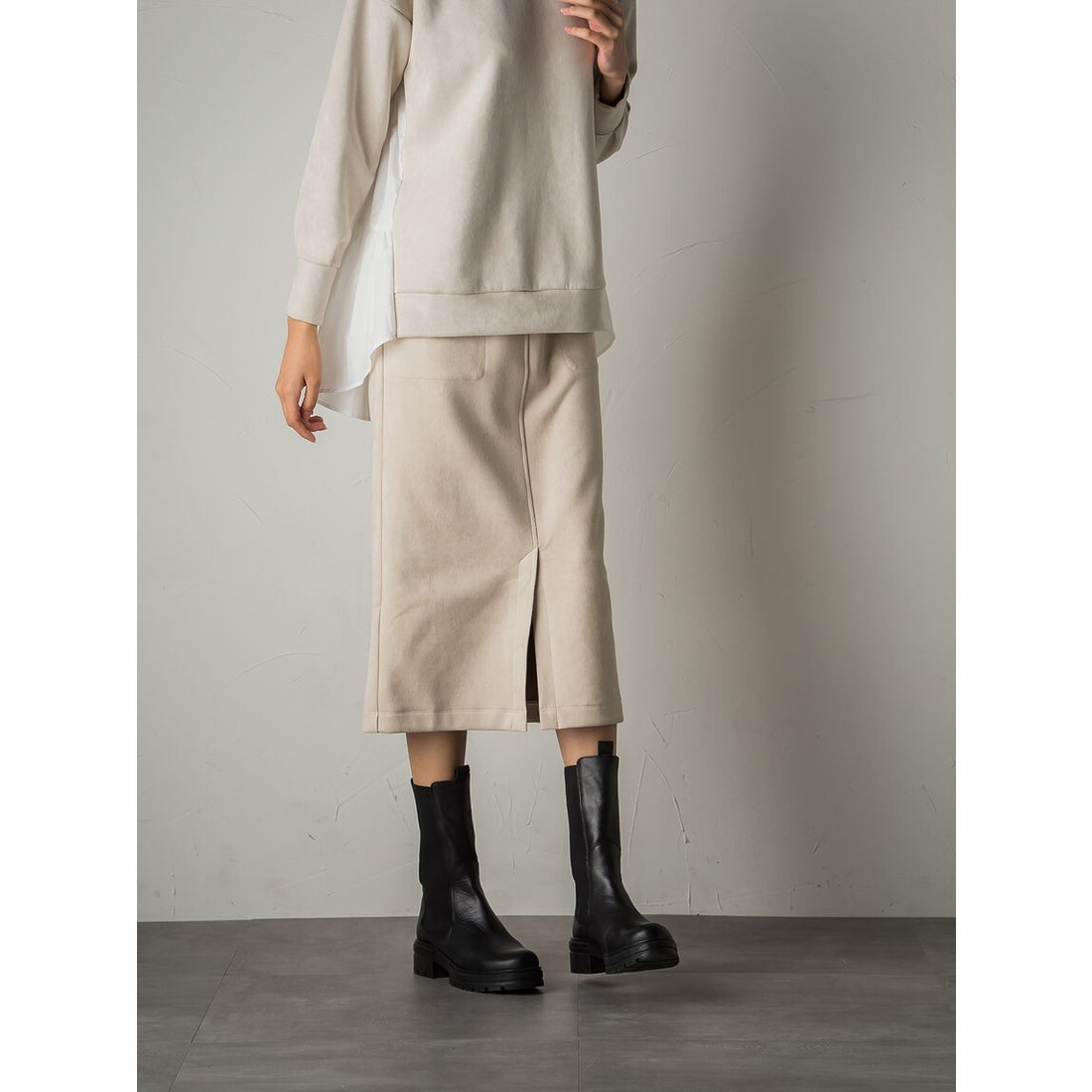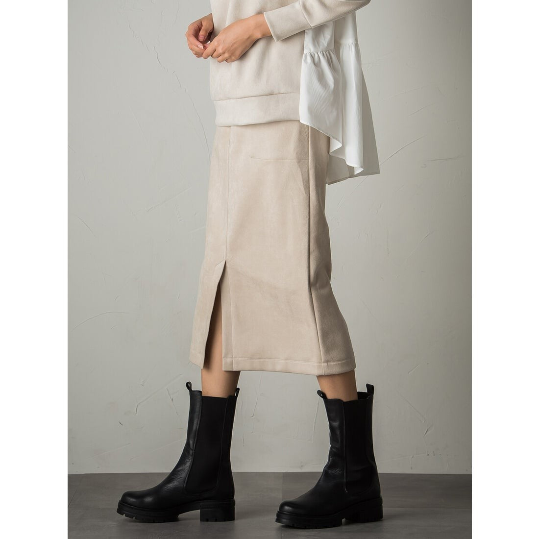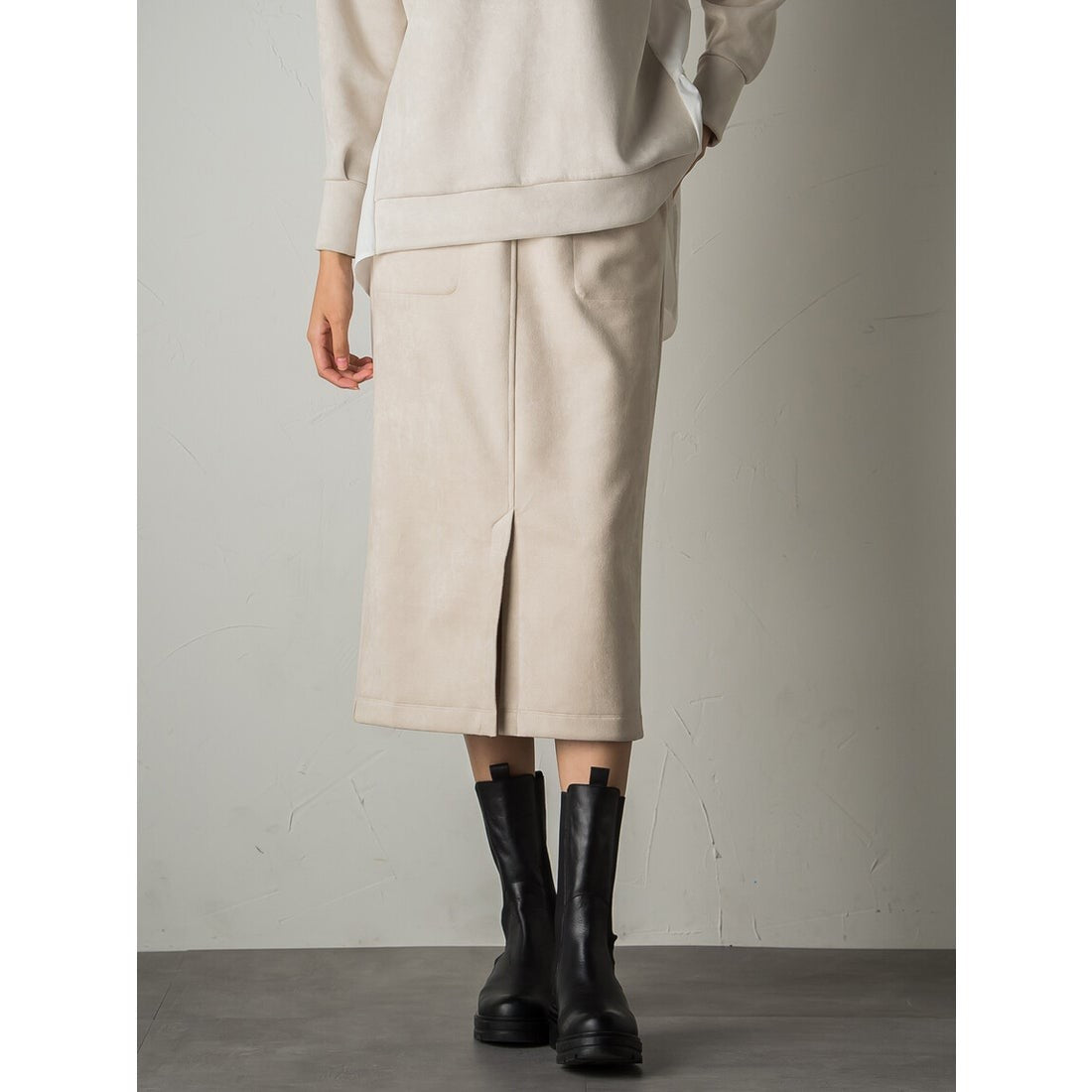 秋らしいスウェードタッチの素材を使用したストレートスカート。